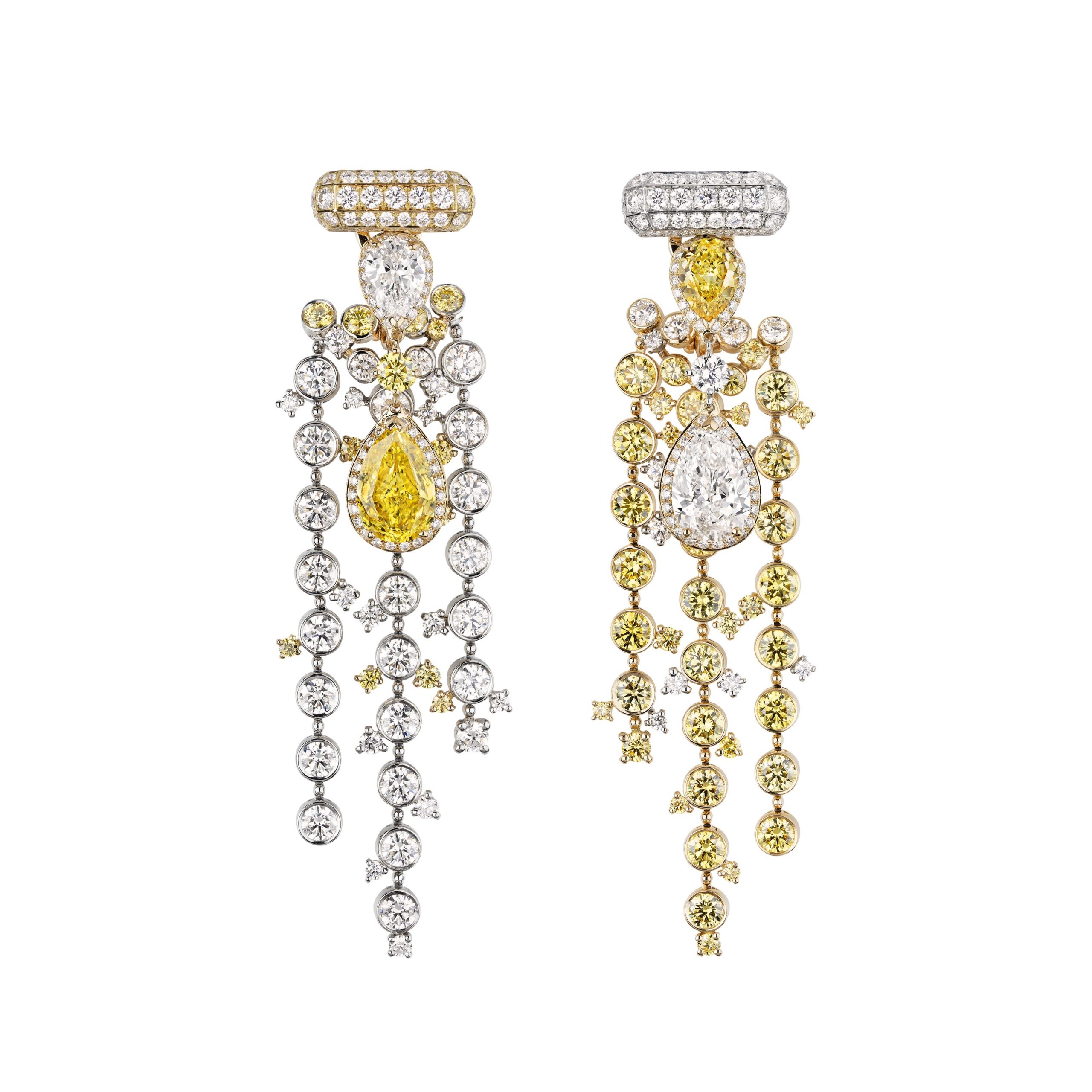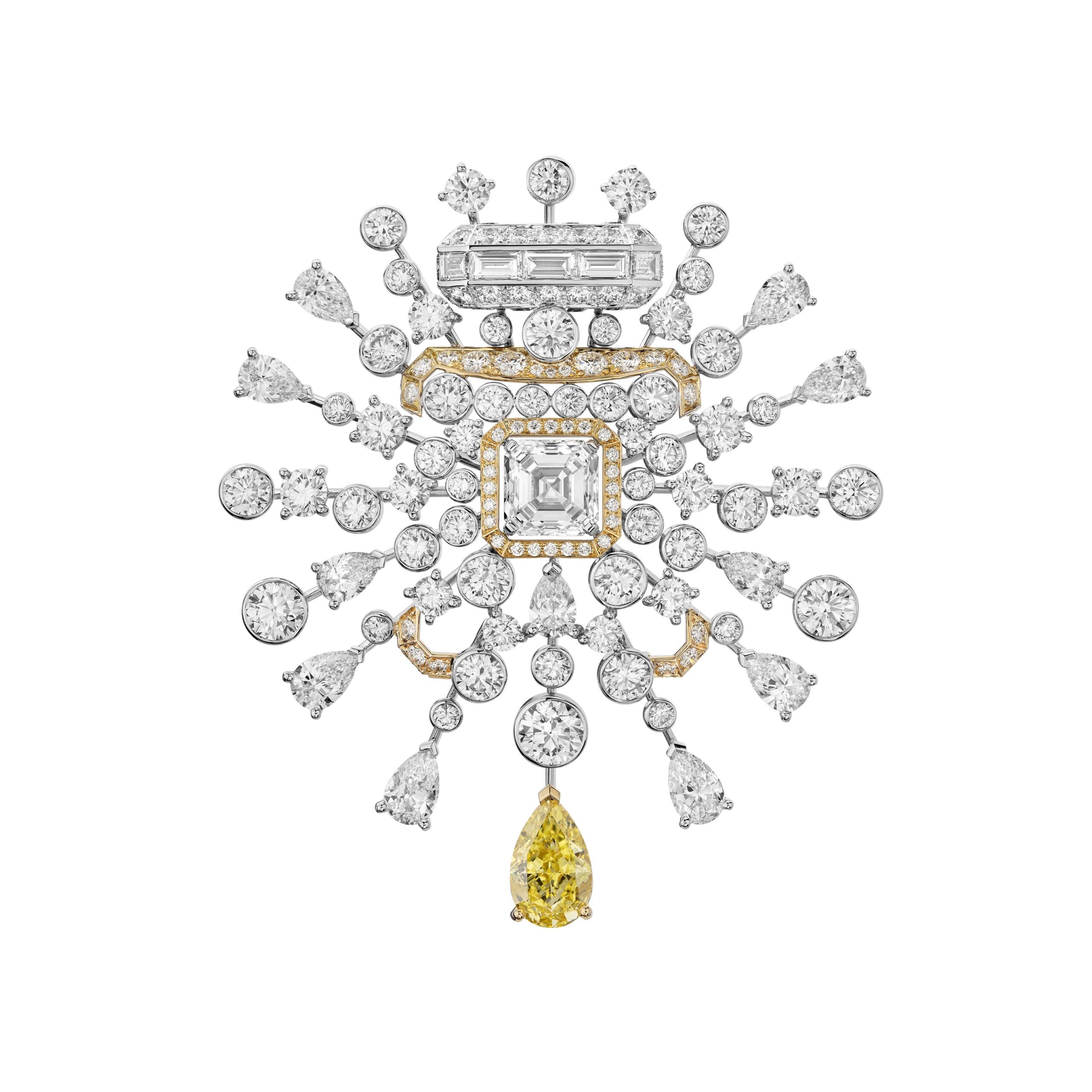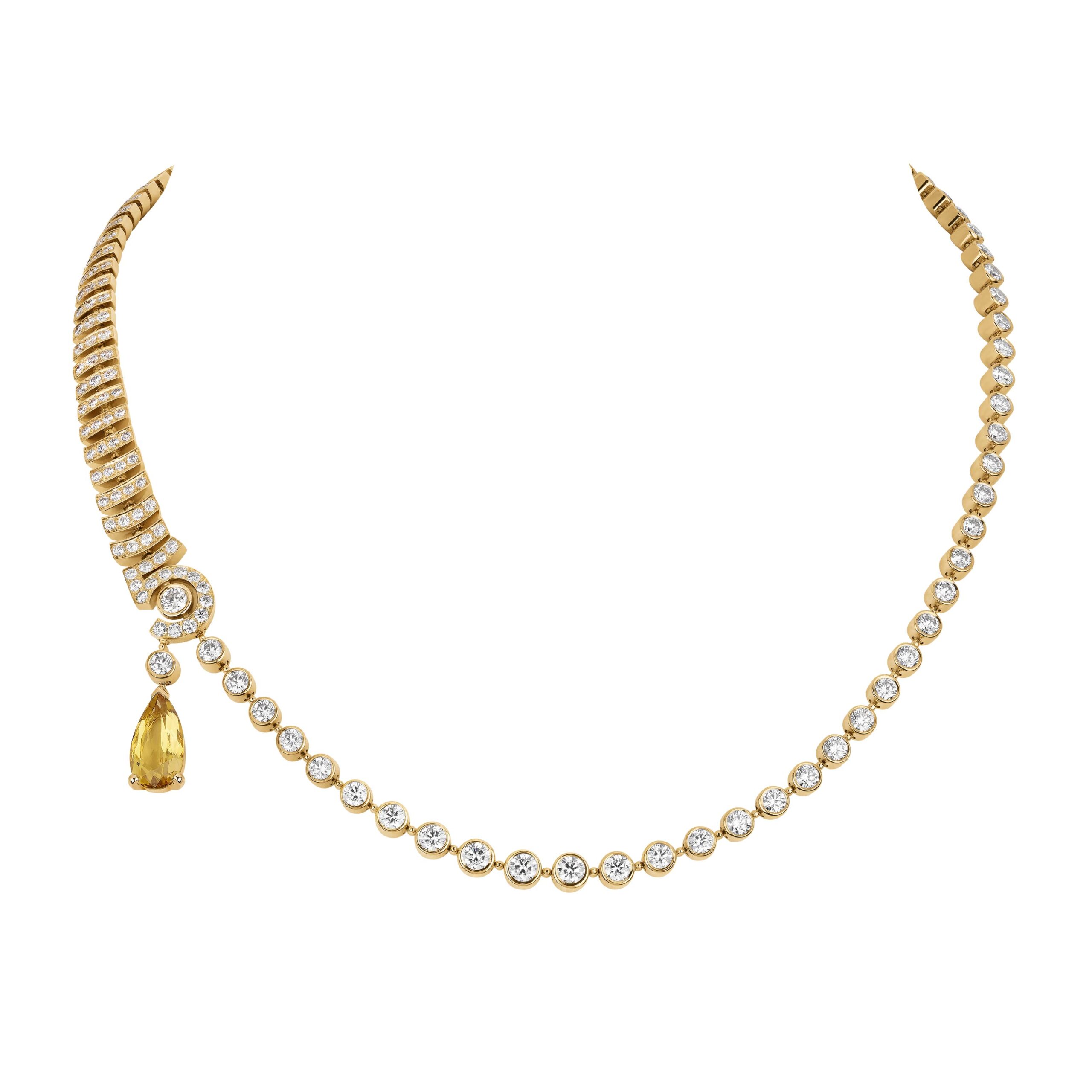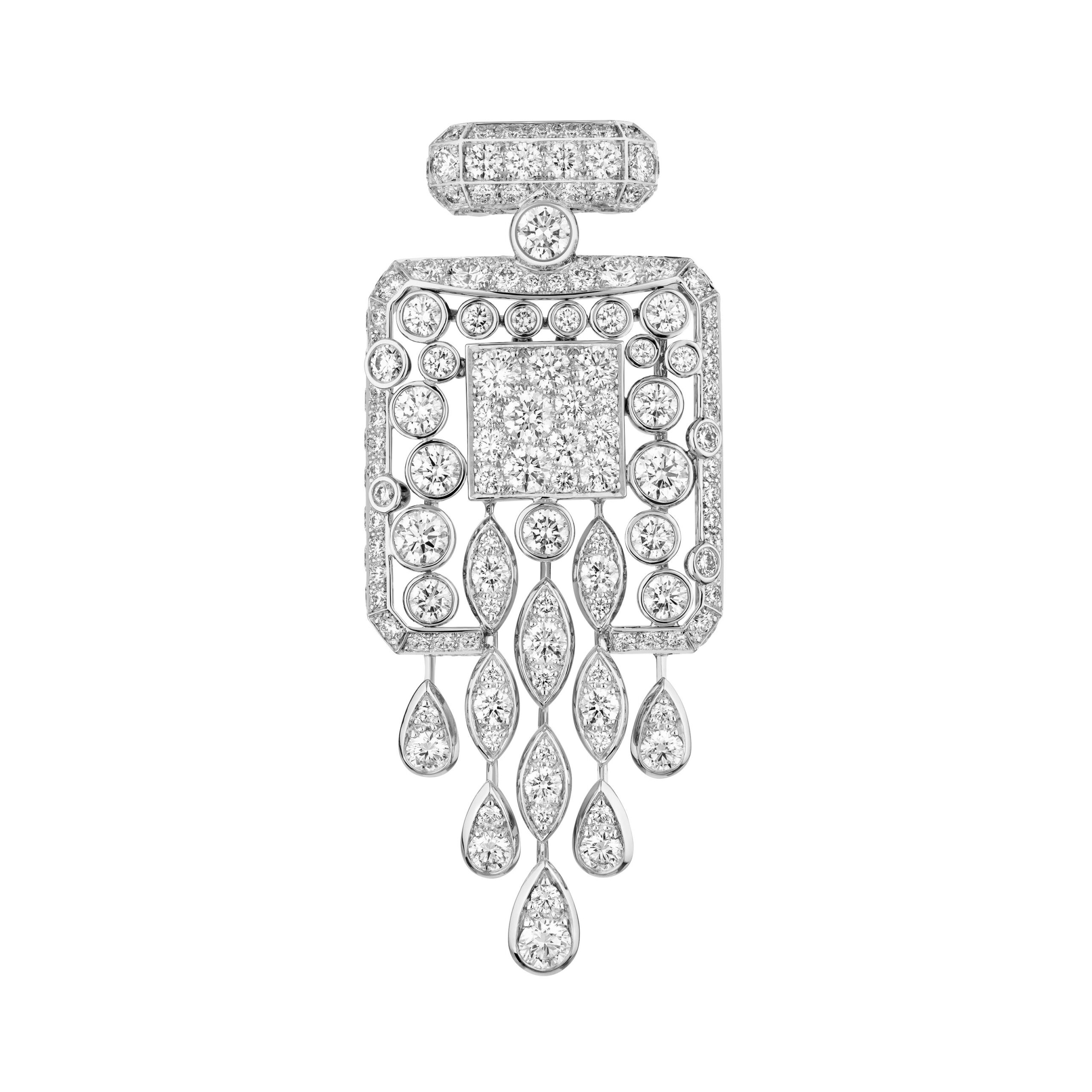 Reconnaissable entre toutes, la silhouette géométrique du flacon se lit entre les lignes de diamants blancs, de diamants jaunes, de saphirs jaunes montés en cascade sur des sautoirs, des broches et des pendants d’oreilles. A l’instar du collier N°5 Abstraction dont le subtil dégradé de tons laisse deviner un appairage de diamants jaune et blanc parfait.