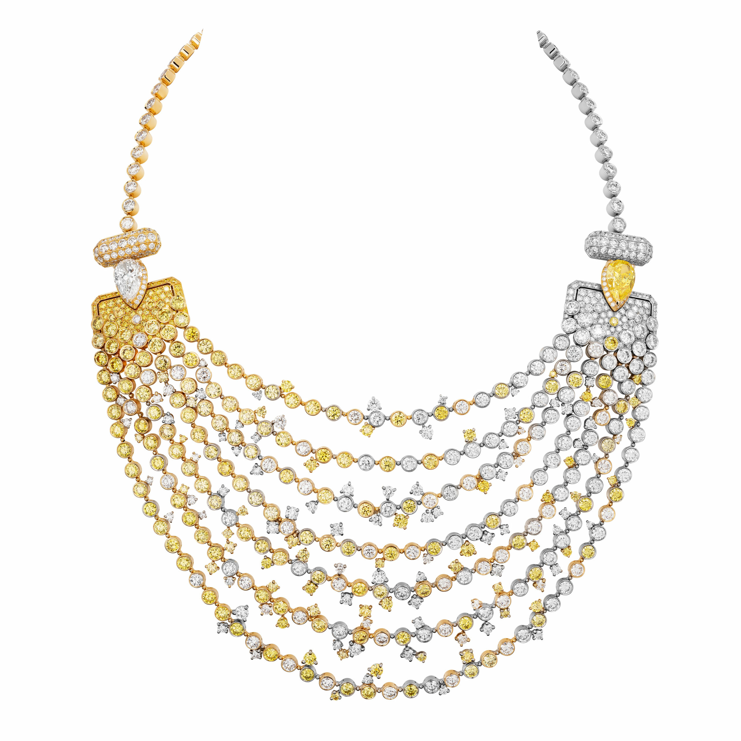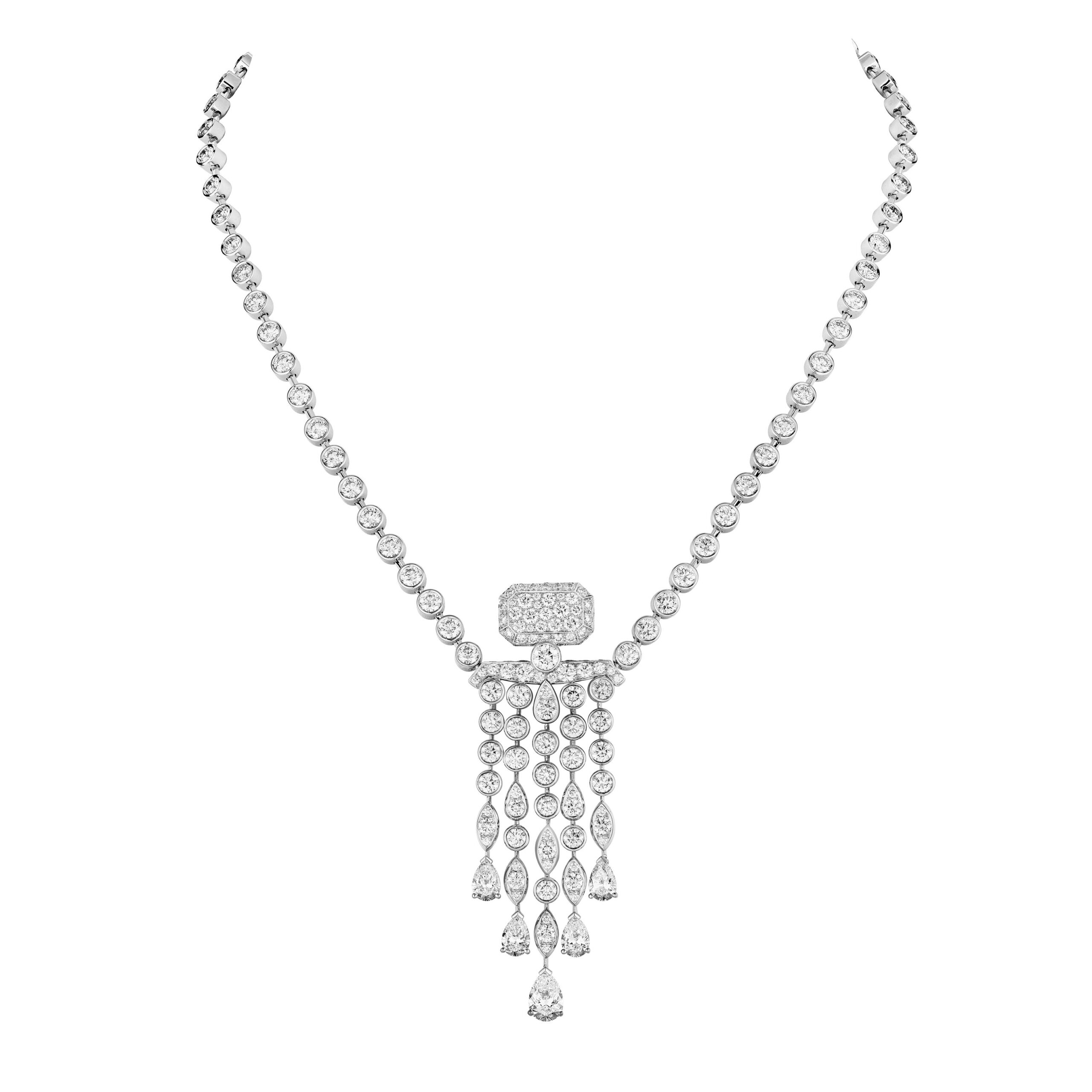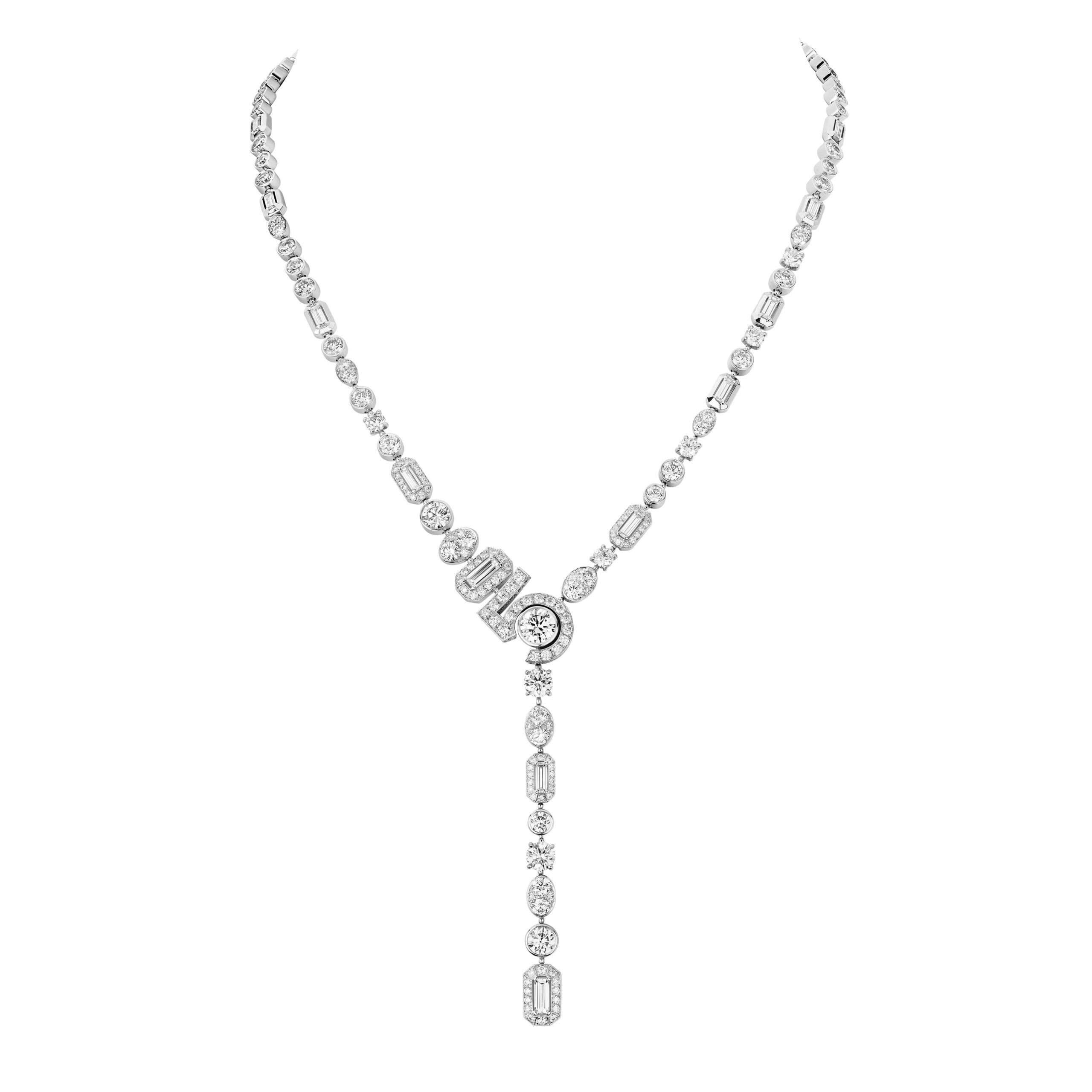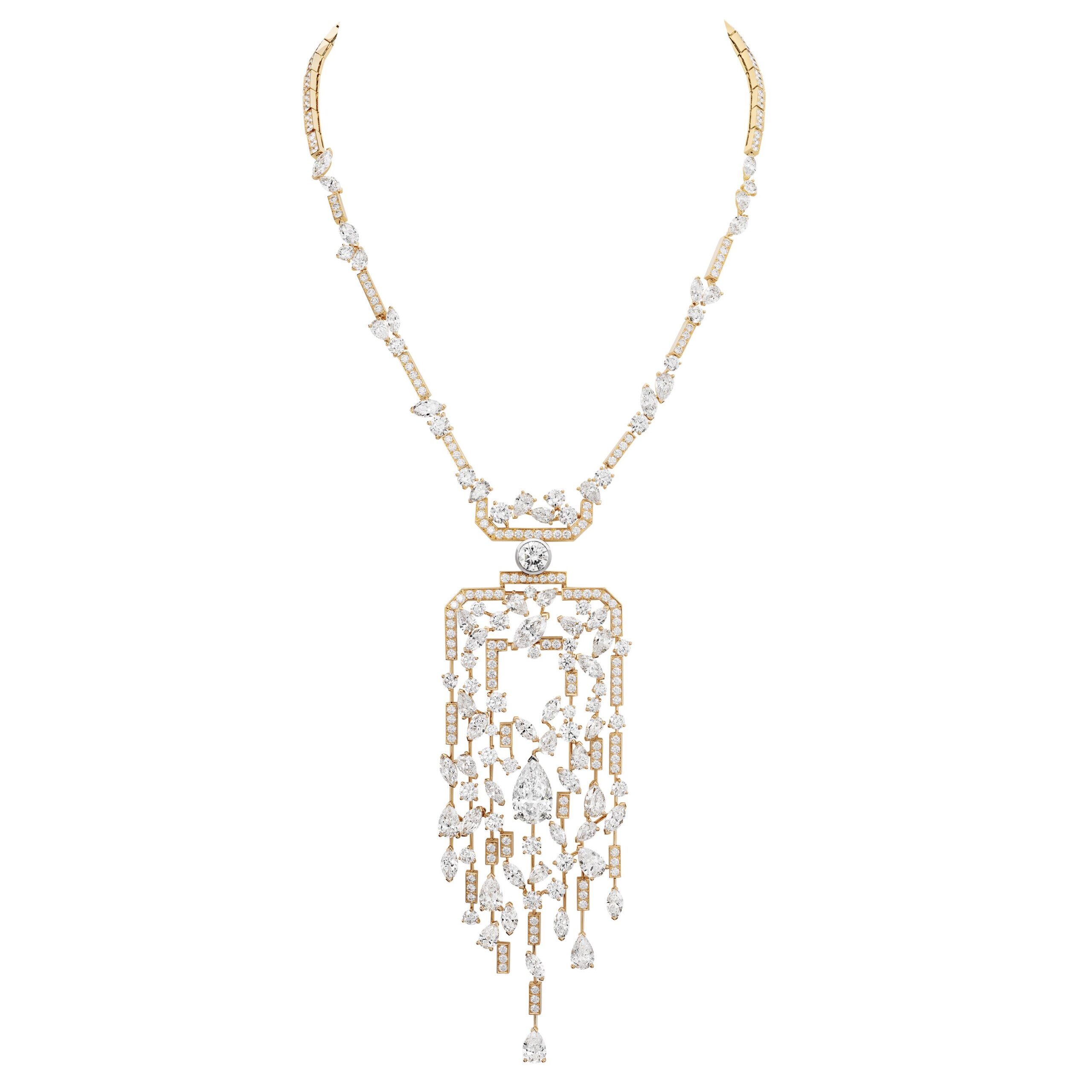 Reconnaissable entre toutes, la silhouette géométrique du flacon se lit entre les lignes de diamants blancs, de diamants jaunes, de saphirs jaunes montés en cascade sur des sautoirs, des broches et des pendants d’oreilles. A l’instar du collier N°5 Abstraction dont le subtil dégradé de tons laisse deviner un appairage de diamants jaune et blanc parfait.