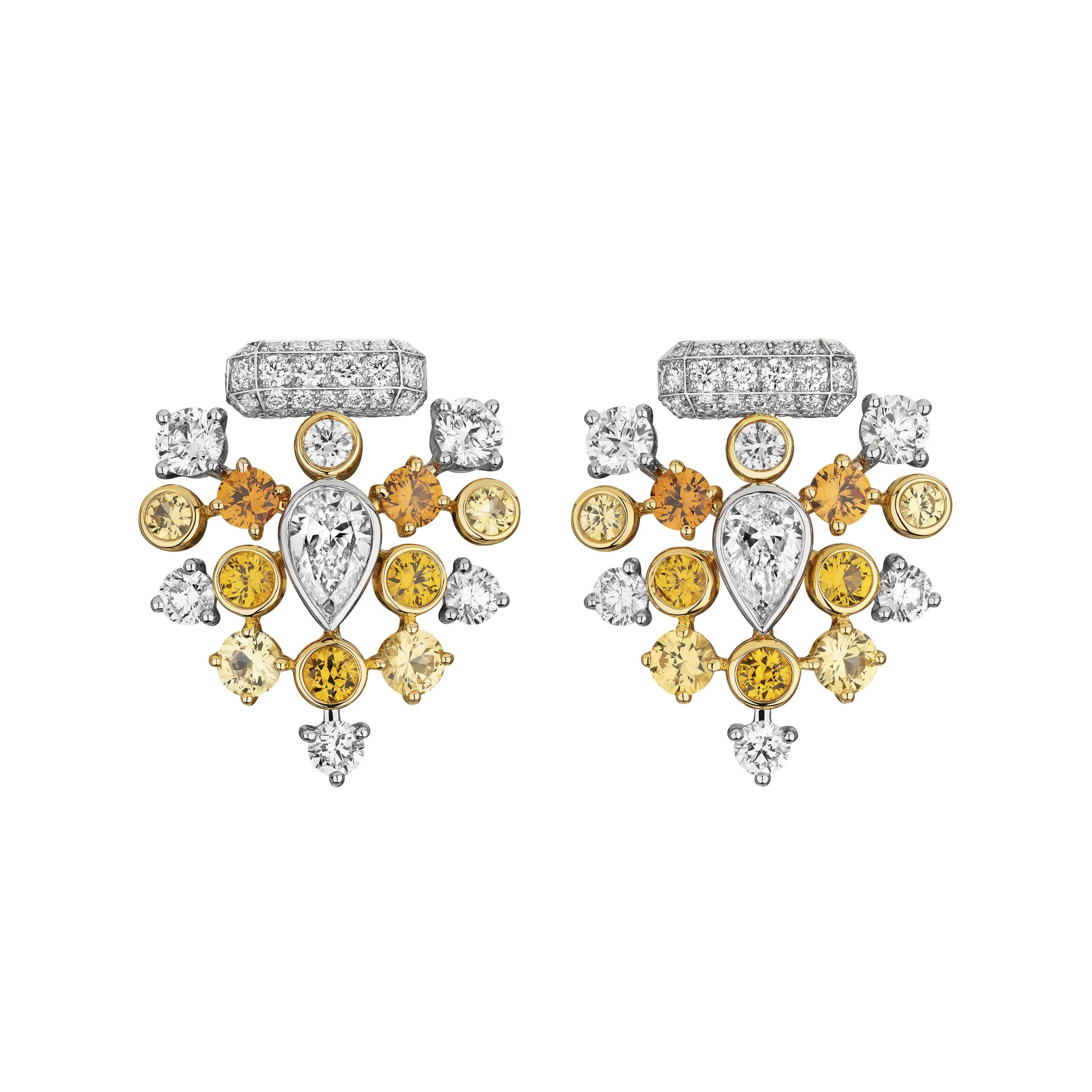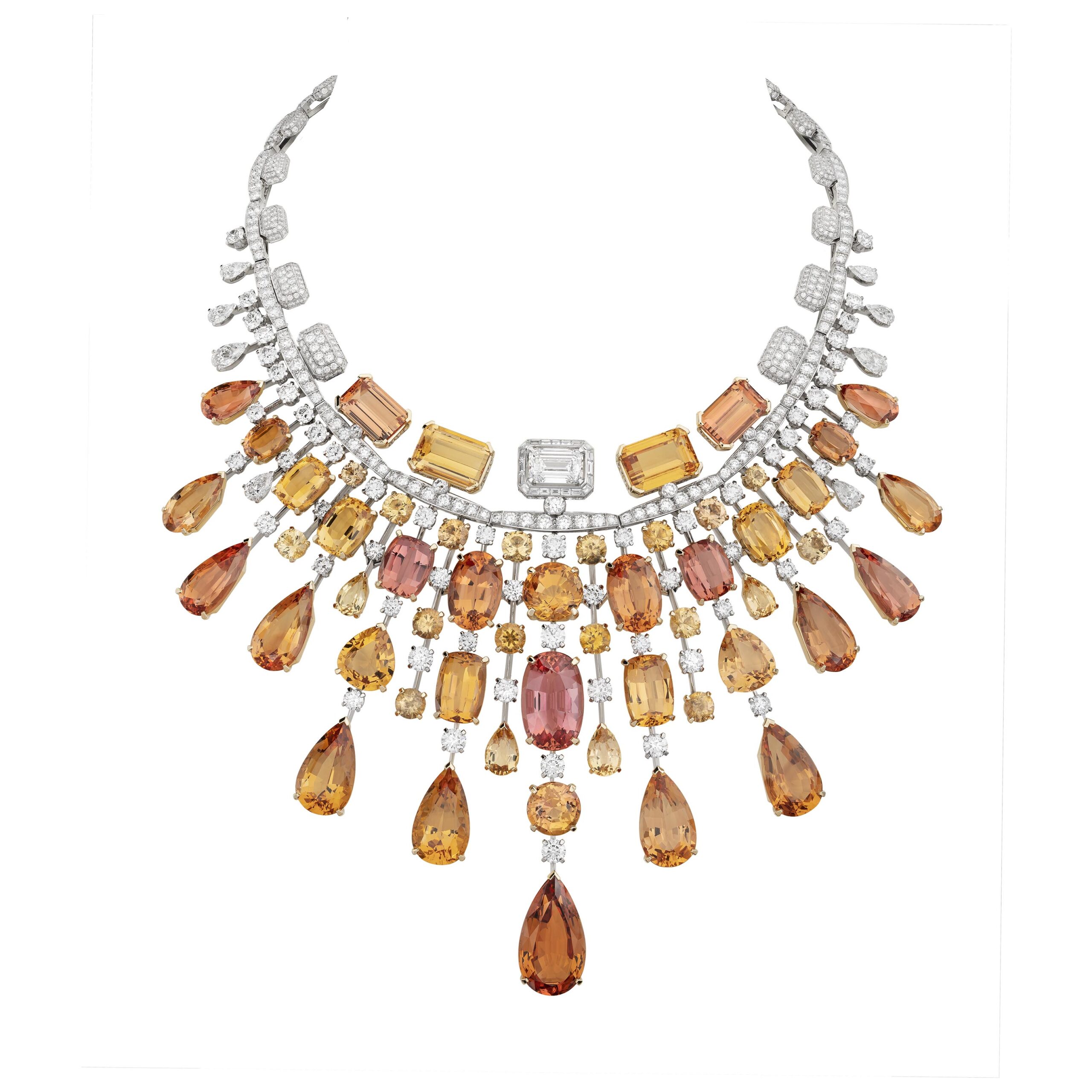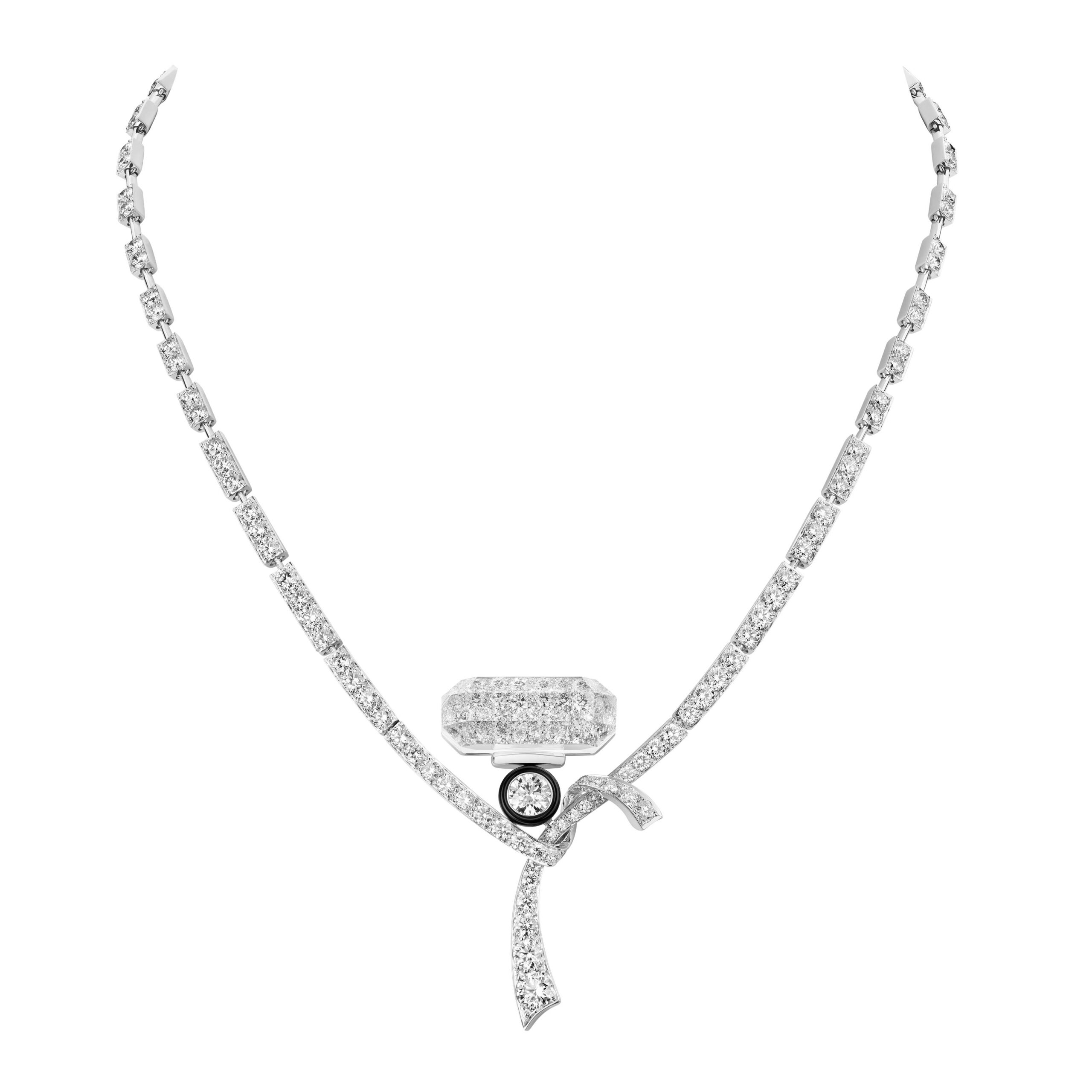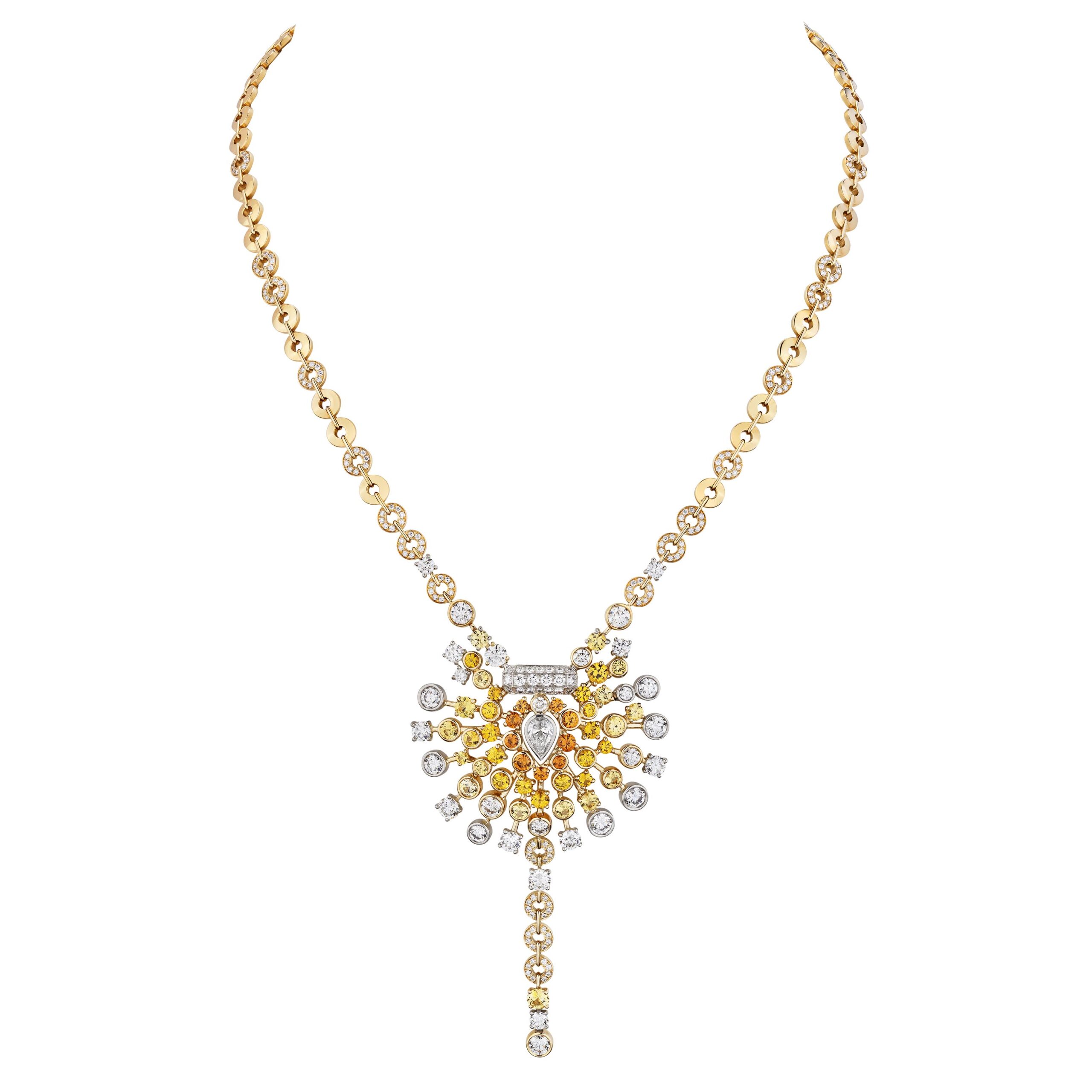 Reconnaissable entre toutes, la silhouette géométrique du flacon se lit entre les lignes de diamants blancs, de diamants jaunes, de saphirs jaunes montés en cascade sur des sautoirs, des broches et des pendants d’oreilles. A l’instar du collier N°5 Abstraction dont le subtil dégradé de tons laisse deviner un appairage de diamants jaune et blanc parfait.