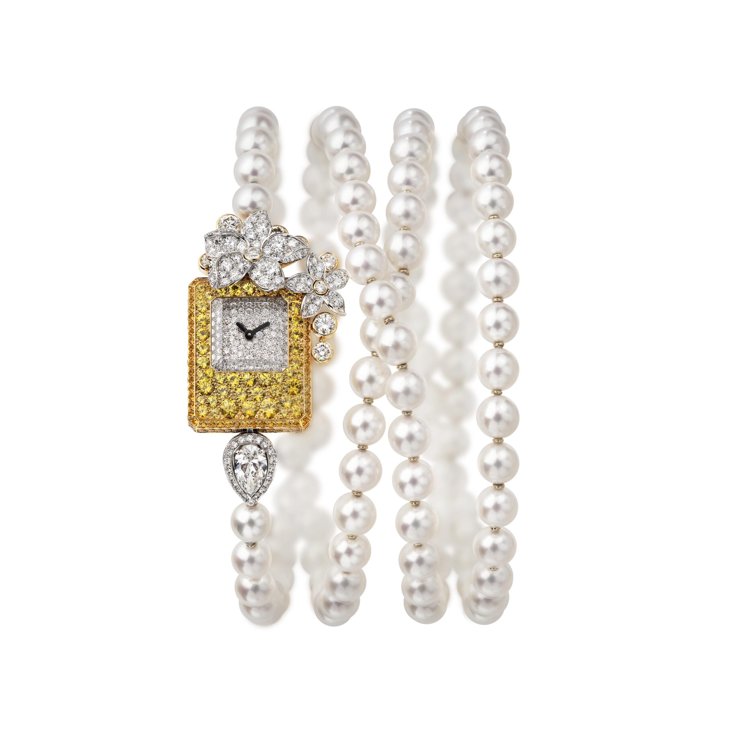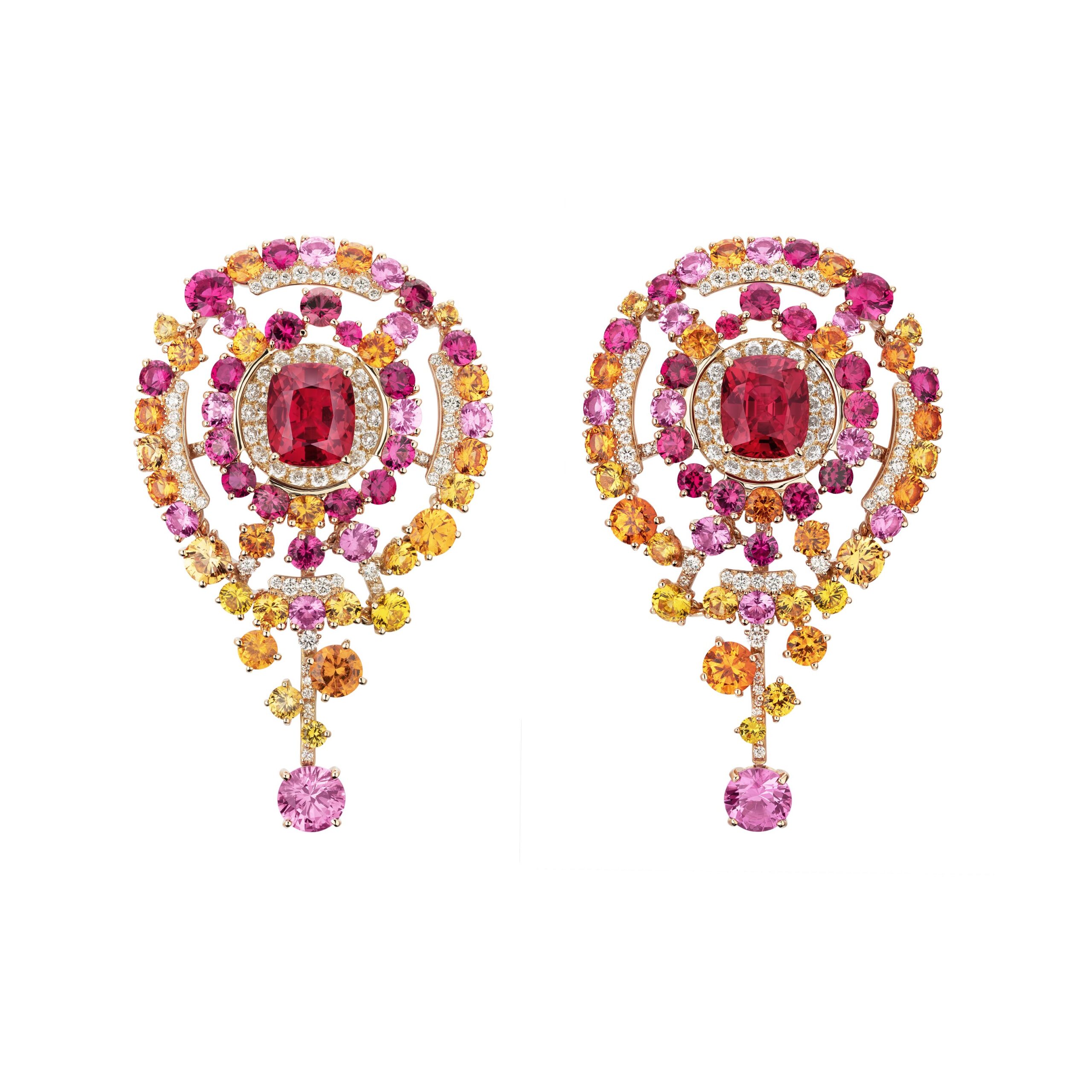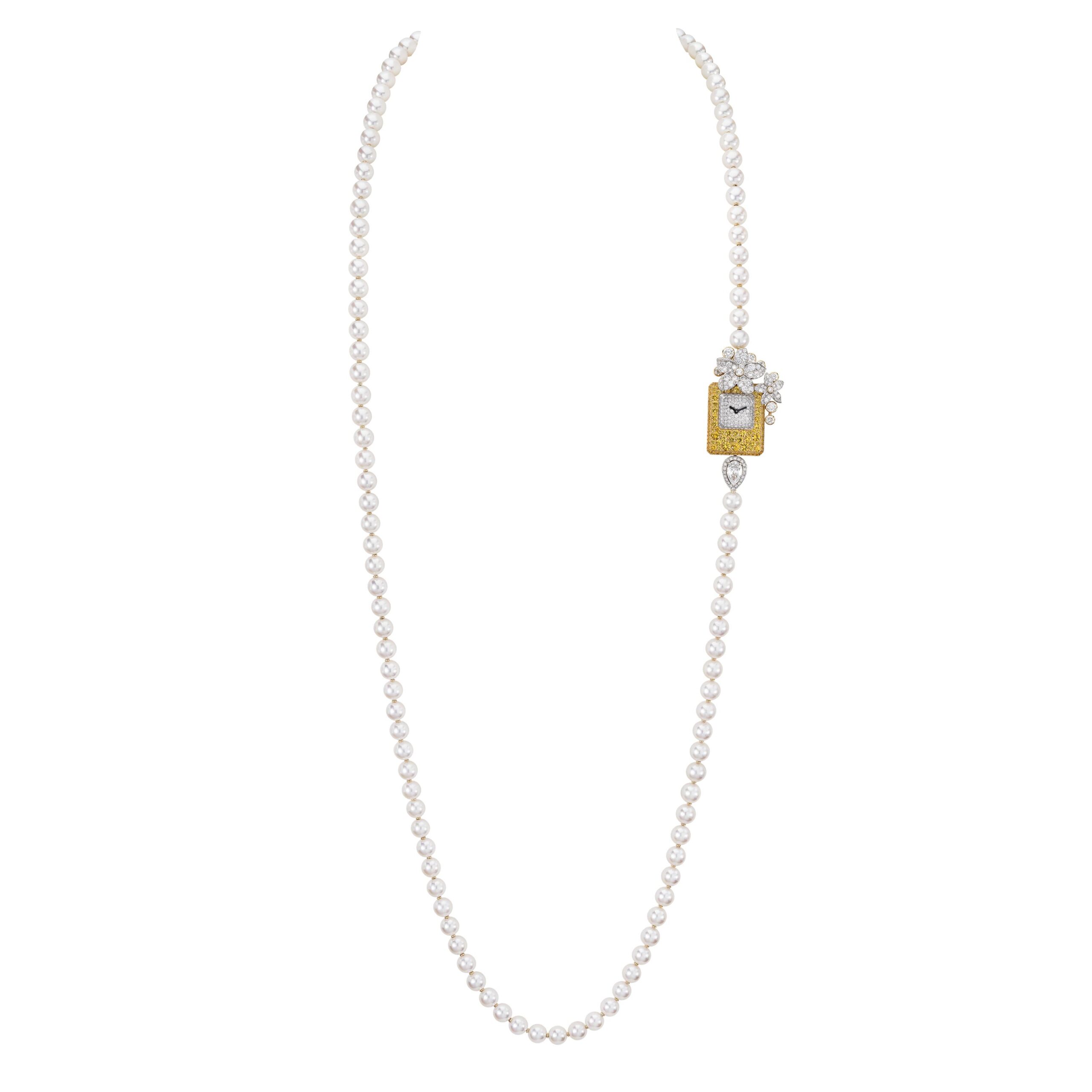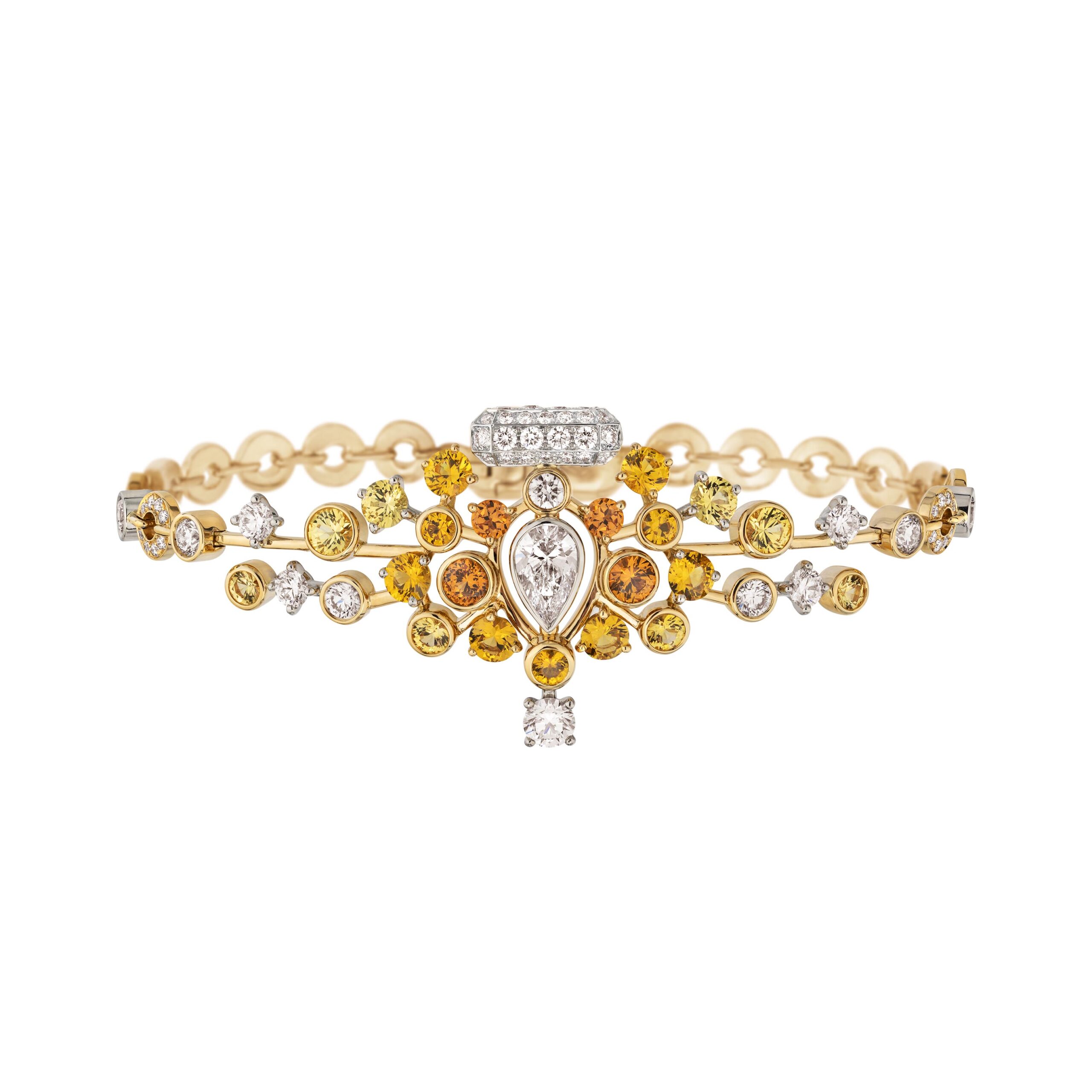 Reconnaissable entre toutes, la silhouette géométrique du flacon se lit entre les lignes de diamants blancs, de diamants jaunes, de saphirs jaunes montés en cascade sur des sautoirs, des broches et des pendants d’oreilles. A l’instar du collier N°5 Abstraction dont le subtil dégradé de tons laisse deviner un appairage de diamants jaune et blanc parfait.