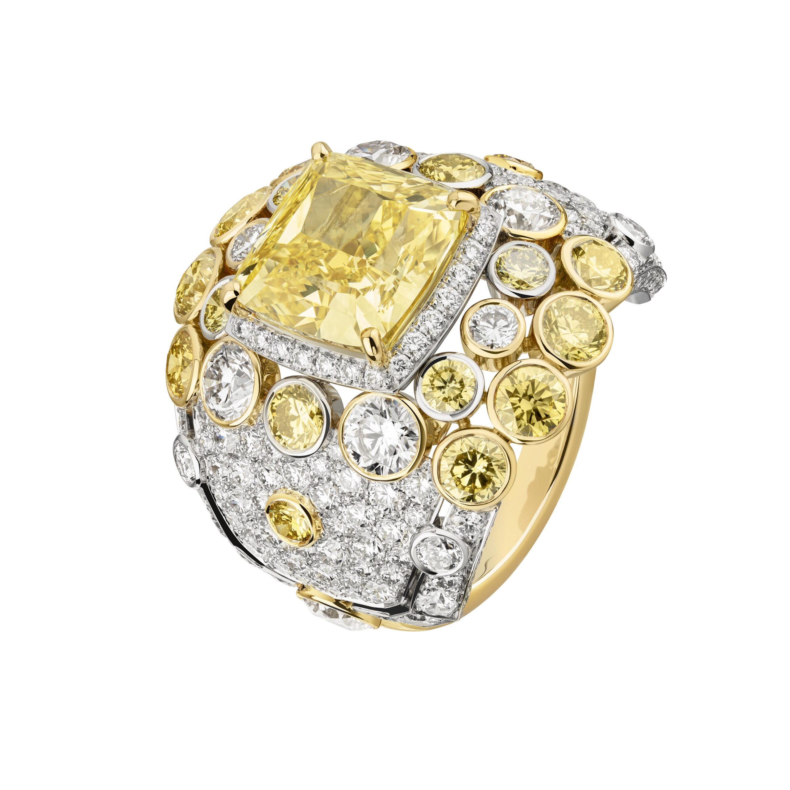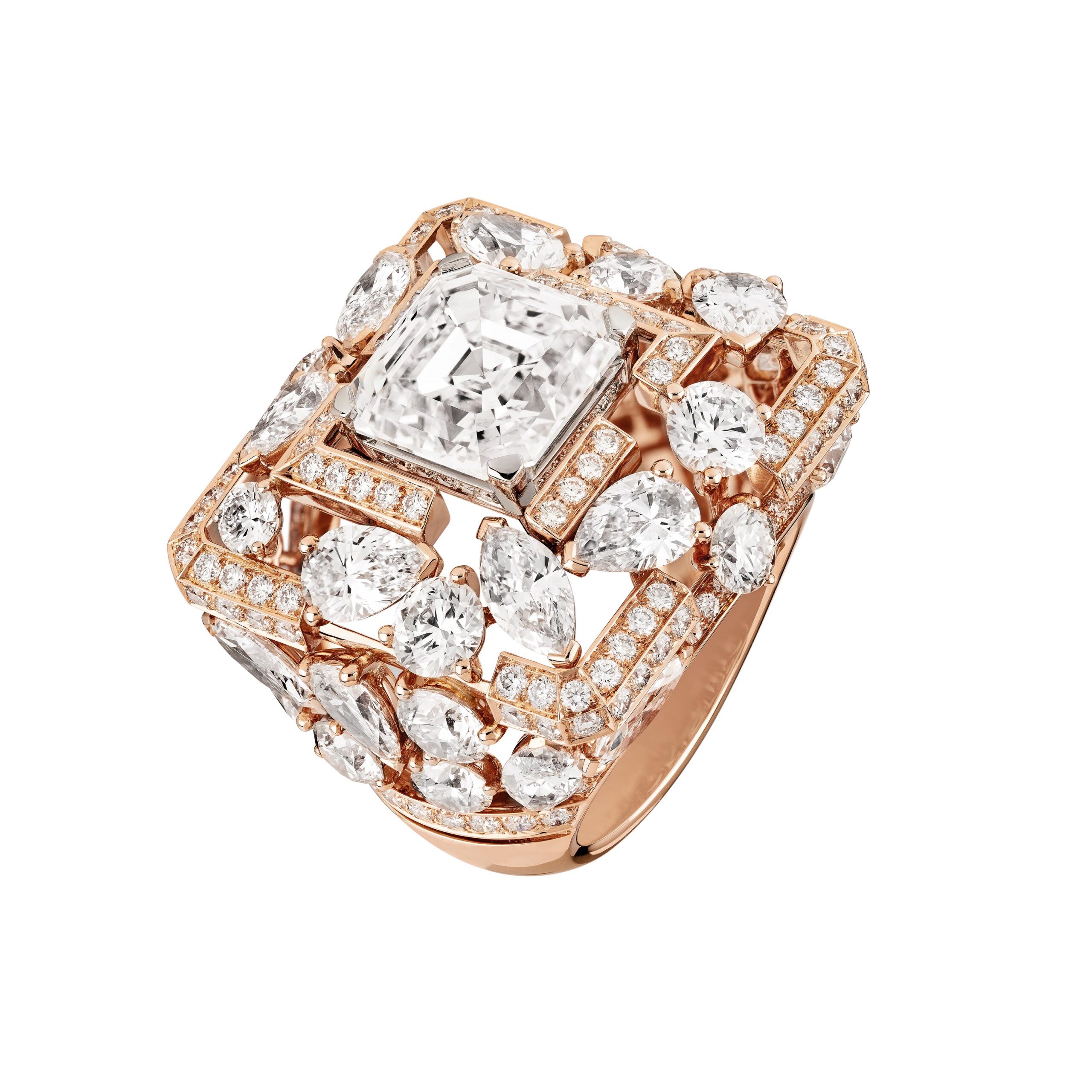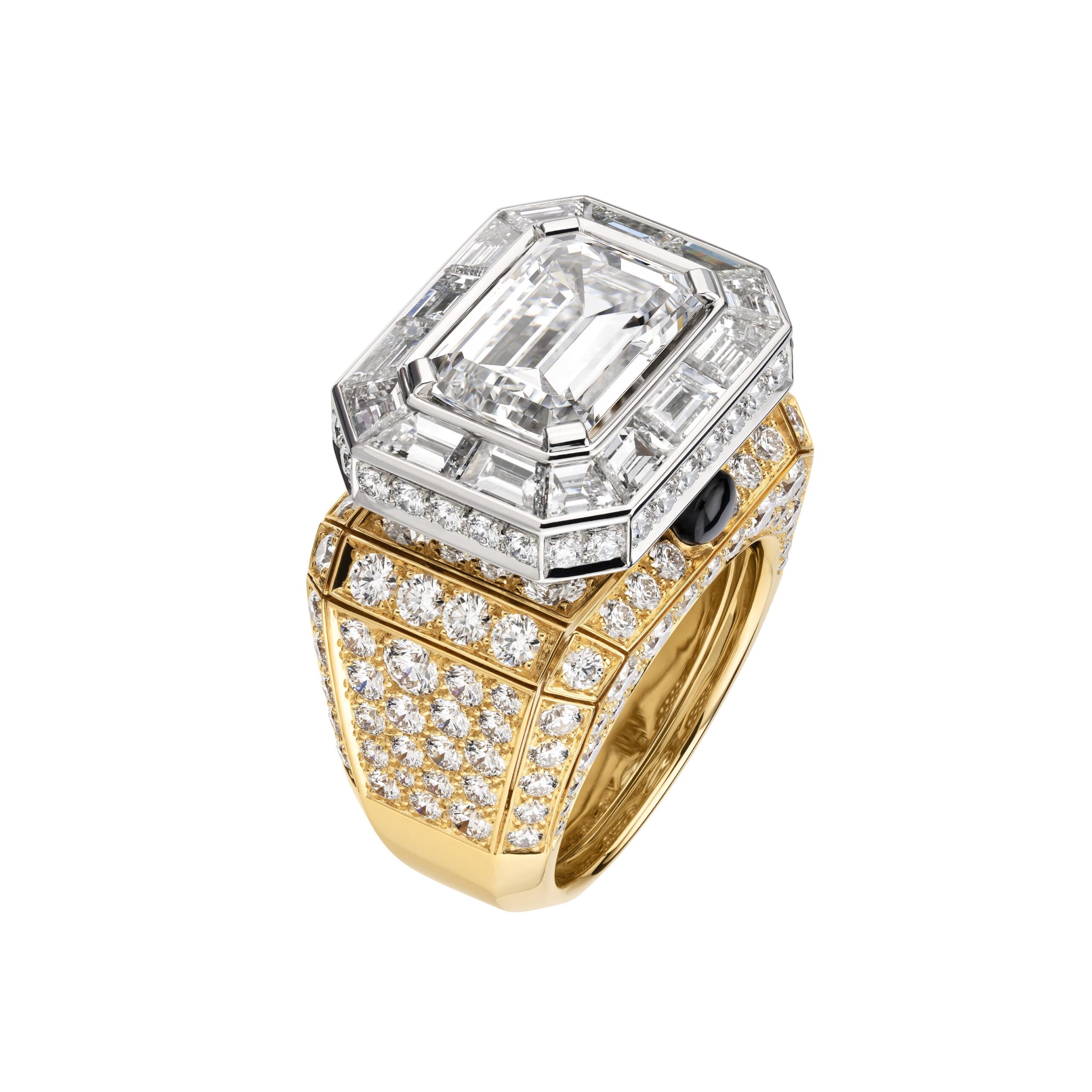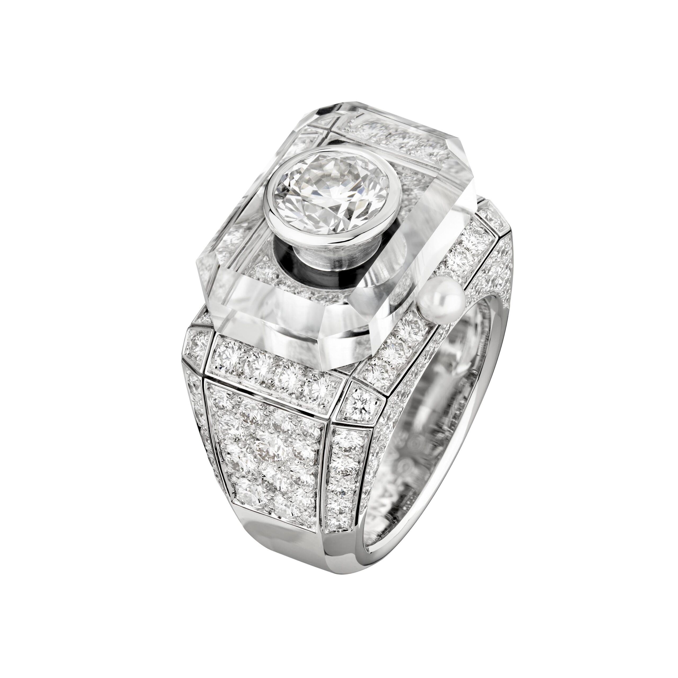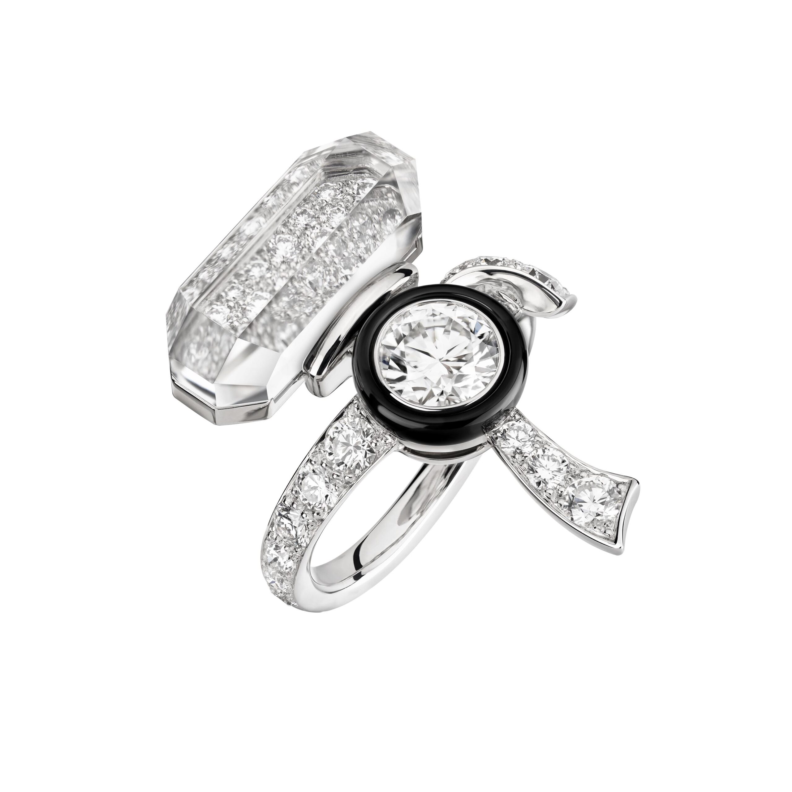 Ouvragé dans du cristal de roche ou serti de diamants, d’onyx, de perles, de saphirs jaunes, le précieux octogone se retrouve au cœur de parures graphiques d’une élégance et d’une sophistication magistrales. Par de savants jeux de transparence, les bagues ornées de cristal de roche laissent entrevoir des lits de brillants qui soulignent des profils purs. Sur d’autres anneaux d’or, CHANEL exalte la beauté de gemmes symboliques tel ce diamant de 5,21 carats sur la bague Diamond Stopper. Parfois féminisé d’un ruban de brillants, le bouchon symbolise la porte d’entrée dans l’imaginaire du parfum N°5.