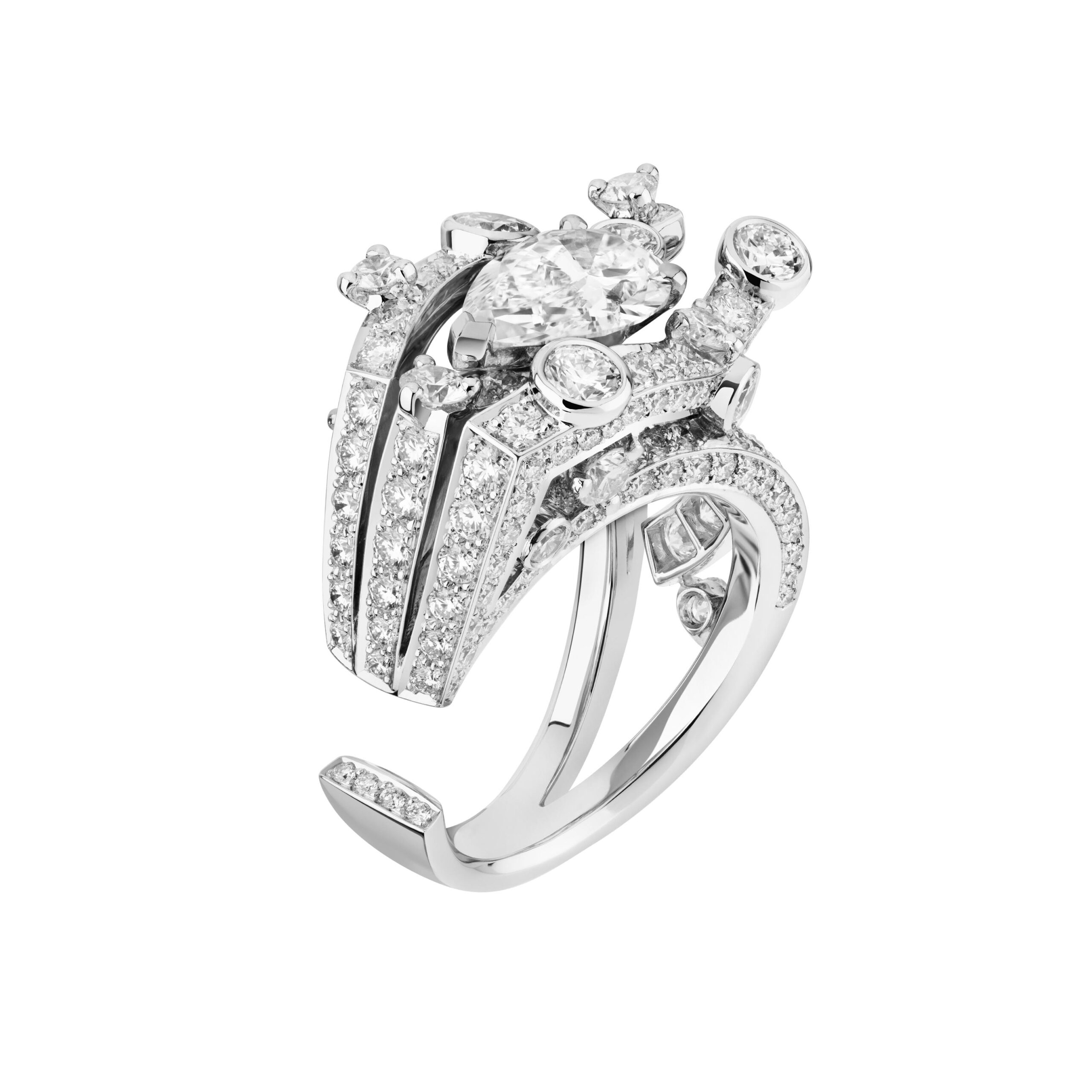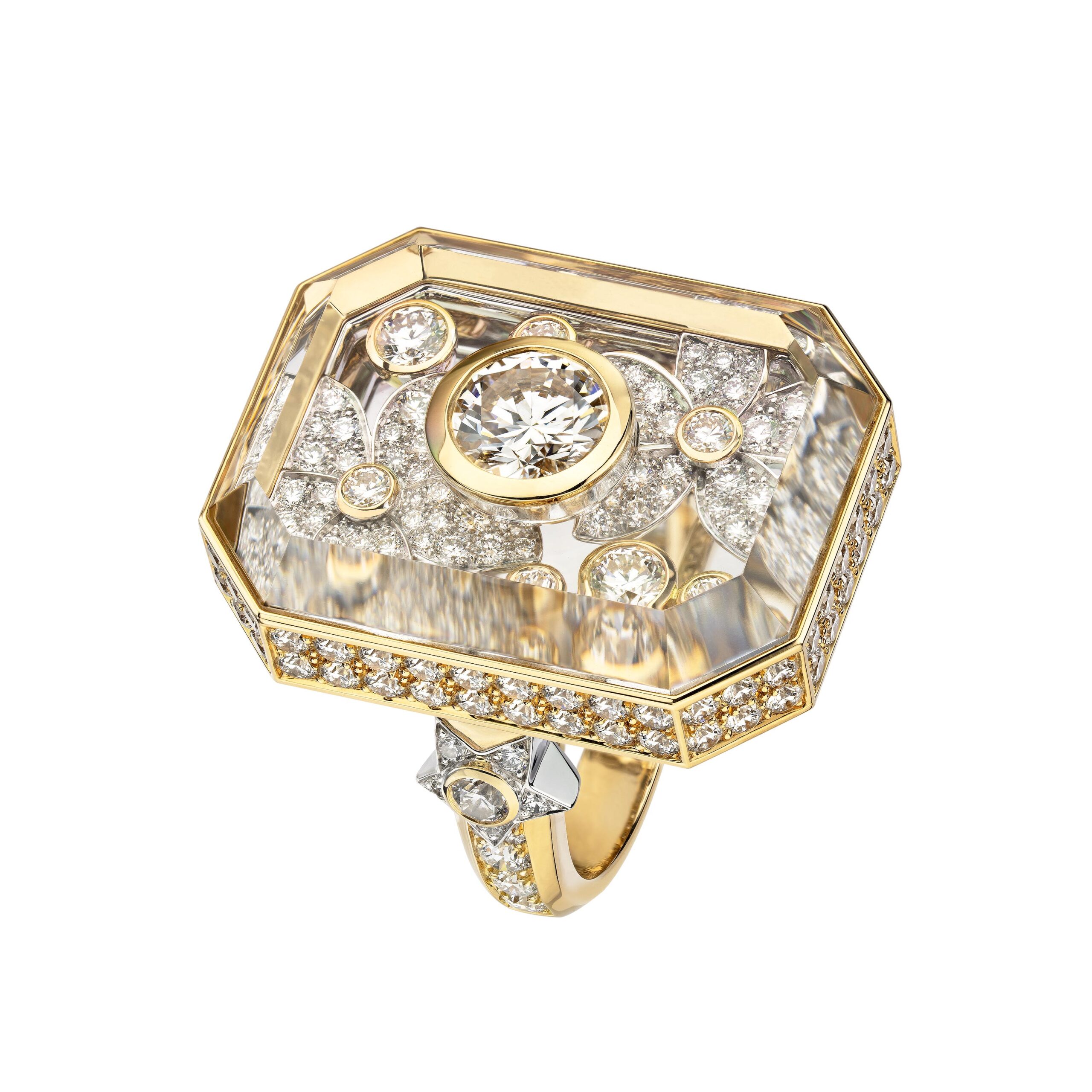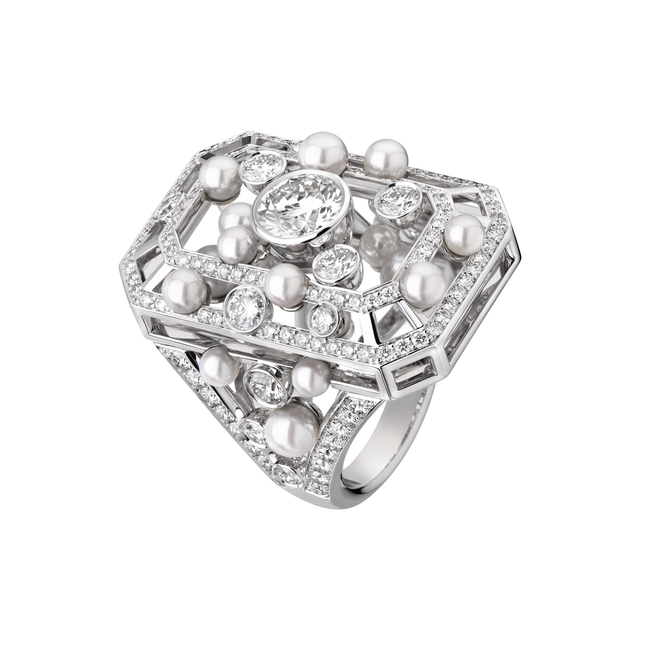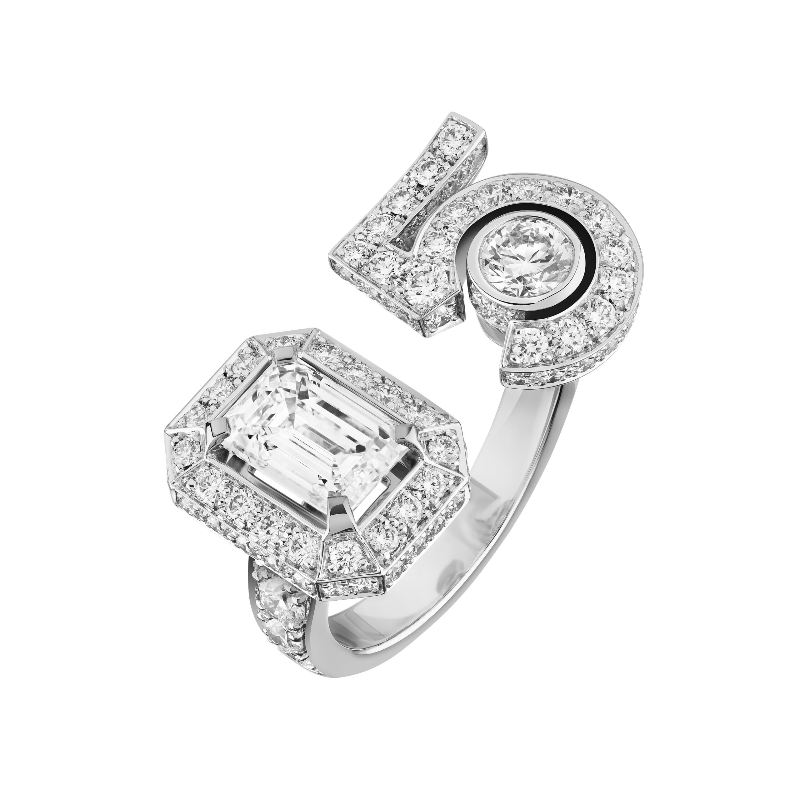 Ouvragé dans du cristal de roche ou serti de diamants, d’onyx, de perles, de saphirs jaunes, le précieux octogone se retrouve au cœur de parures graphiques d’une élégance et d’une sophistication magistrales. Par de savants jeux de transparence, les bagues ornées de cristal de roche laissent entrevoir des lits de brillants qui soulignent des profils purs. Sur d’autres anneaux d’or, CHANEL exalte la beauté de gemmes symboliques tel ce diamant de 5,21 carats sur la bague Diamond Stopper. Parfois féminisé d’un ruban de brillants, le bouchon symbolise la porte d’entrée dans l’imaginaire du parfum N°5.