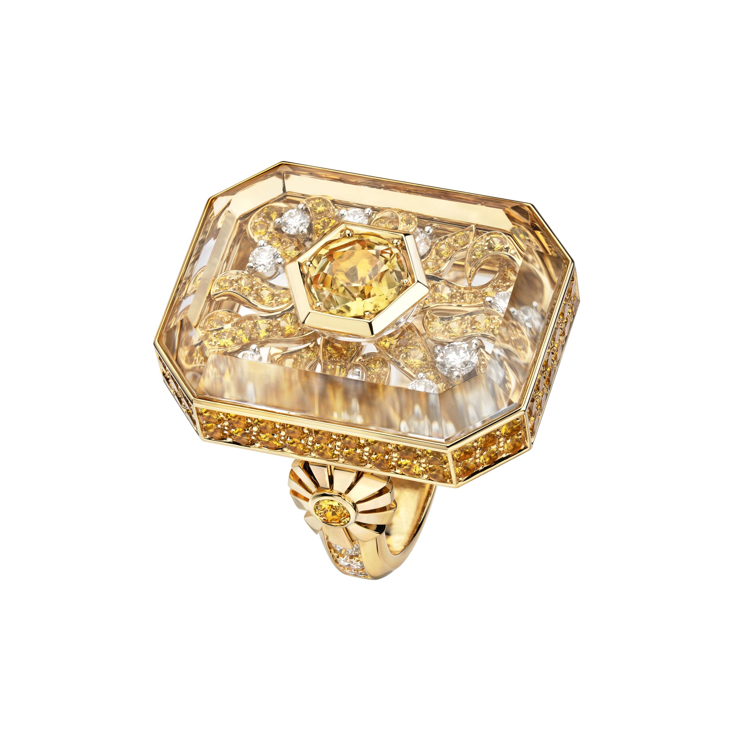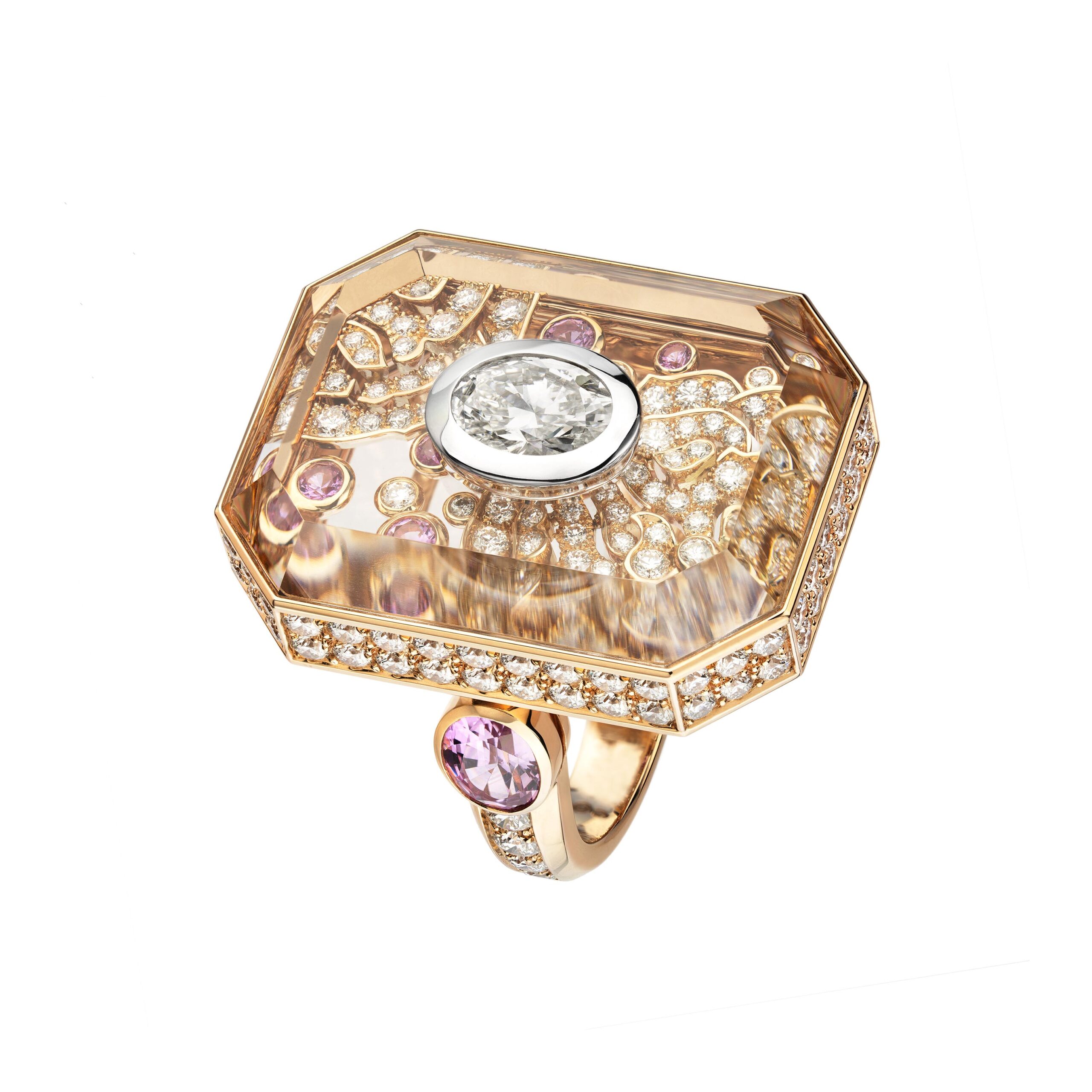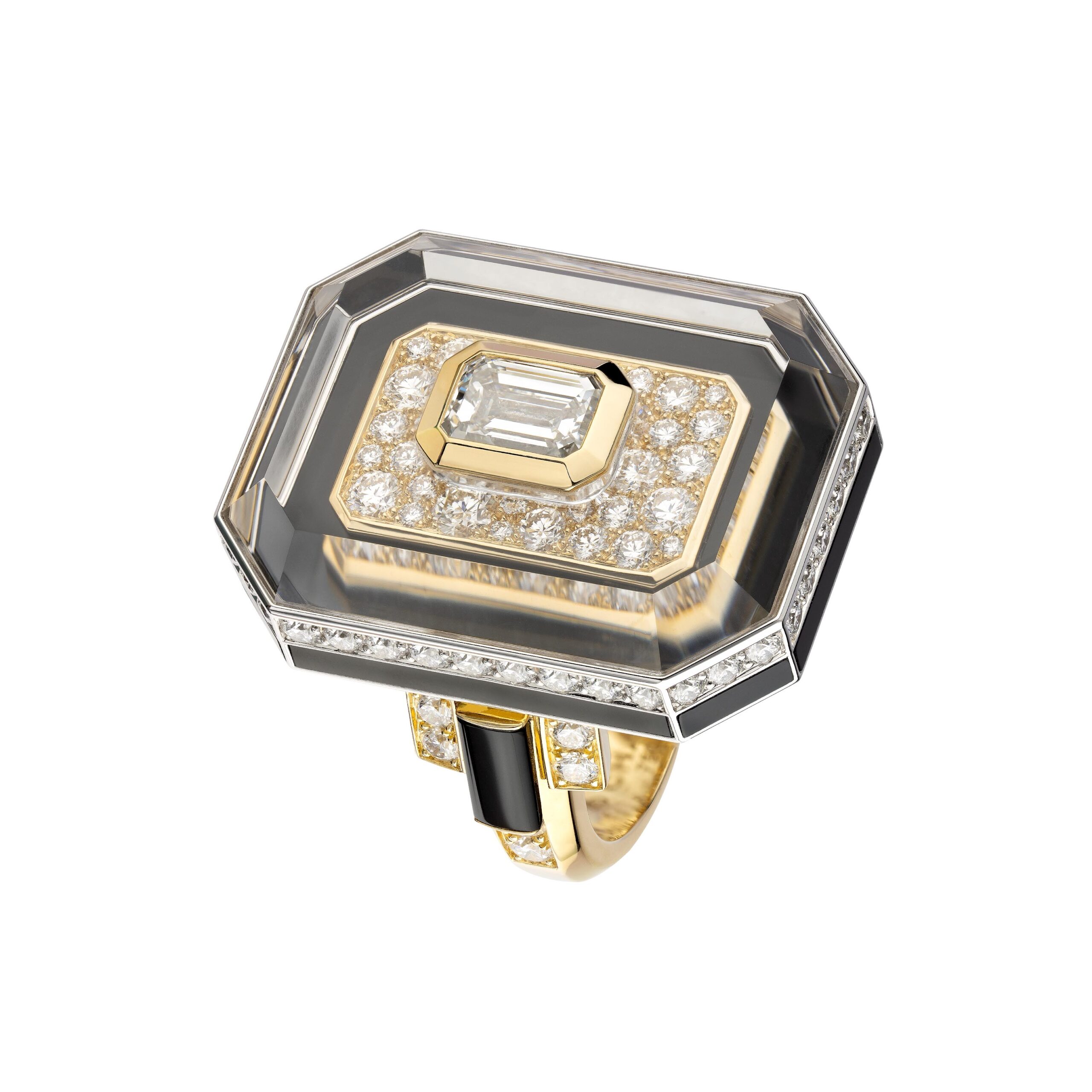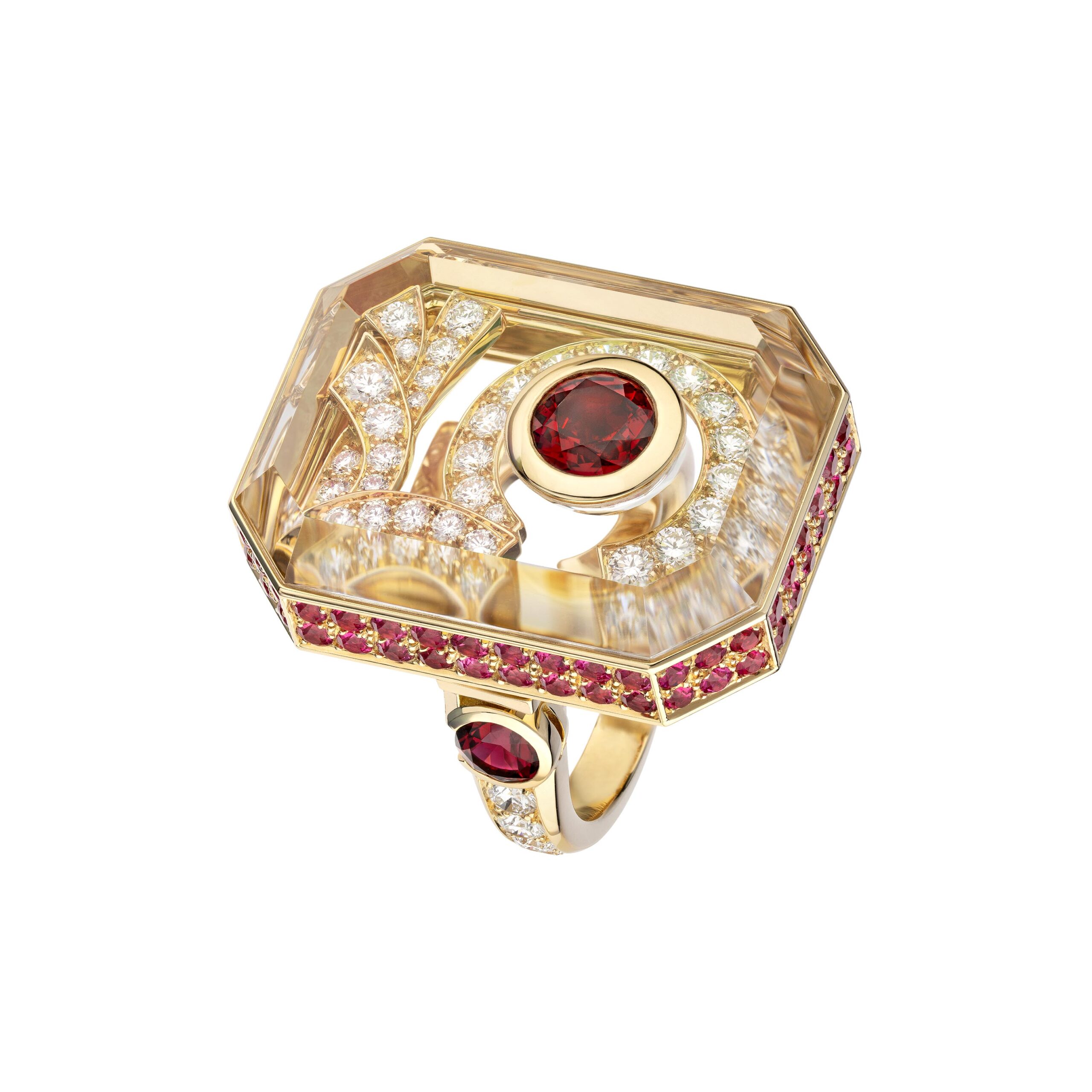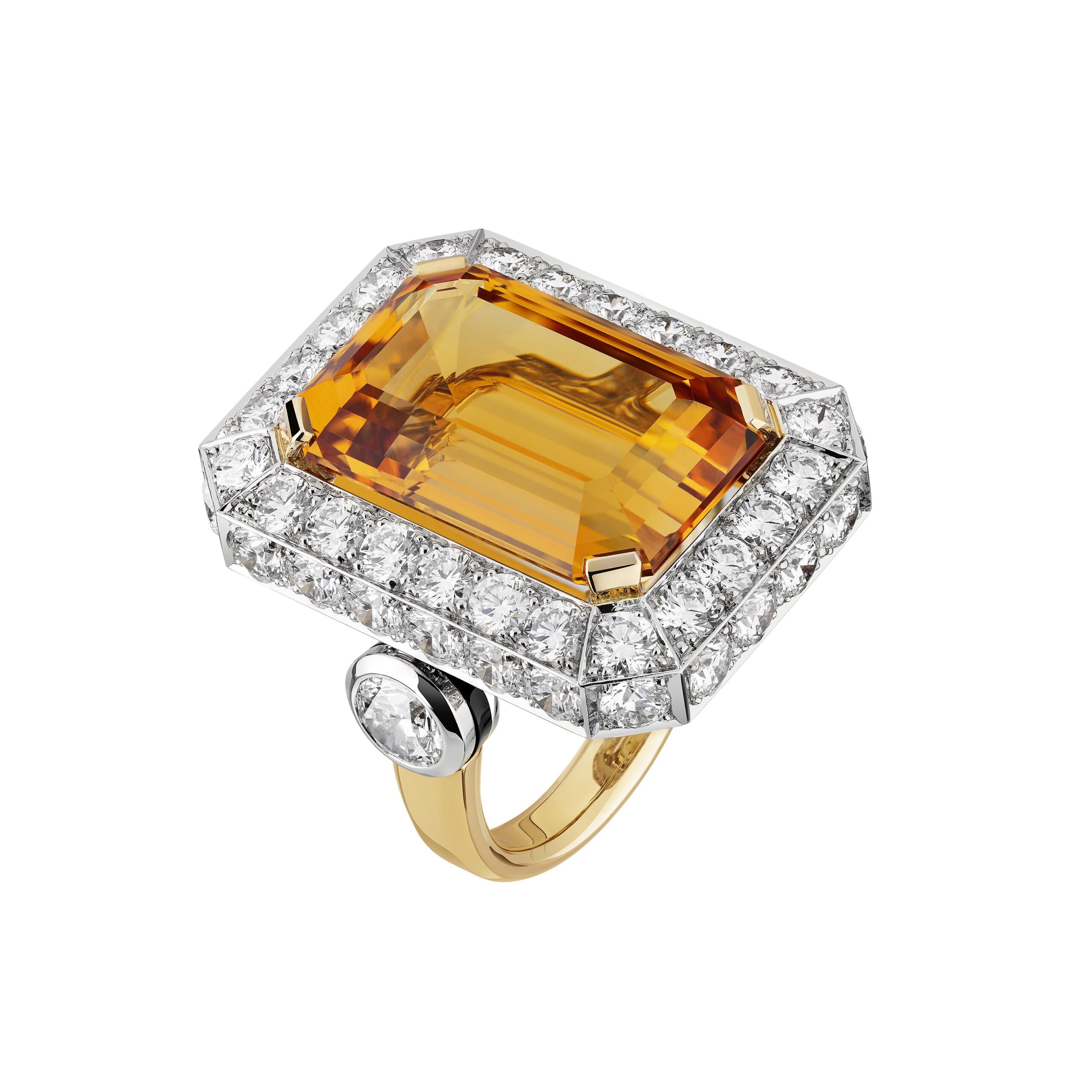 Ouvragé dans du cristal de roche ou serti de diamants, d’onyx, de perles, de saphirs jaunes, le précieux octogone se retrouve au cœur de parures graphiques d’une élégance et d’une sophistication magistrales. Par de savants jeux de transparence, les bagues ornées de cristal de roche laissent entrevoir des lits de brillants qui soulignent des profils purs. Sur d’autres anneaux d’or, CHANEL exalte la beauté de gemmes symboliques tel ce diamant de 5,21 carats sur la bague Diamond Stopper. Parfois féminisé d’un ruban de brillants, le bouchon symbolise la porte d’entrée dans l’imaginaire du parfum N°5.