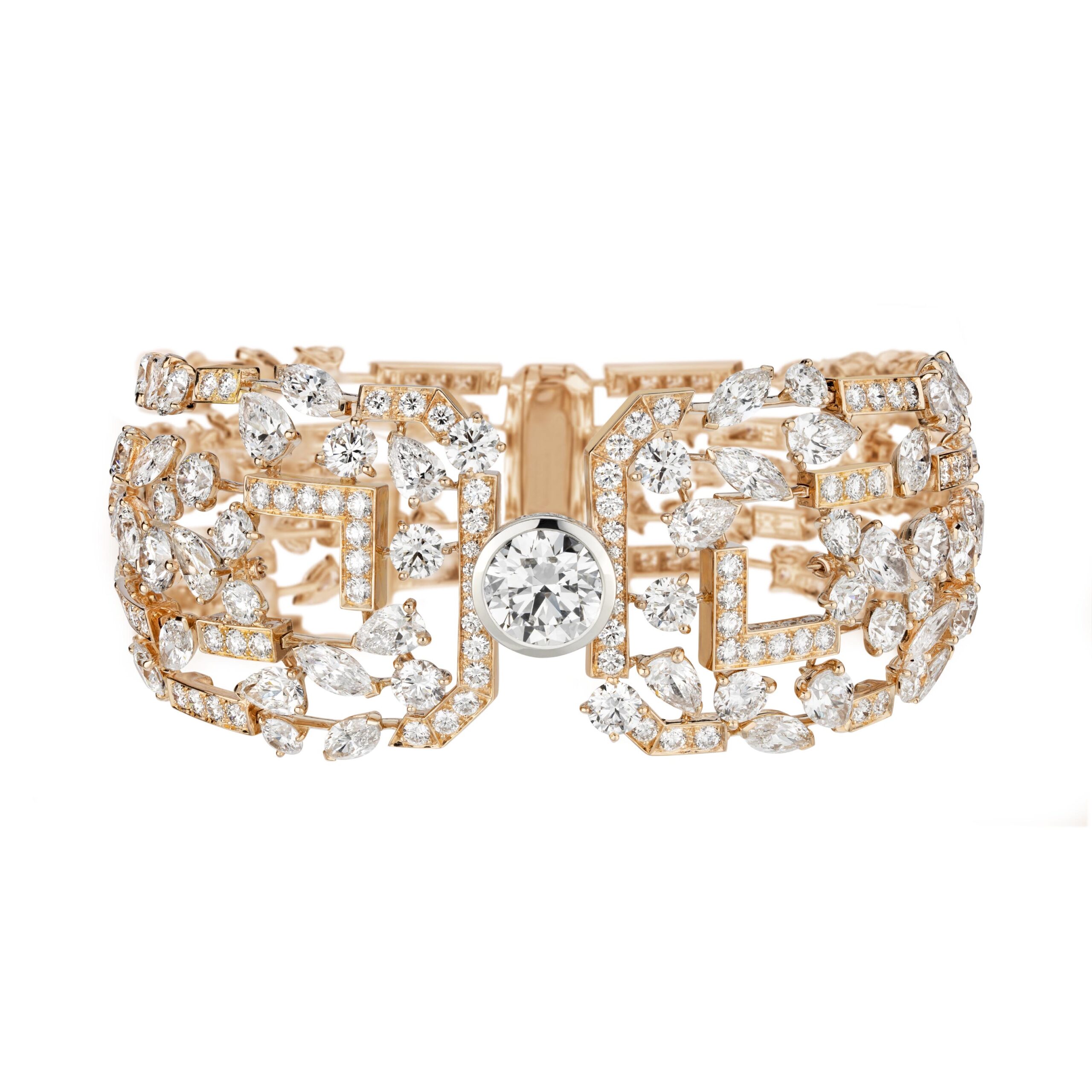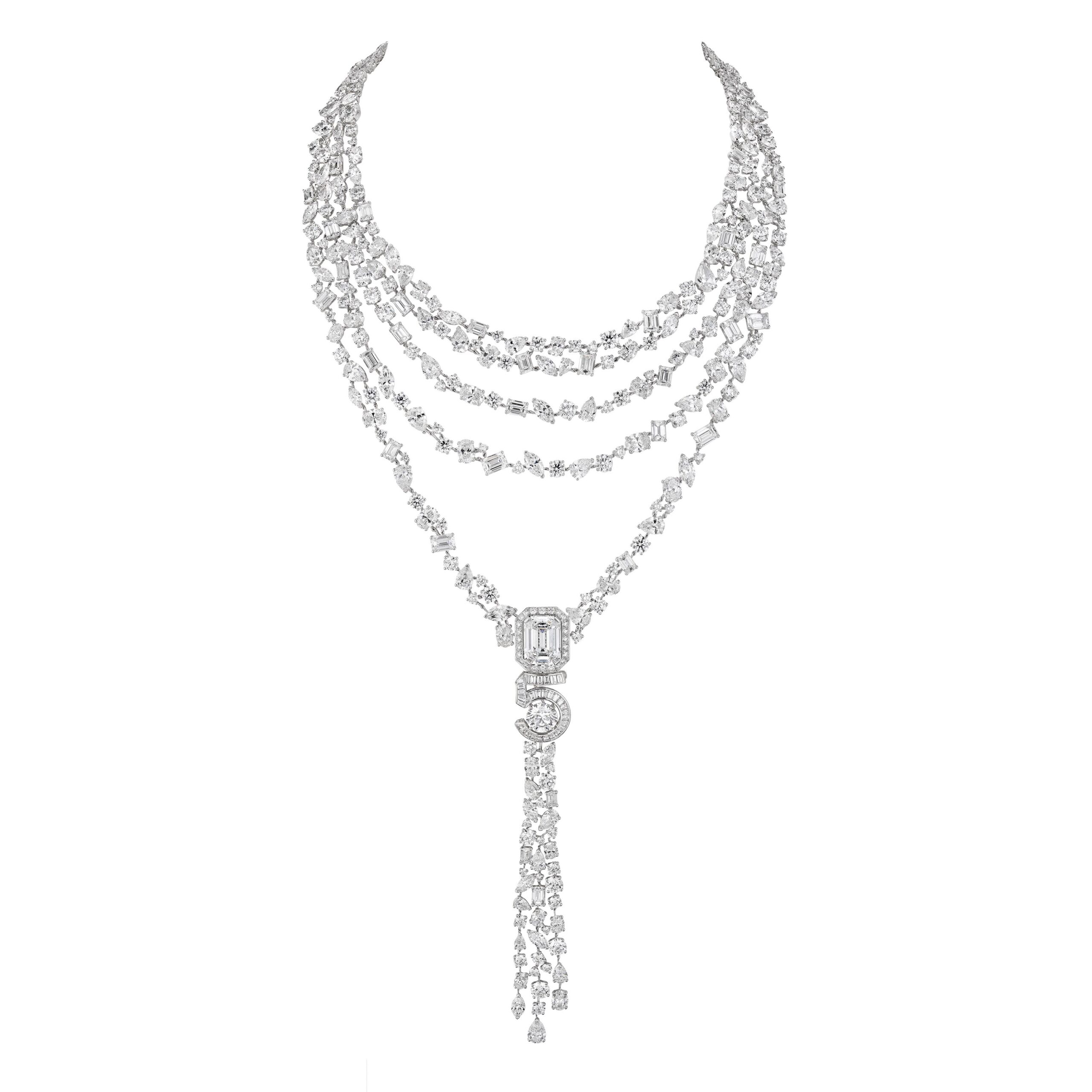 « Gabrielle Chanel a abordé ces deux univers avec les mêmes valeurs visionnaires, privilégiant l’audace et la quête de l’excellence. J’ai voulu retrouver ce geste créatif dans cette collection, conçue comme un cheminement dans les méandres de l’âme du parfum N°5, de l’architecture du flacon à l’explosion olfactive de la fragrance. Le point d’orgue de cette collection inédite est un collier emblématique et exceptionnel serti d’un diamant taillé sur œuvre de 55.55 carats. »