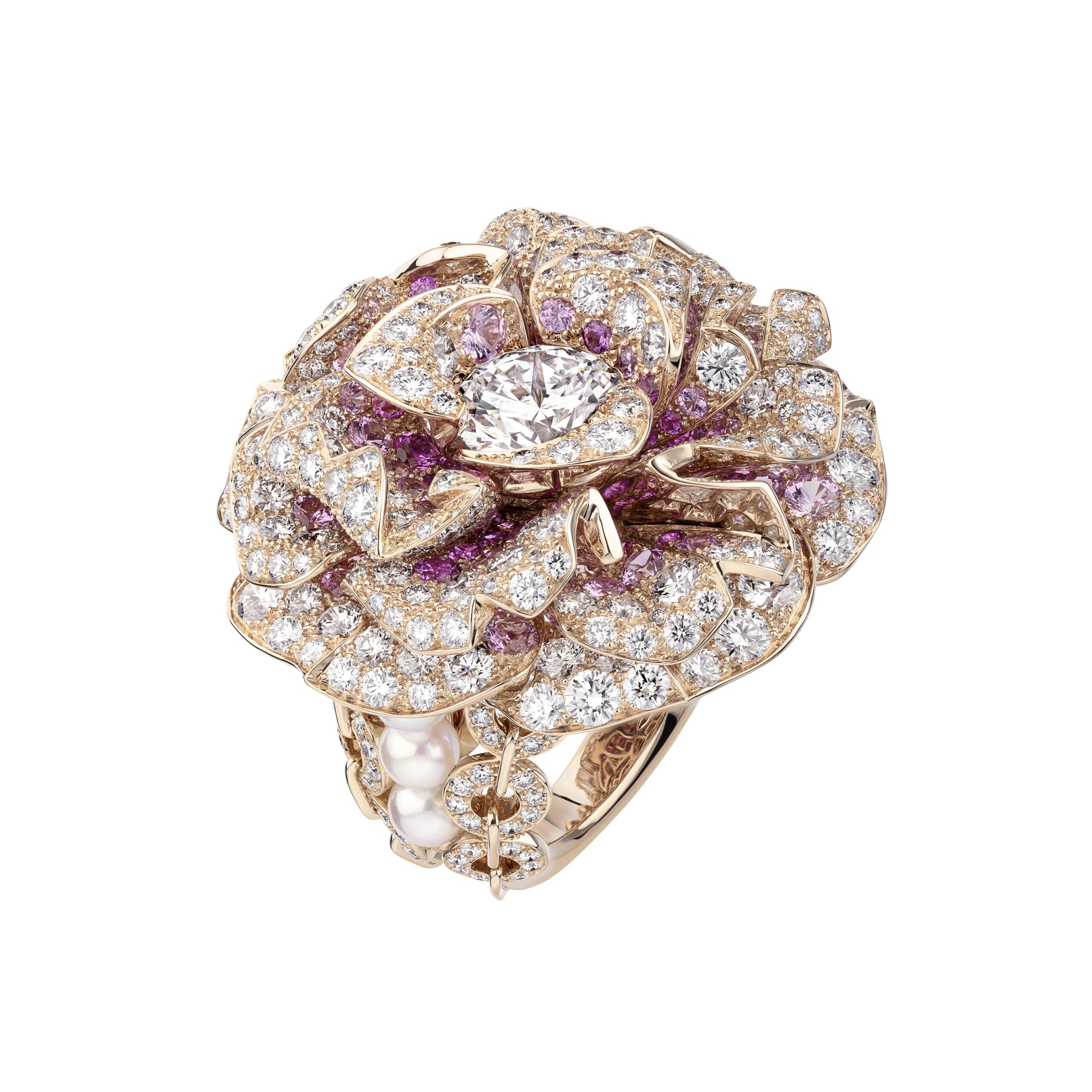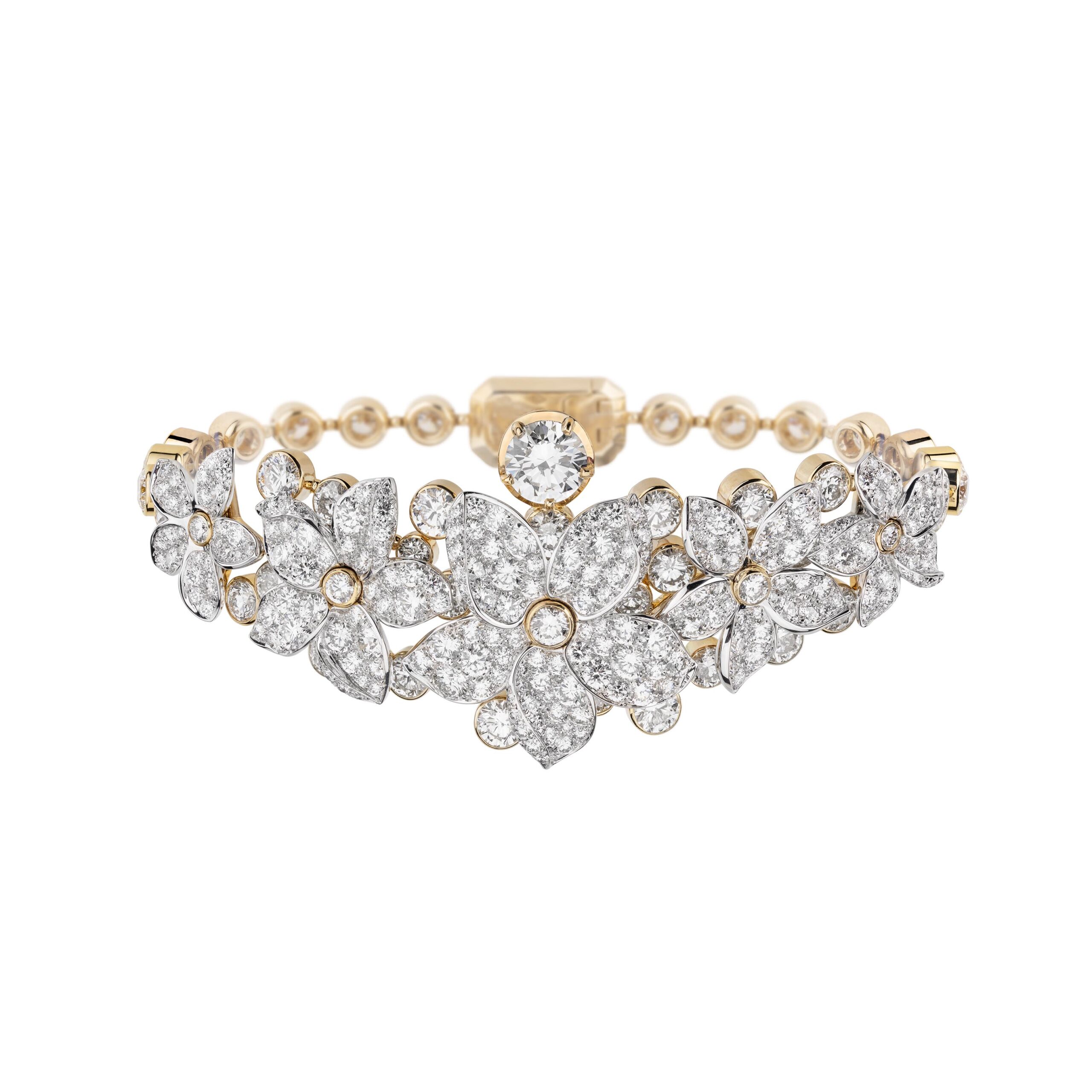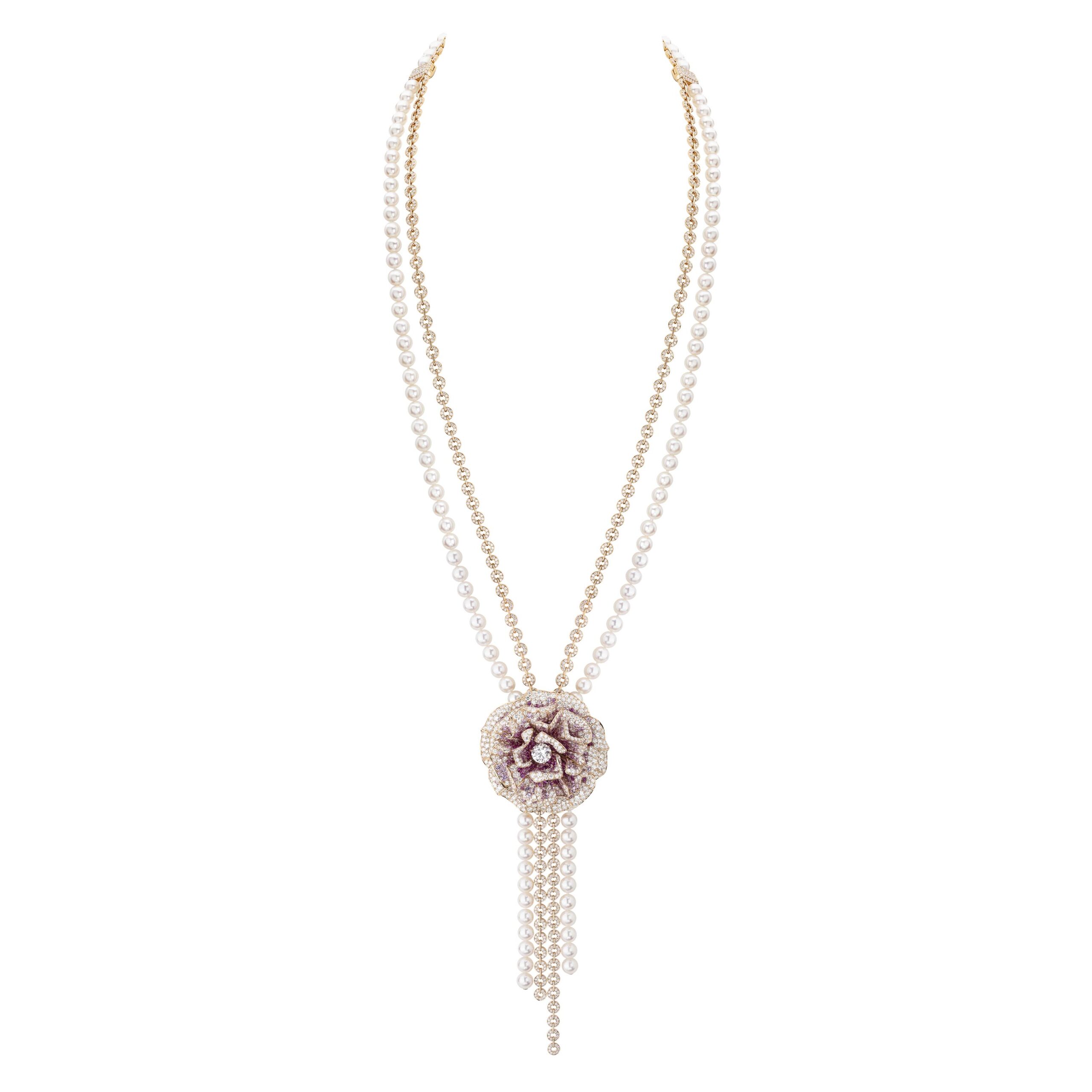 Au cœur de la fragrance, le jasmin de Grasse, la rose de mai, l’ylang-ylang fleurissent sur des ensembles colorés. Travaillées en volume, les fleurs conservent toute leur légèreté tandis que leurs formes, en étoile, en lune et en soleil rappellent les symboles de la collection en platine et diamants de 1932. La fraîcheur du jasmin – qui ressemble à une étoile – embaume une nuée de diamants. Quant à la rose de mai, CHANEL l’interprète généreusement au travers d’une fleur ronde comme la lune aux nombreux pétales teintés de saphirs roses. Ils brillent de toutes leurs gemmes sur un long sautoir en perles et chaîne sertie de brillants. Ouvragé comme un soleil, l’ylang-ylang règne au centre de colliers lumineux où une rosée de diamants apparaît. Enfin, un bouquet asymétrique de fleurs blanches représentant le jasmin, la rose et l’ylang-ylang orne le plastron Absolu N°5, pavé d’une nuée de diamants. Un diamant de 5 carats illumine le motif central qui peut également se porter en broche.
