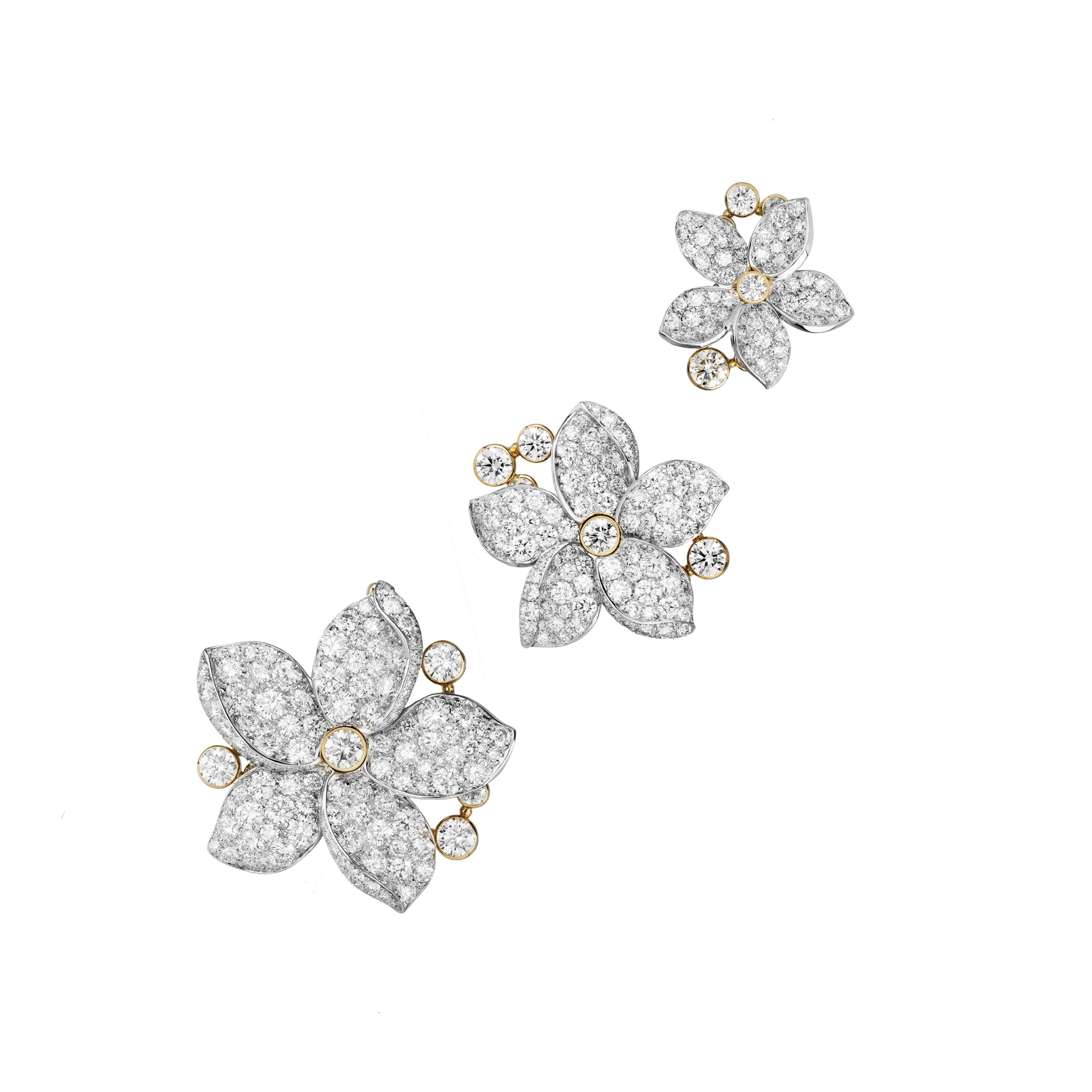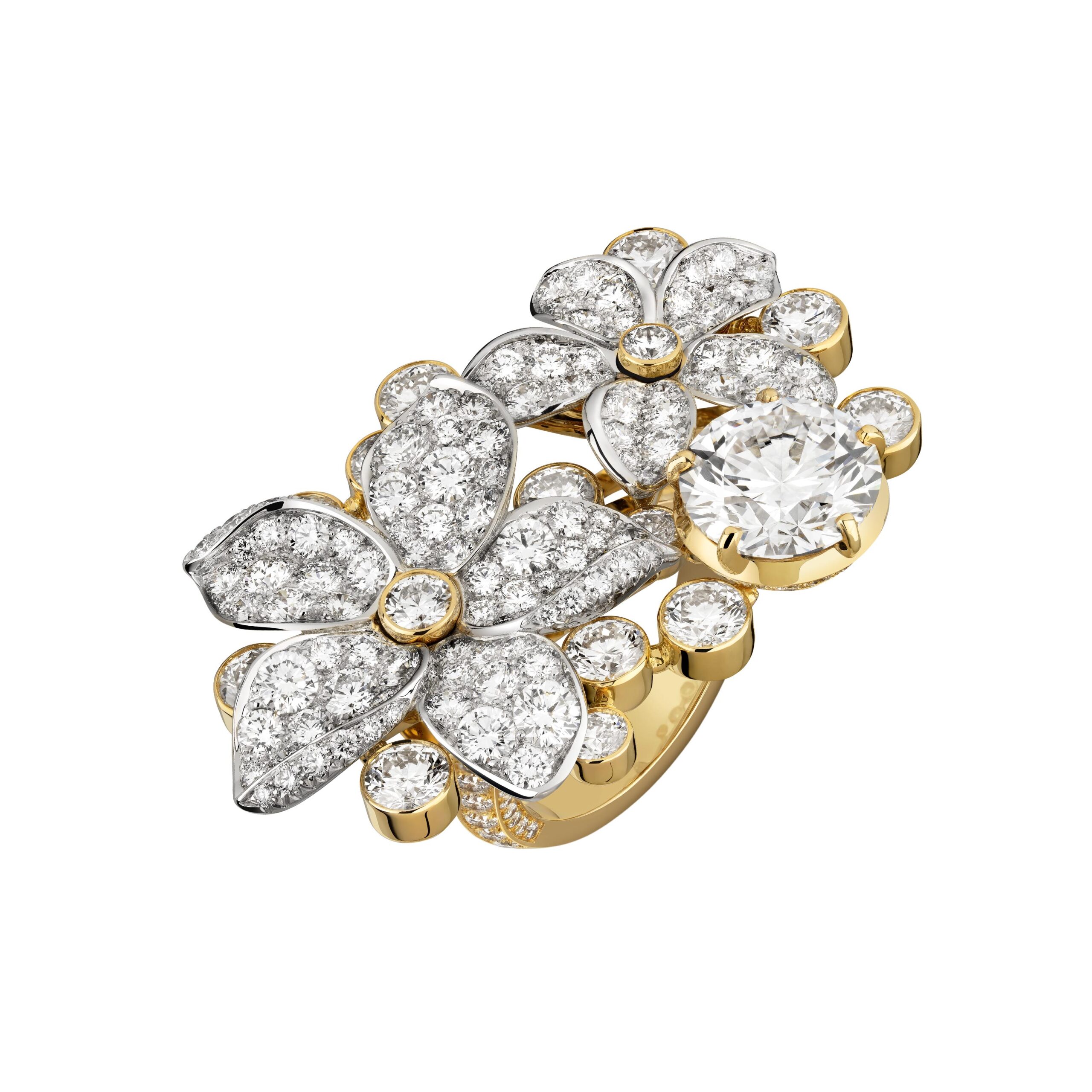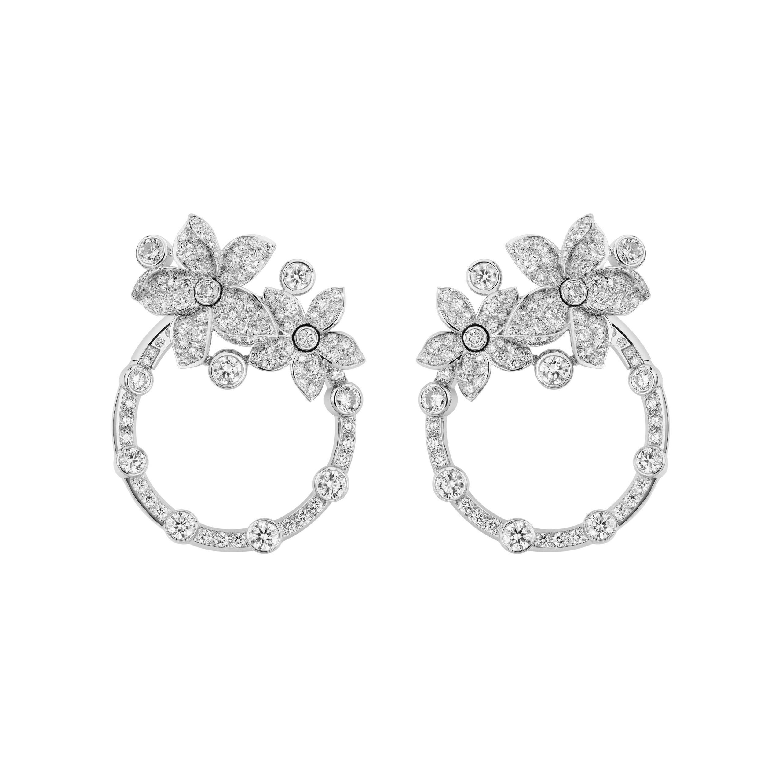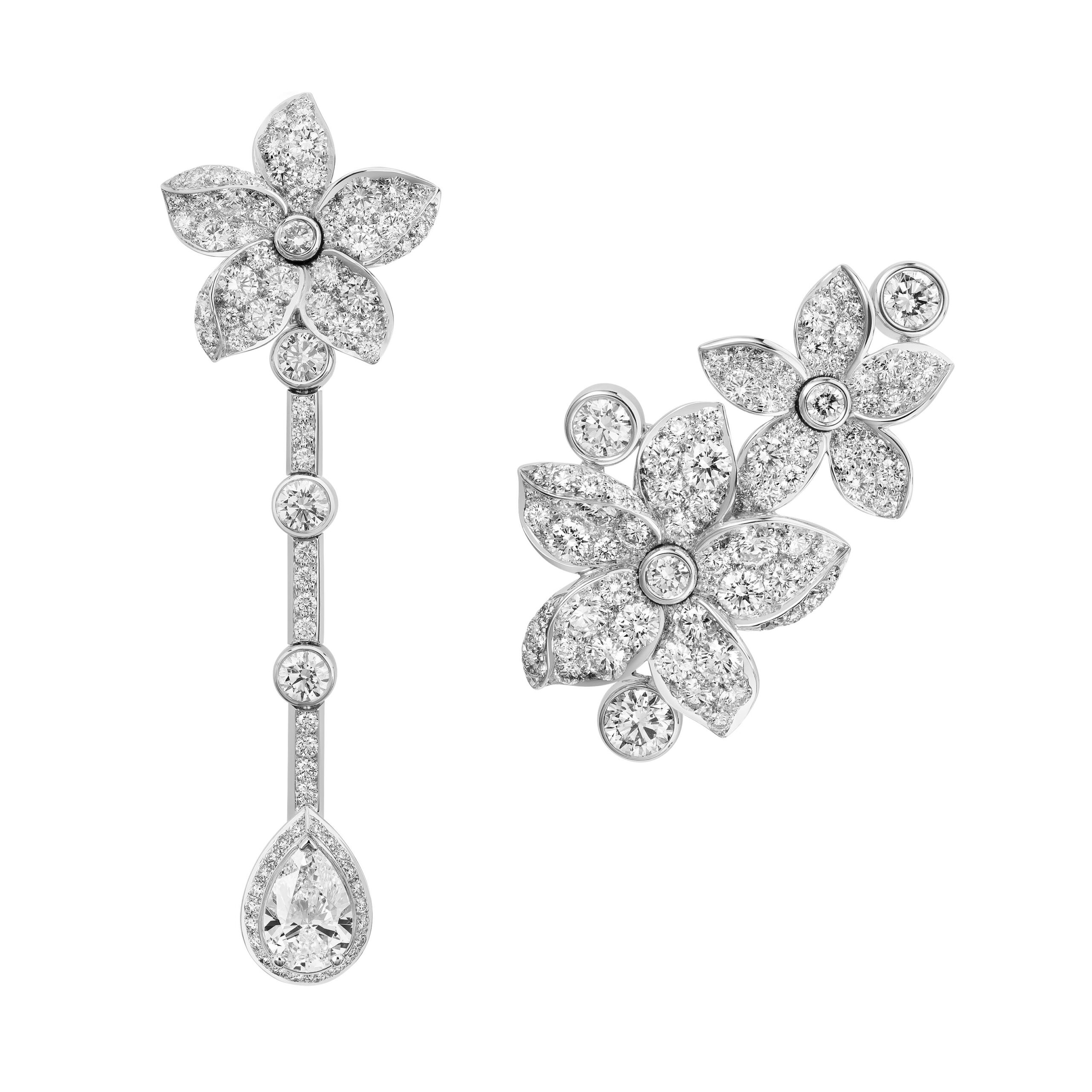 Au cœur de la fragrance, le jasmin de Grasse, la rose de mai, l’ylang-ylang fleurissent sur des ensembles colorés. Travaillées en volume, les fleurs conservent toute leur légèreté tandis que leurs formes, en étoile, en lune et en soleil rappellent les symboles de la collection en platine et diamants de 1932. La fraîcheur du jasmin – qui ressemble à une étoile – embaume une nuée de diamants. Quant à la rose de mai, CHANEL l’interprète généreusement au travers d’une fleur ronde comme la lune aux nombreux pétales teintés de saphirs roses. Ils brillent de toutes leurs gemmes sur un long sautoir en perles et chaîne sertie de brillants. Ouvragé comme un soleil, l’ylang-ylang règne au centre de colliers lumineux où une rosée de diamants apparaît. Enfin, un bouquet asymétrique de fleurs blanches représentant le jasmin, la rose et l’ylang-ylang orne le plastron Absolu N°5, pavé d’une nuée de diamants. Un diamant de 5 carats illumine le motif central qui peut également se porter en broche.