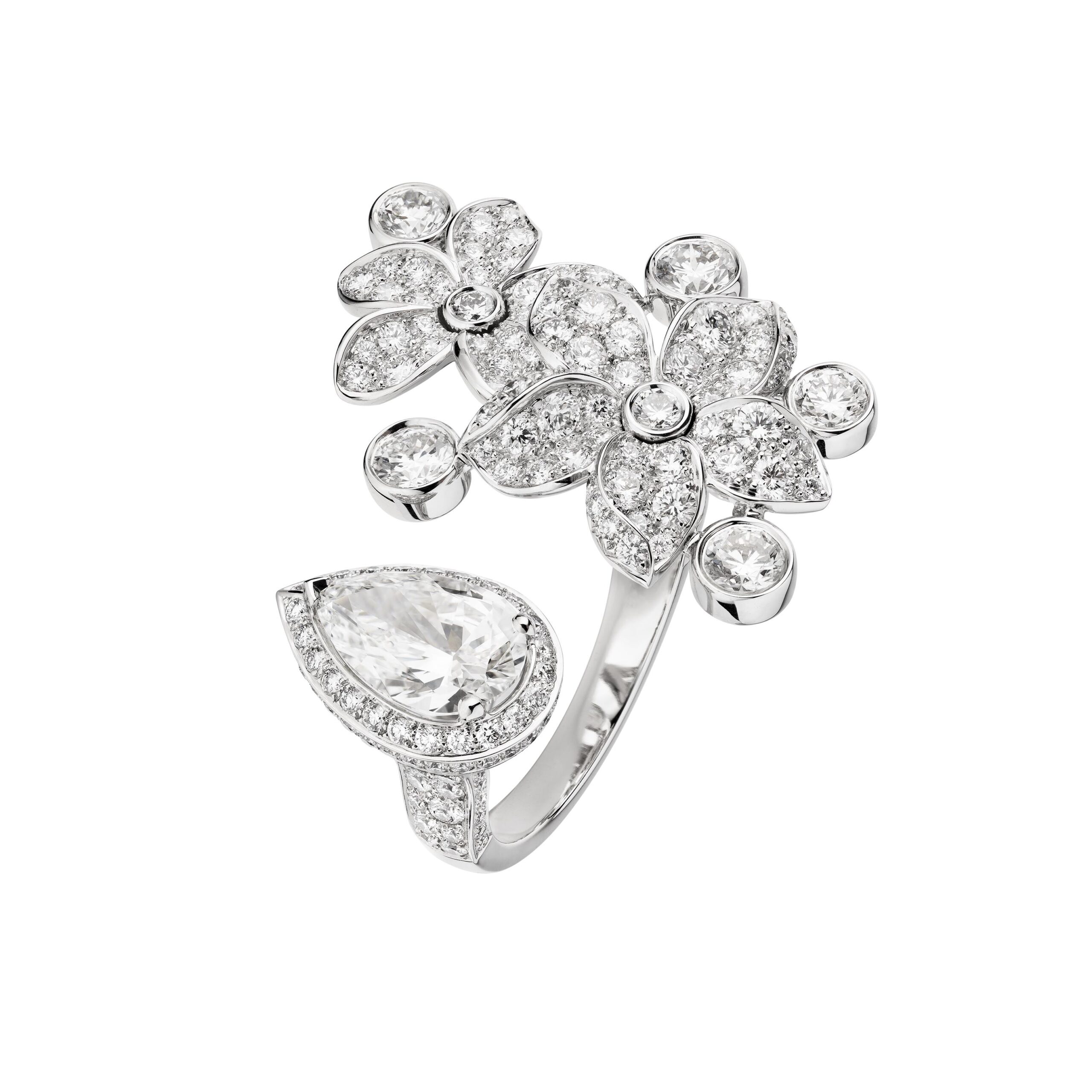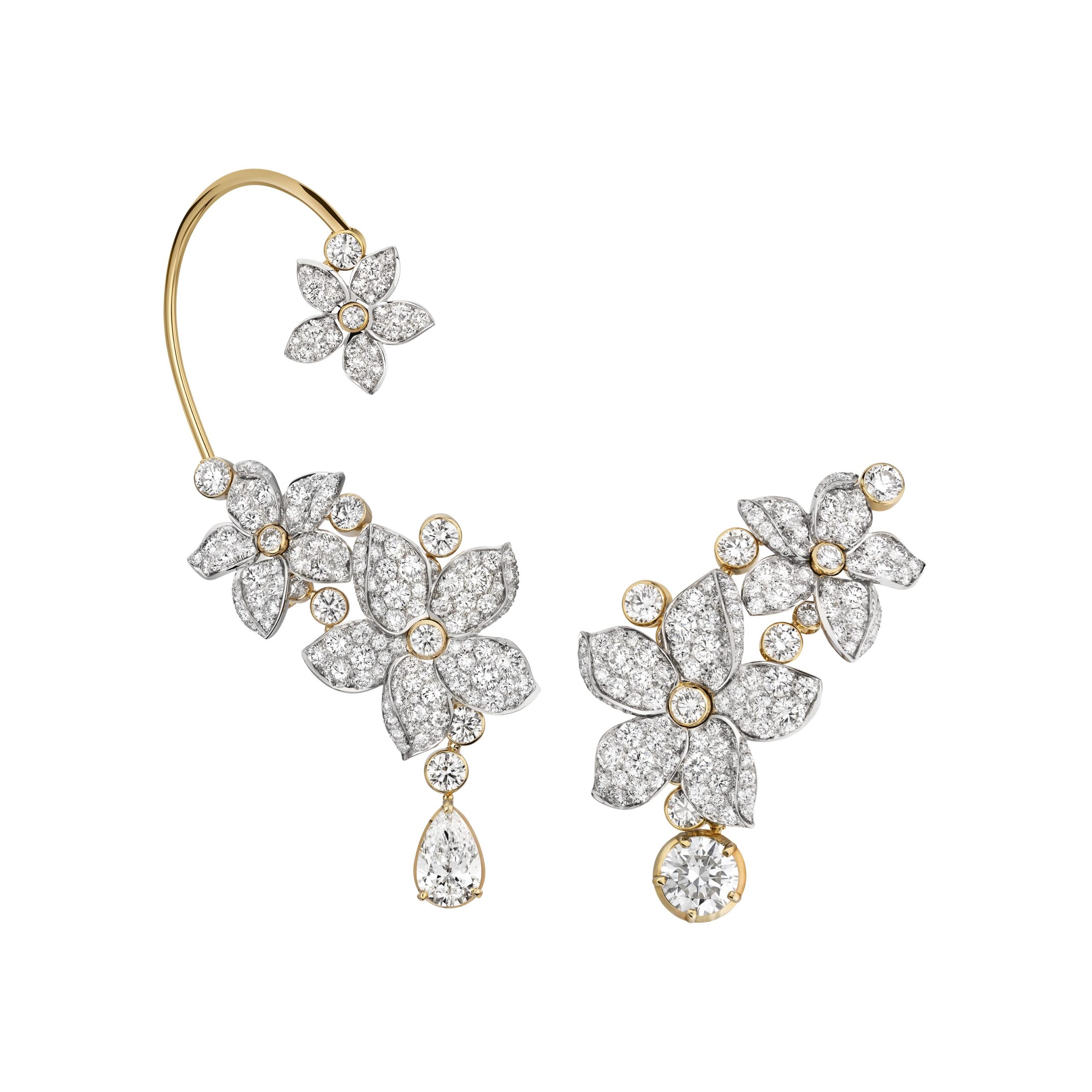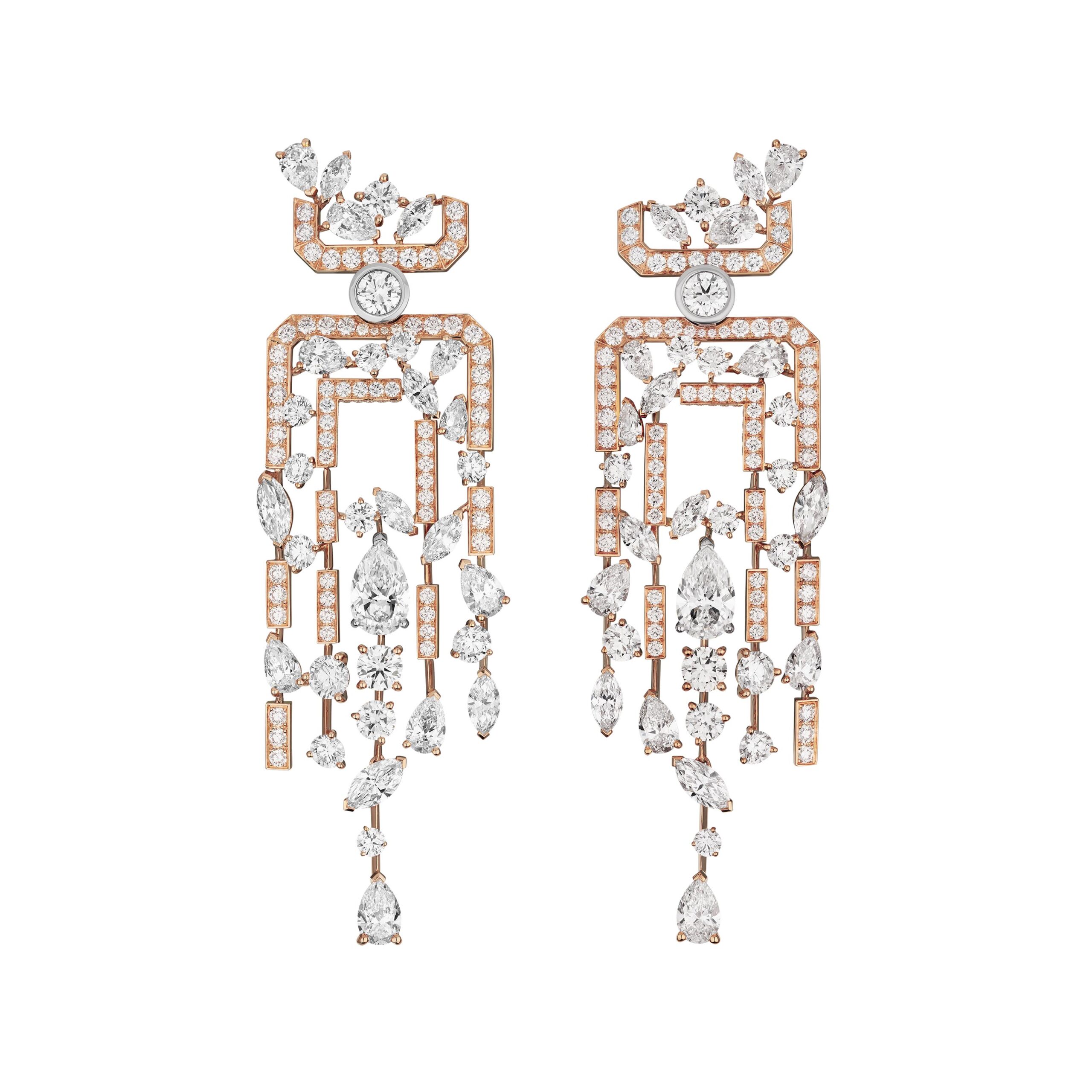 De ces flacons aux lignes aériennes s’échappent des larmes de diamants poire et de morganites rosées qui coulent sur la peau, telles des gouttes de parfum divin.