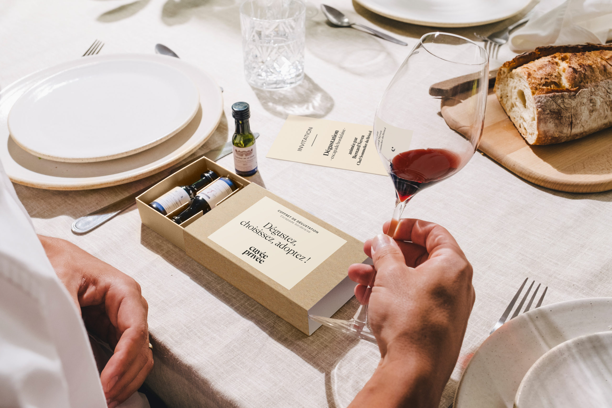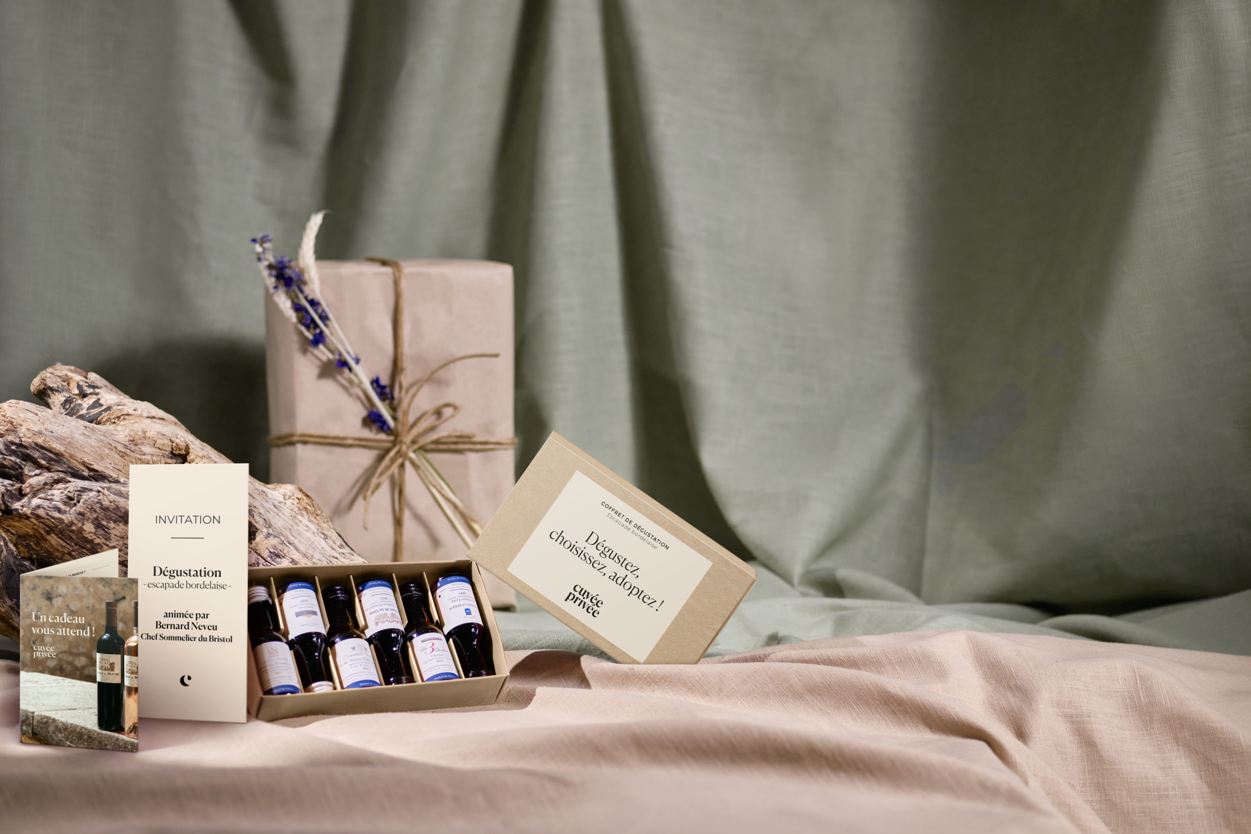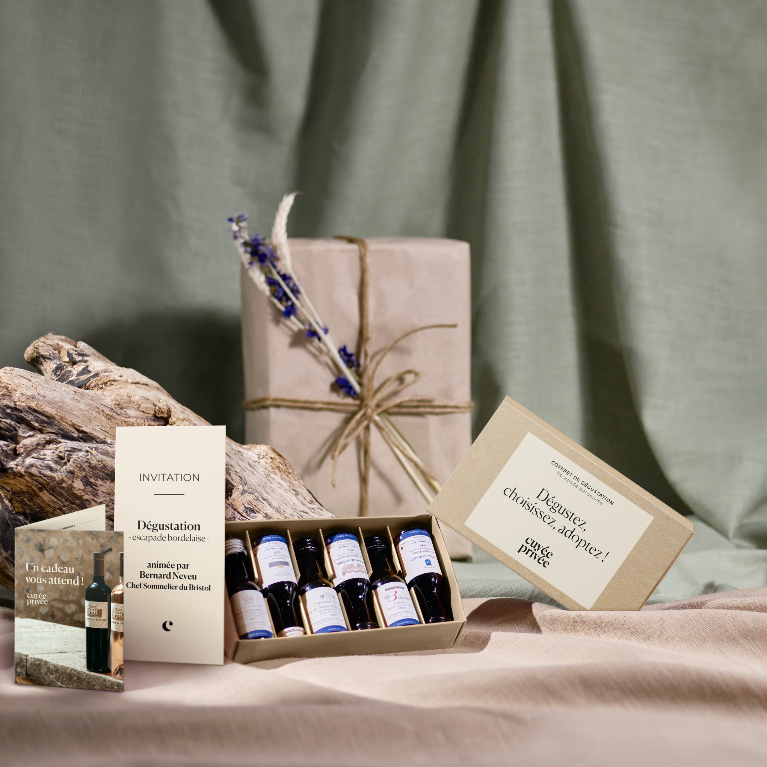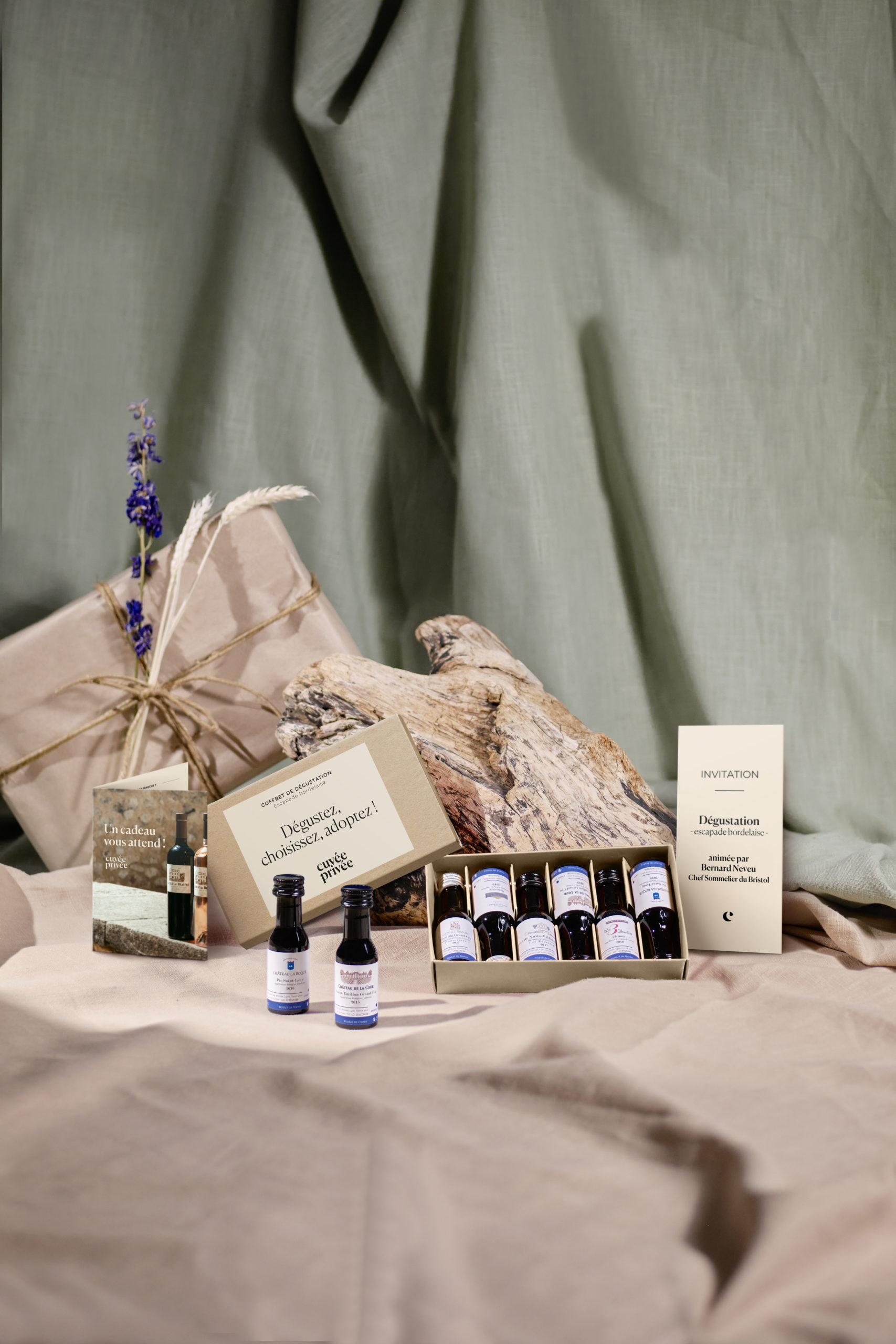 Le coffret comprend six vinottes de 2cl des cuvées de Bordeaux proposées par Cuvée Privée. Le but est de pouvoir les déguster afin de choisir sa préférée avant d’en adopter les vignes !