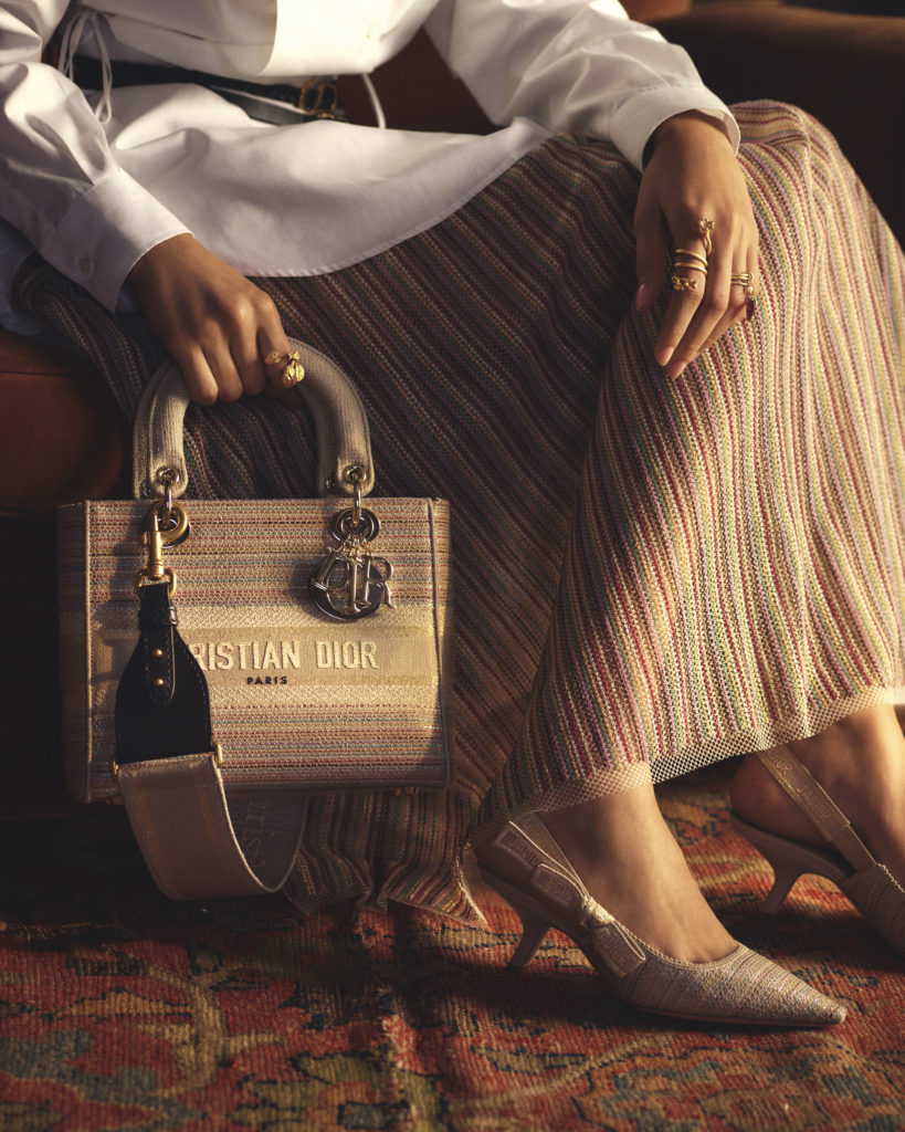 Magnifiant les silhouettes, l’or incarne et fait rayonner l’audace et la créativité atemporelles de la Maison. À travers la capsule Dior Or, Maria Grazia Chiuri réinterprète des modèles iconiques en de subtiles versions rehaussées de touches dorées, en hommage à la préciosité unique de ce code Dior. La Directrice Artistique des collections féminines revisite ainsi des robes et des jupes légères en tulle, en soie ou en résille multicolore ; tandis que les sacs se dévoilent dans des couleurs douces, à l’instar du Dior Book Tote – décliné également dans un format mini –, du Lady Dior, du Saddle et du Dior Caro, finement brodés de fils métallisés – témoignages du savoir-faire virtuose des ateliers. Une sélection d’accessoires d’exception ainsi que des chaussures enrichissent cet univers onirique et romantique, reflet d’un style résolument Dior.