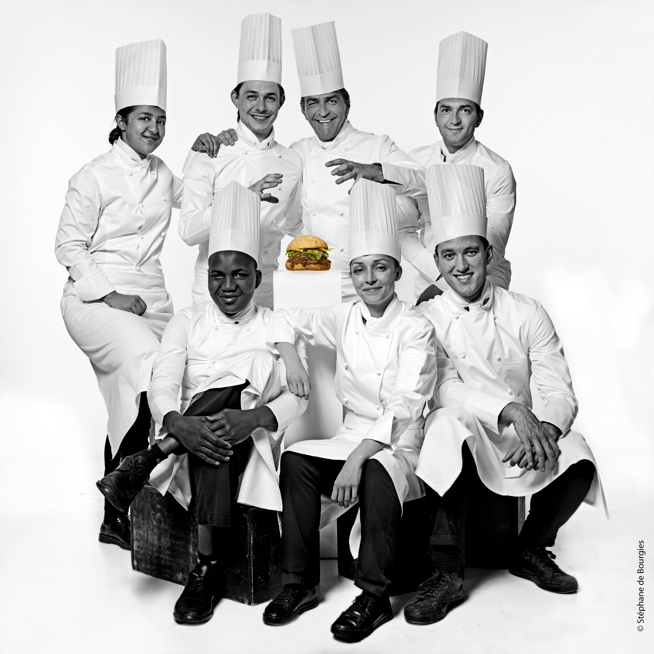 Ils se sont amusés à adapter les réflexes de belle cuisine à la street food en imaginant deux burgers gourmands, simples et bien faits. Il propose une interprétation très “parisienne” de ce sandwich iconique en appliquant les spécialités de la capitale ; une viande maturée à point, assaisonnée et cuisinée comme un steak au poivre ou façon « Maître d’hôtel » dans un pain atypique créé pour l’occasion. Ils ont aussi pensé aux végétariens en remplaçant la viande par une préparation appelée « boudin noir végétal », composé de riz noir, betteraves et semoule et évidement servit avec un condiment de pommes.