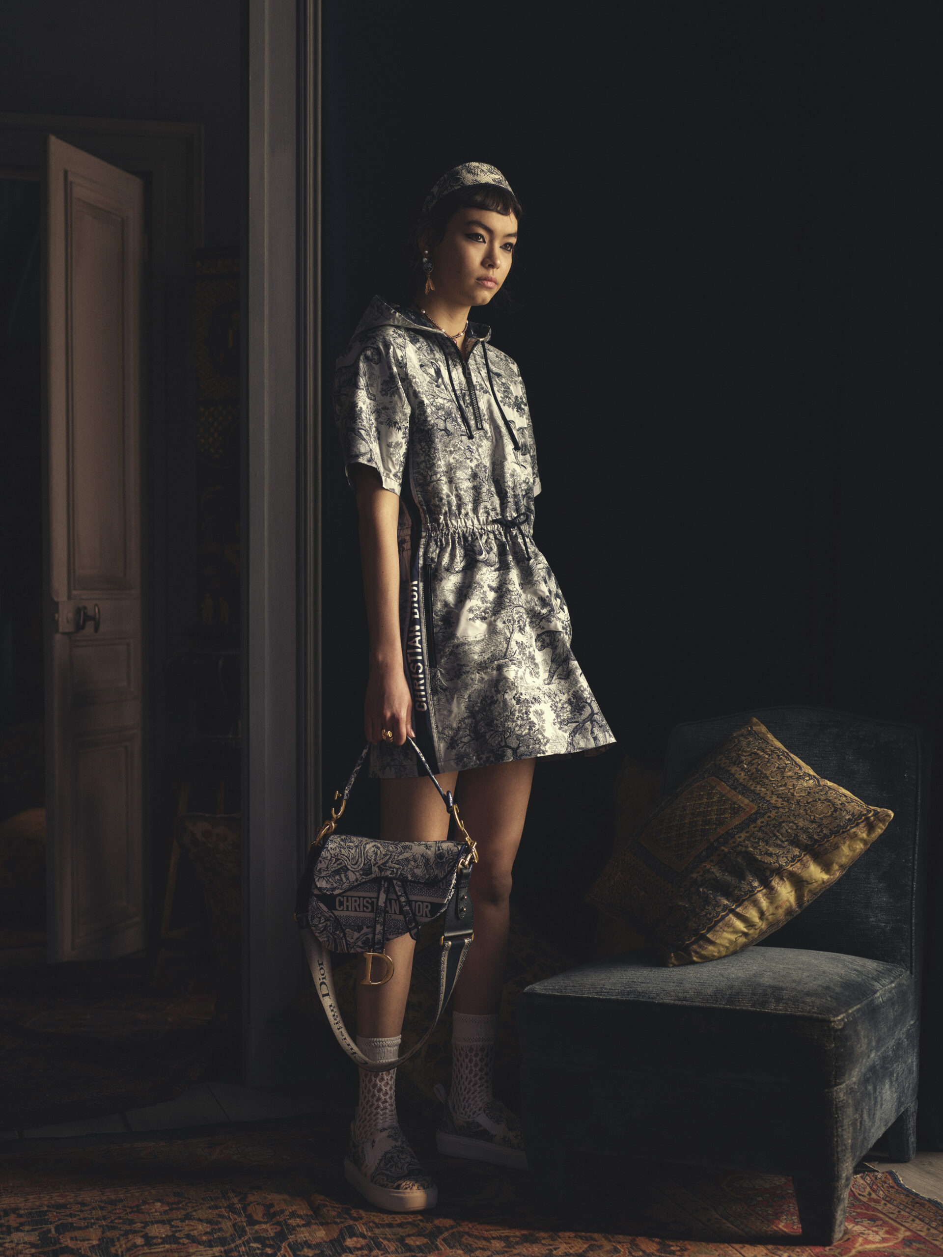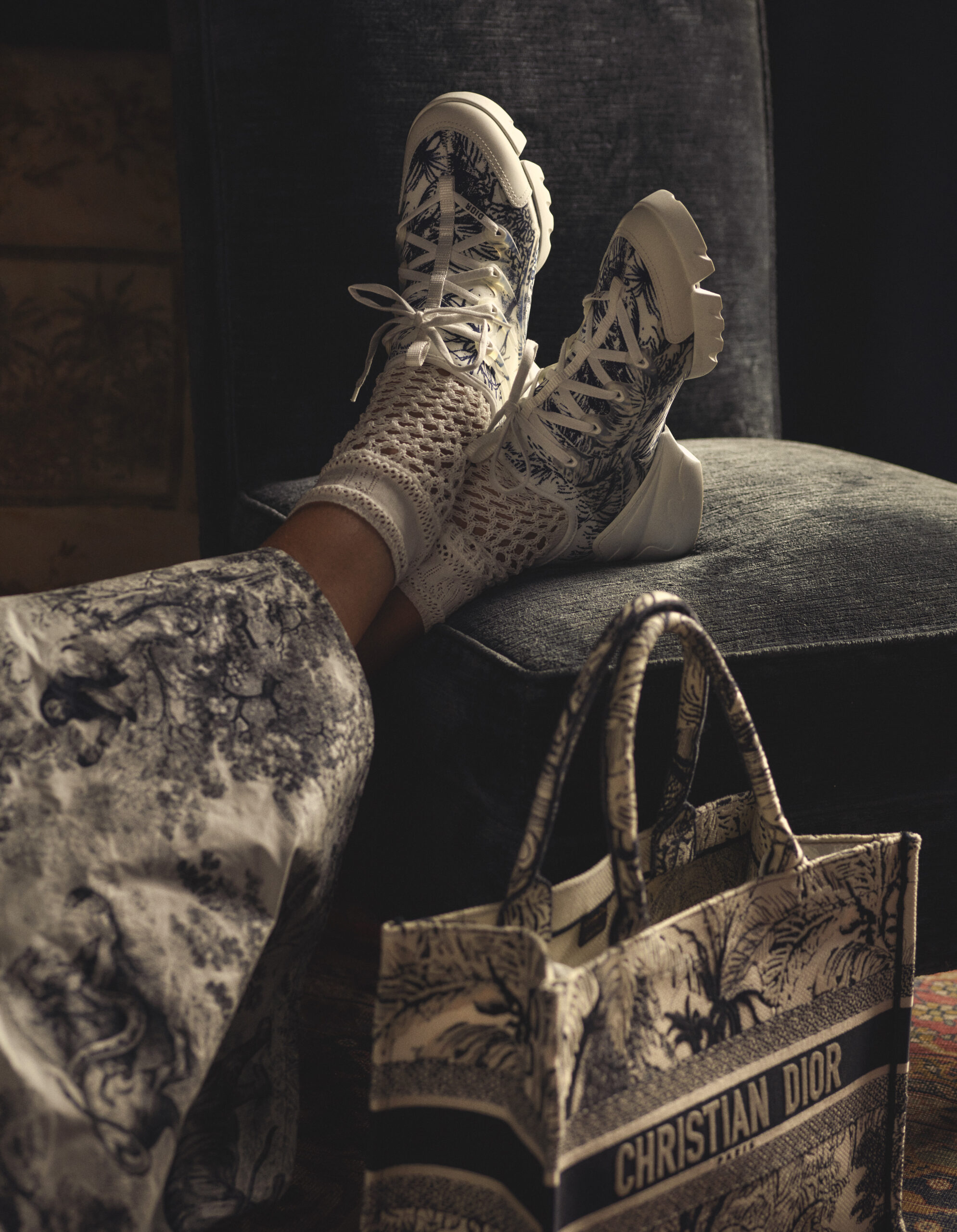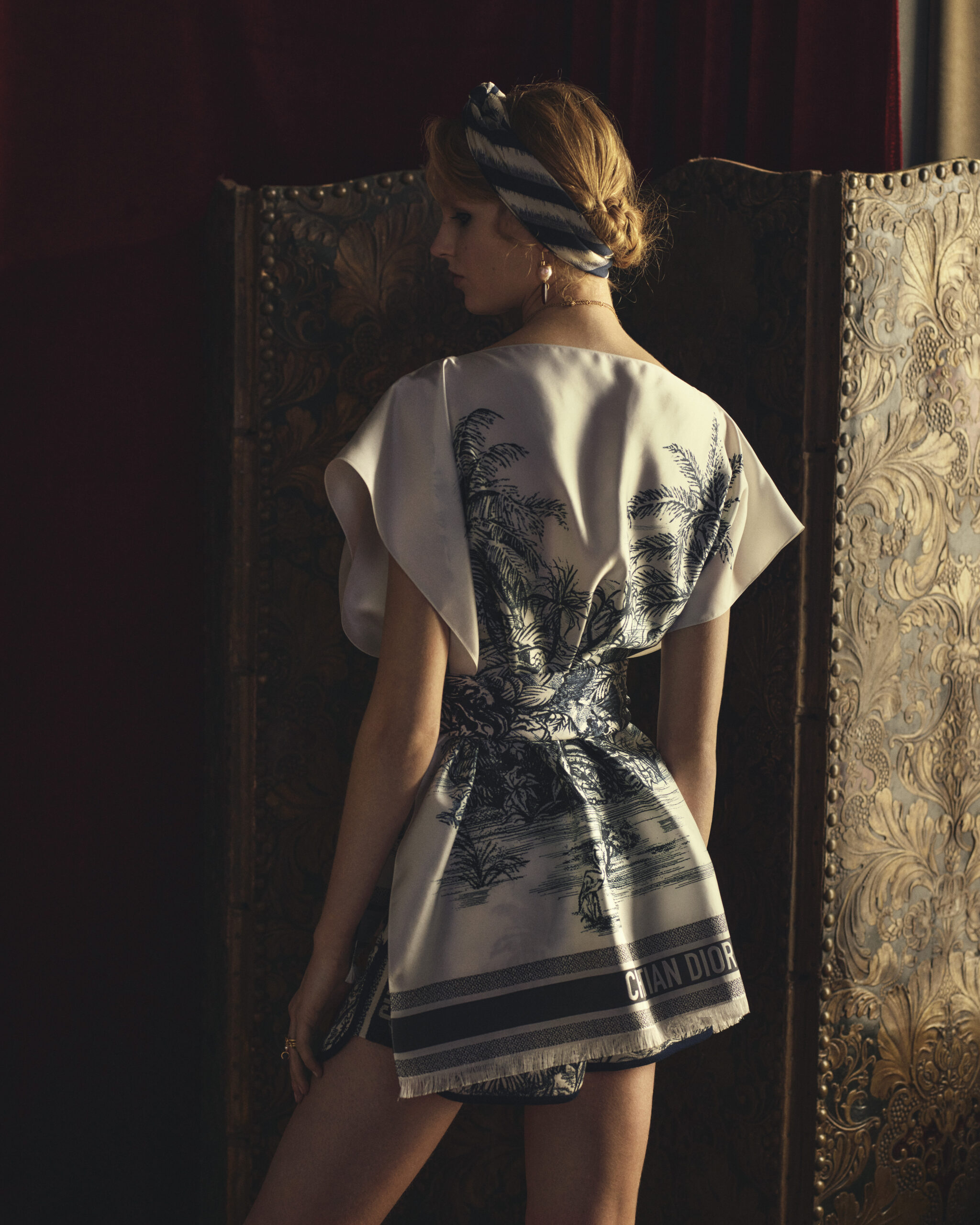 Invitation au raffinement et à la douceur de vivre, la collection Dior Chez Moi, composée de tenues d’intérieur imaginées par Maria Grazia Chiuri, s’enrichit de pièces inédites. Les précieux ensembles de pyjamas, les peignoirs et les ponchos côtoient désormais d’irrésistibles robes et shorts ponctués du motif Dior Oblique, code iconique et atemporel de la Maison, ainsi que de l’incontournable toile de Jouy – revisitée dans une version tropicale bleue et blanche ornée de majestueux palmiers. Cette flore éblouissante s’épanouit également sur des accessoires emblématiques à l’instar du sac Dior Book Tote, de mules brodées ou encore des foulards Mitzah. Un art de l’élégance et de la liberté, réinventé.