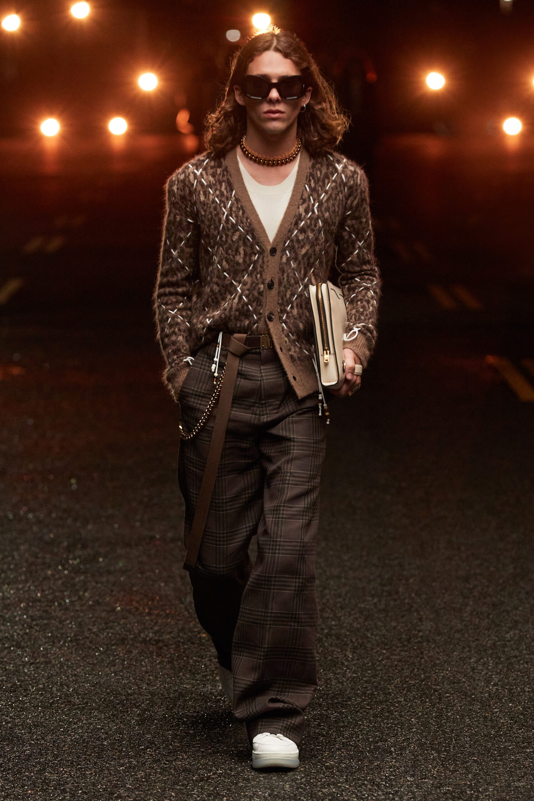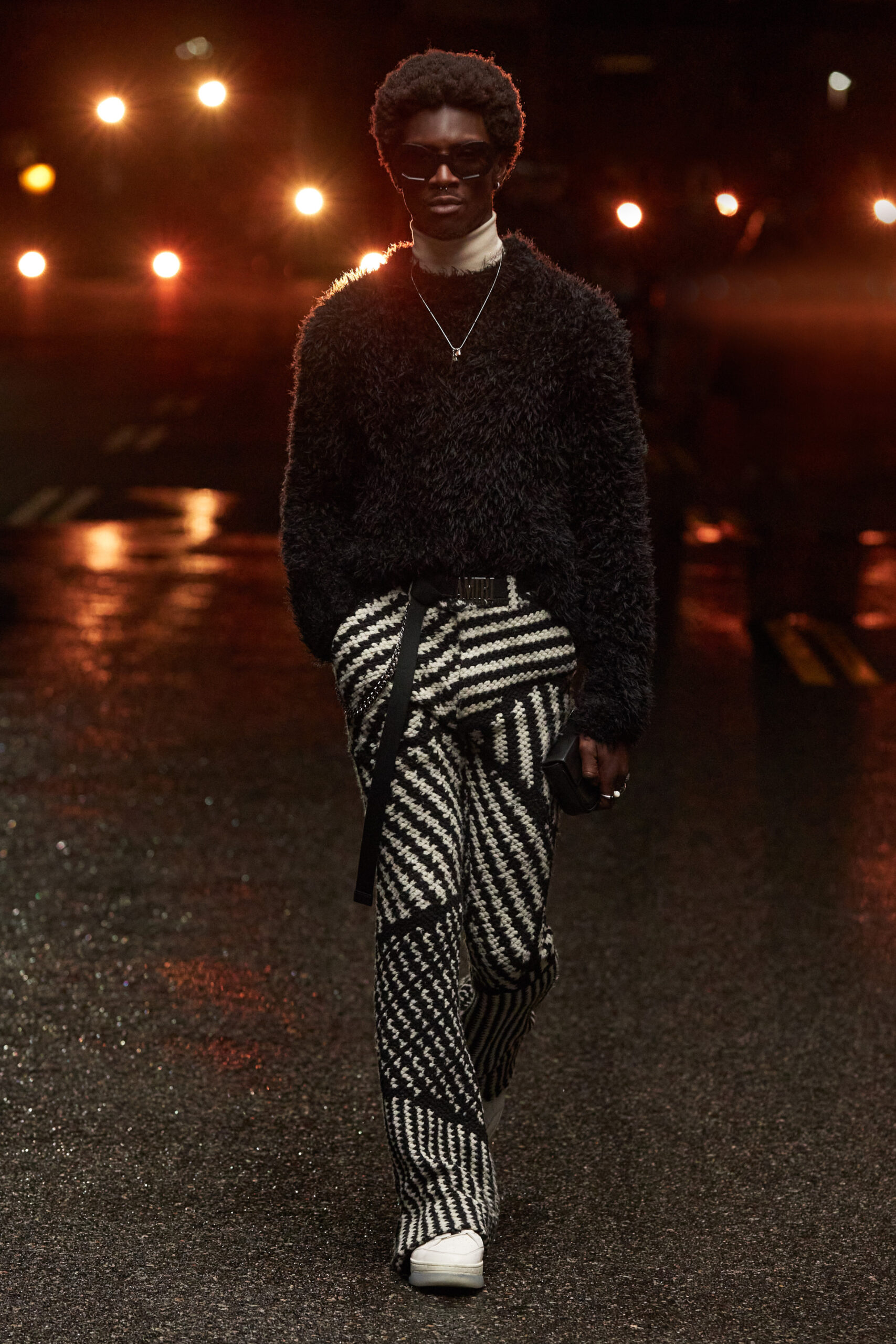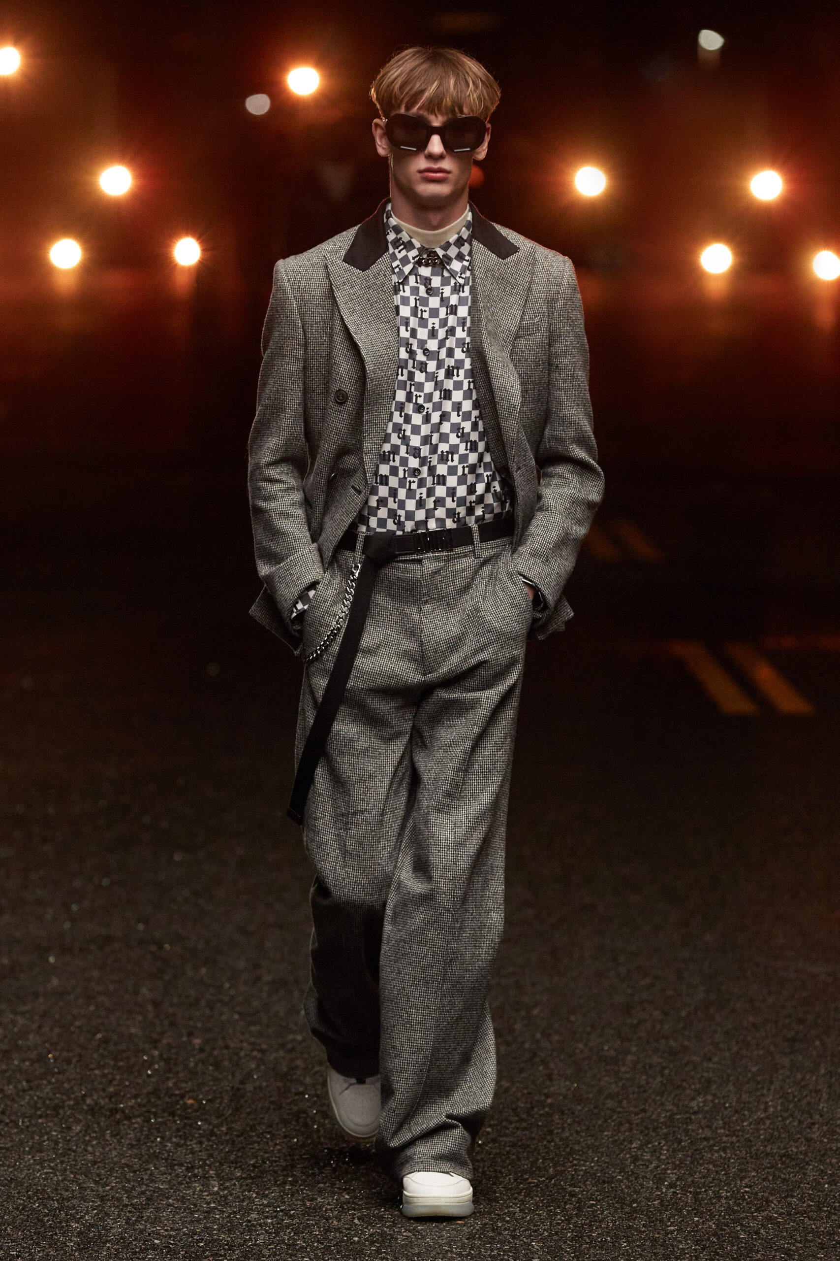 A hybrid evolution of formal and informal codes, opulent materials are contrasted with or made into the everyday, mirroring DTLA’s artistic canvases: from the streets to the galleries. This dialogue is explored through brushed mohair, soft cashmere, English houndstooth, Japanese plaid, leather, lurex, organza and faux-fur leopard. A subversion of traditional formal dress codes, tailoring is softened and crafted with debonair personality – layered above sweatshirts, argyle knitwear, turtlenecks and loose cardigans. Faux-fur features throughout, defining broader silhouettes and a deep textural spectrum.