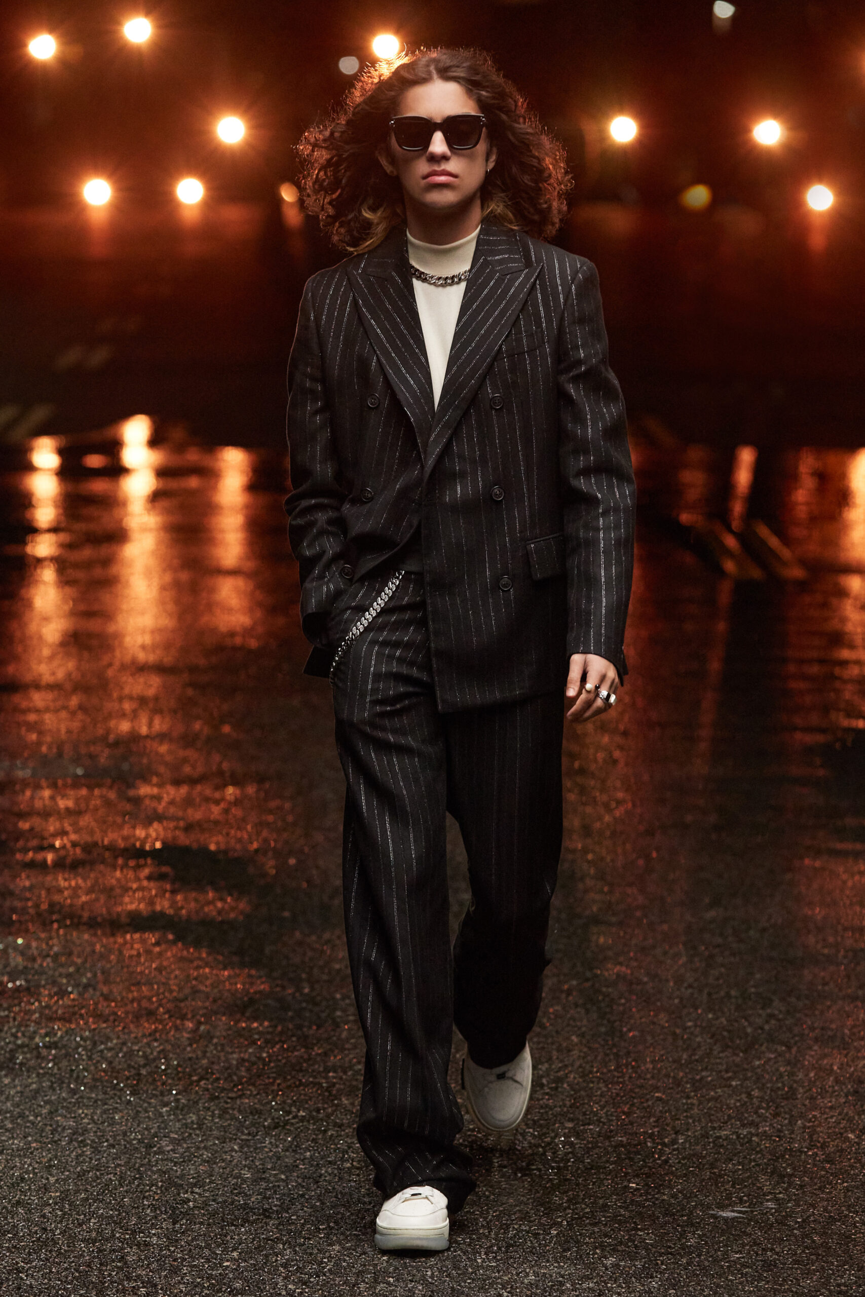 Representing the art world’s changing of the guard, traditional bouclé fabrics are cut in contemporary shapes and bold outerwear completes each look: coated trenches, animal-print teddy jackets and double-breasted Italian wool overcoats. Swarovski crystal details and organza shirting with paillette embroidery conjure DTLA after-hours and nod to the joy of getting dressed up. Abstract painters and thinkers punctuate the collection: in tactile mohair sweaters, revere-collar silks, lurex roll necks and corduroy flare pants.