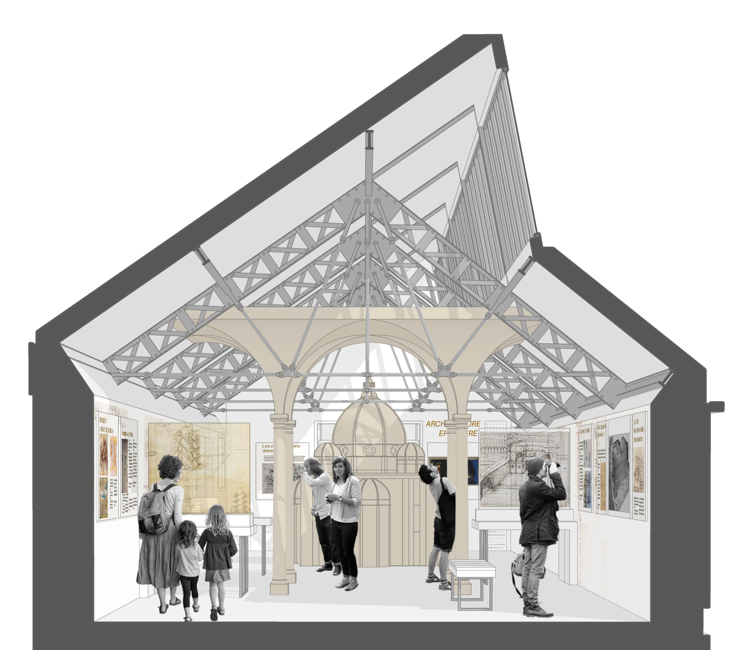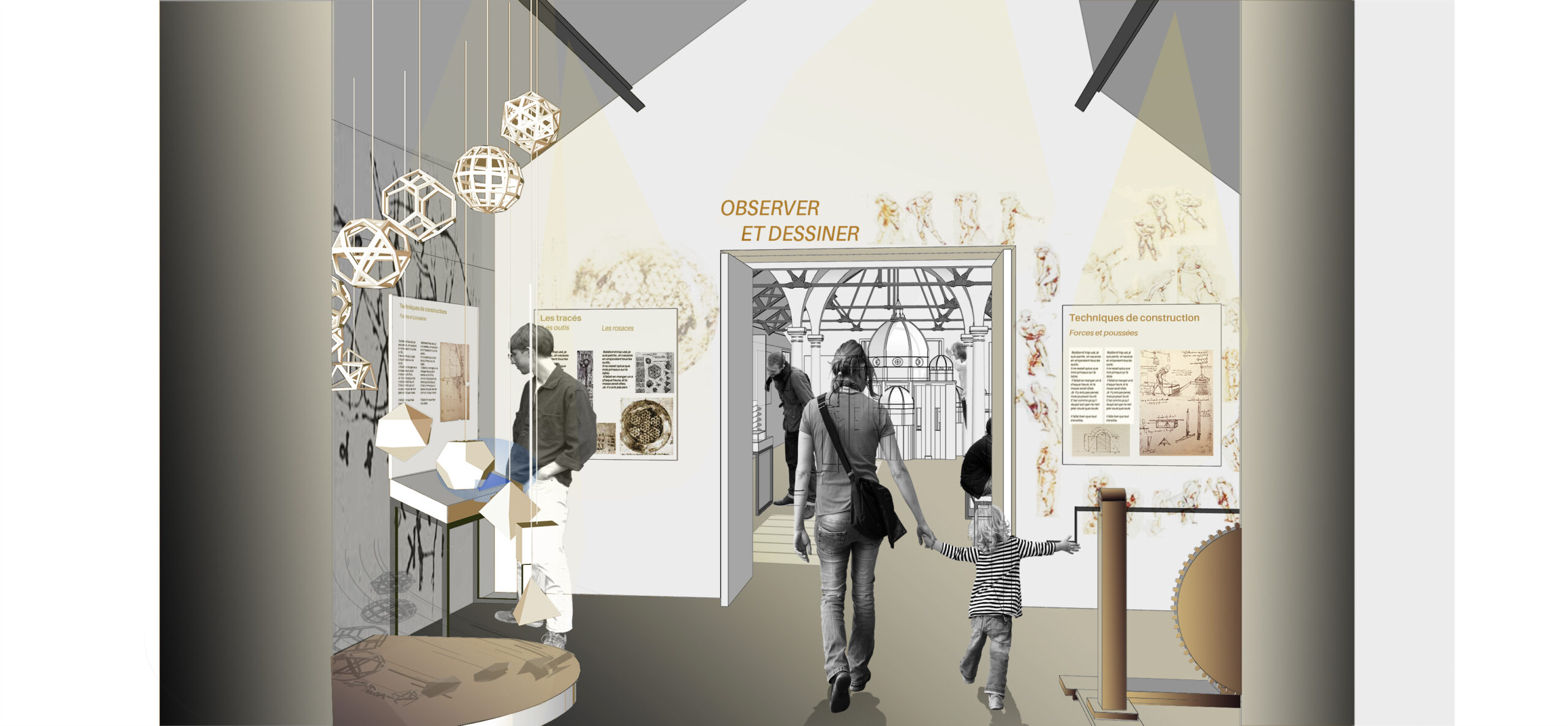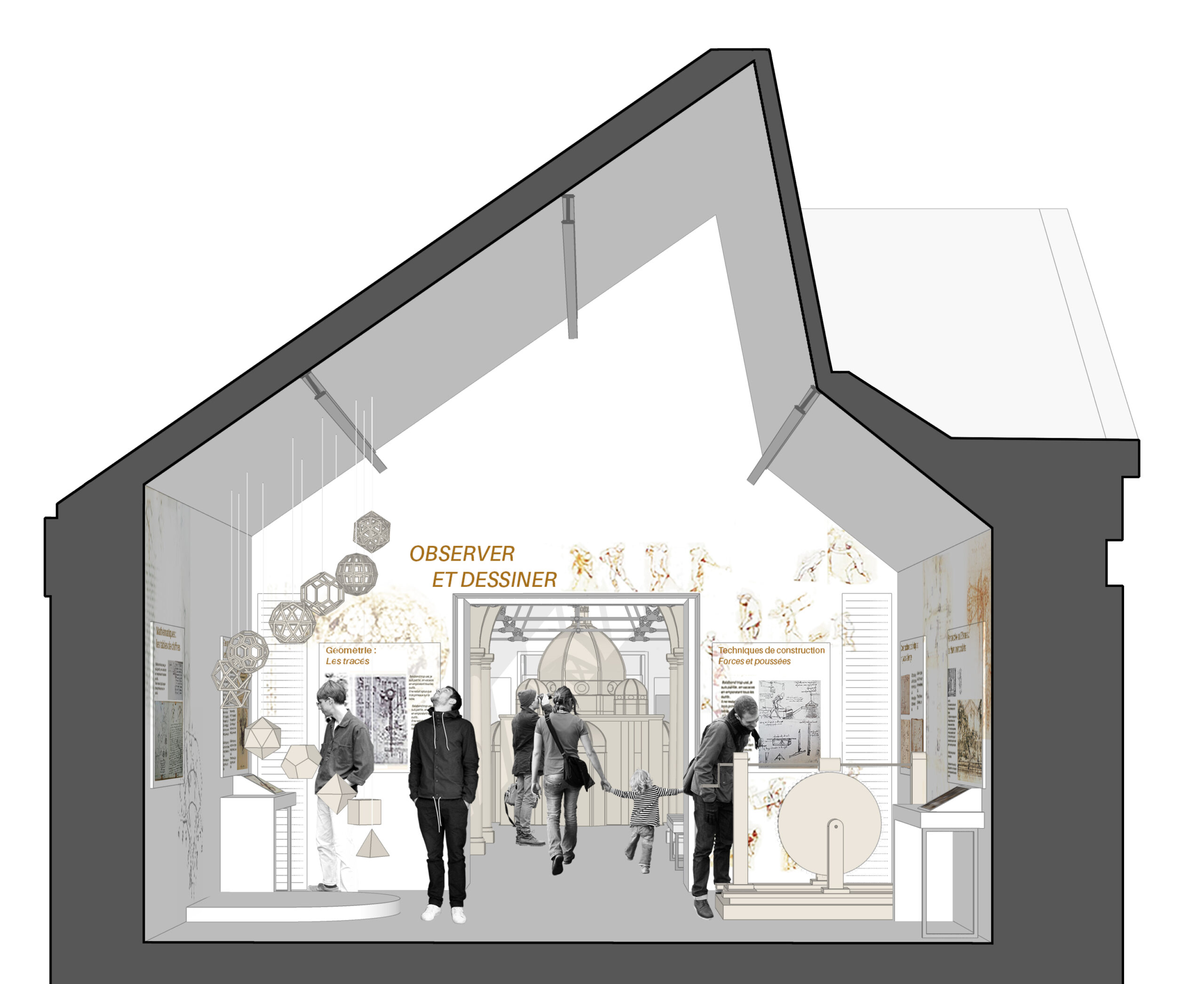 « La visite commence par la galerie haute autour de la figure de l’architecte et se poursuit par le spectacle immersif. La scénographie des Galeries a été élaborée pour donner des clés de compréhension au visiteur grâce à une approche esthétique et sensible et par des médias interactifs, ludiques et immersifs. » Anne Carles