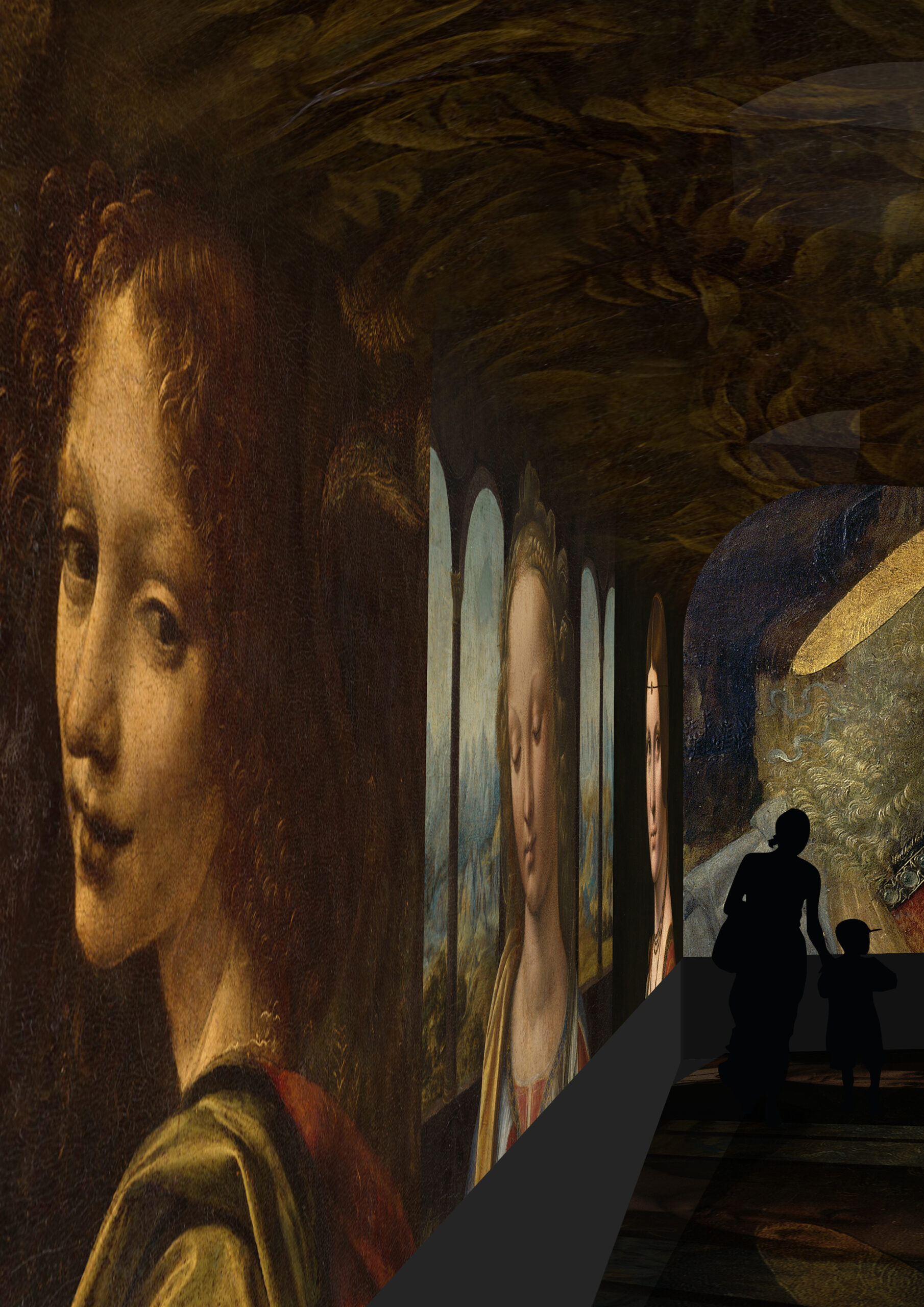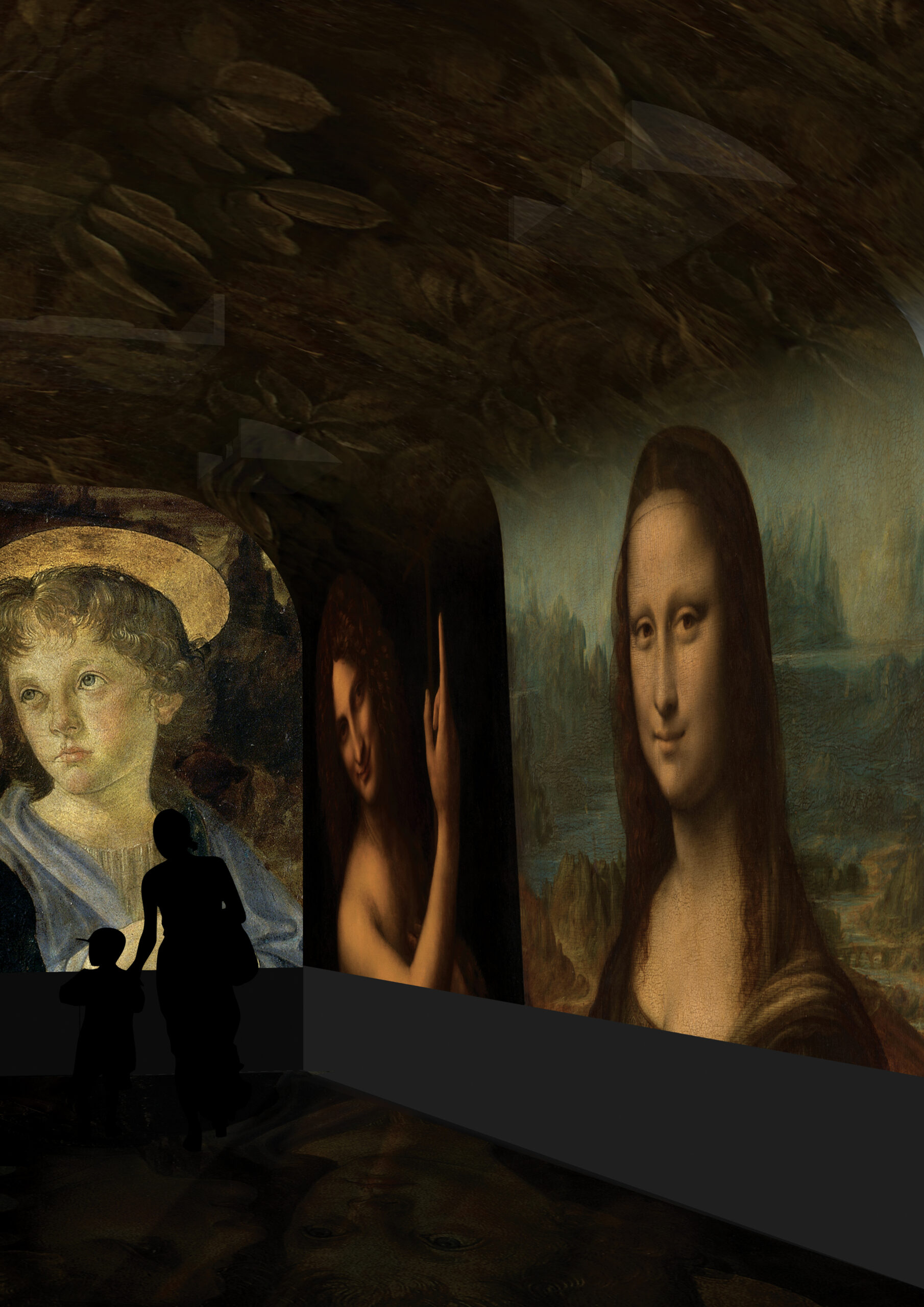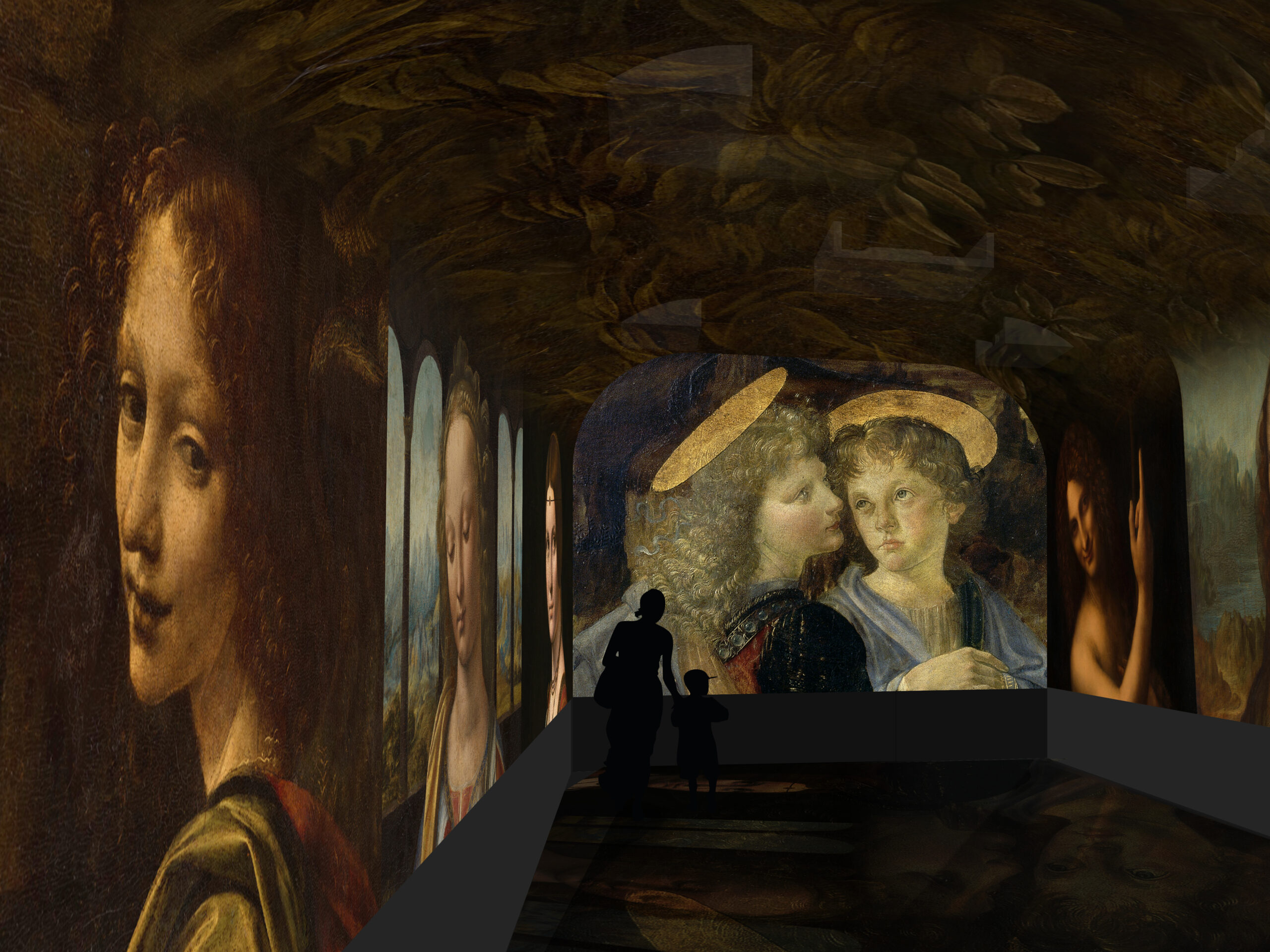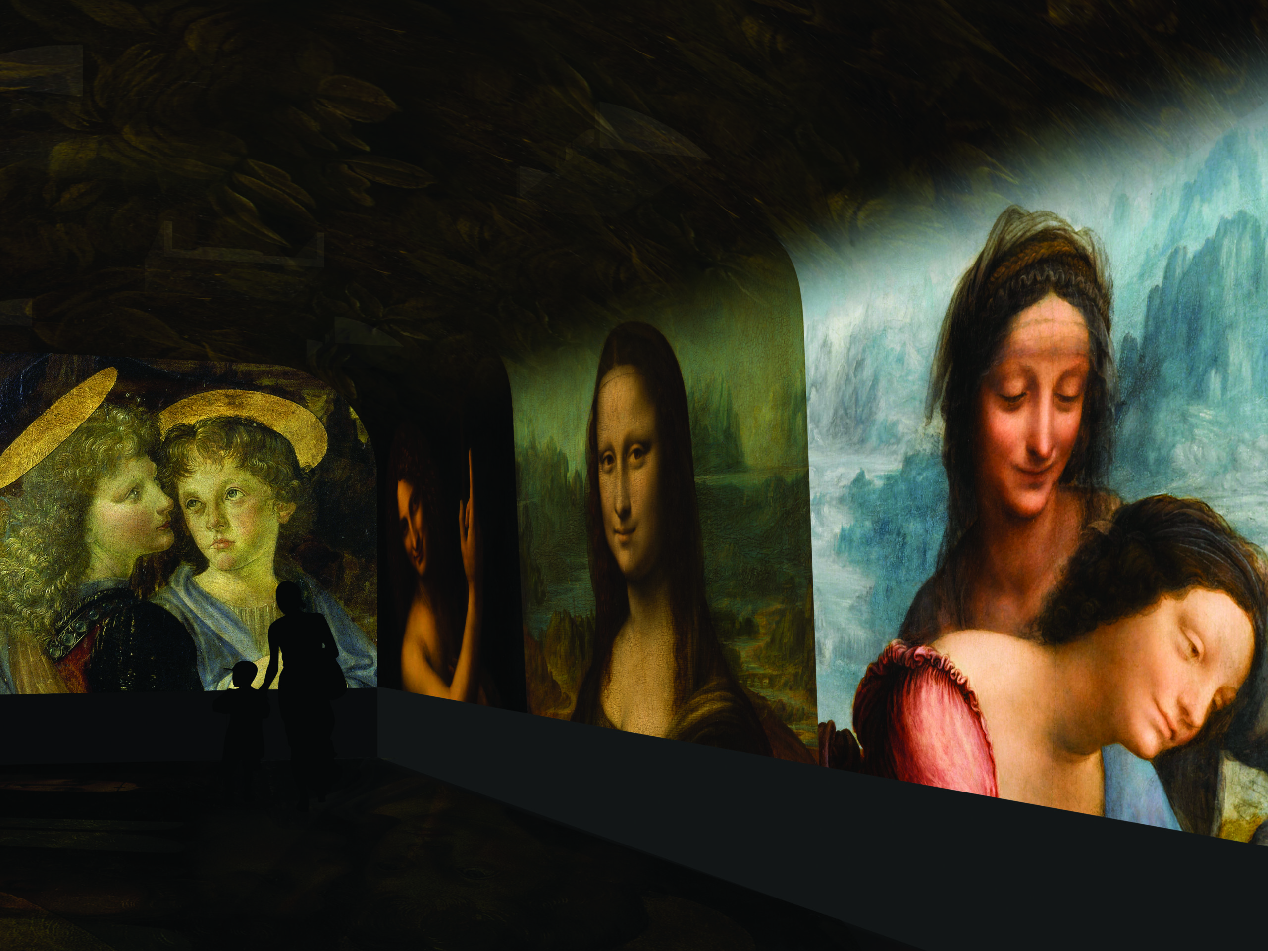 Grâce au dispositif de projection immersive, une démultiplication graphique permet d’entrer dans le processus de création de Léonard, du dessin à la peinture. Plusieurs séquences thématiques s’enchaînent, avec des confrontations inédites et une plongée dans les détails et les dessins préparatoires de l’artiste. Au total, plus de 200 images issues des dessins et tableaux originaux du Maître, provenant de 13 fonds différents.