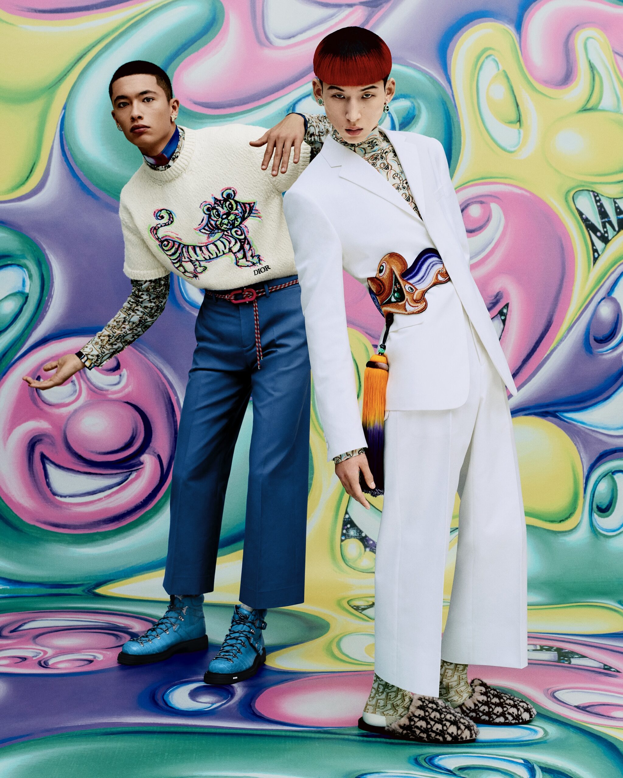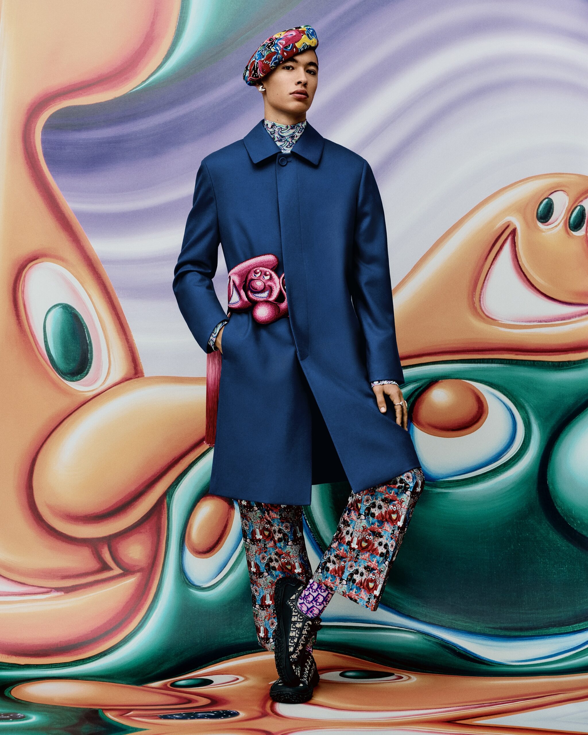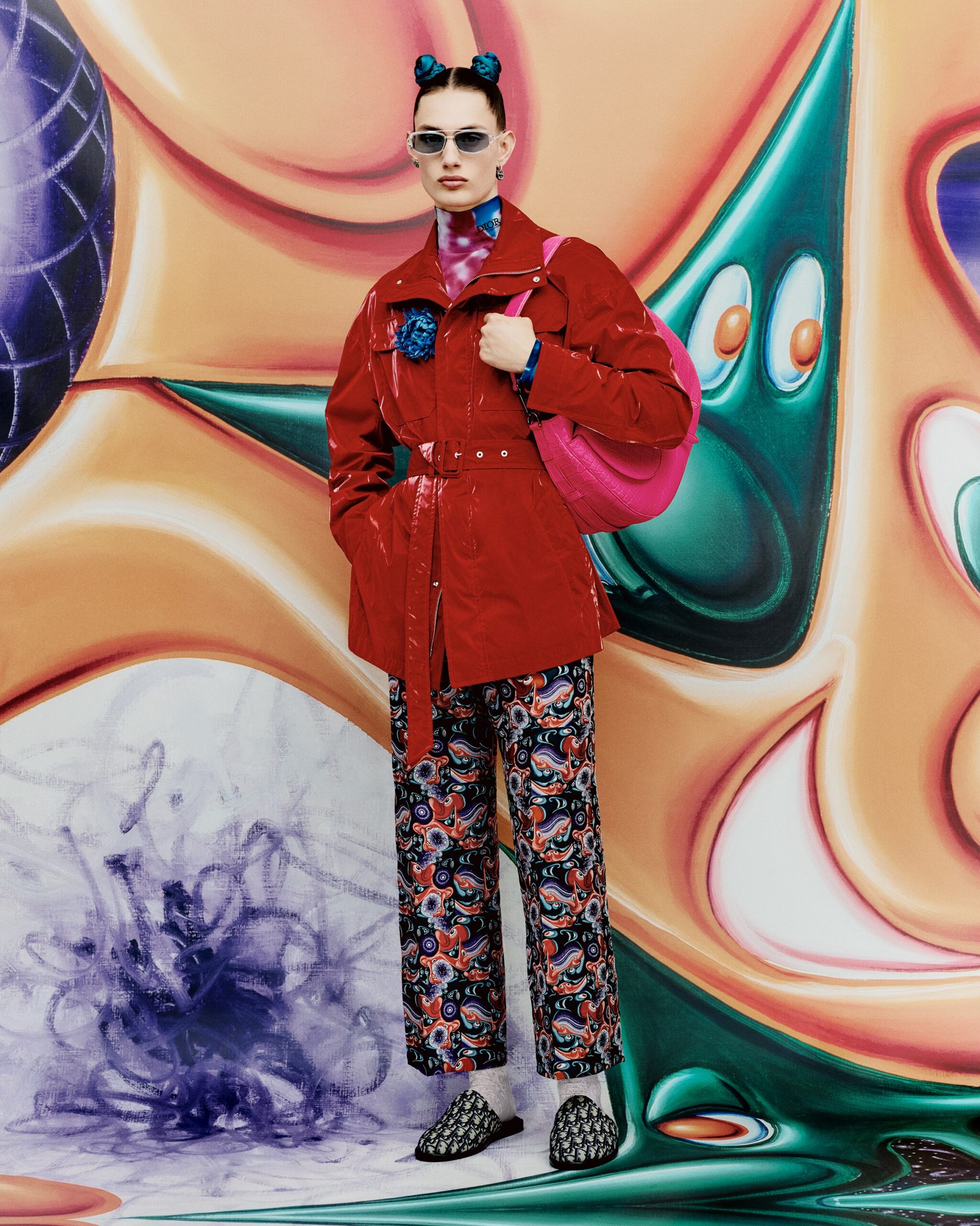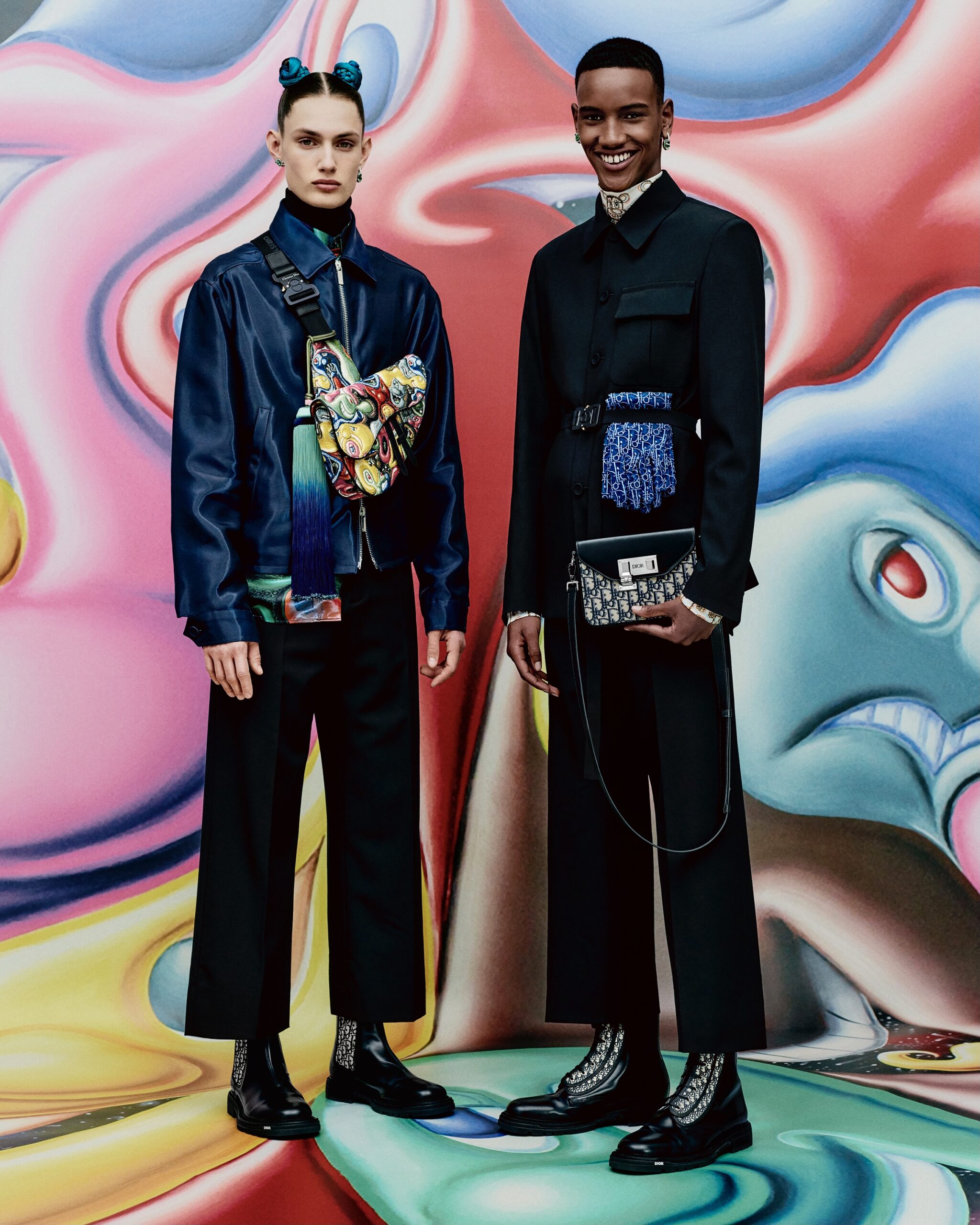 HYPERCOLORÉE, HYPERRÉELLE, LA COLLECTION AUTOMNE 2021 DE KIM JONES SE DÉVOILE DANS UNE SÉRIE DE CLICHÉS INSUFFLÉS PAR LA VITALITÉ ACIDULÉE DE L’UNIVERS DE KENNY SCHARF*. À TRAVERS L’OBJECTIF DE RAFAEL PAVAROTTI SE RÉVÈLENT DES PIÈCES AUX TONALITÉS VIVES, SIGNÉES PAR LE DIRECTEUR ARTISTIQUE DES COLLECTIONS HOMME DE DIOR EN COLLABORATION AVEC LE PEINTRE ET PLASTICIEN AMÉRICAIN. ODE À SON ESTHÉTIQUE POP ET JOYEUSE, LES SILHOUETTES SONT MISES EN SCÈNE DANS UN DÉCOR HABILLÉ DE SES ŒUVRES, COMME EN MOUVEMENT, PONCTUÉES DES PERSONNAGES PEUPLANT SON IMAGINAIRE – À LA CROISÉE DU DESSIN ANIMÉ, DU SURRÉALISME ET DE LA SCIENCE-FICTION. CES MALICIEUSES FIGURES RÉPONDENT À CELLES QUI ORNENT LES CRÉATIONS ET LES ACCESSOIRES, À L’INSTAR DES ICONIQUES SADDLE ET SADDLE SOFT OÙ ELLES SE TRANSPOSENT EN DE PRÉCIEUSES BRODERIES POINT DE GRAINE. À LEURS CÔTÉS, LES SACS DE LA LIGNE DIOR LOCK, OU ENCORE LES BOOTS DIOR EXPLORER II S’AFFIRMENT TELS DE NOUVEAUX STATEMENTS MODE DU VESTIAIRE MASCULIN.