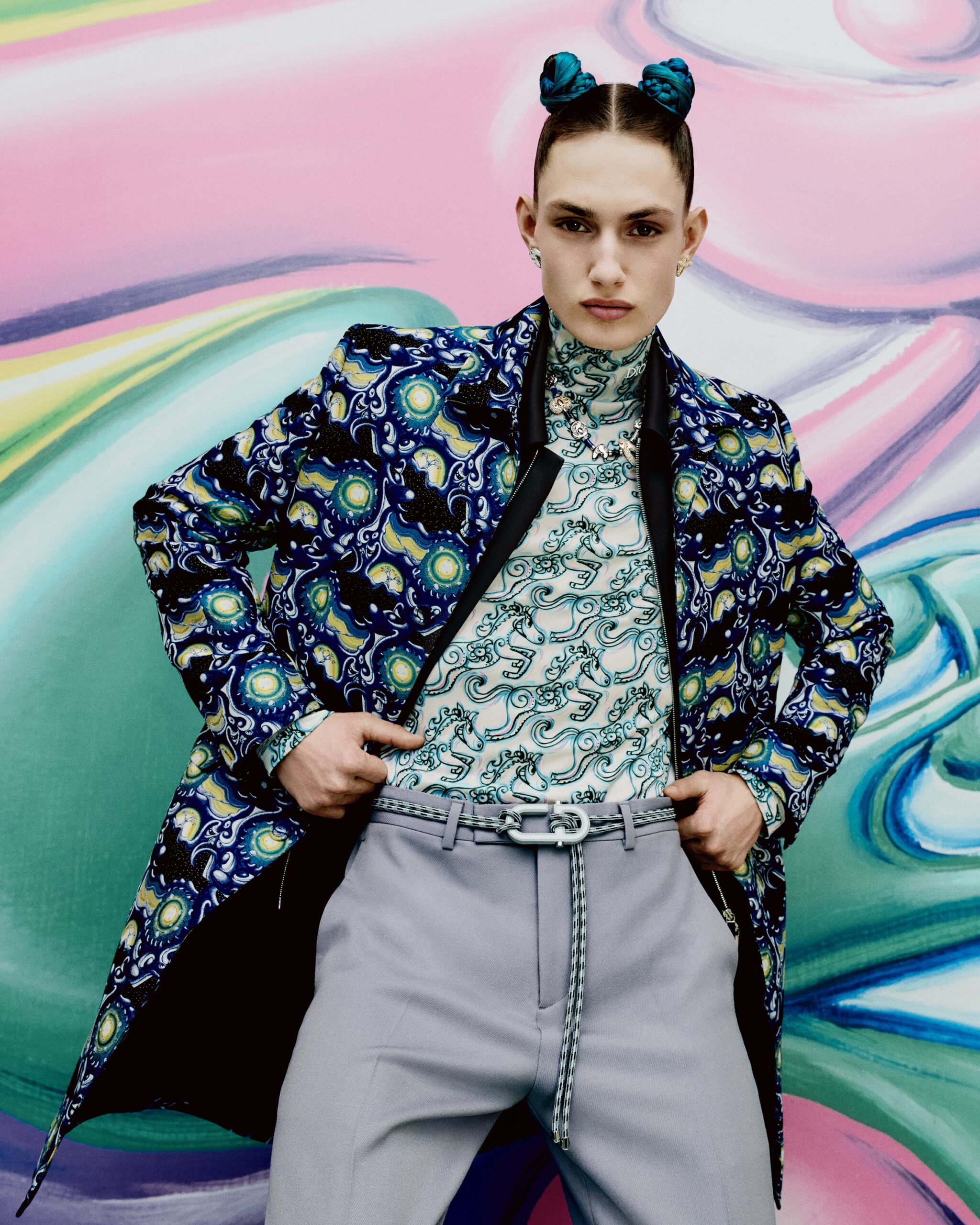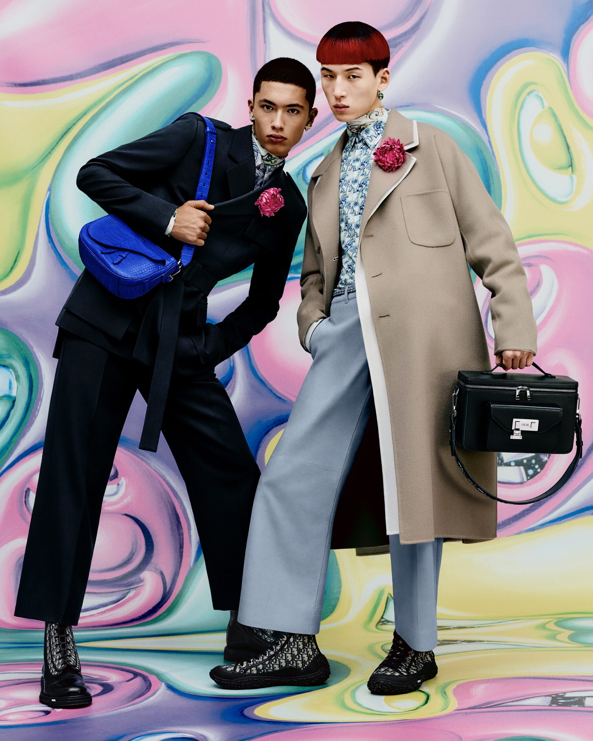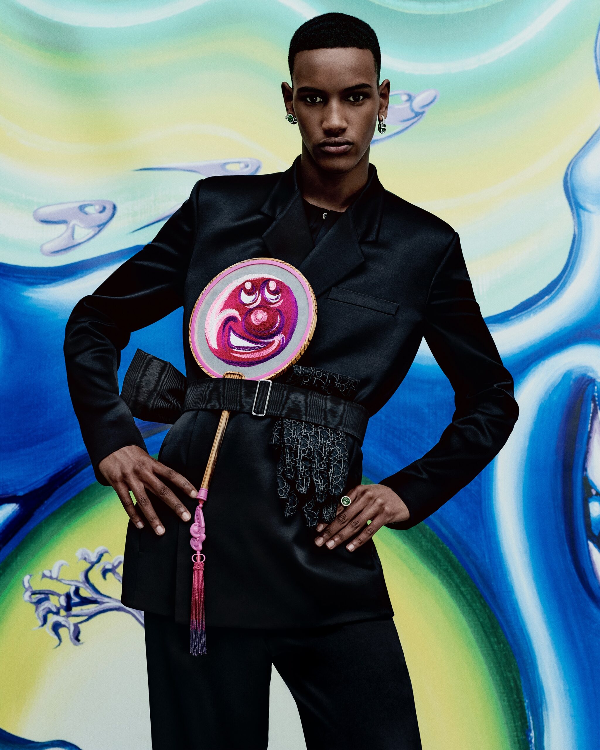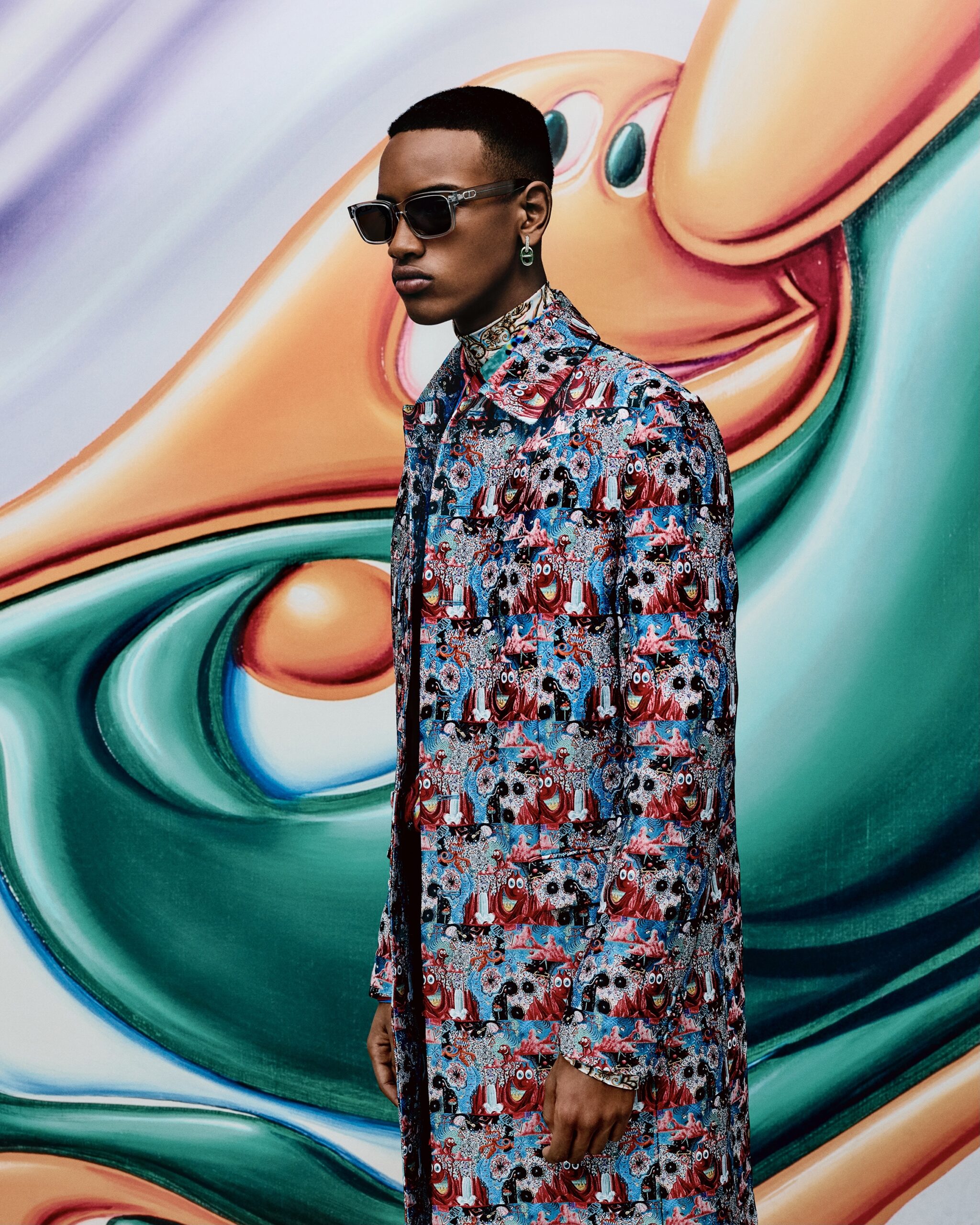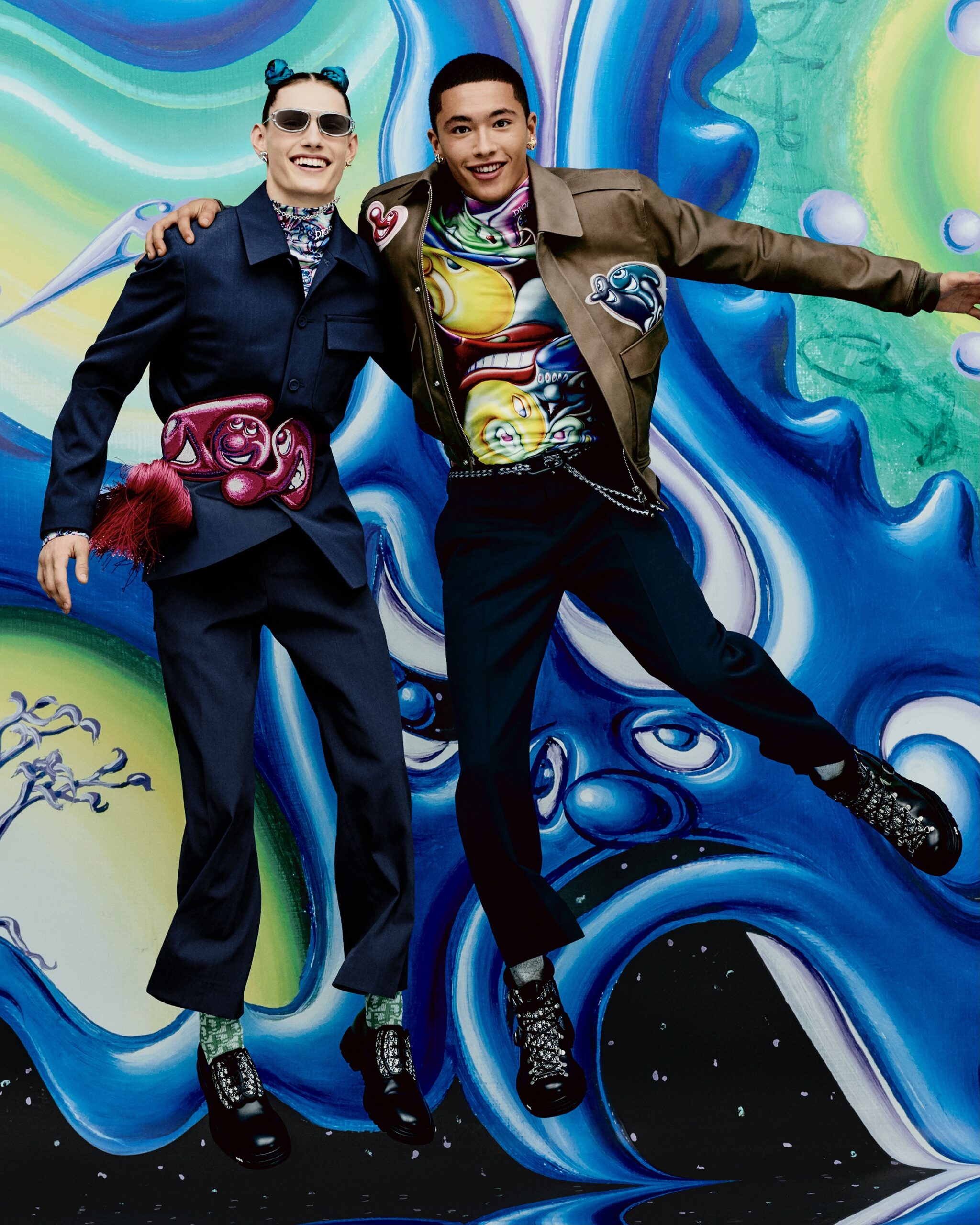 HYPERCOLORÉE, HYPERRÉELLE, LA COLLECTION AUTOMNE 2021 DE KIM JONES SE DÉVOILE DANS UNE SÉRIE DE CLICHÉS INSUFFLÉS PAR LA VITALITÉ ACIDULÉE DE L’UNIVERS DE KENNY SCHARF*. À TRAVERS L’OBJECTIF DE RAFAEL PAVAROTTI SE RÉVÈLENT DES PIÈCES AUX TONALITÉS VIVES, SIGNÉES PAR LE DIRECTEUR ARTISTIQUE DES COLLECTIONS HOMME DE DIOR EN COLLABORATION AVEC LE PEINTRE ET PLASTICIEN AMÉRICAIN. ODE À SON ESTHÉTIQUE POP ET JOYEUSE, LES SILHOUETTES SONT MISES EN SCÈNE DANS UN DÉCOR HABILLÉ DE SES ŒUVRES, COMME EN MOUVEMENT, PONCTUÉES DES PERSONNAGES PEUPLANT SON IMAGINAIRE – À LA CROISÉE DU DESSIN ANIMÉ, DU SURRÉALISME ET DE LA SCIENCE-FICTION. CES MALICIEUSES FIGURES RÉPONDENT À CELLES QUI ORNENT LES CRÉATIONS ET LES ACCESSOIRES, À L’INSTAR DES ICONIQUES SADDLE ET SADDLE SOFT OÙ ELLES SE TRANSPOSENT EN DE PRÉCIEUSES BRODERIES POINT DE GRAINE. À LEURS CÔTÉS, LES SACS DE LA LIGNE DIOR LOCK, OU ENCORE LES BOOTS DIOR EXPLORER II S’AFFIRMENT TELS DE NOUVEAUX STATEMENTS MODE DU VESTIAIRE MASCULIN.