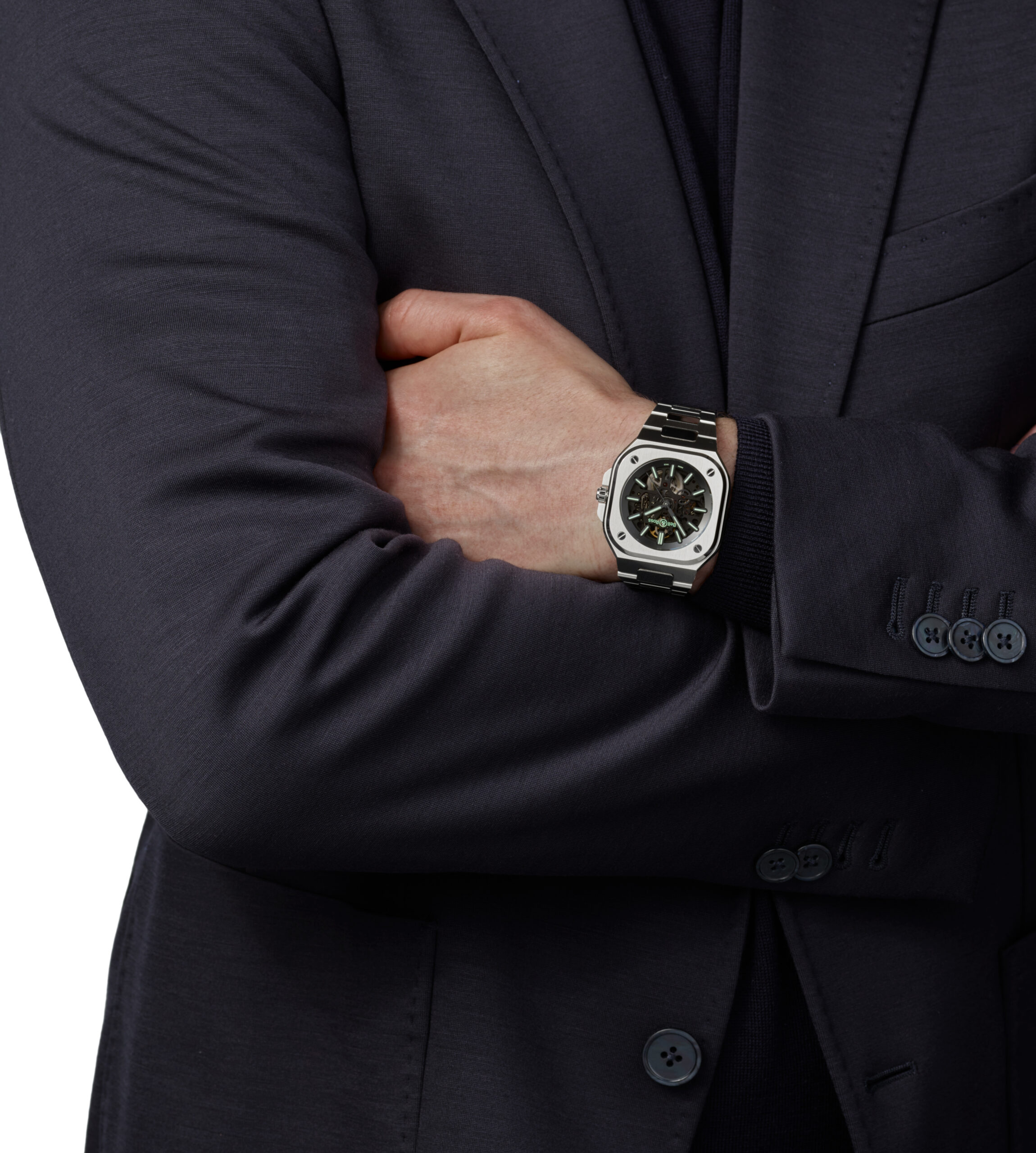 Relevant le défi de la transparence à son paroxysme, le cadran ajouré dévoile le mouvement, recouvert de PVD noir, mettant en avant le travail de squelettisation et la mise en avant de la beauté et de la sophistication de la mécanique.