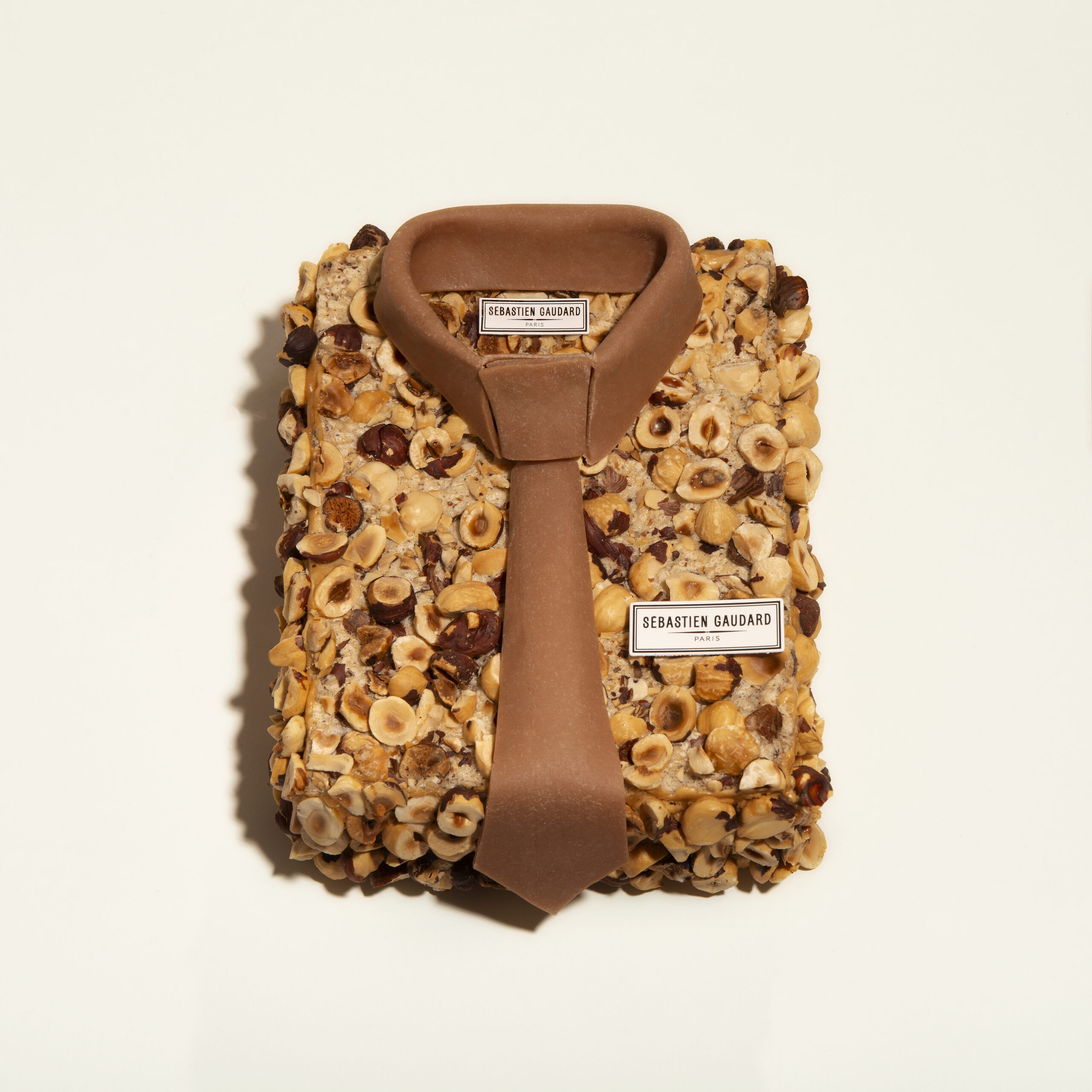 La création 2021 met sa plus belle chemise et noue sa cravate pralinée! Toute la famille se régalera avec cette dacquoise et crème au praliné noisettes ponctuée d’éclats framboises acidulées. Un imprimé fait de noisettes concasséees torréfiées apporte une touche de gourmandise.