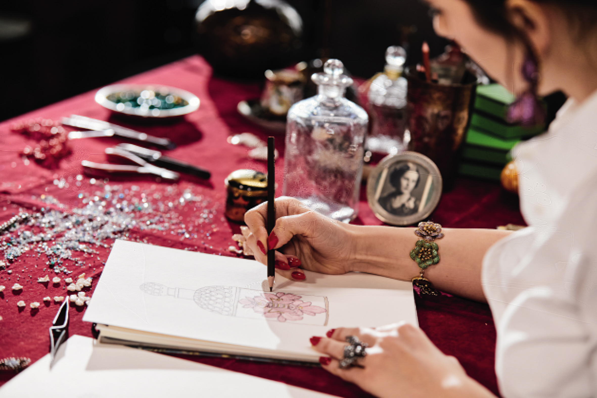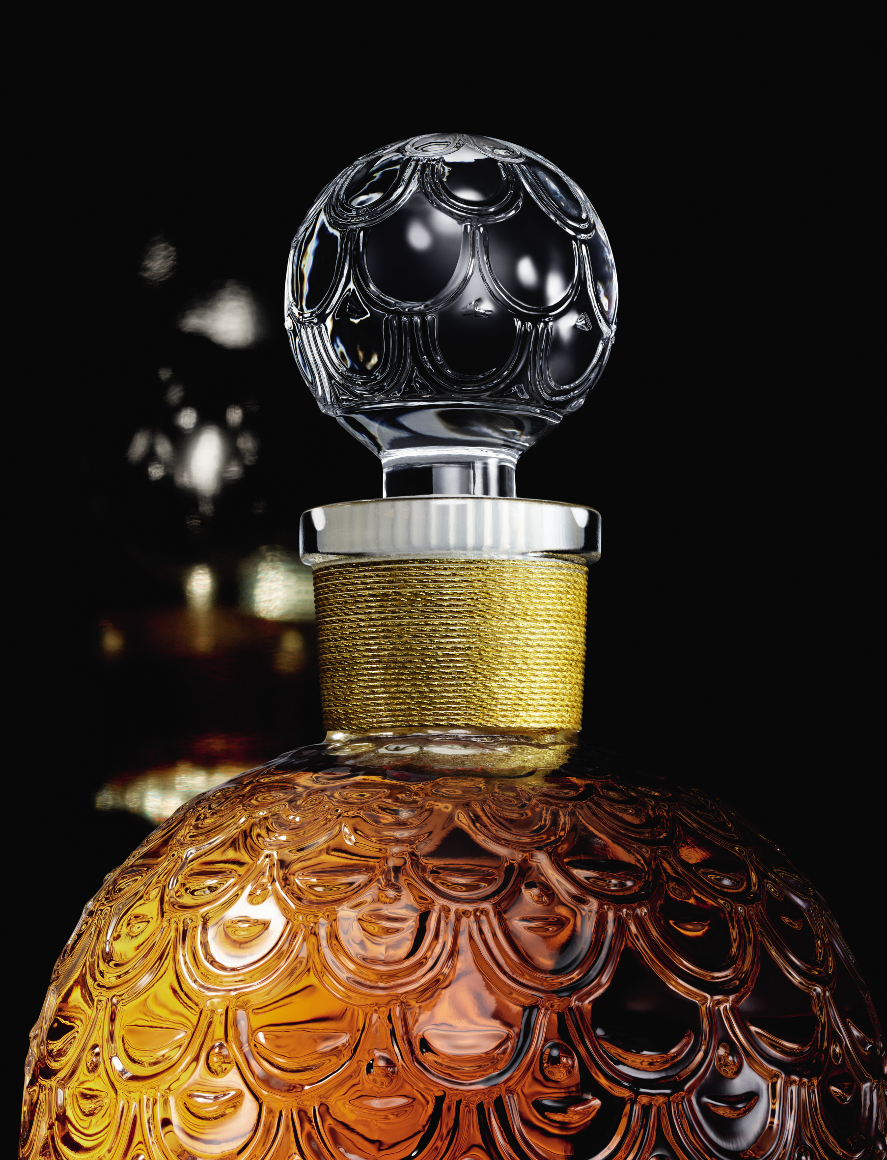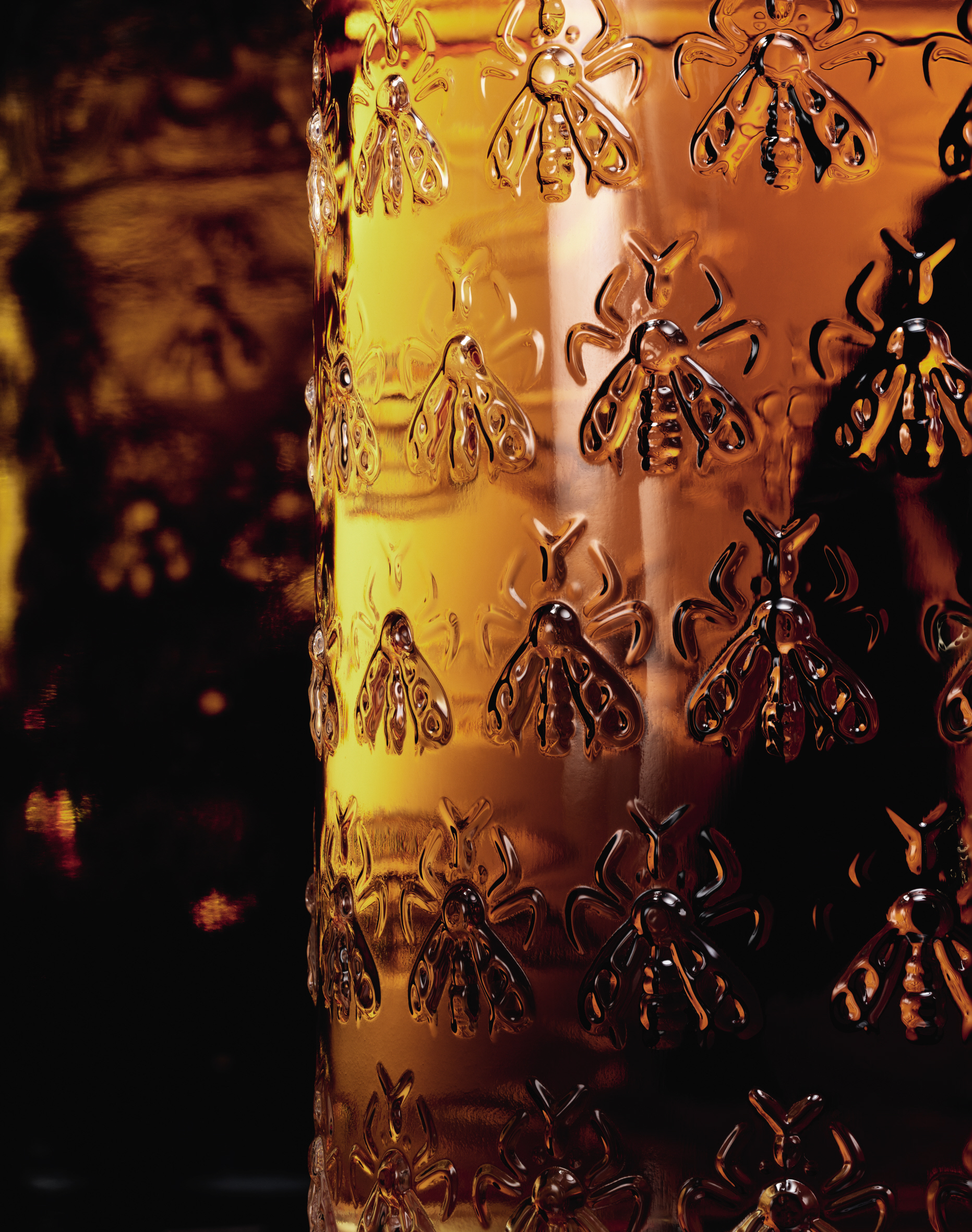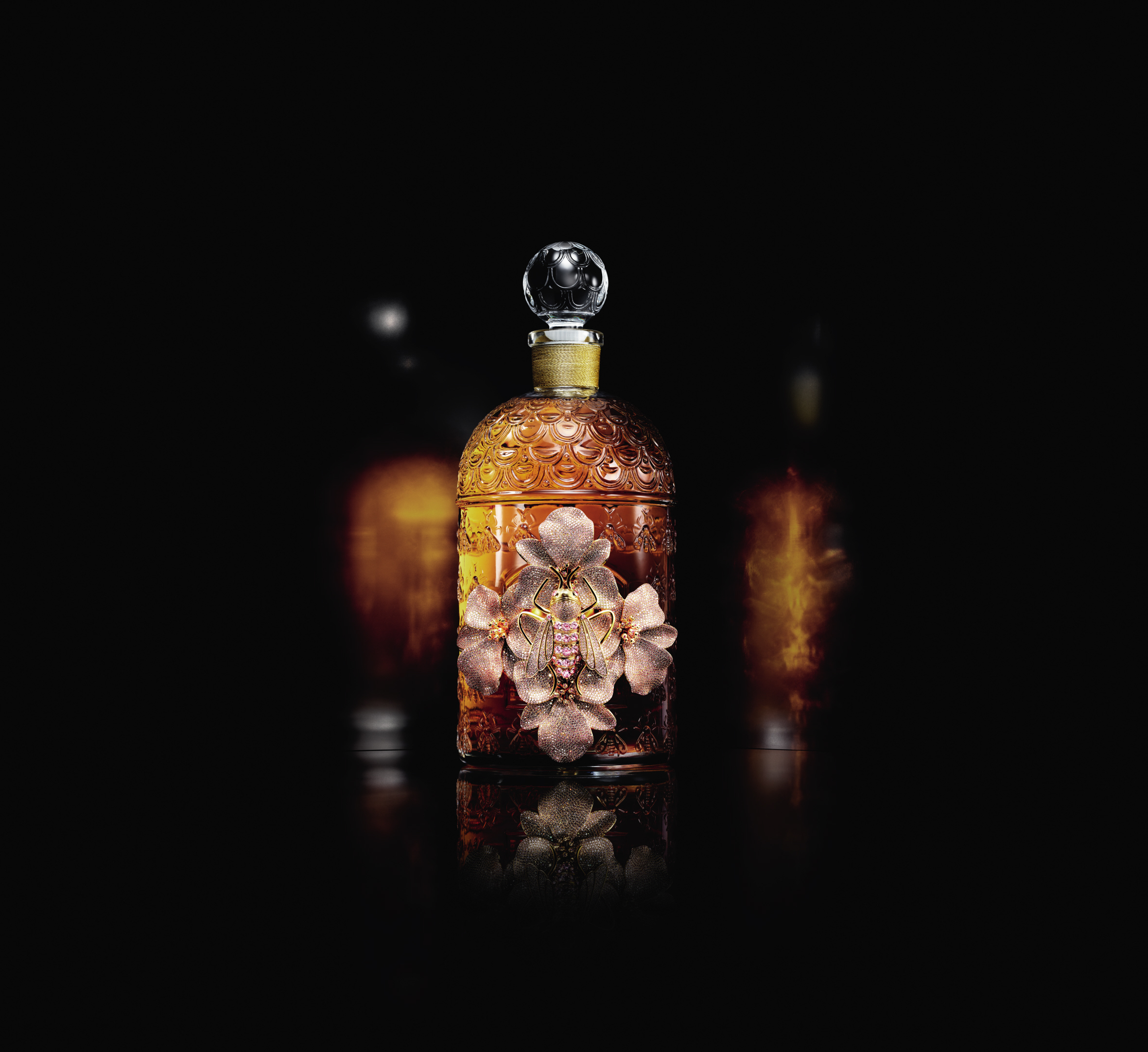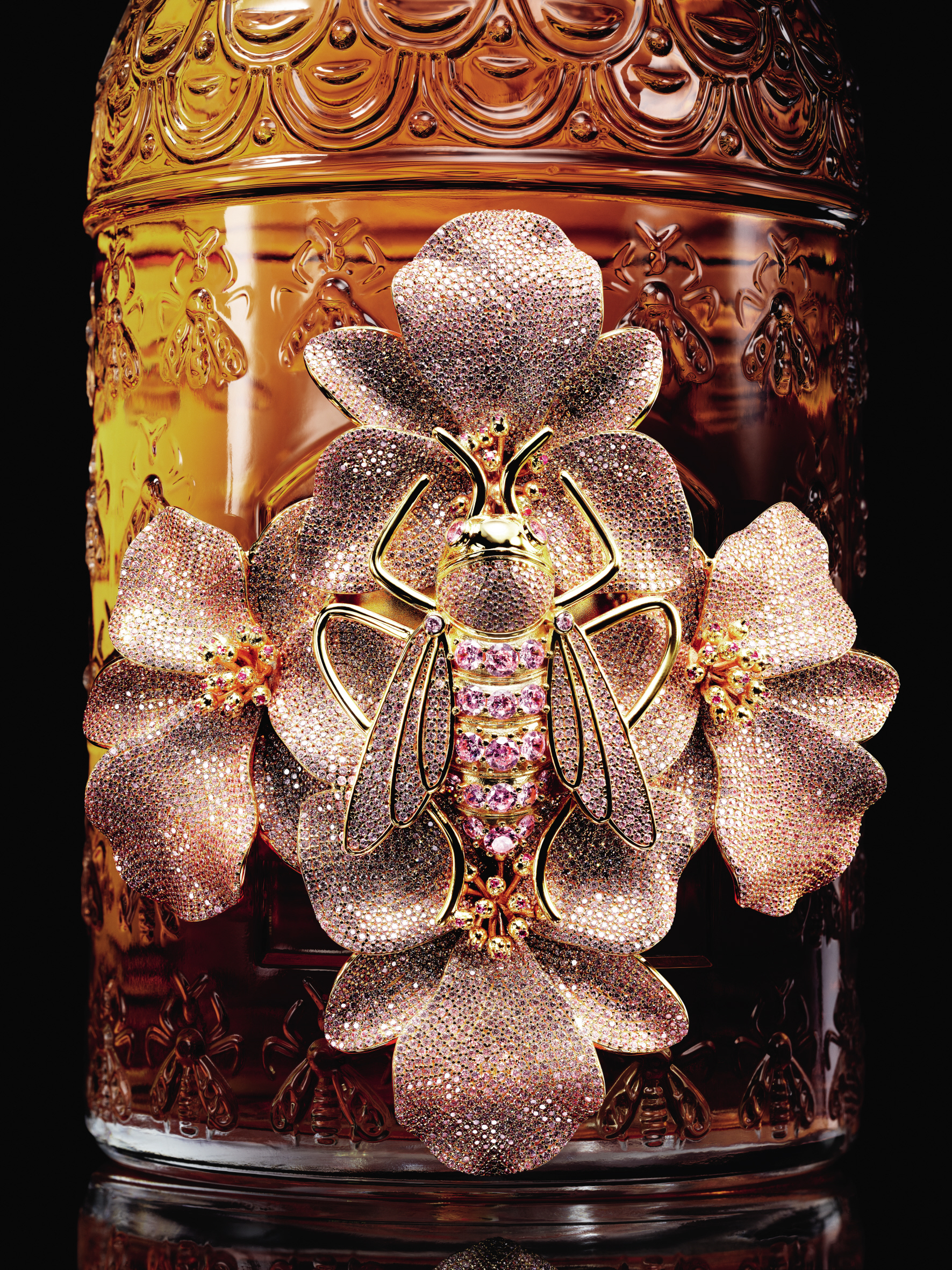 Autour du flacon d’un litre, viendra se poser le bijou imaginé par Begüm Khan. En majesté, un motif d’abeille impériale s’ourle de quatre orchidées épanouies en corolle. Réalisée dans son atelier d’Istanbul, la parure sur bronze, plaqué à l’or 24 carats, est pavée d’environ 6500 pierres de couleurs (zirconia). Une à une, chaque pierre est placée à la main. Posé sur le flacon, le motif précieux vient oblitérer le cartouche. Un travail d’orfèvre, précieux et méticuleux, qui nécessite plus d’une cinquantaine d’heures.