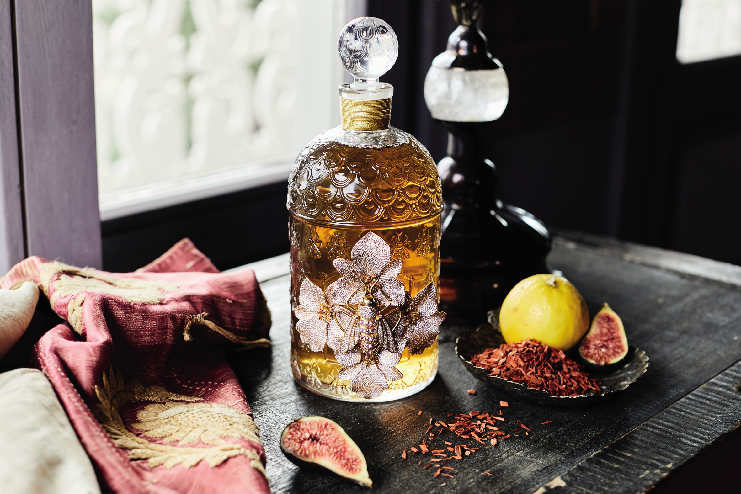 Fruit de l’imagination de l’artiste, l’abeille s’est posée et butine le flacon. Une source d’inspiration pour Begüm Khan : « Les abeilles m’ont toujours intriguée, elles bourdonnent autour de nous sans qu’on y prête attention, leur beauté est souvent négligée. Elles sont fragiles, mais fortes, et il y a quelque chose d’inspirant dans cette dichotomie. Les abeilles sont également synonymes de Guerlain, elles incarnent donc un choix naturel pour notre collaboration ». Au col du flacon vient s’enrouler un fin fil doré posé par les Dames de Table de la Maison Guerlain. Ces gestes patrimoniaux, exécutés par des mains d’exception, se transmettent en héritage depuis des décennies. Avec dextérité se dessine un ballet de mouvements précis et minutieux qui donnent la touche finale magnifiant la pièce. La collaboration a inspiré une belle rêverie à Begüm Khan sur la route des parfums : « Alors que l’odeur du santal d’Orient se mêlait à celle de la bergamote de la Méditerranée, un conte de fées commençait à se former dans mon esprit. Attirée par les légendes de l’ancienne capitale ottomane, une abeille impériale s’envole vers Istanbul pour se délecter de loukoums roses et de sorbets sucrés. Parée de bijoux scintillants, l’esprit chargé de souvenirs romantiques, elle revient à Paris, se posant enfin sur les pétales de quatre orchidées exquises. »