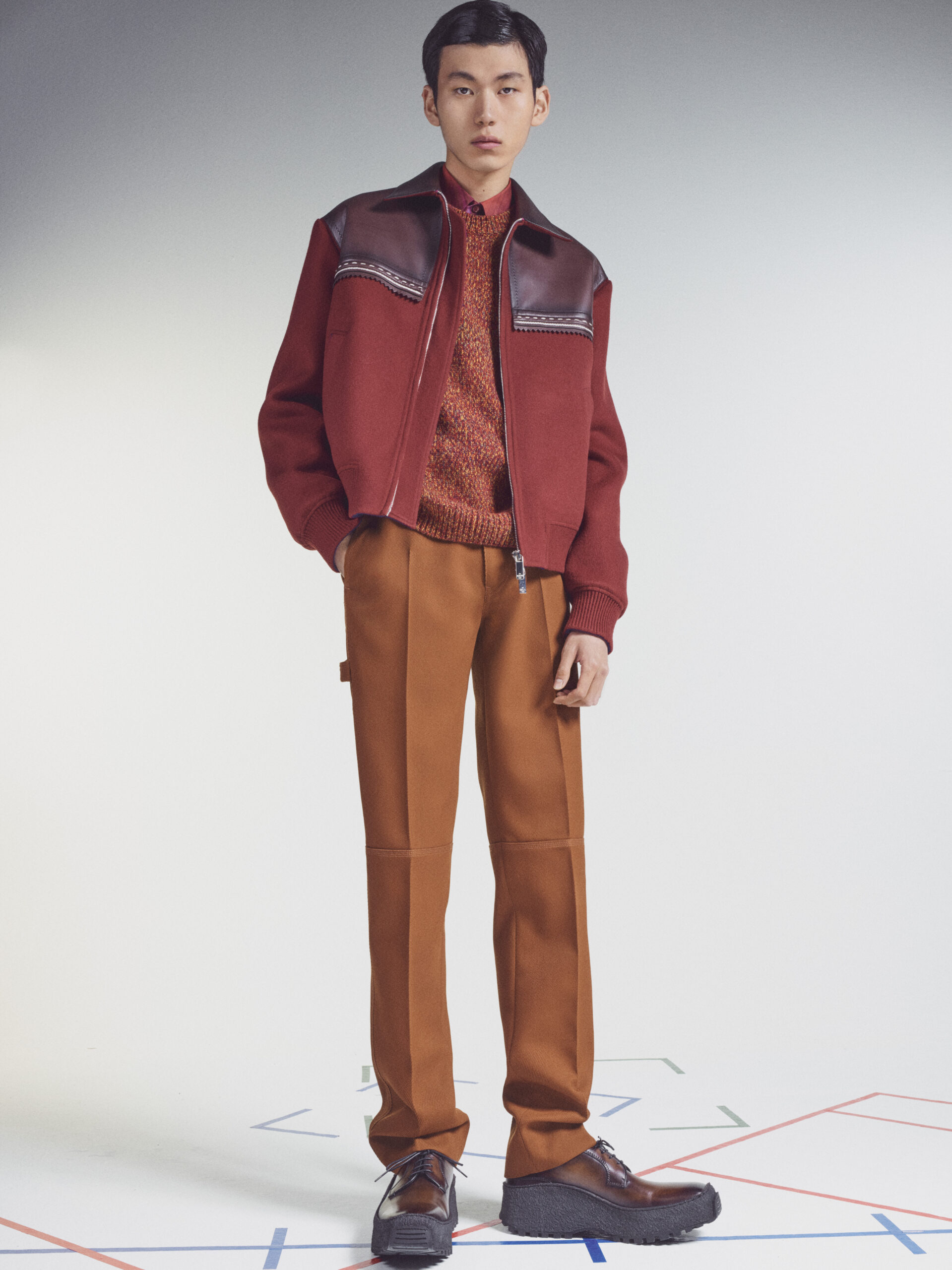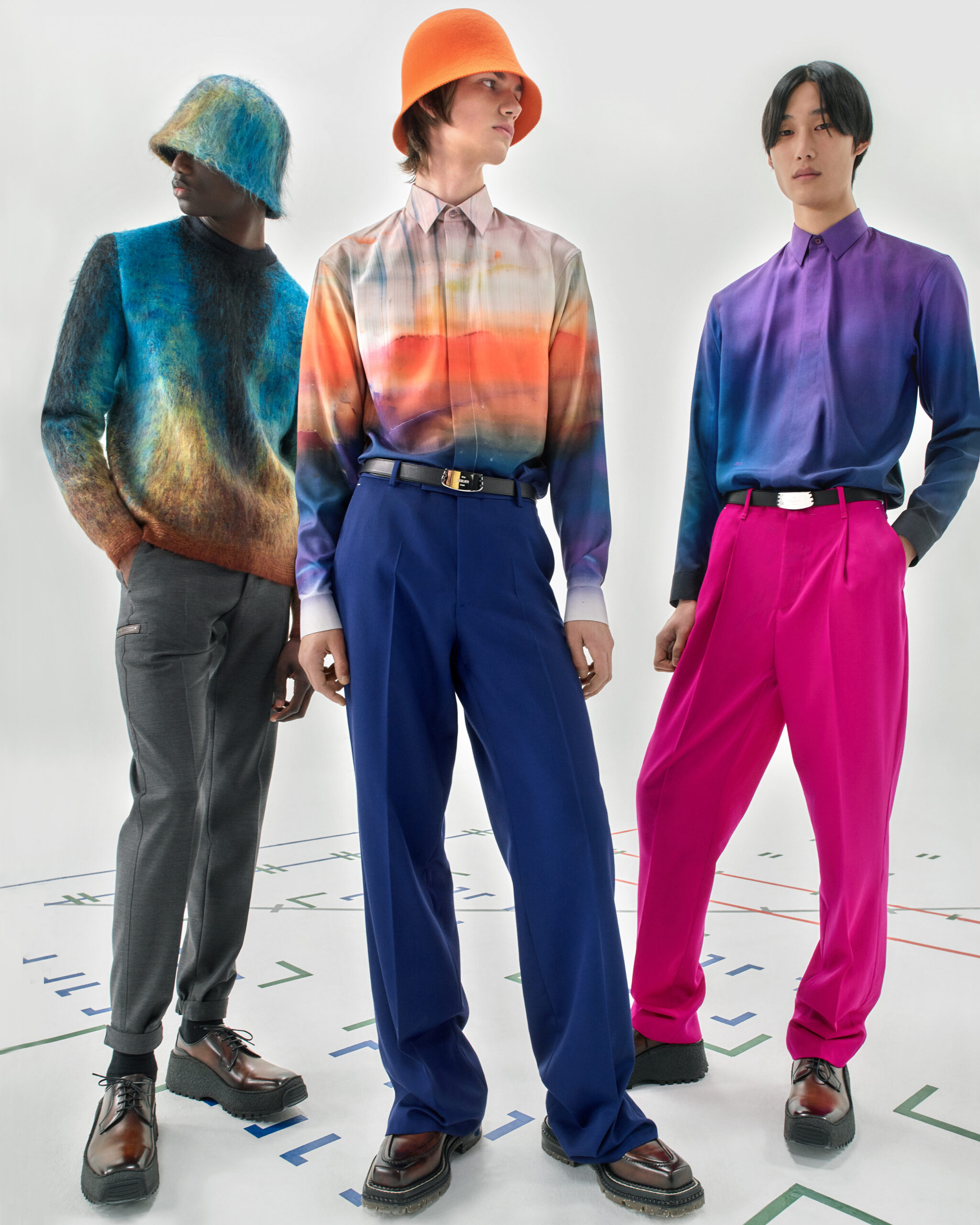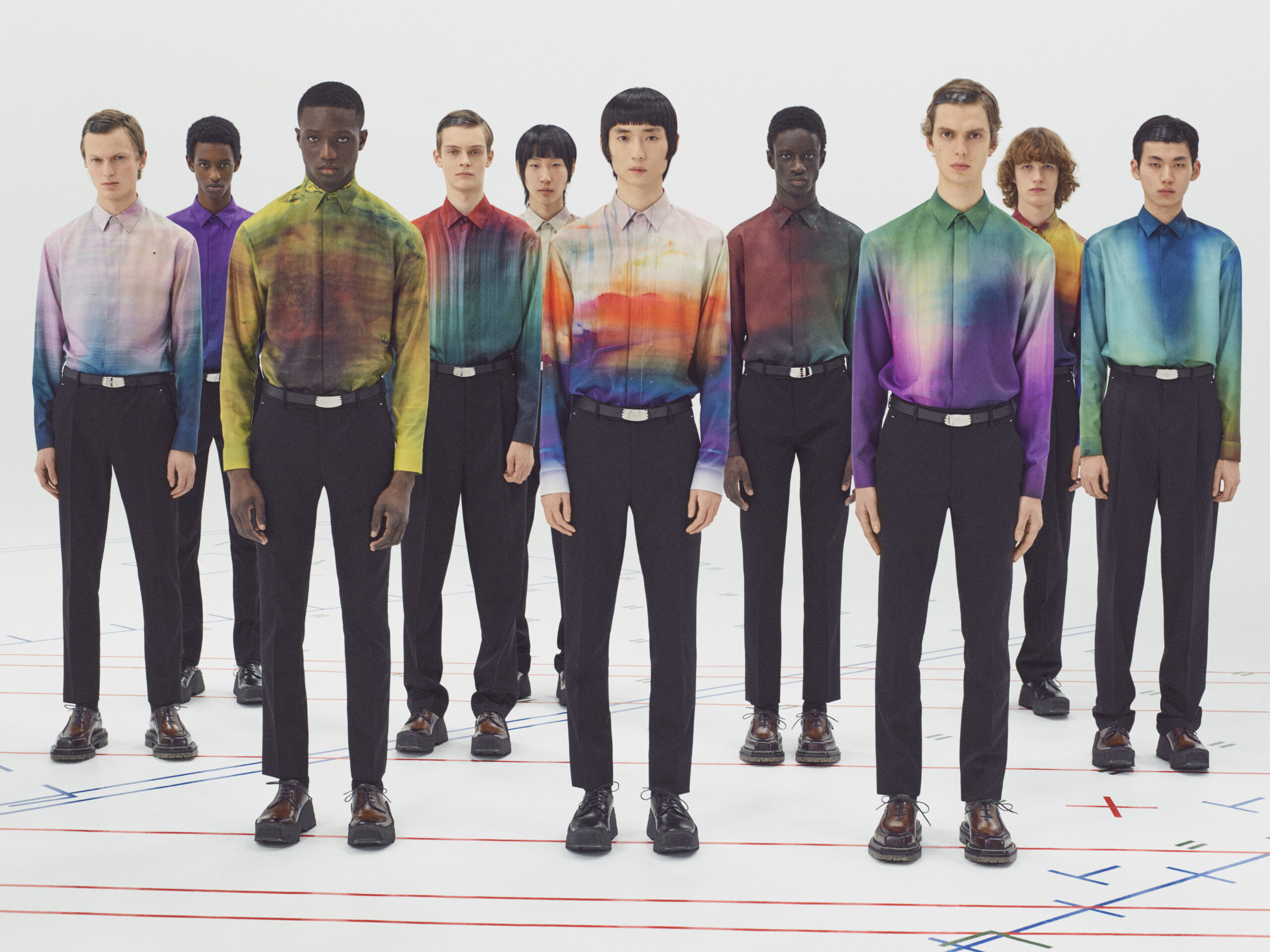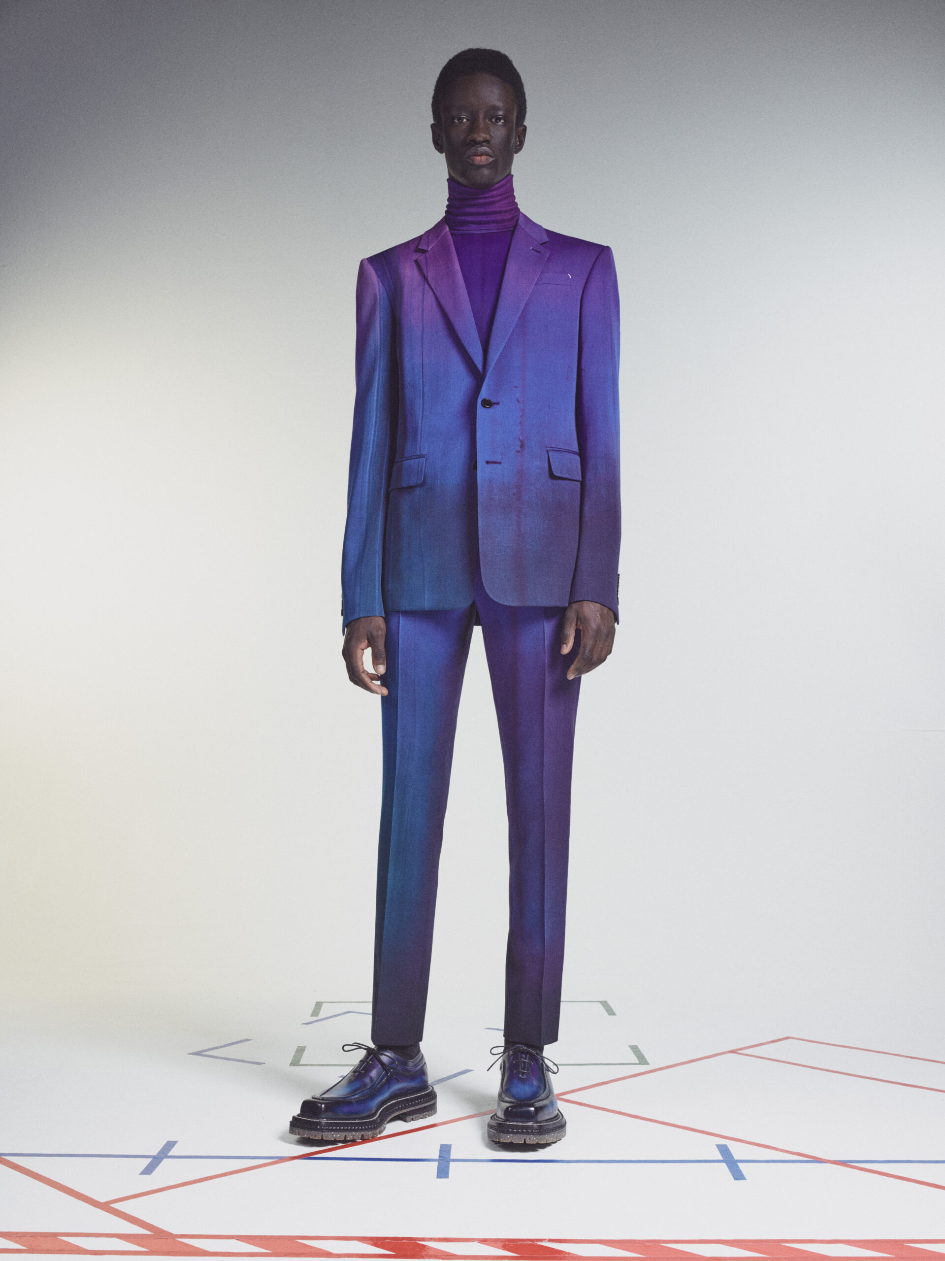 The scenography employs the floor signage of social distancing – graphics now familiar to us all – as an illustration of the limitations of our moment in time. Through choreography, it expresses a sense of freedom found within the boundaries of constraint, mindful rather than physical. The collection adapts the works of the painter Lev Khesin, whose colour and texture forms also inform techniques and fabrications. The Berlin-based Russian contemporary artist expresses himself in abstract, tactile patterns created through multiple layers and colours of silicone paint. His practice echoes that of Berluti’s artisanal patina methods, drawing a natural connection between both the visual and practical domains of Lev Khesin and Kris Van Assche.