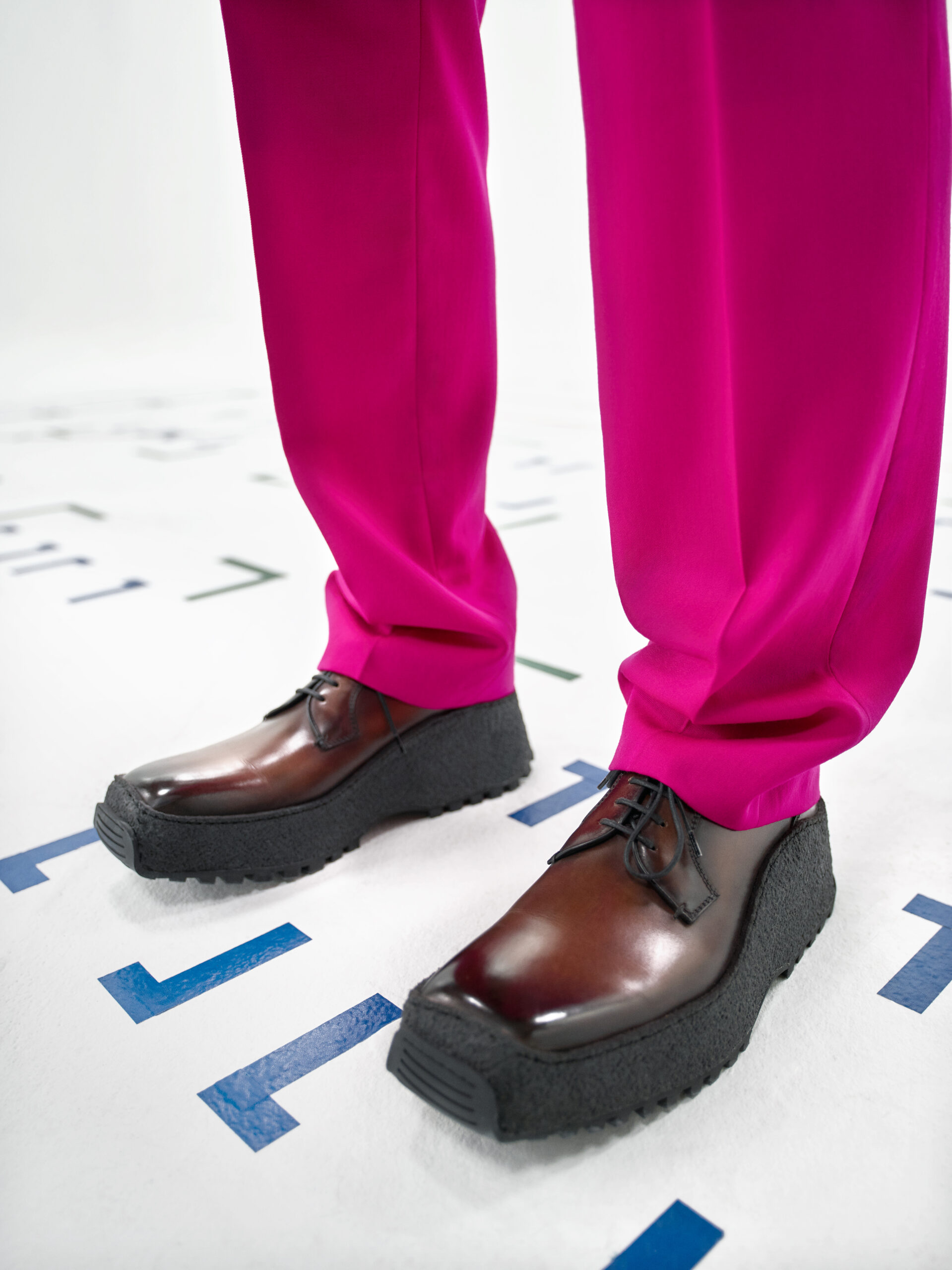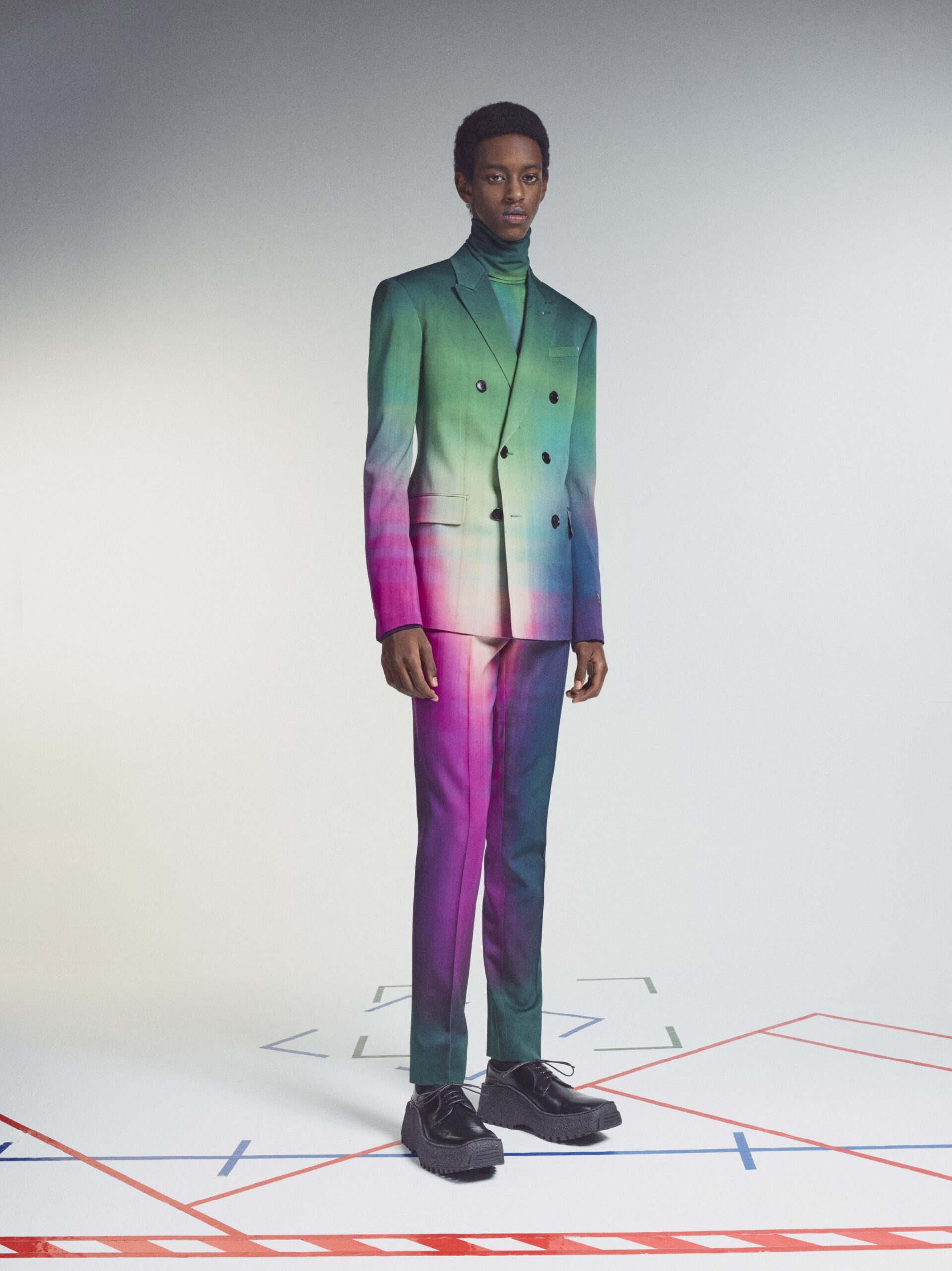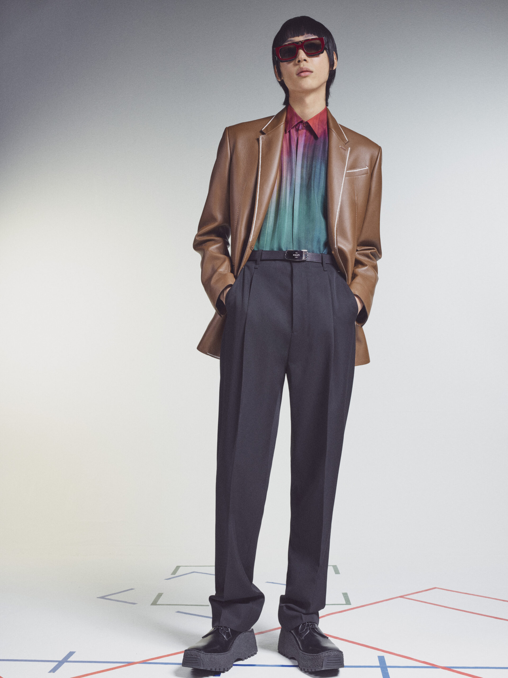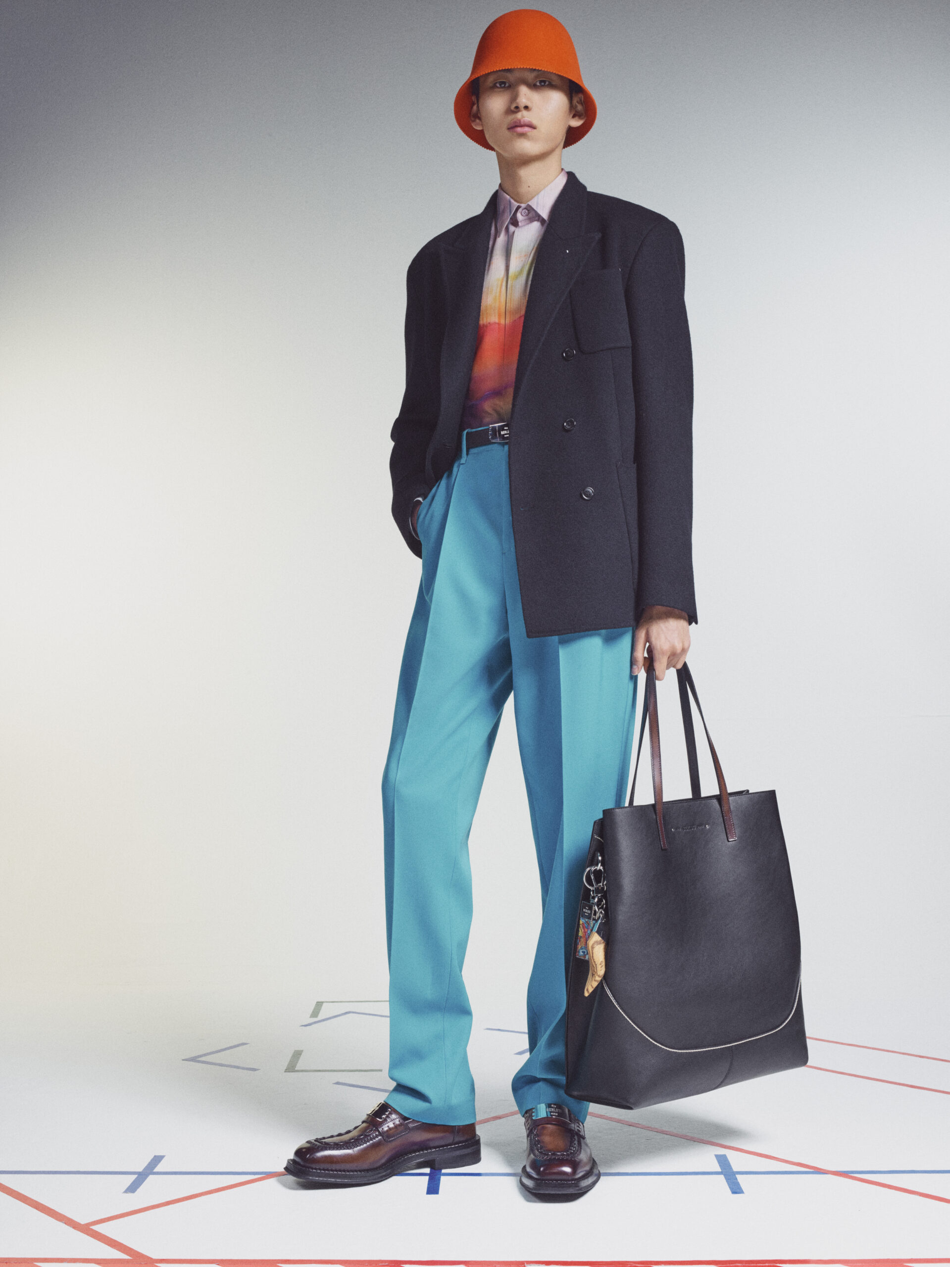 The scenography employs the floor signage of social distancing – graphics now familiar to us all – as an illustration of the limitations of our moment in time. Through choreography, it expresses a sense of freedom found within the boundaries of constraint, mindful rather than physical. The collection adapts the works of the painter Lev Khesin, whose colour and texture forms also inform techniques and fabrications. The Berlin-based Russian contemporary artist expresses himself in abstract, tactile patterns created through multiple layers and colours of silicone paint. His practice echoes that of Berluti’s artisanal patina methods, drawing a natural connection between both the visual and practical domains of Lev Khesin and Kris Van Assche.