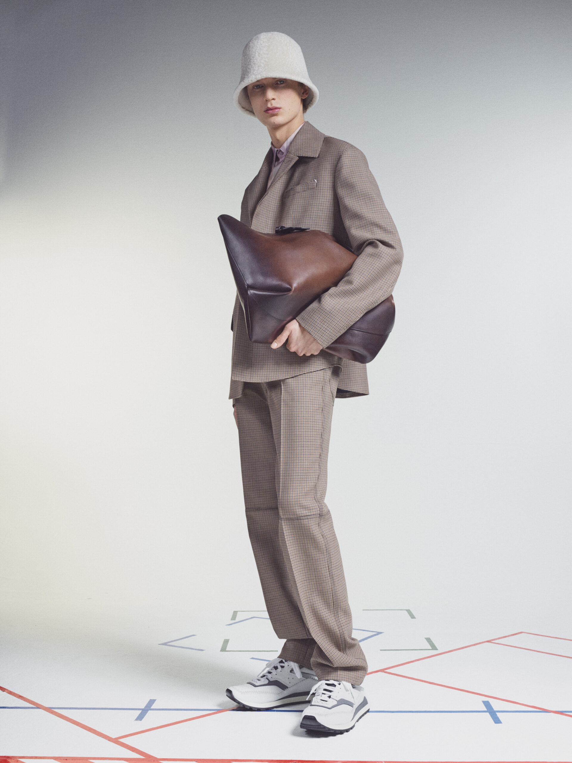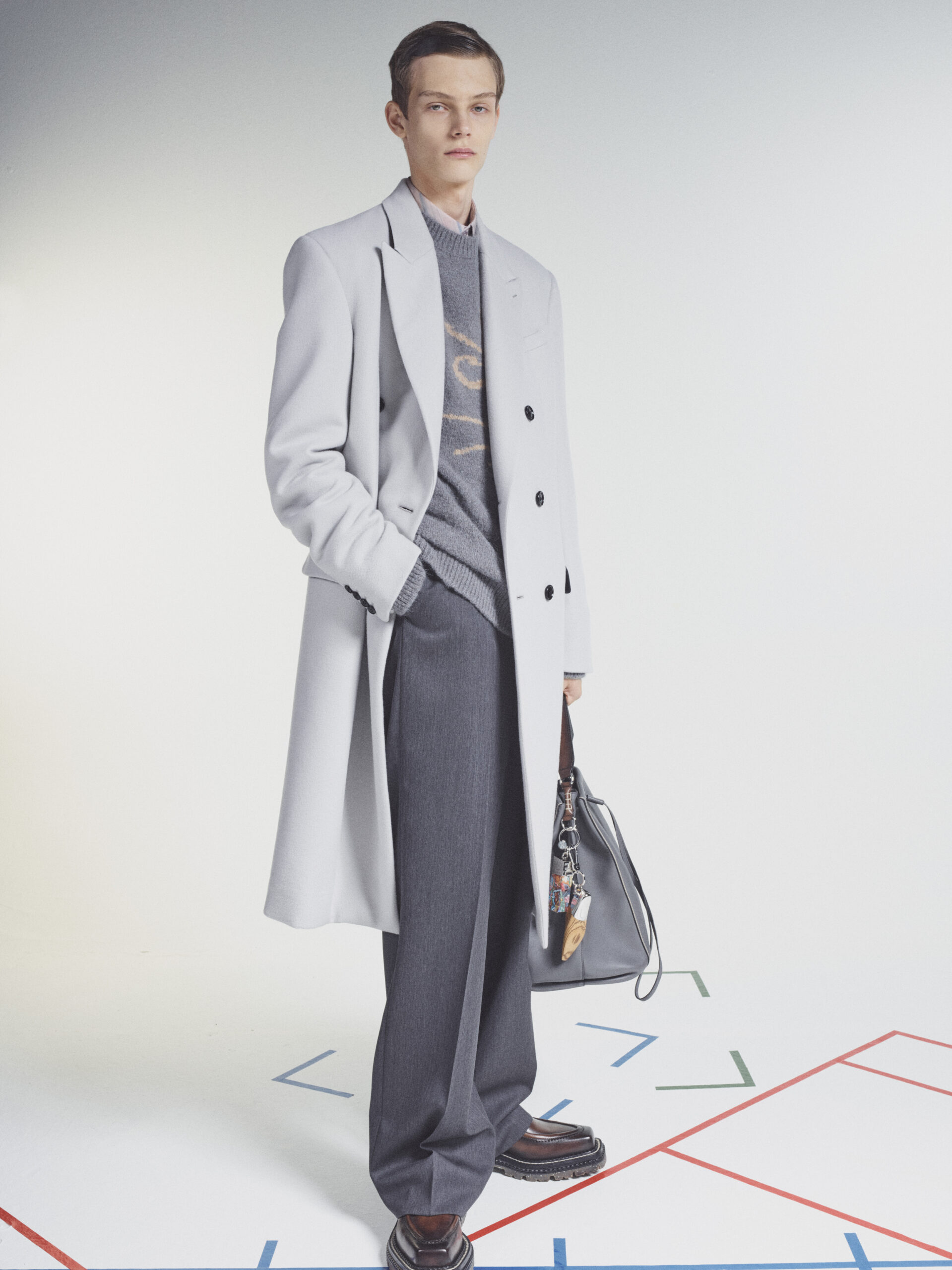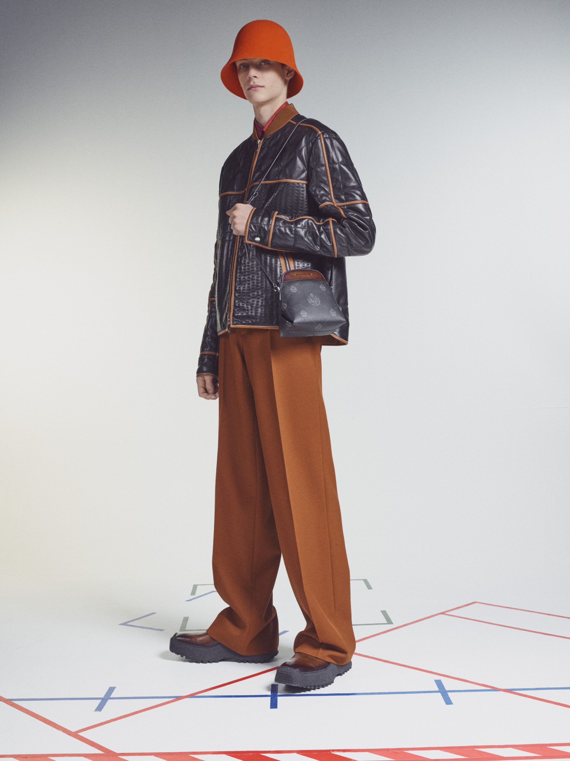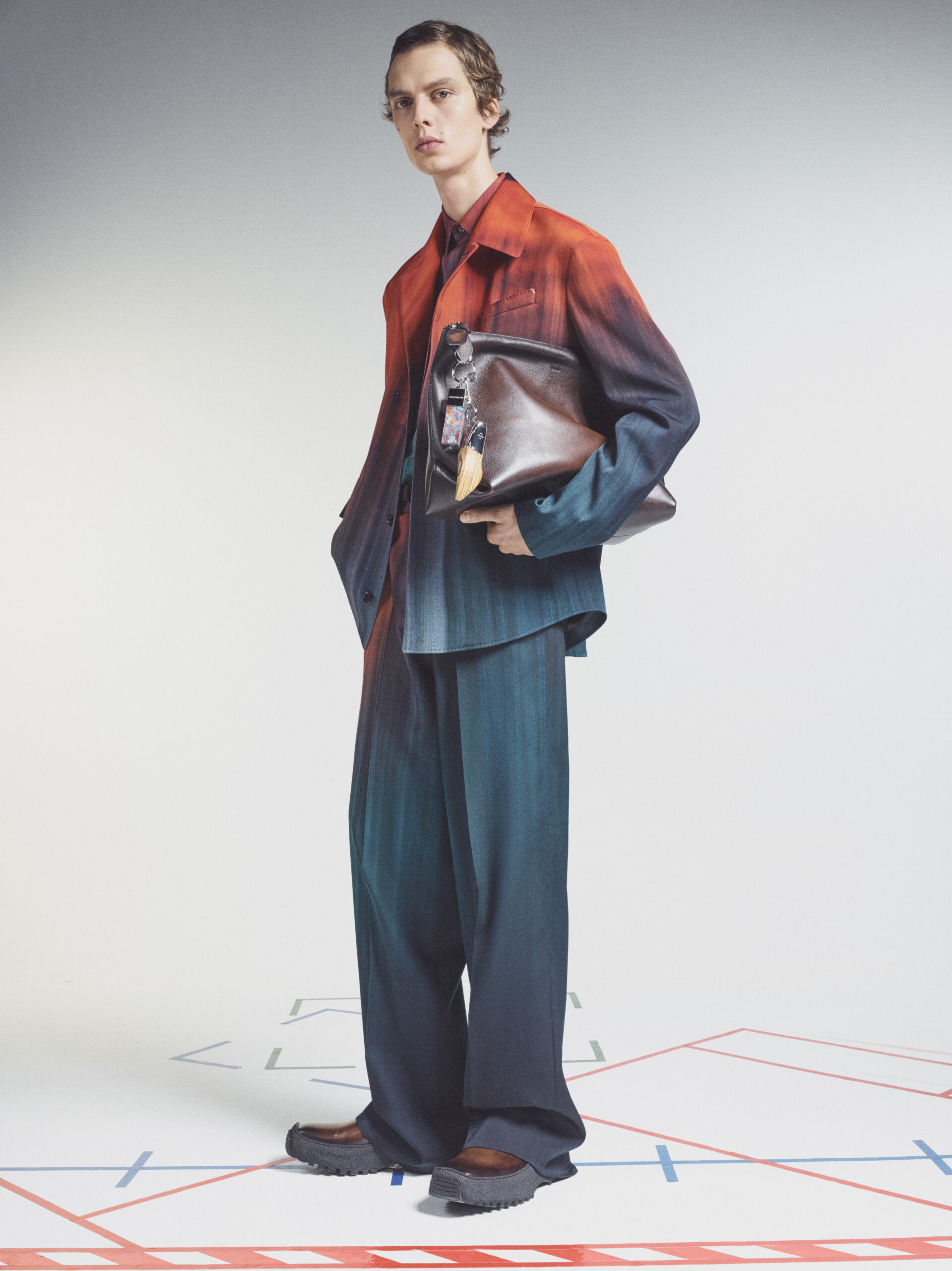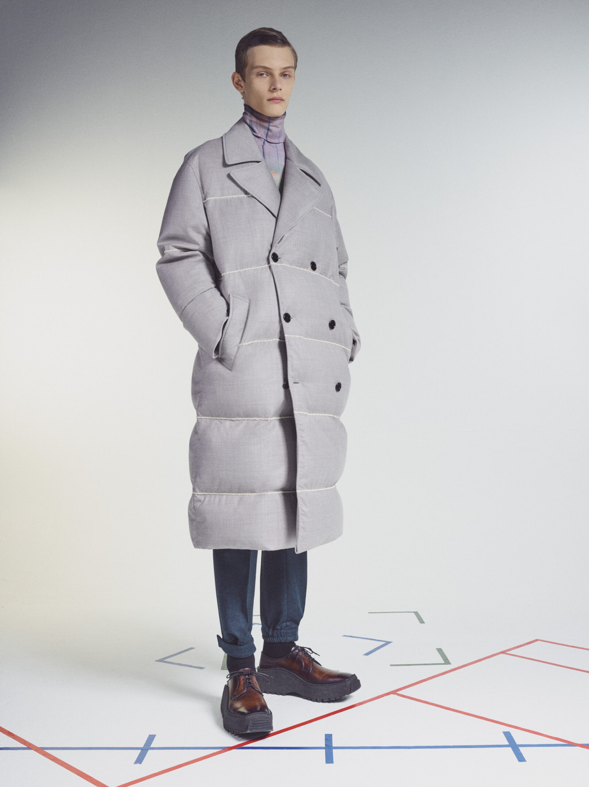 The scenography employs the floor signage of social distancing – graphics now familiar to us all – as an illustration of the limitations of our moment in time. Through choreography, it expresses a sense of freedom found within the boundaries of constraint, mindful rather than physical. The collection adapts the works of the painter Lev Khesin, whose colour and texture forms also inform techniques and fabrications. The Berlin-based Russian contemporary artist expresses himself in abstract, tactile patterns created through multiple layers and colours of silicone paint. His practice echoes that of Berluti’s artisanal patina methods, drawing a natural connection between both the visual and practical domains of Lev Khesin and Kris Van Assche.
