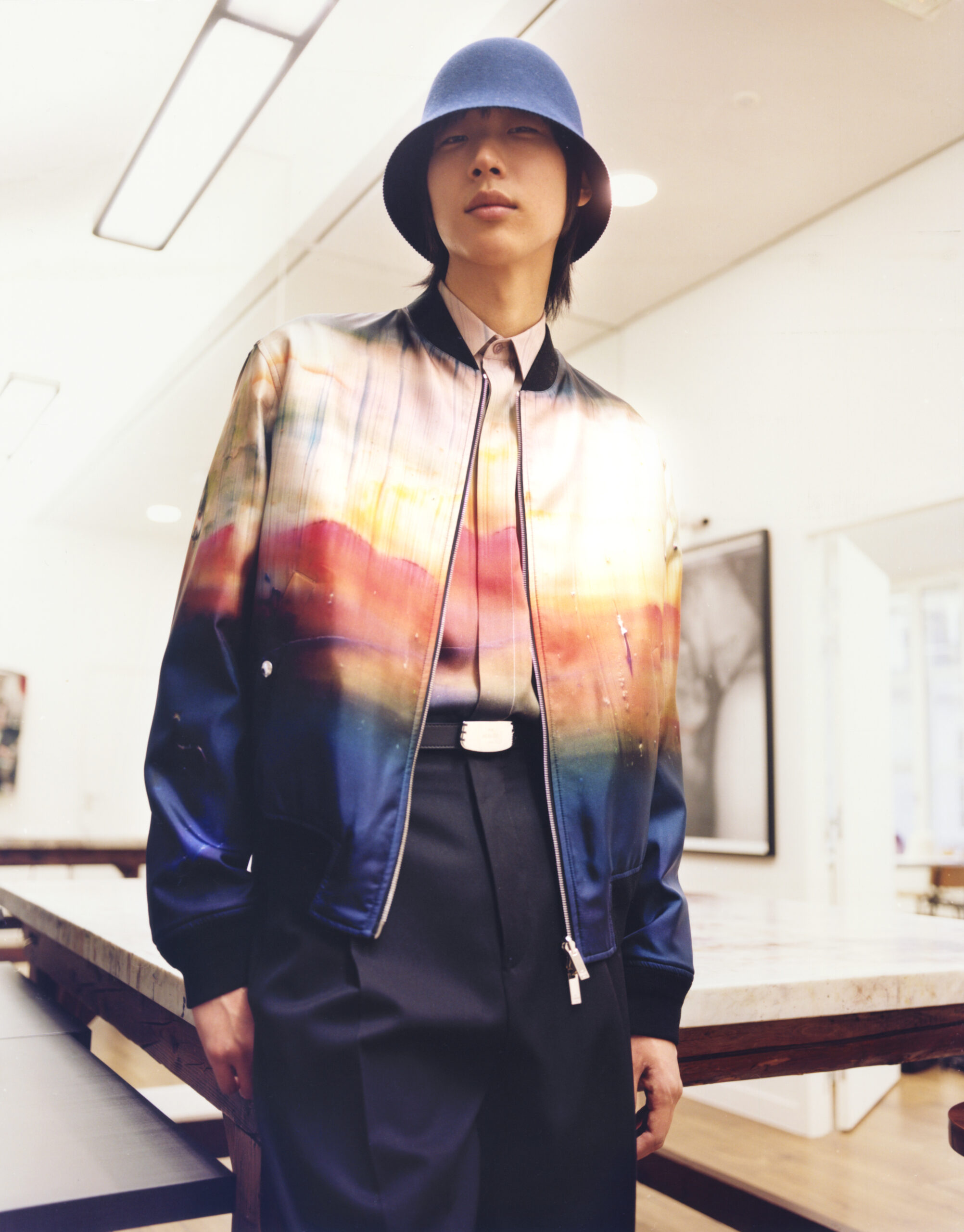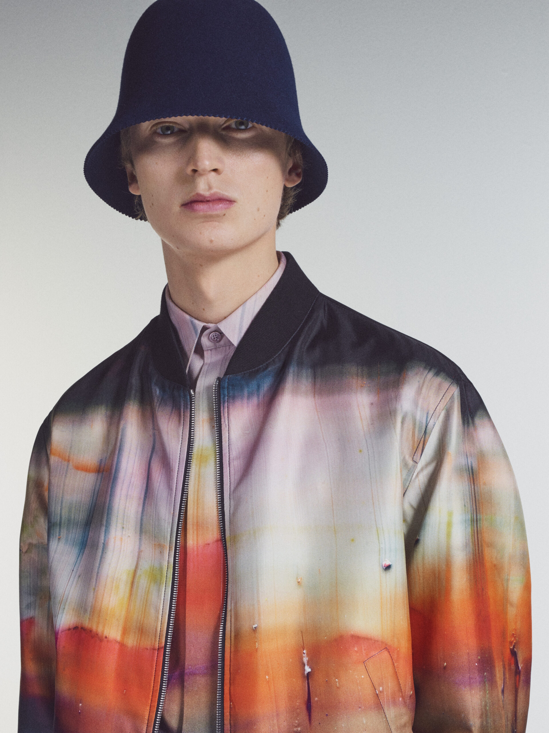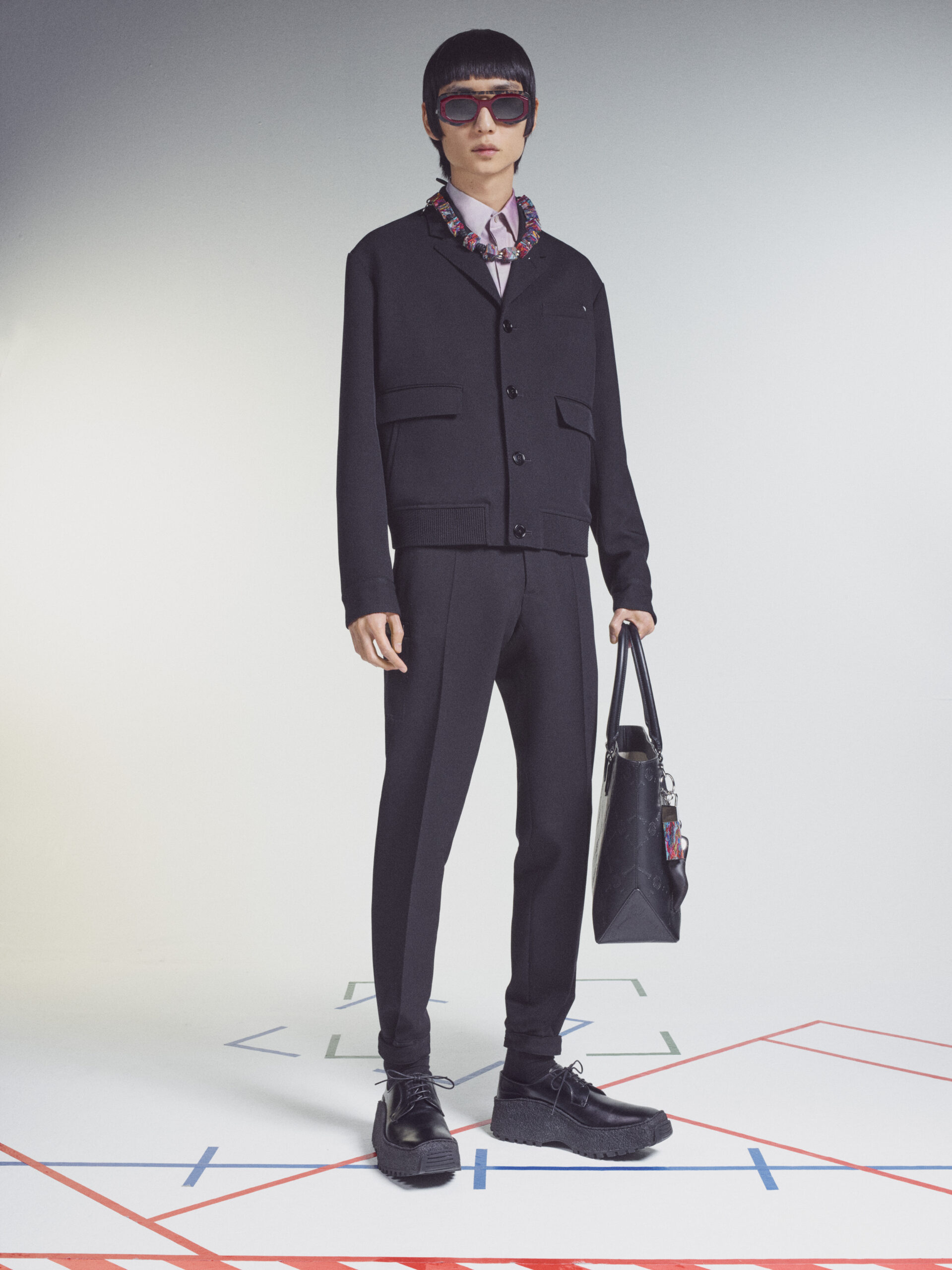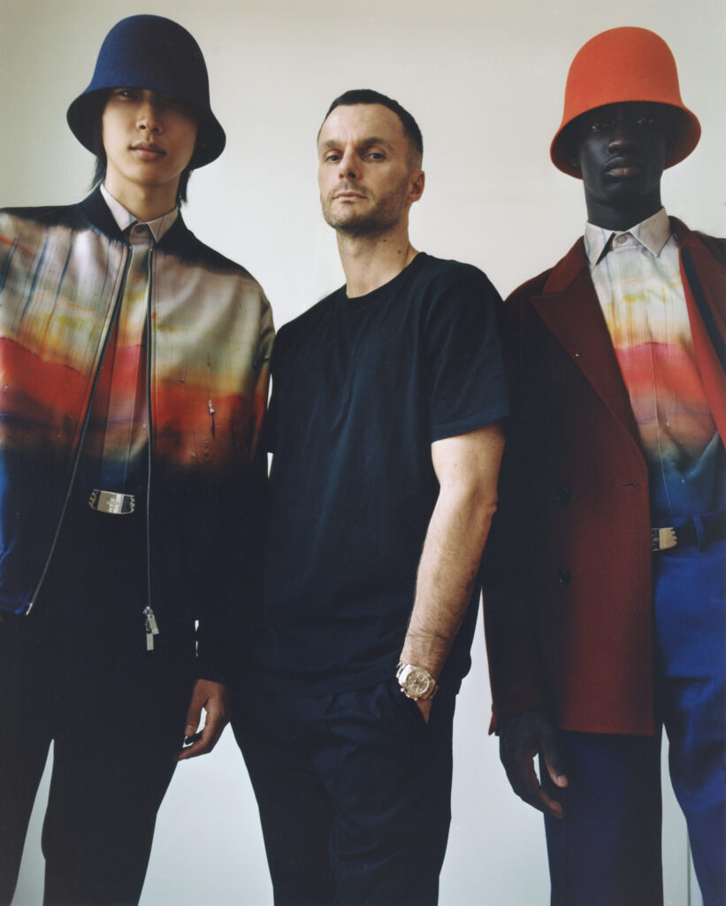 The scenography employs the floor signage of social distancing – graphics now familiar to us all – as an illustration of the limitations of our moment in time. Through choreography, it expresses a sense of freedom found within the boundaries of constraint, mindful rather than physical. The collection adapts the works of the painter Lev Khesin, whose colour and texture forms also inform techniques and fabrications. The Berlin-based Russian contemporary artist expresses himself in abstract, tactile patterns created through multiple layers and colours of silicone paint. His practice echoes that of Berluti’s artisanal patina methods, drawing a natural connection between both the visual and practical domains of Lev Khesin and Kris Van Assche.