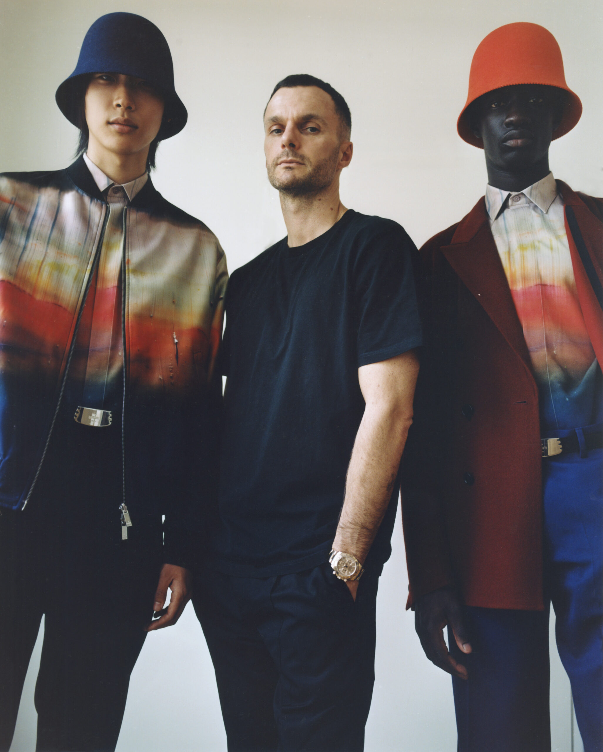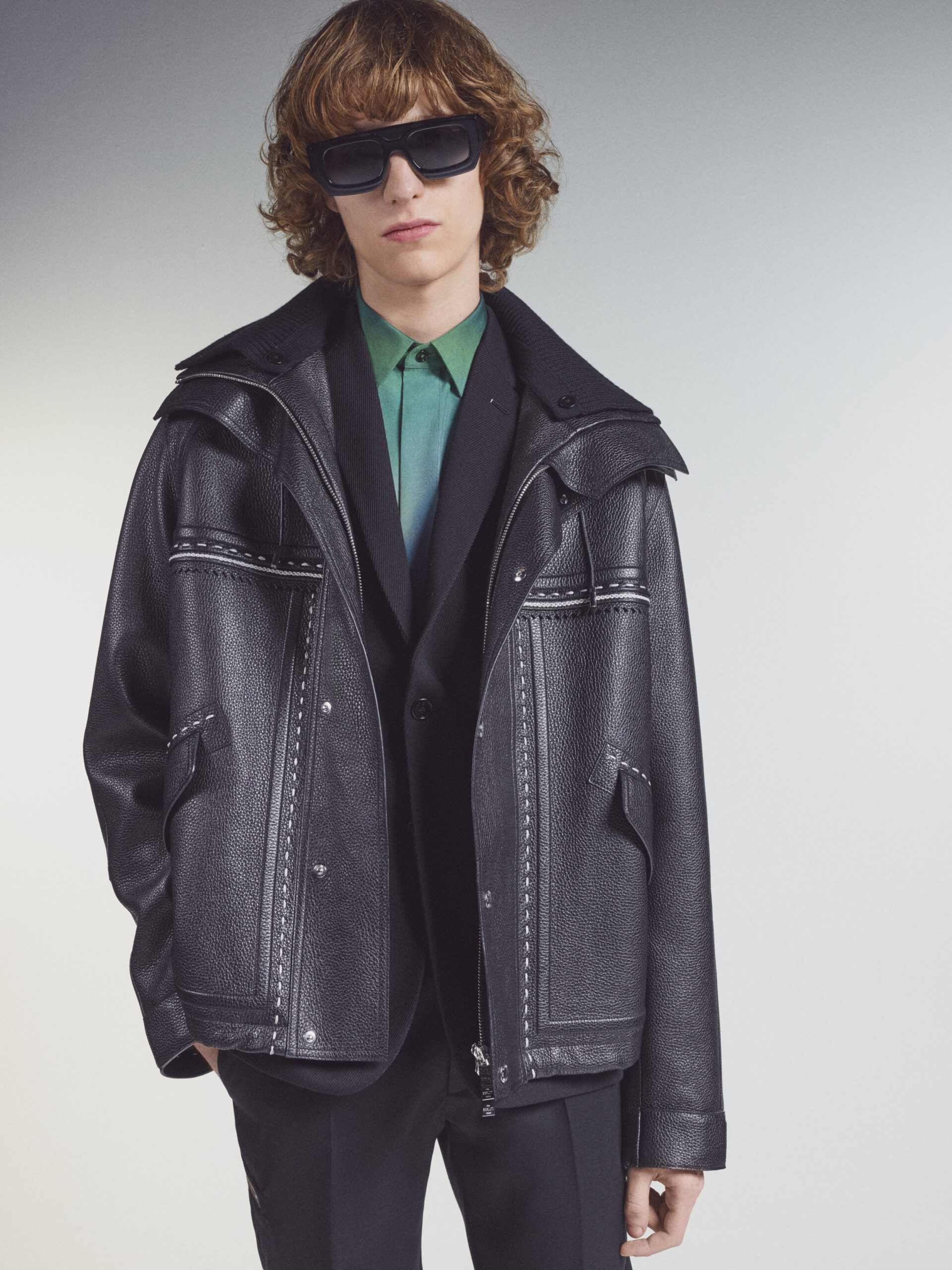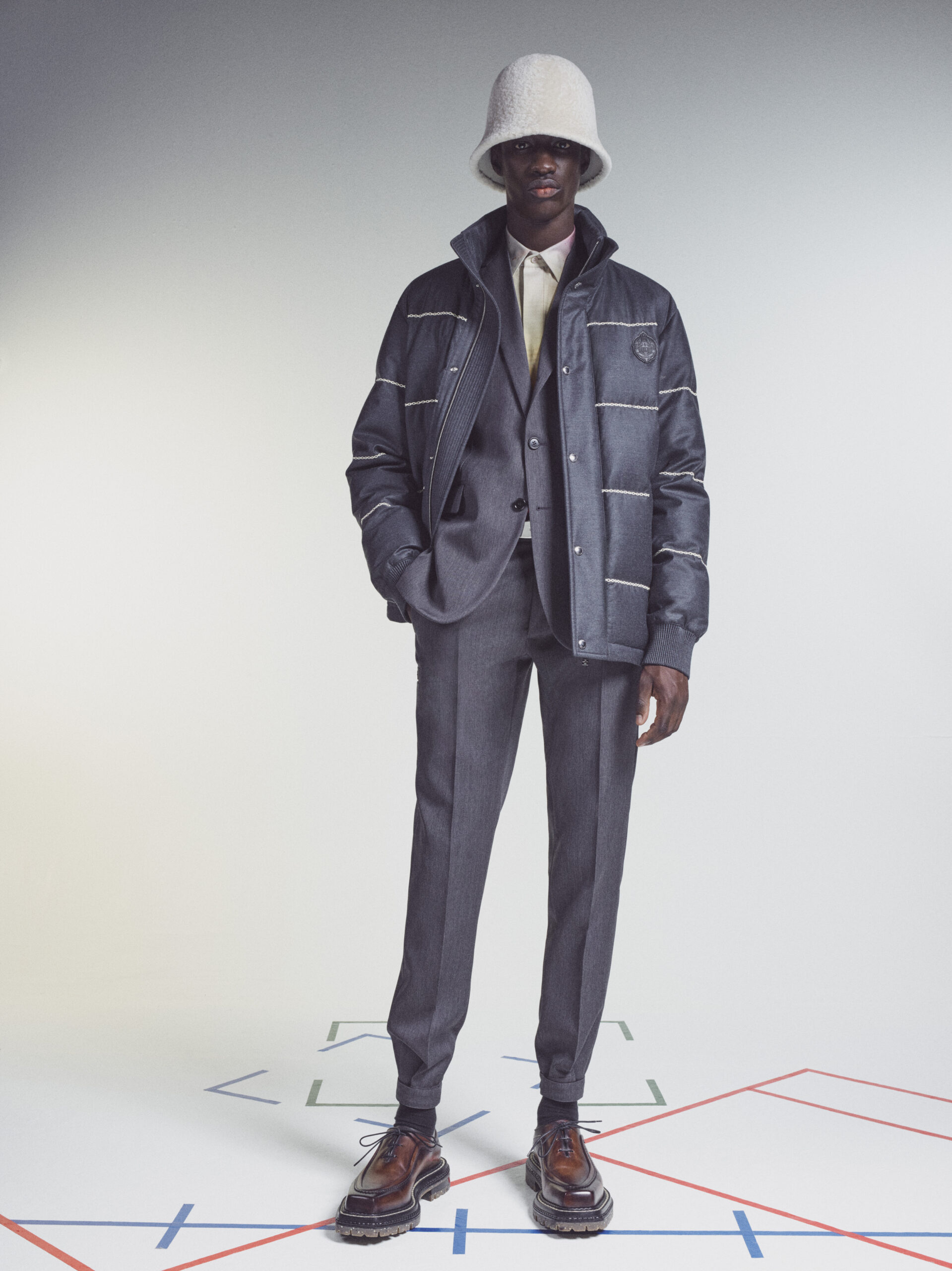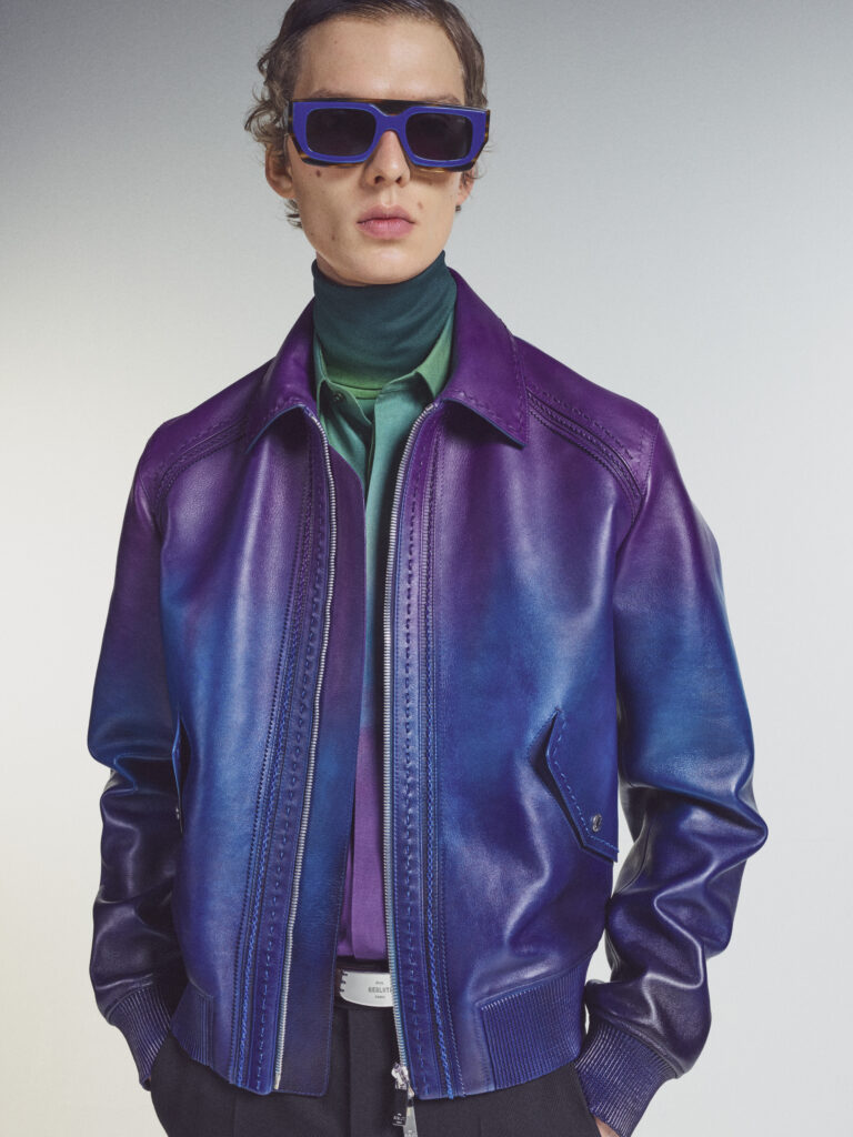 Suits executed in block colours picked up from the palette of the artist are deconstructed in styling, their components mixed up for a multi-colour tailoring expression. The signature colouration of Berluti’s classic shoes, patina evolves in leather jackets dyed and faded by hand. In a fully hand-stitched coat evoking one of the artworks, the stitching becomes the pattern itself. A hooded jacket and a jumper in hand-woven leather interpret Lev Khesin’s visual universe in geometric patterns. In suits rendered in exact prints of the artworks, the motifs are painstakingly aligned between jacket and trouser.