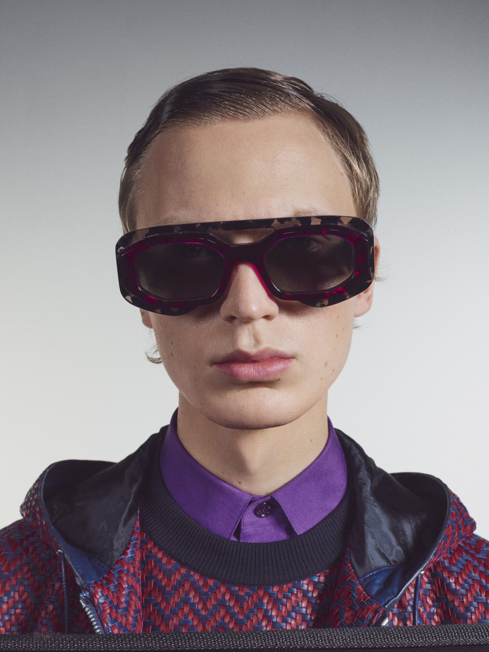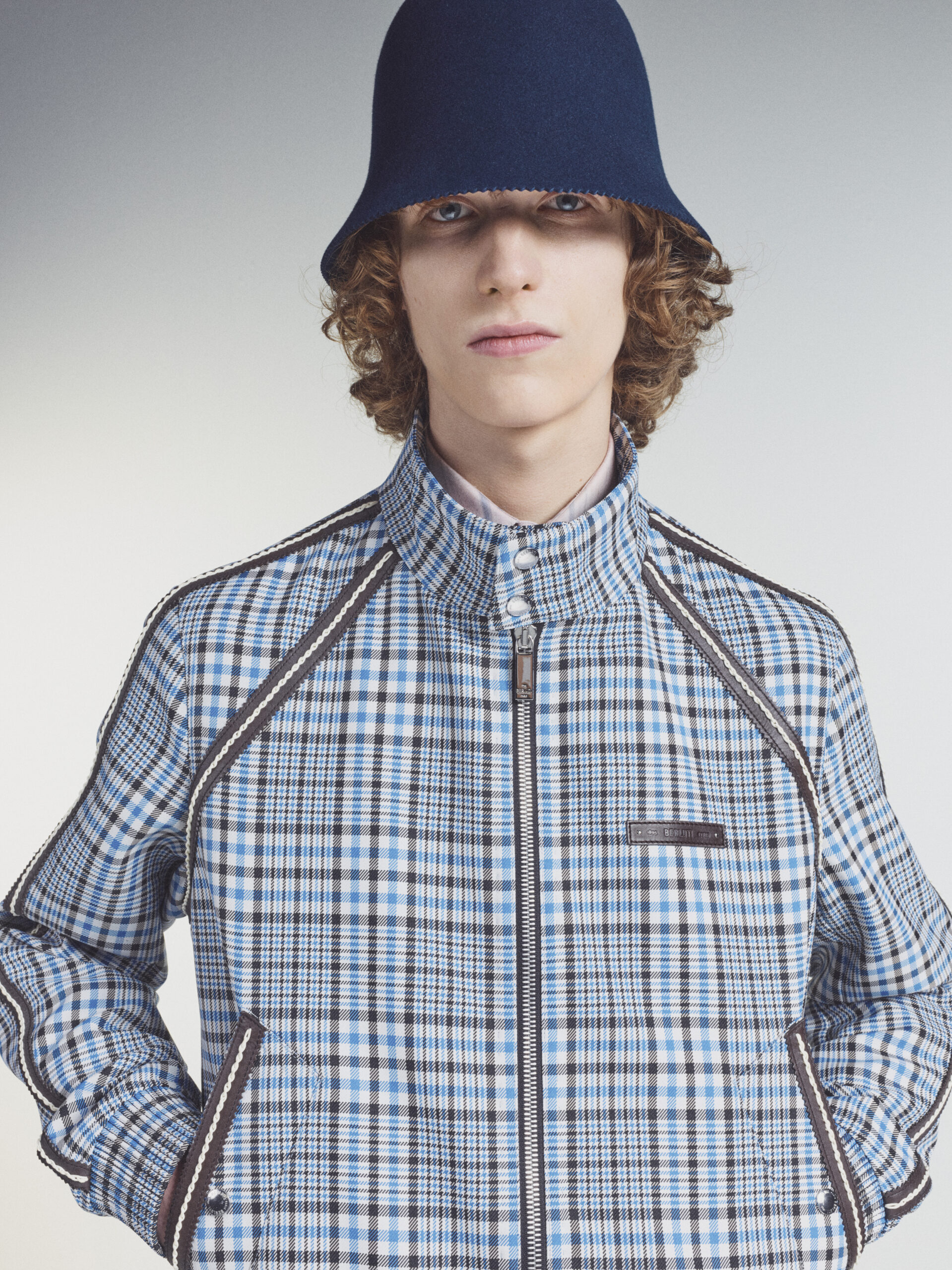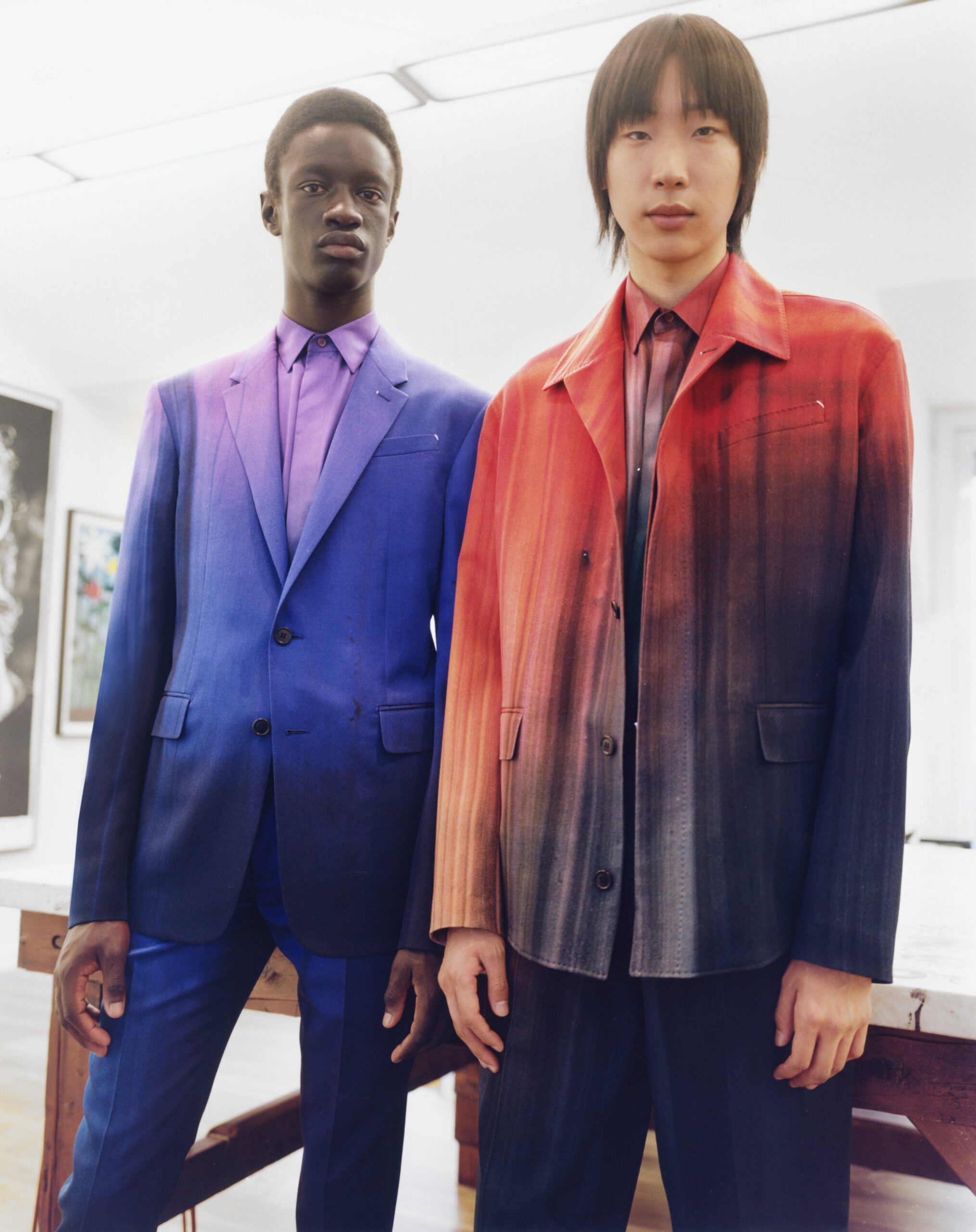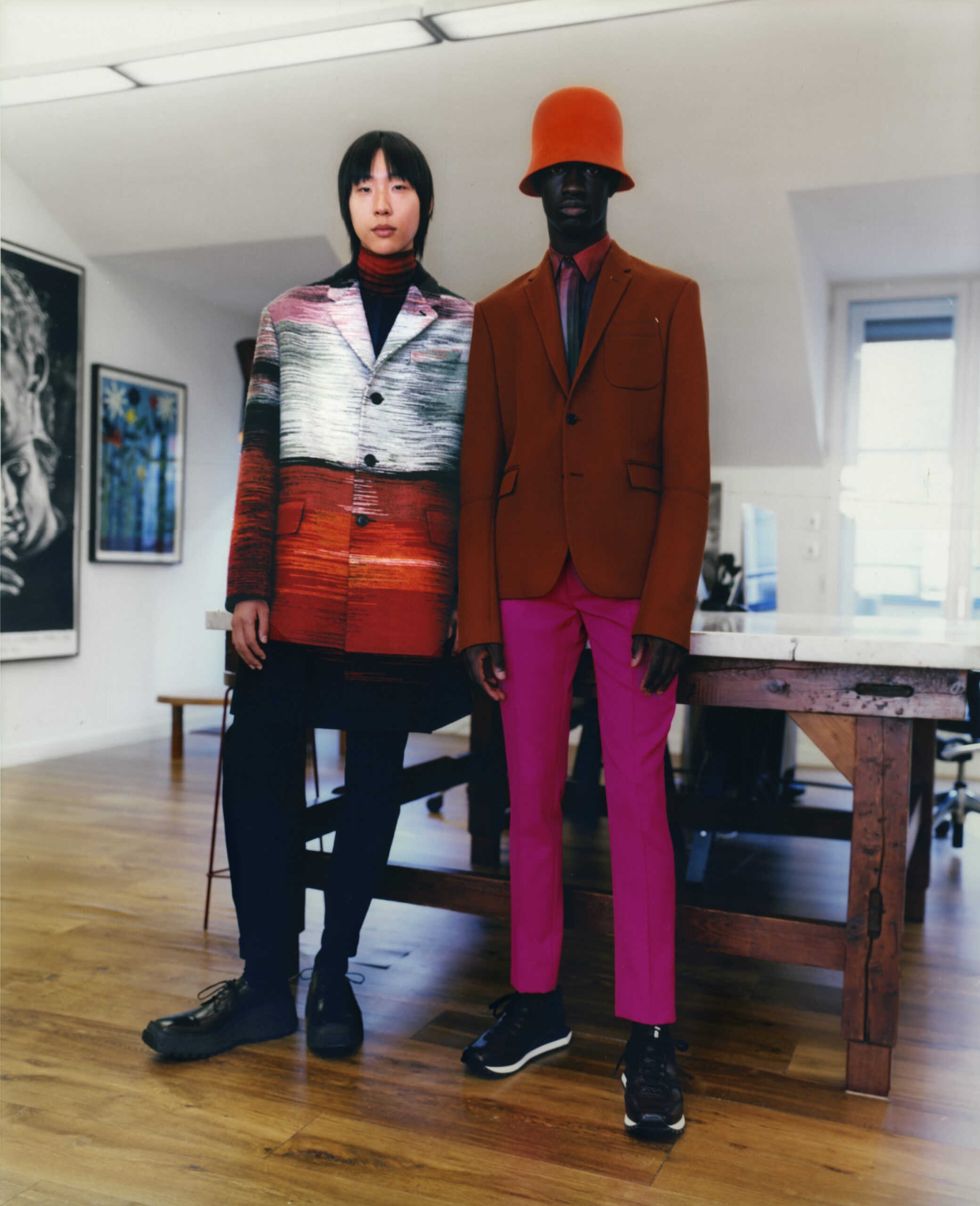 Suits executed in block colours picked up from the palette of the artist are deconstructed in styling, their components mixed up for a multi-colour tailoring expression. The signature colouration of Berluti’s classic shoes, patina evolves in leather jackets dyed and faded by hand. In a fully hand-stitched coat evoking one of the artworks, the stitching becomes the pattern itself. A hooded jacket and a jumper in hand-woven leather interpret Lev Khesin’s visual universe in geometric patterns. In suits rendered in exact prints of the artworks, the motifs are painstakingly aligned between jacket and trouser.