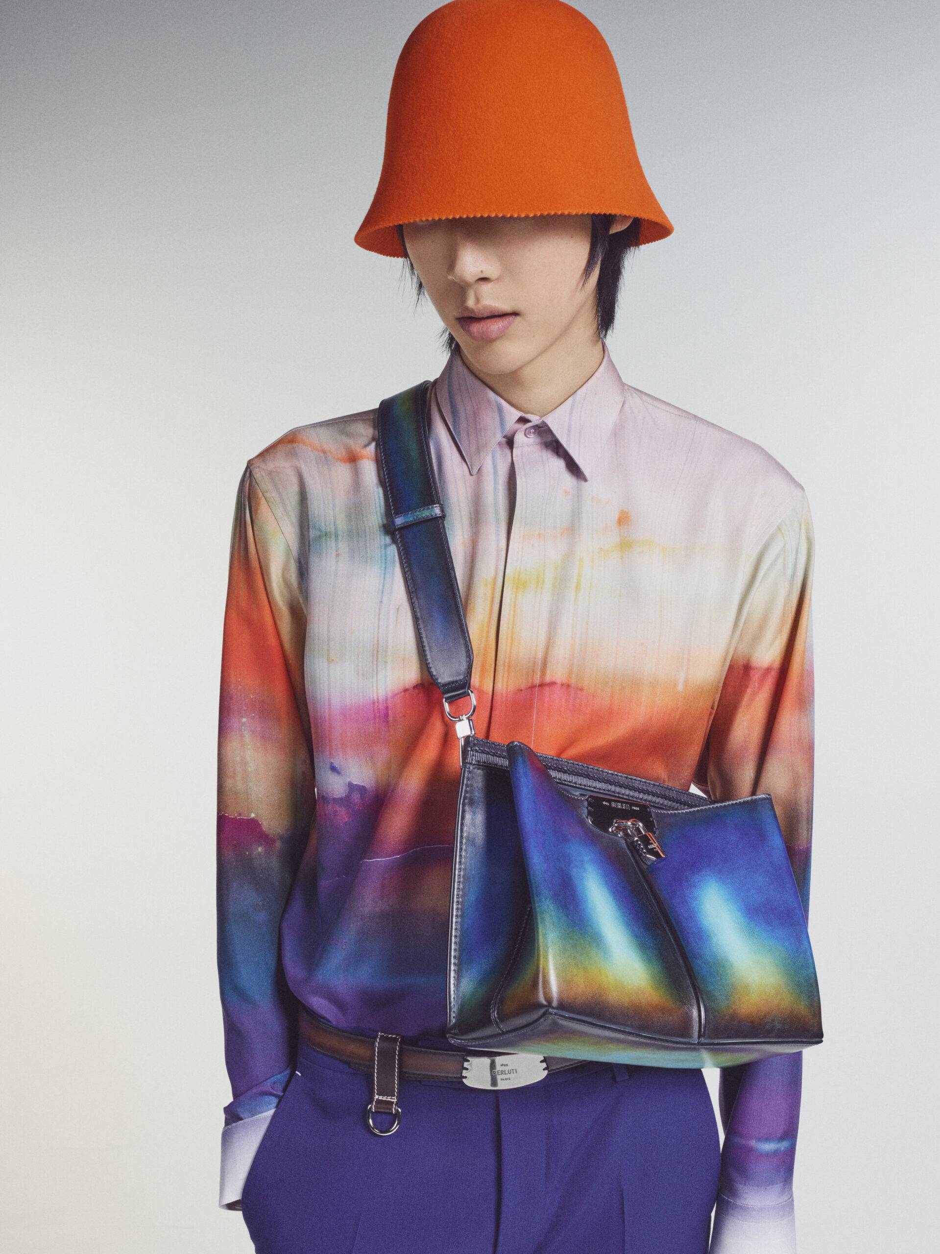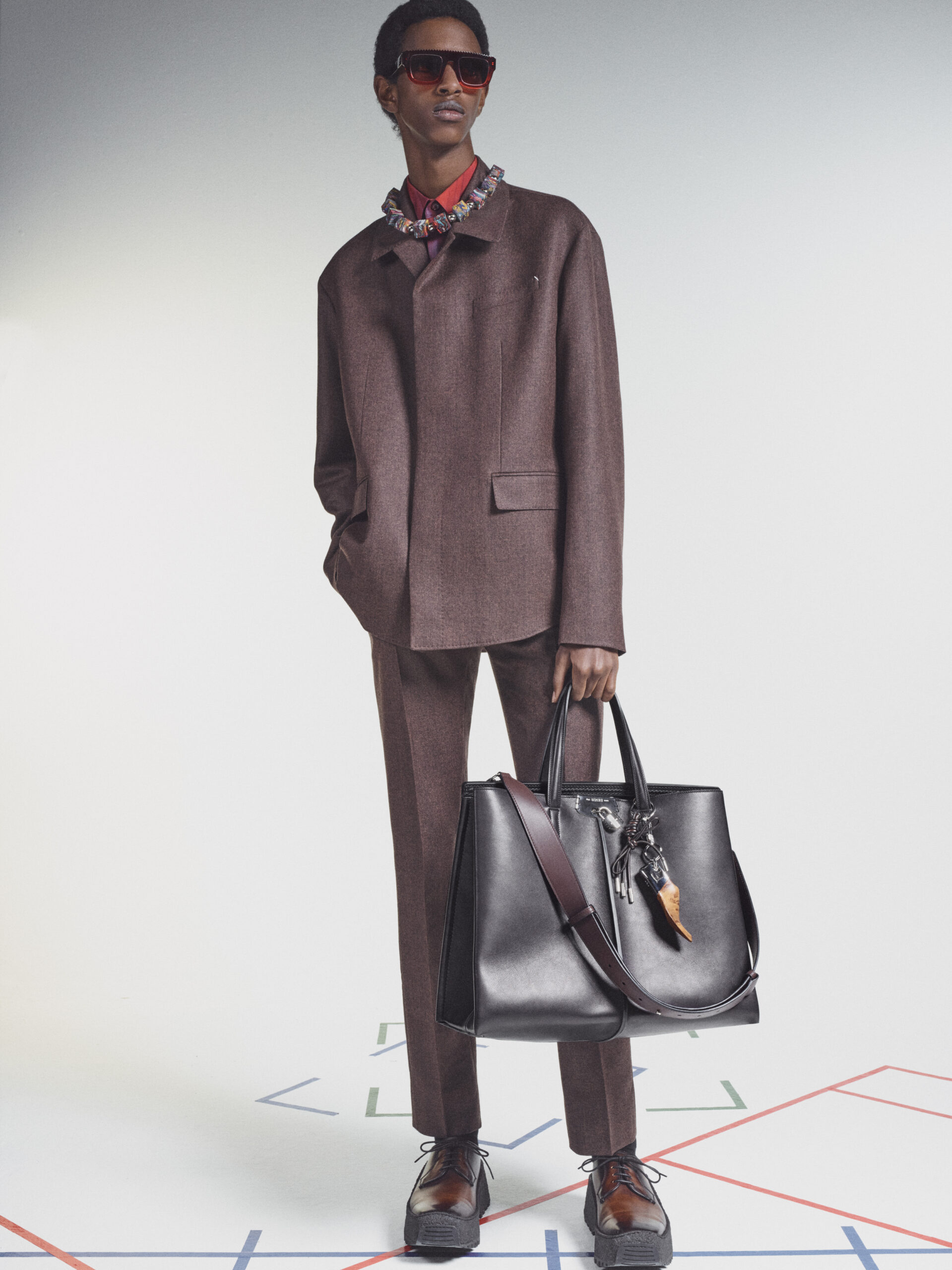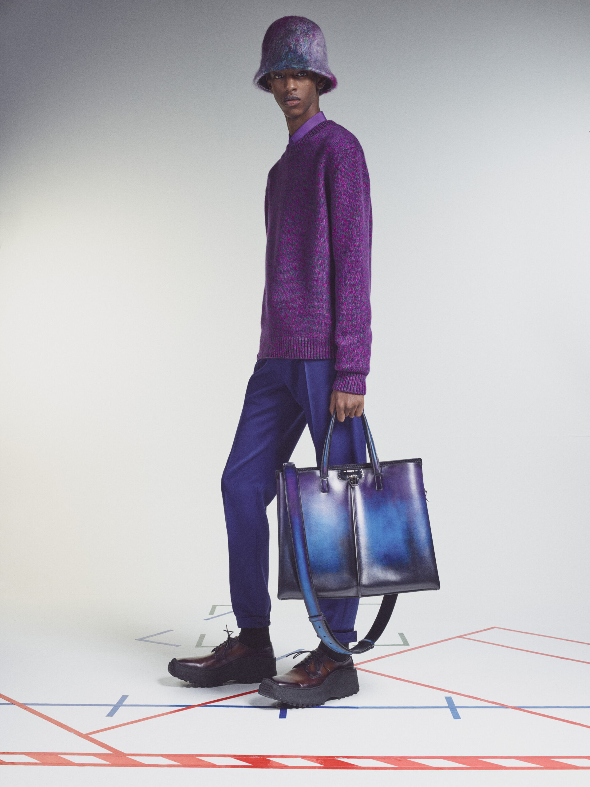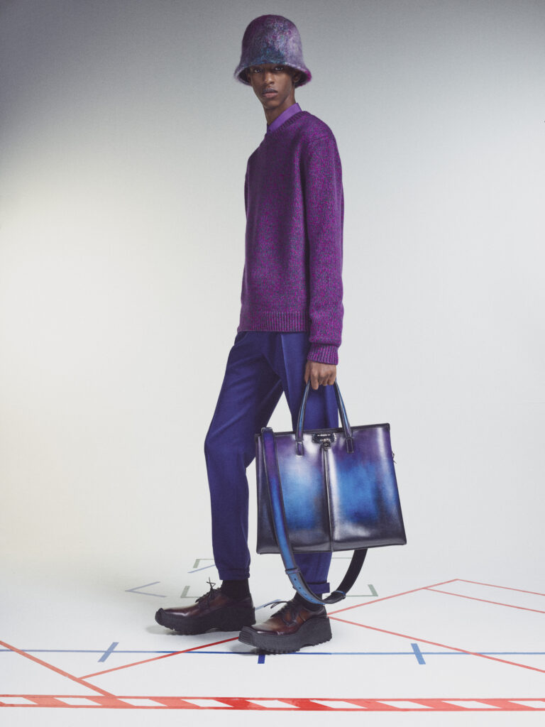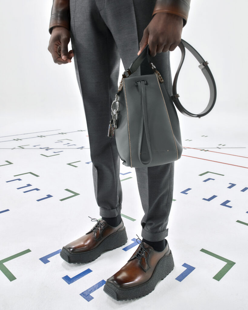 Bags echo the fluidity of the collection in soft and supple manifestations. They are adorned with charms including Berluti’s signature shoe tree and multi-colour pendants by the Spanish artist Jorge Penadés, whose practice revolves around the upcycling of leather overstock into compressed solid objects. Shoes embody the techniques of garments, from the upcycled triple-layered platform sole of a derby to a textured platform foam sole morphed with a classic leather shoe. Square-toed brogues are embellished with point norvégien, while new sneakers in patina leather hybridise the dress codes of sports and formalwear.