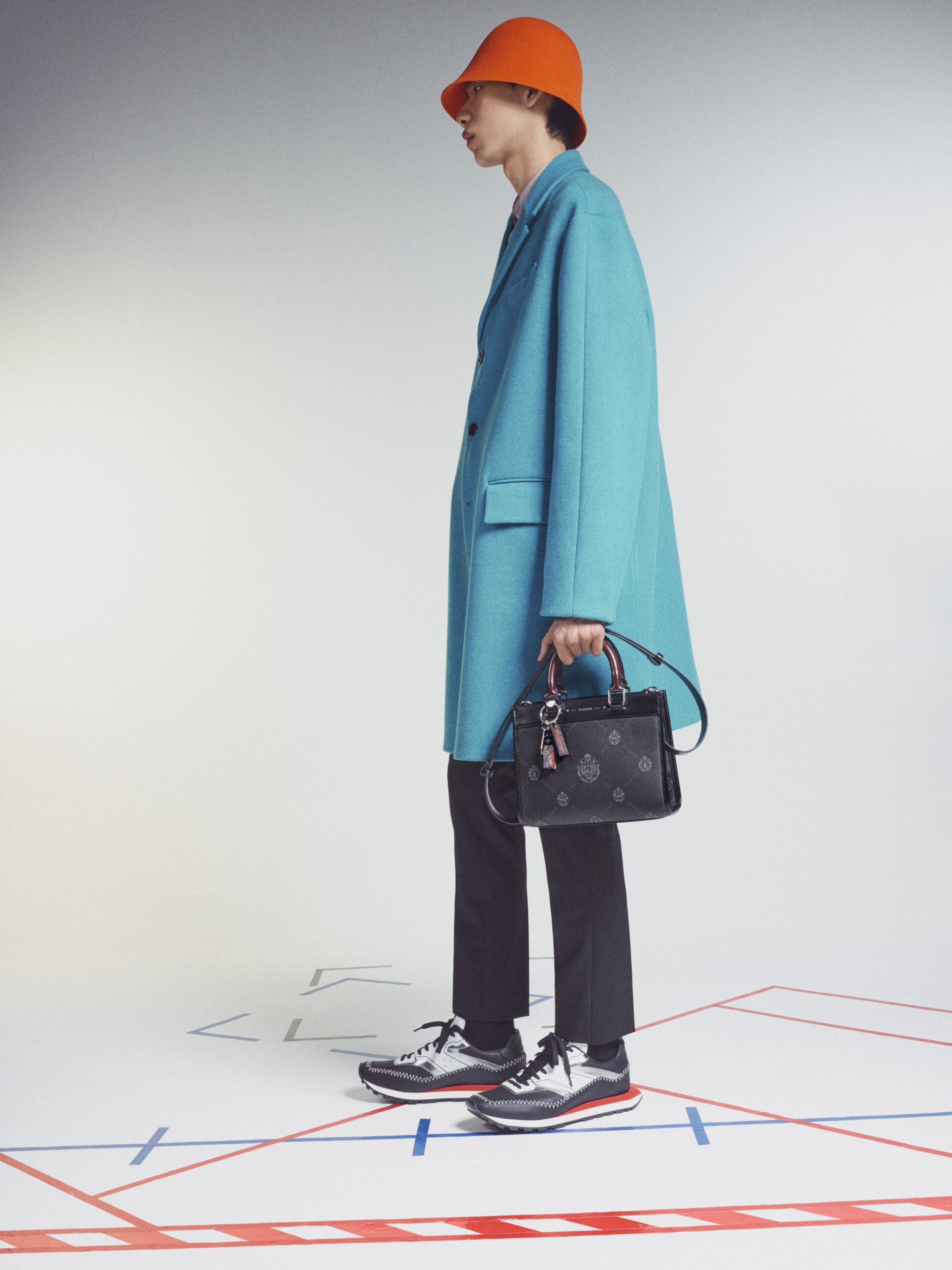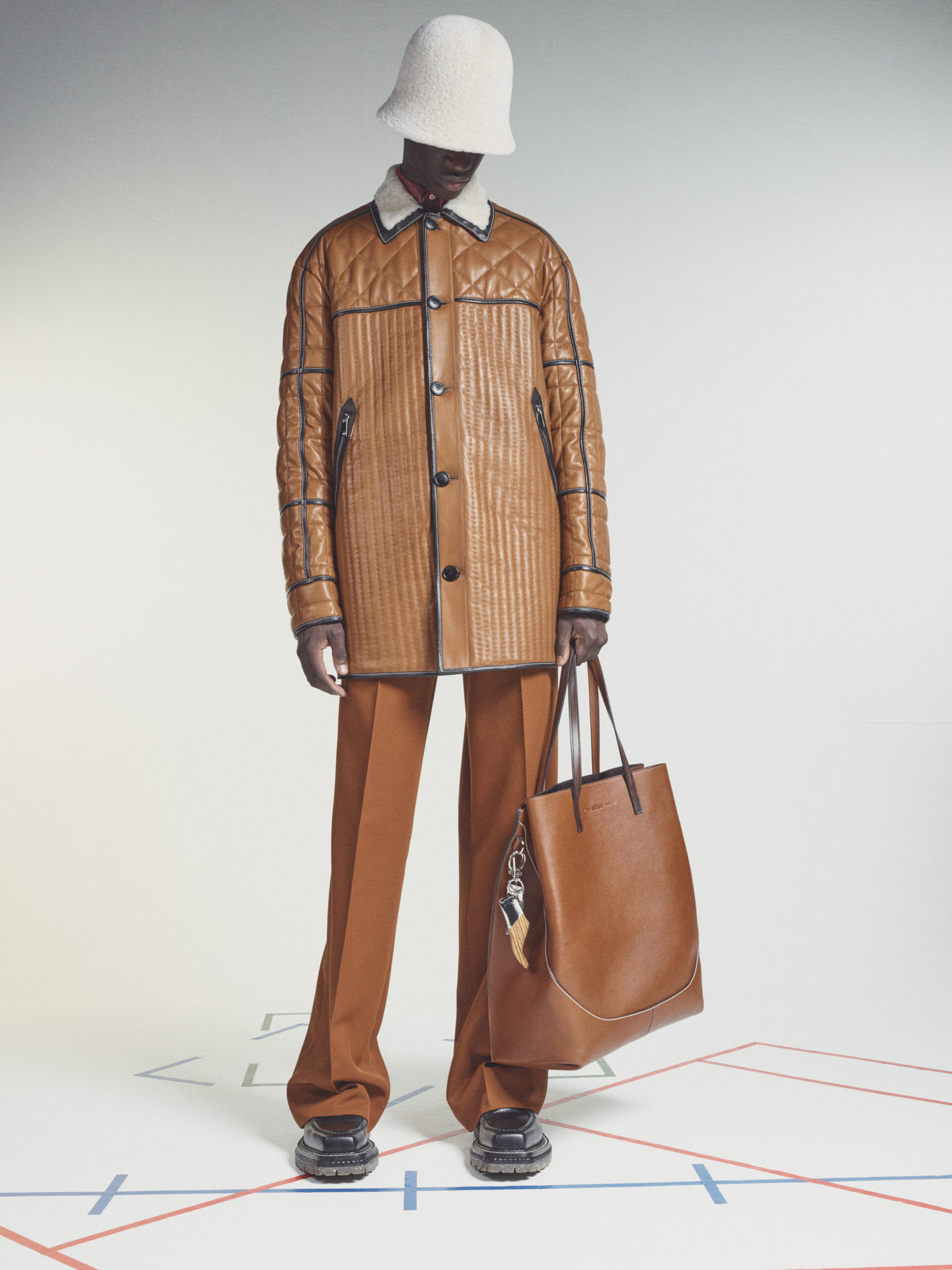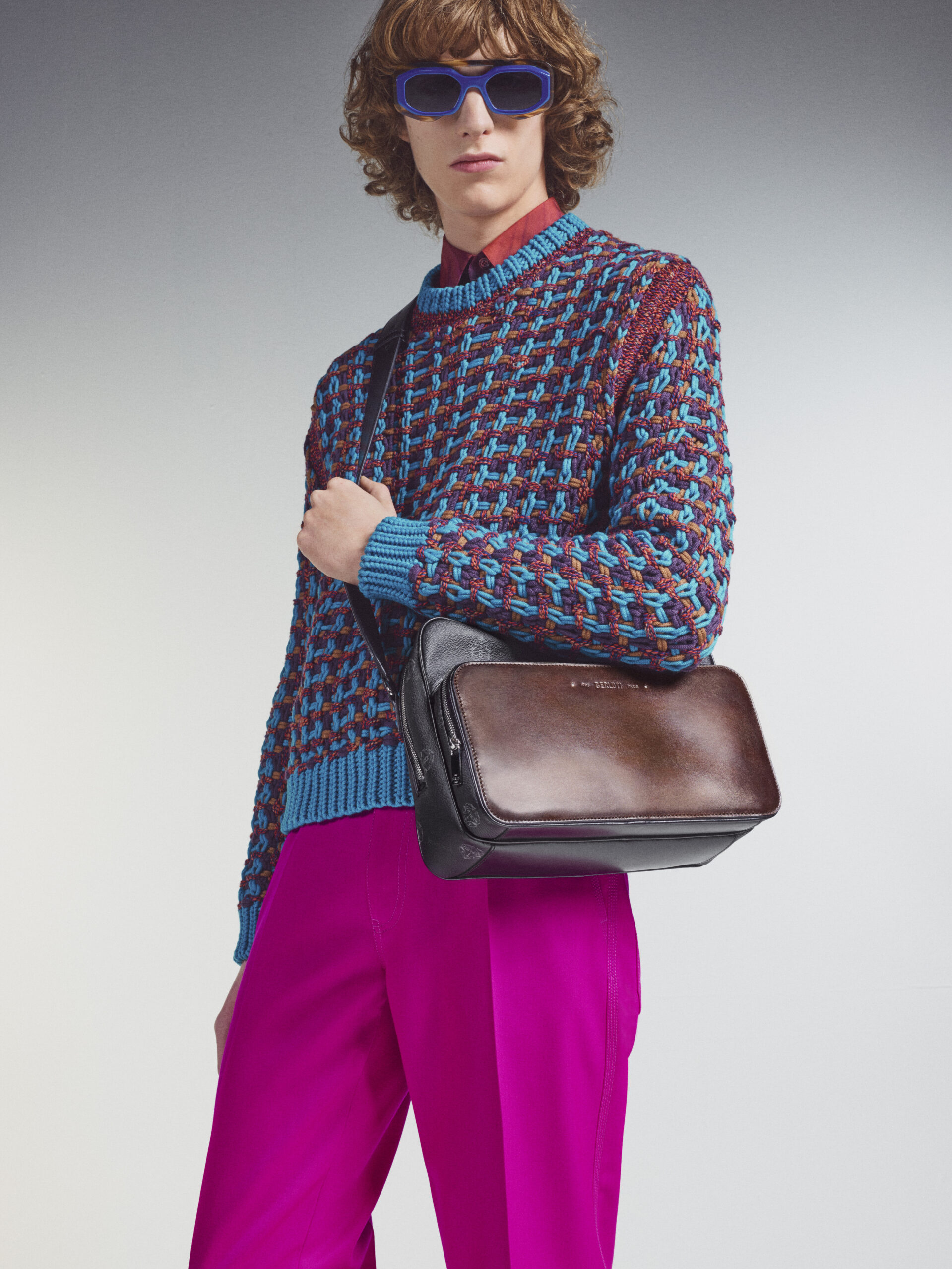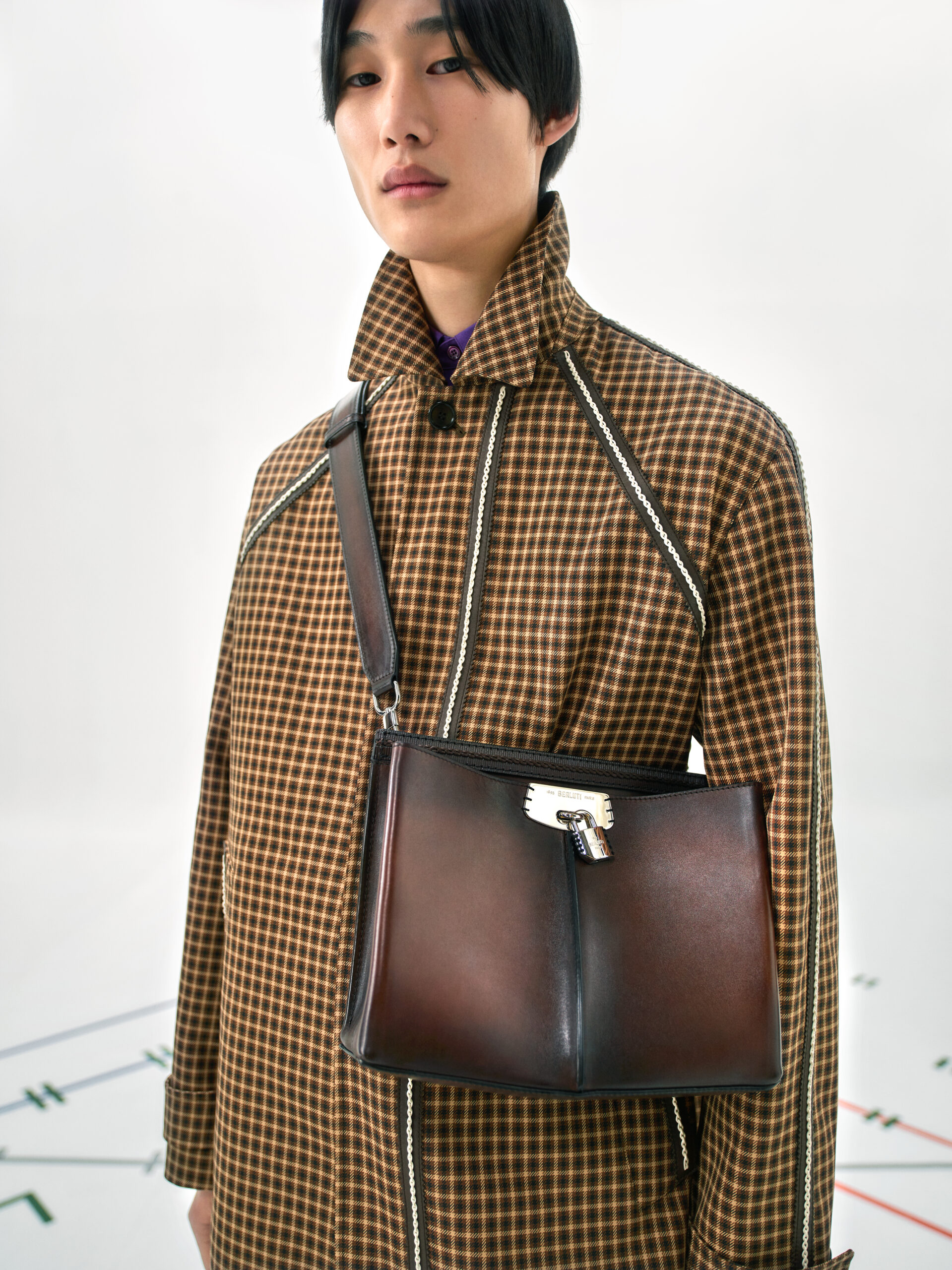 Bags echo the fluidity of the collection in soft and supple manifestations. They are adorned with charms including Berluti’s signature shoe tree and multi-colour pendants by the Spanish artist Jorge Penadés, whose practice revolves around the upcycling of leather overstock into compressed solid objects. Shoes embody the techniques of garments, from the upcycled triple-layered platform sole of a derby to a textured platform foam sole morphed with a classic leather shoe. Square-toed brogues are embellished with point norvégien, while new sneakers in patina leather hybridise the dress codes of sports and formalwear.