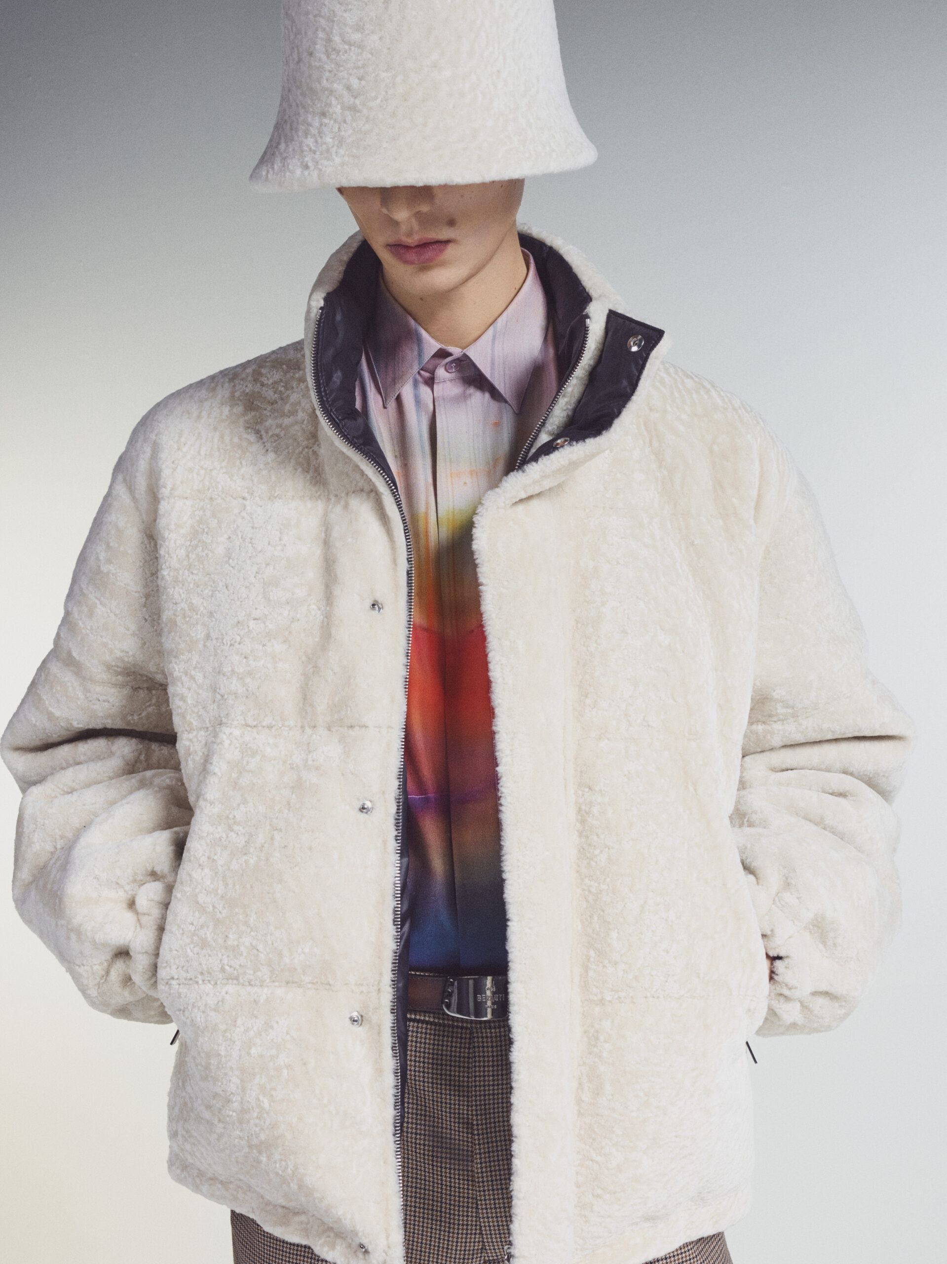 Intensifying the artisanal value, point norvégien is applied to outerwear and suiting. White stitch embroidery that is traditionally employed in shoe-making – and which can only be achieved by hand – translates into the piping of quilted leather jackets, the trims of a leather suit, and the cushioning of a padded puffer coat. Observing similar notes of the hand-spun and folky, a reversible puffer jacket is created entirely in off-white shearling.