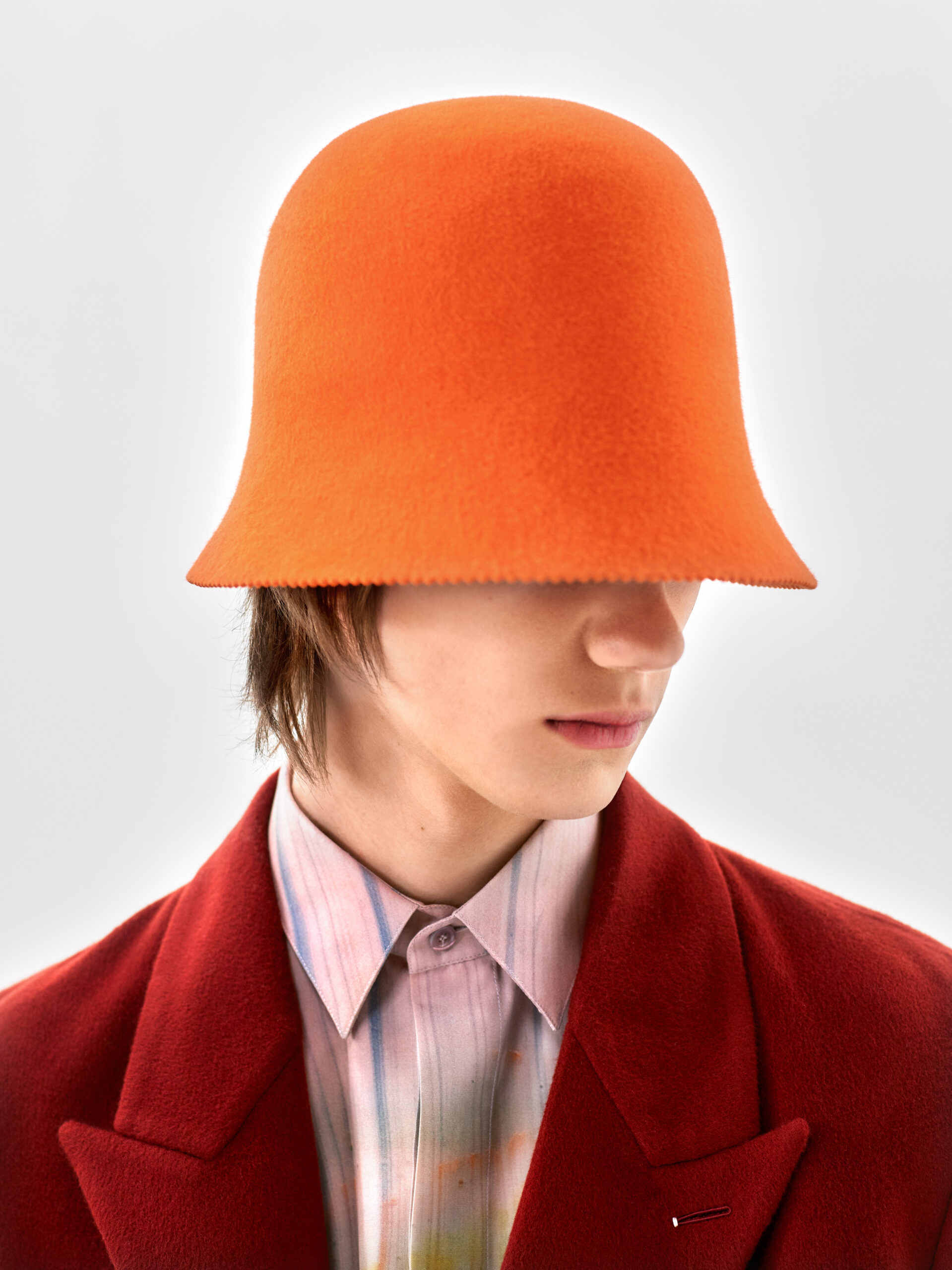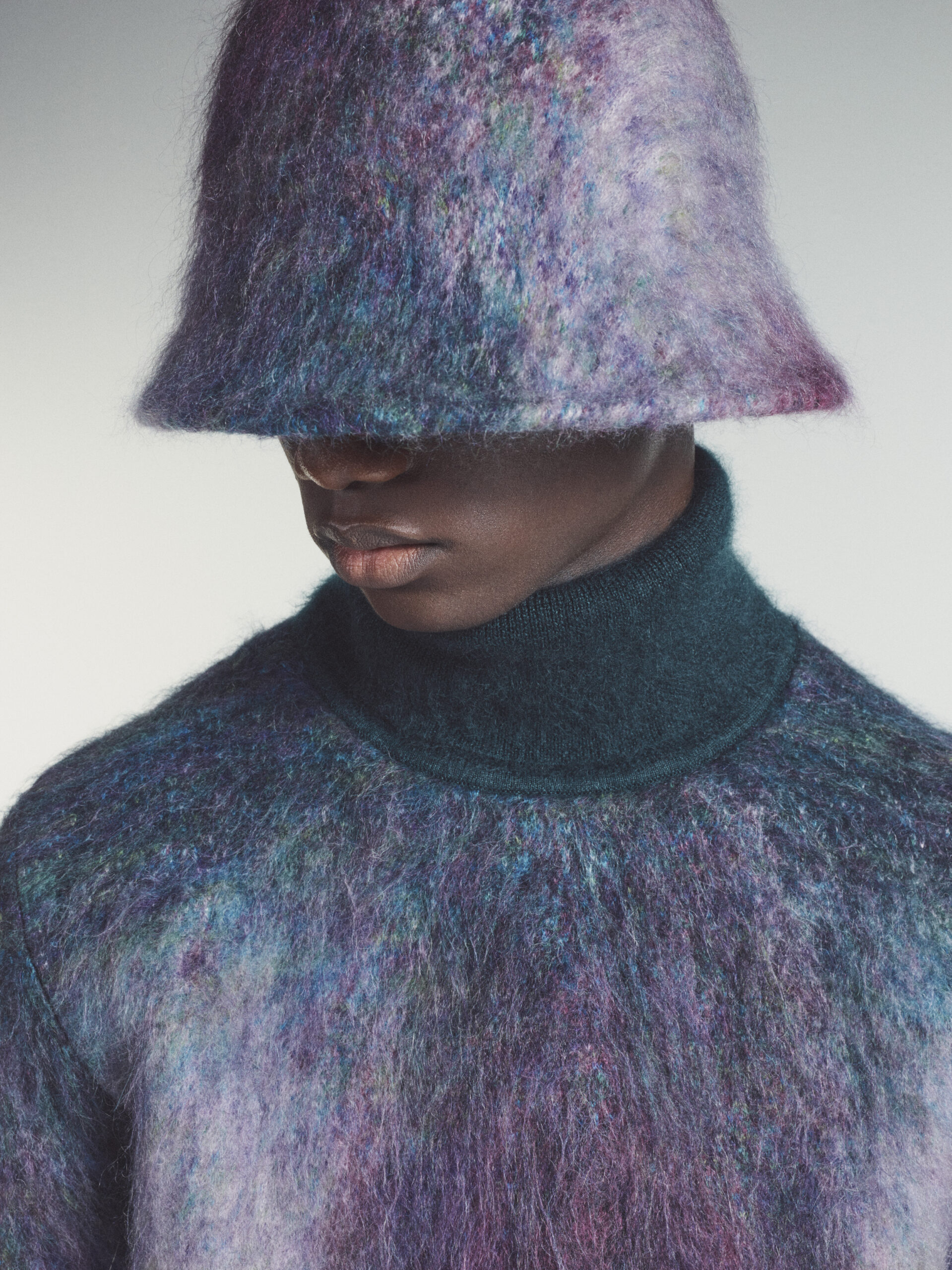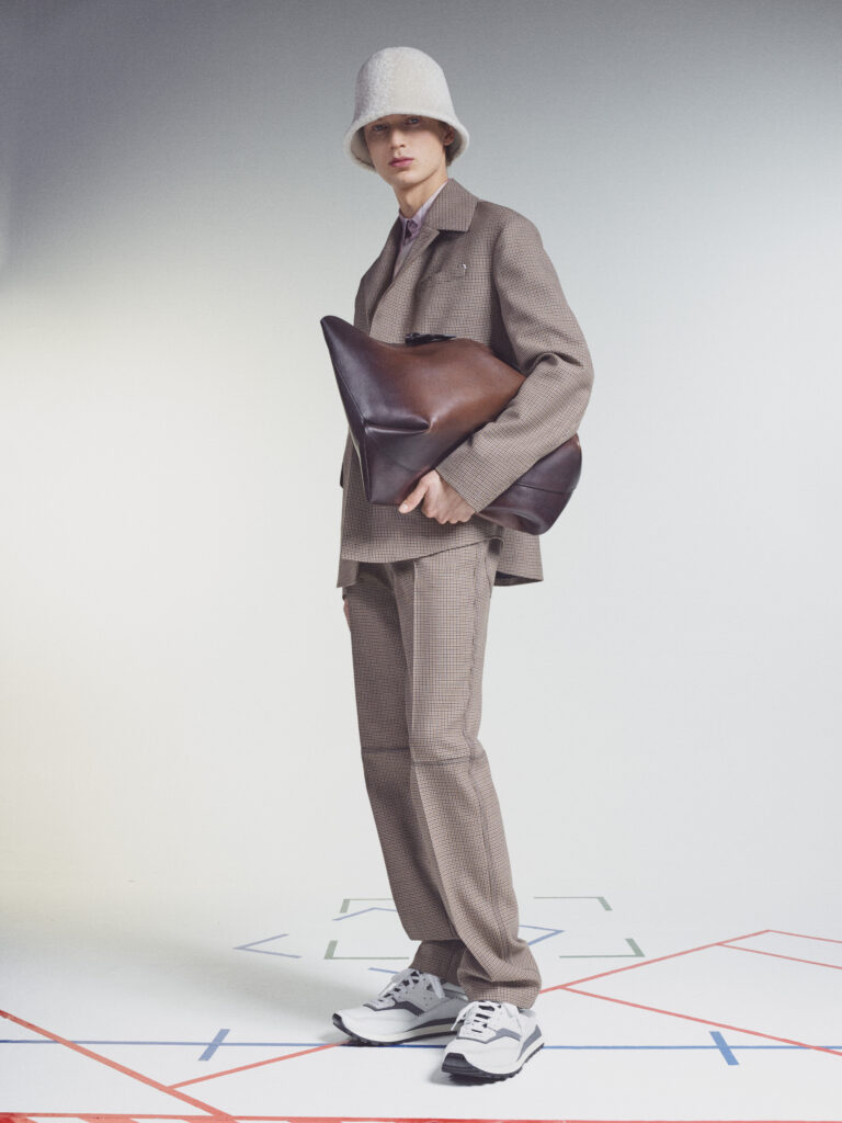 The symbiosis between the digital presentation format and the highly tactile nature of Lev Khesin’s artistic expression creates a dialogue between the palpable and the virtual: a search for the idea of human and material connection in the digital sphere. The need for a tangible and tactile reality is reflected in motifs, colours and textures informed by the work of Lev Khesin. Interpreted in garments and accessories, they create the foundation for a collection embodied by fluidity, adaptability, and the human hand. Subtly unstructured lines cut a soft and relaxed tailoring silhouette. It’s a feeling of comfort expressed in neo-suiting fusing traditional formal dress codes with those of the workwear and sportswear wardrobes, often carried out in double-face cashmere.
