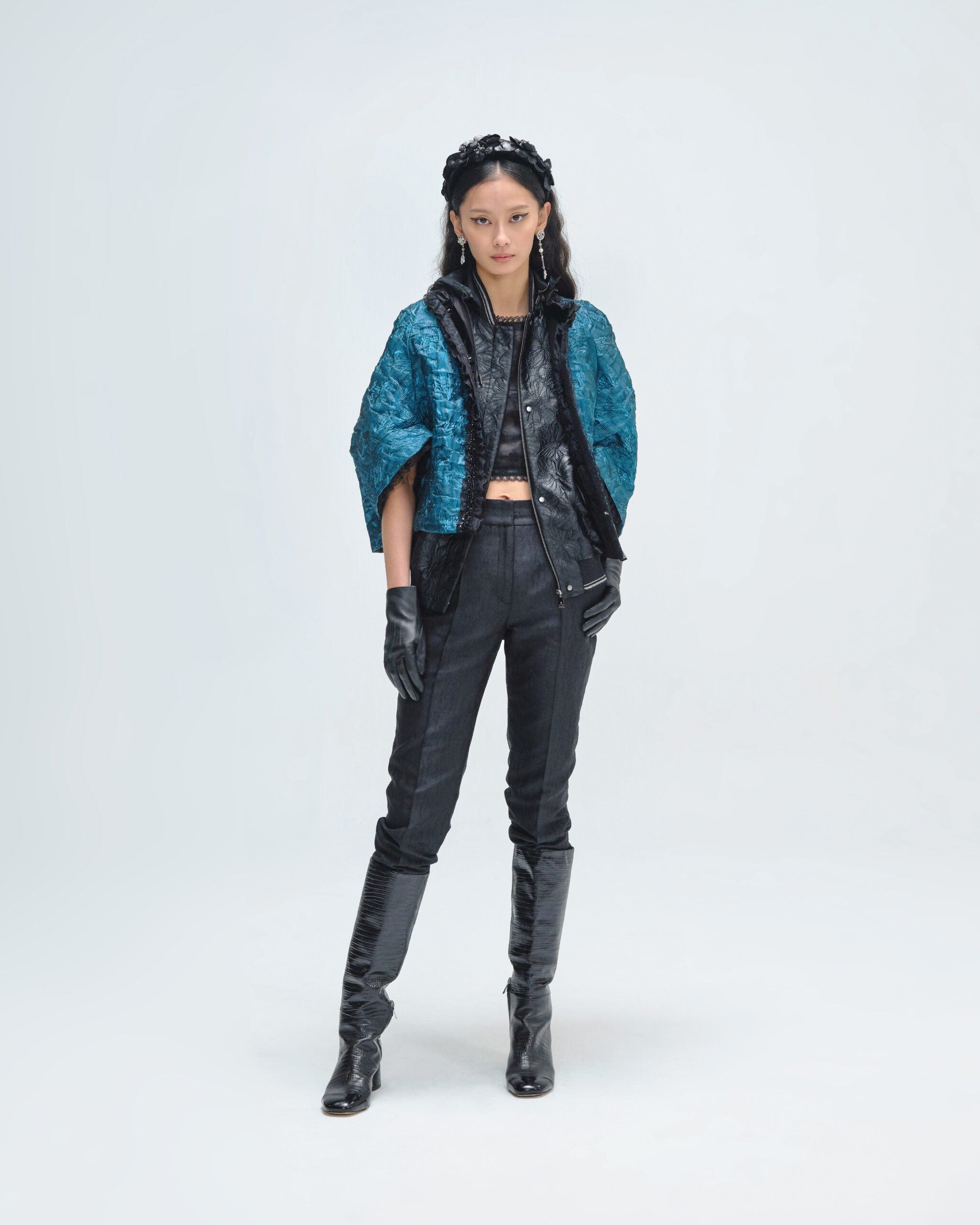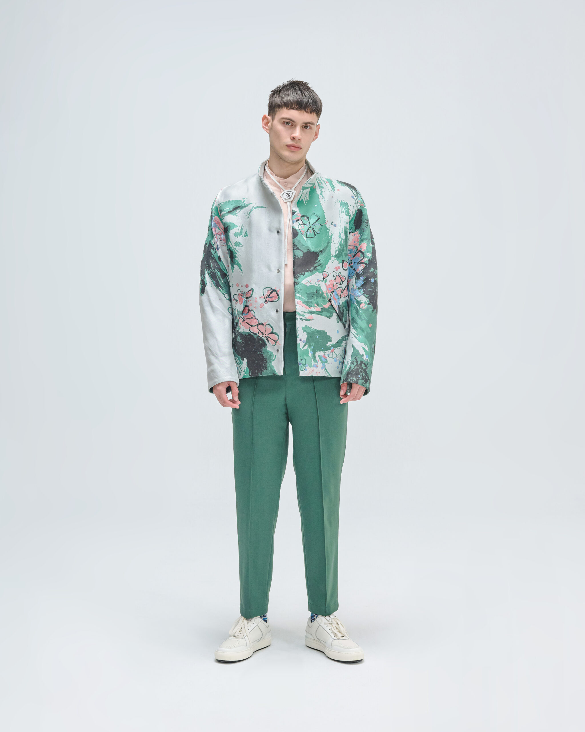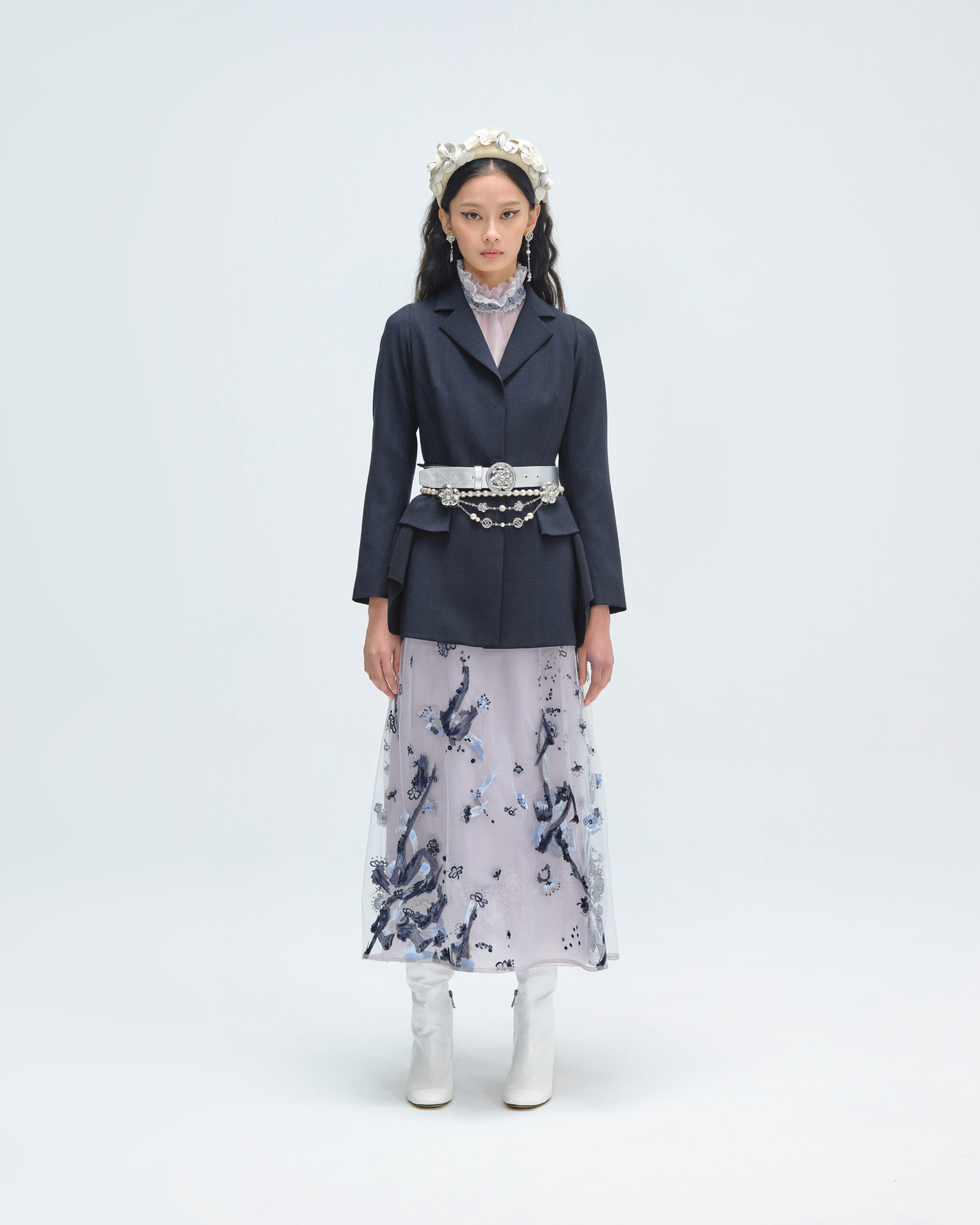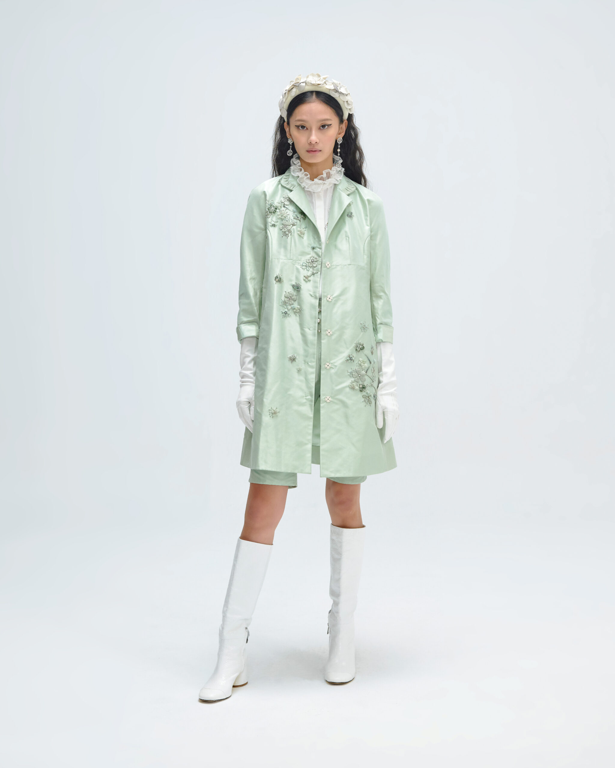 Cette saison s’inspire du prunier qui, face aux vicissitudes de l’hiver, est le premier à fleurir, exprimant ainsi simultanément vigueur et délicatesse. Les motifs uniques de la marque conservent en eux la puissance des coups de pinceau et l’audace des contrastes de couleurs. Les broderies faites à la main, les jacquards, les impressions peintes à la main s’expriment dans le vêtement. L’ensemble des couleurs suit un développement qui commence avec le bourgeonnement pour ensuite atteindre la pleine floraison. Aux classiques noir et blanc se succède une gamme de roses qui, elle-même, se prolonge dans un bleu saturé et un rouge de fleur de prunier, exprimant ainsi, dans les rigueurs de l’hiver, une élégante arrogance. Puis, un jaune doré, un rose pêche, un vert vif et un indigo, tous particulièrement denses, rendent le bourgeonnement encore plus éclatant. Enfin, un blanc, un rose saumon et un vert absinthe, tous délicats, se transforment en un rouge grenade pur et un vert pin intense, exprimant ainsi la floraison complète de la fleur du prunier qui se dresse et se balance au gré du vent. Les vêtements pour hommes rappellent, quant à eux, l’allure des hommes de lettres d’antan. Un grand nombre de gris et de noirs calmes et sereins sont utilisés, auxquels s’ajoutent les quelques couleurs vives des vestes classiques à col montant, des manteaux et des polos. Les motifs uniques de la marque sont utilisés avec parcimonie, ornant le corps du vêtement et le col. La fleur du prunier se métamorphose aussi en boutons chinois qui apparaissent en décalé sur le devant du manteau et sur les poignets, montrant ainsi à quel point la marque maitrise le style élégant et intemporel des hommes de lettres.Pour la collection pré-automnale 2021, Shiatzy Chen persévère dans son savoir-faire et remet de nouveau à l’honneur la fleur de prunier dans ses vêtements. Les vêtements pour homme évoquent l’allure des hommes de lettres d’antan et expriment une certaine poésie. Un style léger et raffiné renforce leur beauté. Les vêtements pour femmes s’inspirent, quant à eux, des jolis contours des années 60. Ils mélangent les couleurs des différentes périodes de floraison et, à travers une déconstruction, introduisent l’idée d’un « habit ravissant », esquissant ainsi le look versatile et abondant des femmes modernes.