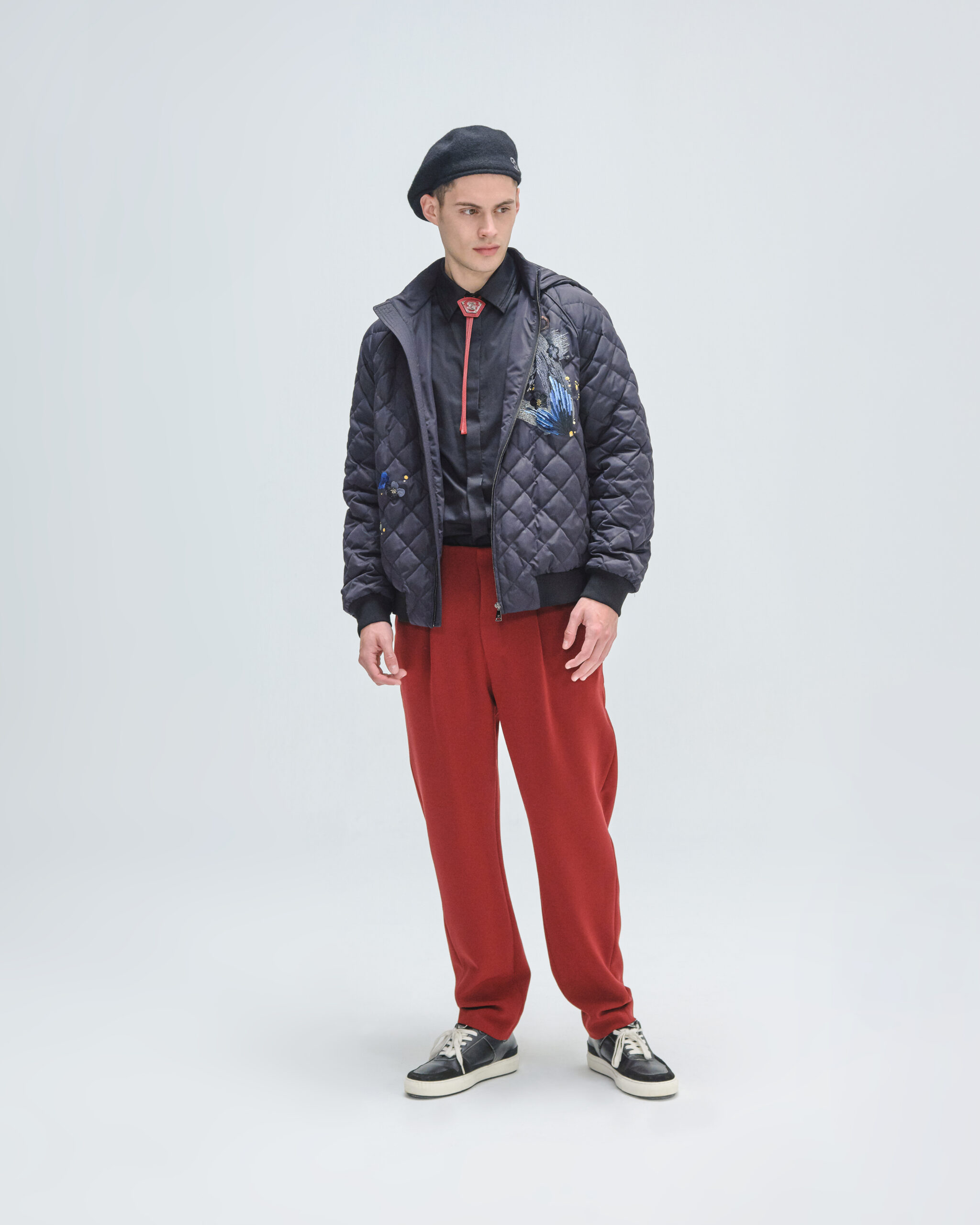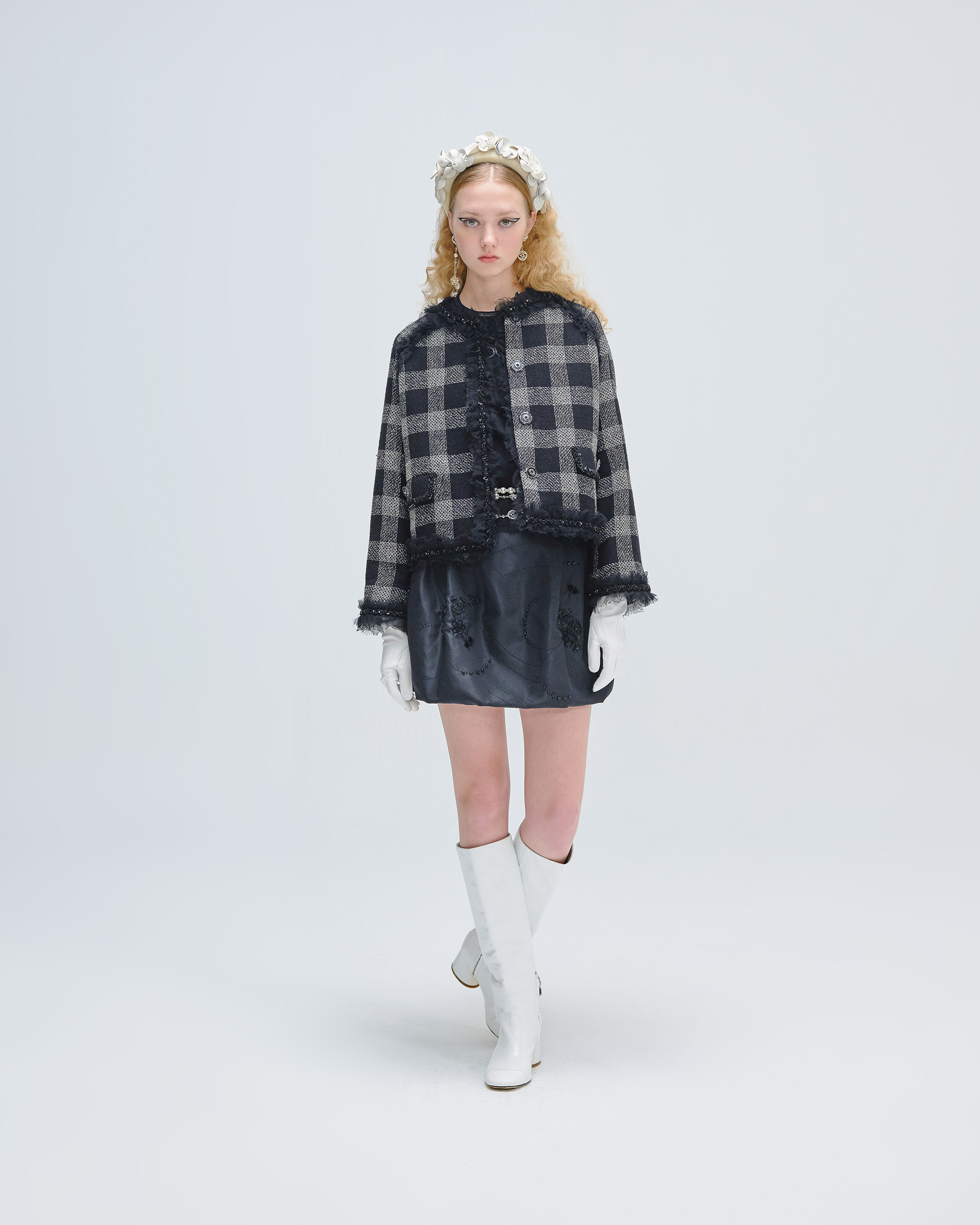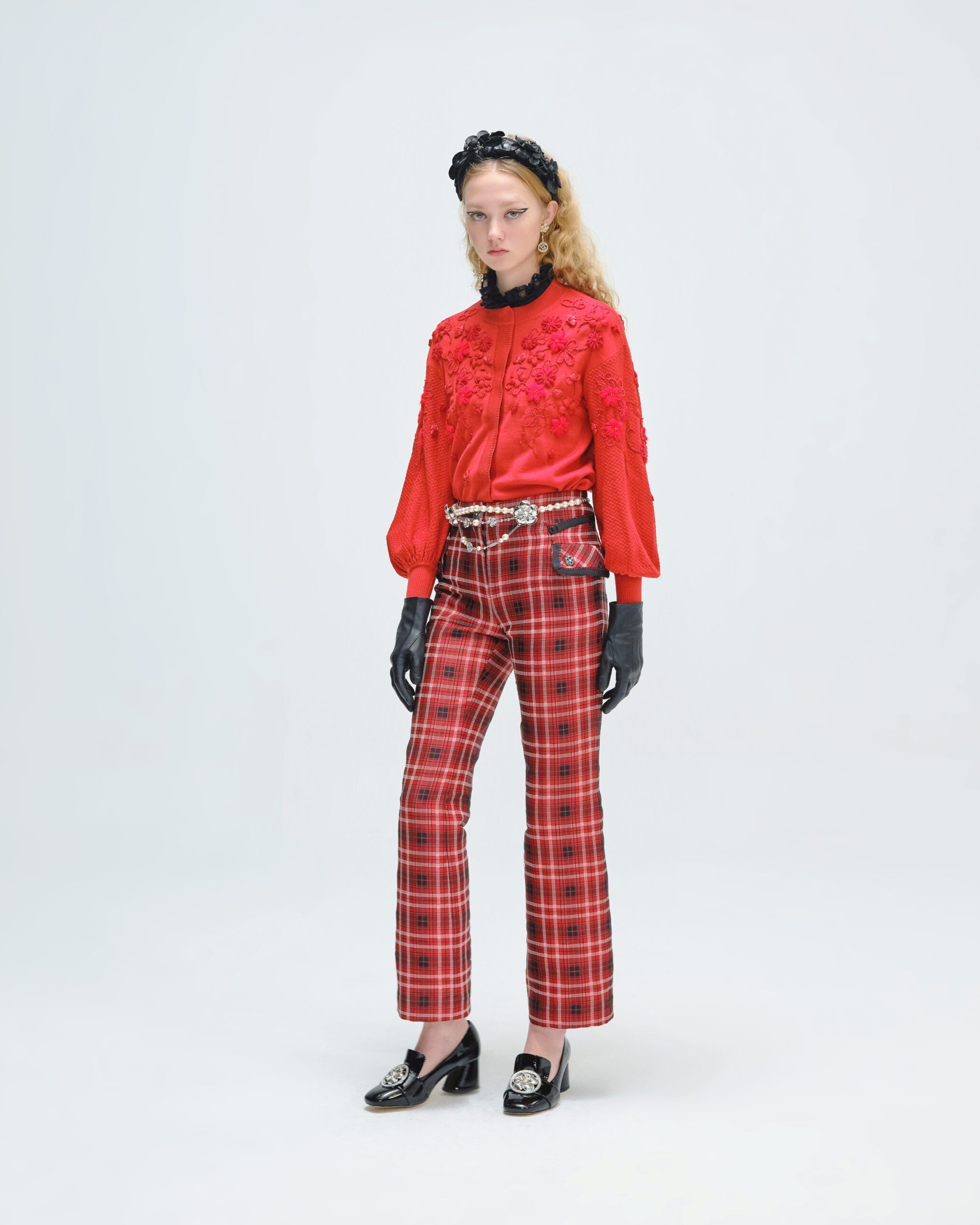 À ce style s’ajoute une superposition d’une grande quantité de dentelle, de tissus transparents et de tissus plissés qui reflètent une certaine tranquillité automnale. Les accessoires qui sont ajoutés suivent le thème de la fleur de prunier, tels que des boucles d’oreilles pendantes asymétriques en forme de fleur de prunier, des bracelets en métal sur lesquels sont gravés des fleurs de prunier, des ceintures et des chaînes à couches multiples en perles incrustées de fleurs de prunier. Les sacs à main, pour cette saison, sortent également de l’ordinaire. Le bouton tournant en métal qui prend la forme du tout nouveau logo de la marque SC et qui se combine avec les poignées de couleur jade, ainsi que le cuir de chèvre sur lequel sont brodés des boutons de fleur expriment un sentiment d’innovation alliant culture orientale et netteté moderne. Les détails d’une féminité romantique apparaissent en contraste avec des manches et un col tous deux de style chinois classique, mais aussi avec des pantalons courts emplis de jeunesse, des jupes courtes et des chemises blanches soignées. Les bottes assorties laissent transparaitre un style féminin unique doté d’une vitalité inégalée et offrent à la vue non seulement une jeunesse élancée, mais surtout l’esprit intrépide de la fleur de prunier qui s’apprête à s’épanouir.Du point de vue des contours, les vêtements pour hommes combinent la coupe classique à la chinoise avec différents types de matériaux. Le chinois et l’occidental, le moderne et le classique se mélangent pour créer du nouveau. Différents types de tissus et de couleurs sont utilisés pour façonner une silhouette élancée. Les vêtements pour femmes, quant à eux, utilisent, en grand nombre, les jolis contours des années 60, à travers, entre autres, des robes courtes, des vestes courtes, des vestes longues accompagnées de jupes courtes ou de pantalons courts. Les deux-pièces classiques de la marque laissent transparaitre plus de vitalité qu’auparavant, utilisant différents designs de jacquards. L’aspect des couches extérieures rappelle non seulement l’aspect évanescent de la fleur de prunier, mais aussi l’aspect rocheux. Un aspect qui s’accompagne, dans les couches intérieures, d’impressions artistiques vigoureuses et délicates de style chinois. Les couches intérieures et extérieures se font ainsi plusieurs fois écho. De somptueux tissus à l’aspect lustré, tels que du tissu à paillettes, du satin, un mélange de laine et de soie, de la flanelle, de la dentelle et du jacquard de couleurs contrastées, sont combinés, sur lesquels s’insèrent quelques éléments de tartan, tels que du tartan écossais, de la gaze de laine ayant un motif de fleur de prunier ressemblant à un damier, de la laine avec des trous carrés et du duvet en quadrillage. Différentes méthodes sont ainsi utilisées pour révéler des motifs occidentaux, auxquels s’accompagnent des éléments de couture chinois et des techniques de broderie grâce auxquels la marque s’est rendu célèbre.