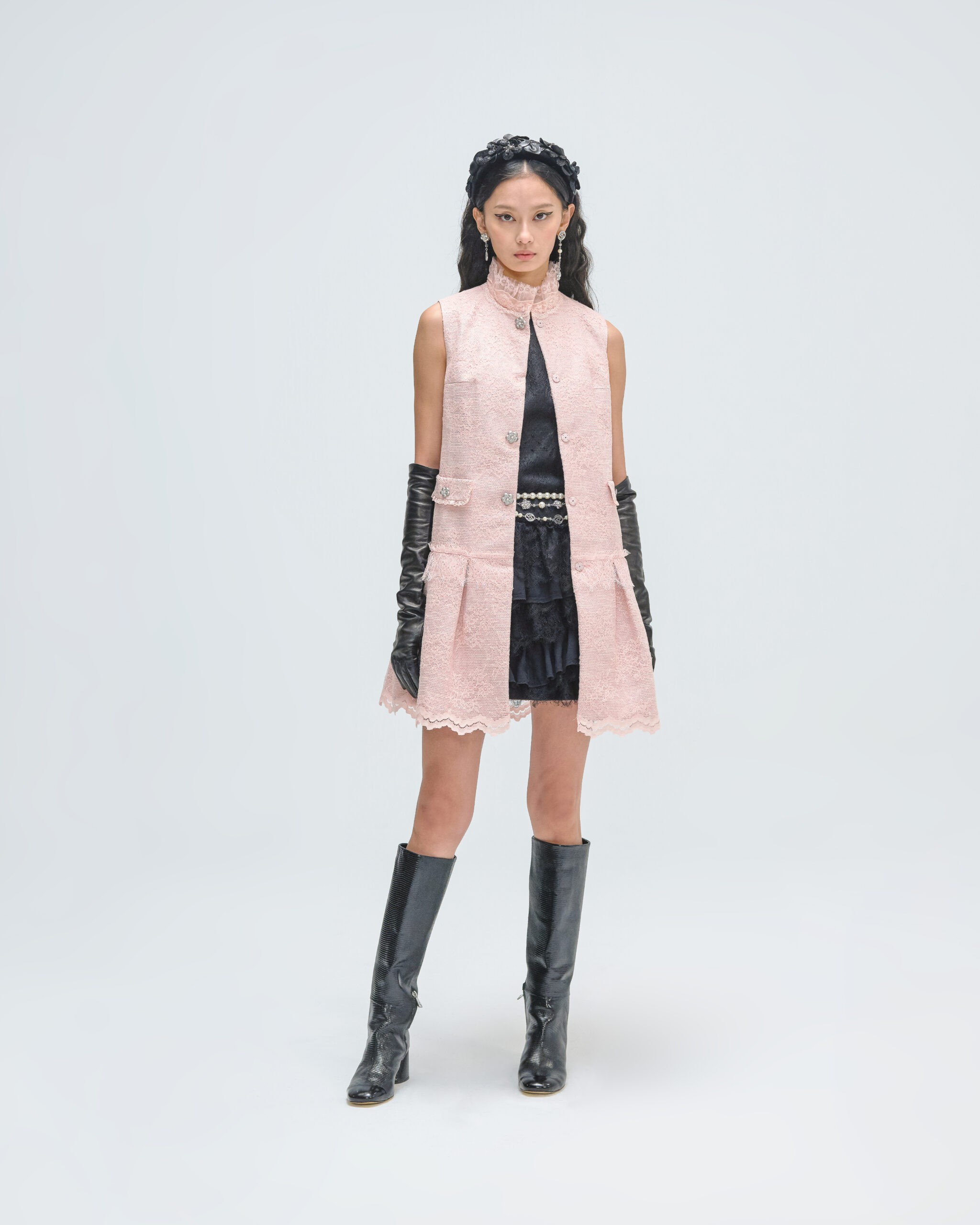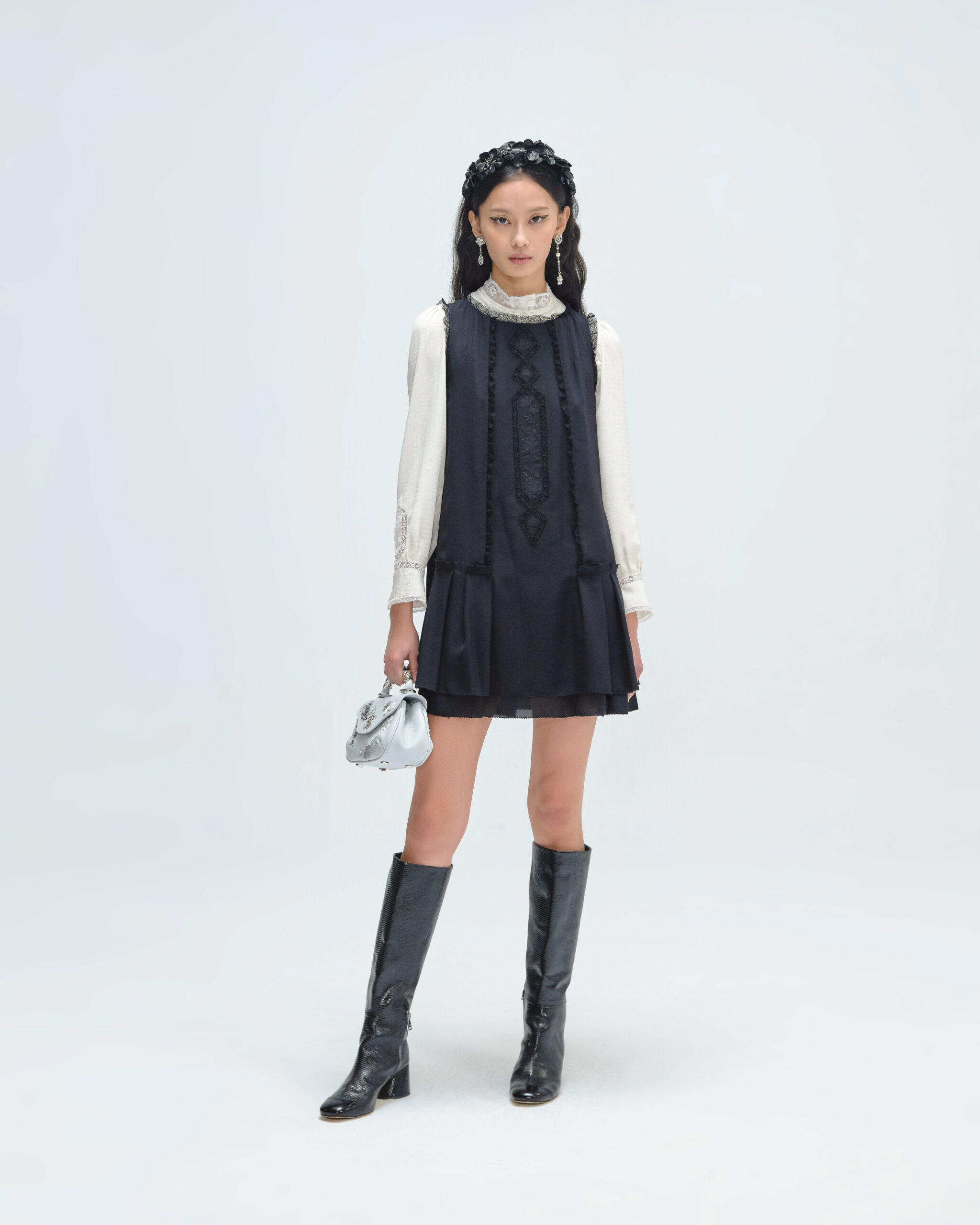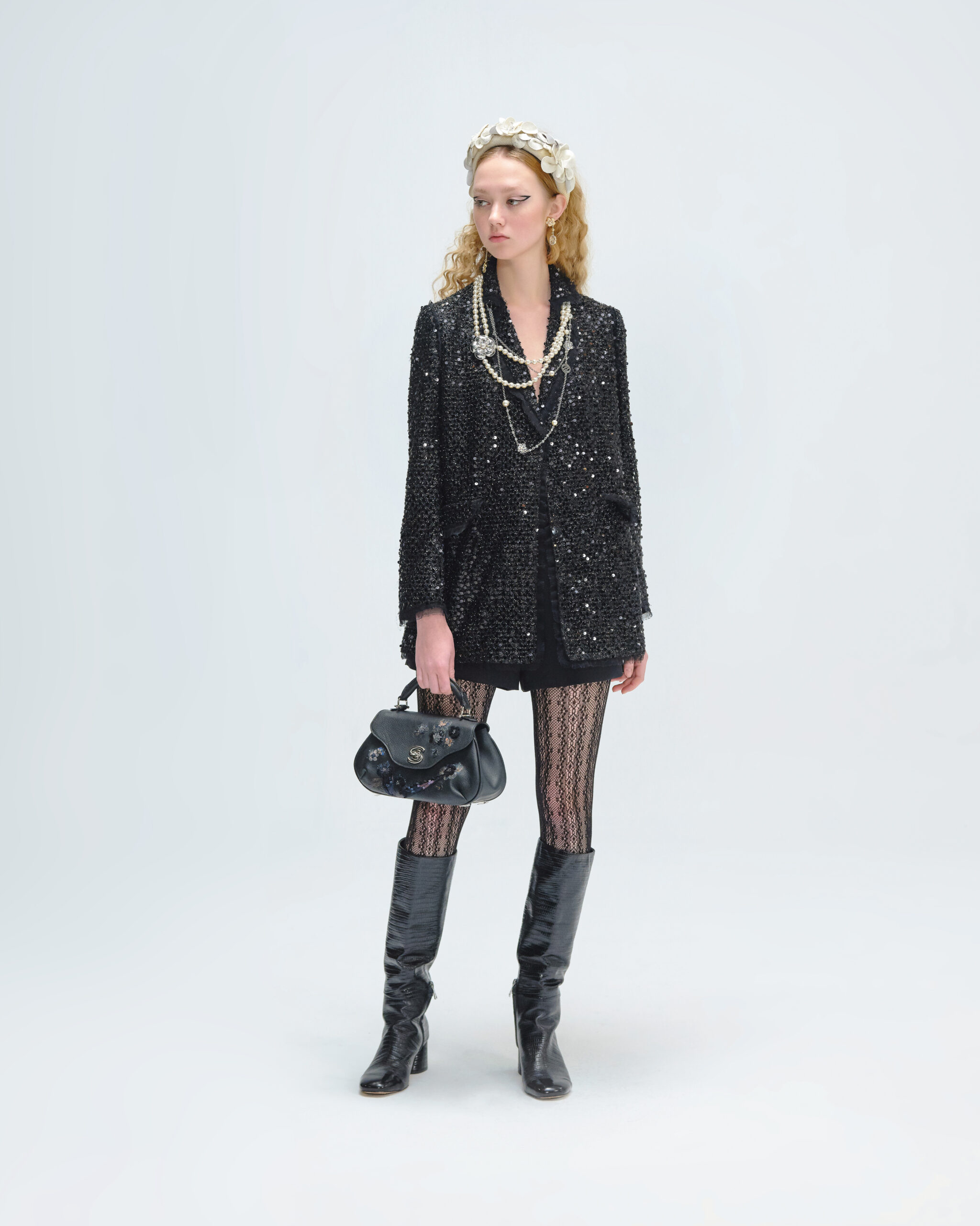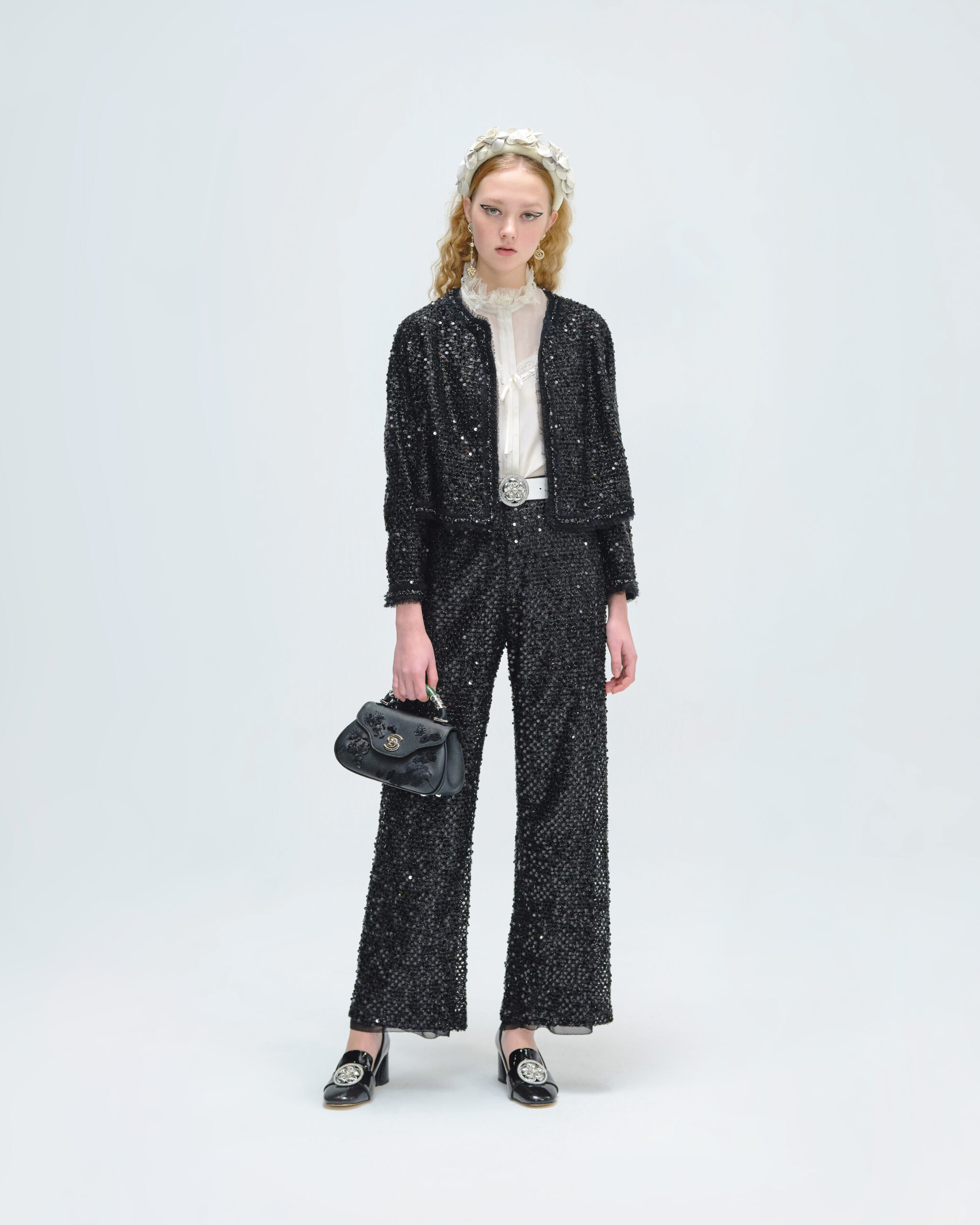 À ce style s’ajoute une superposition d’une grande quantité de dentelle, de tissus transparents et de tissus plissés qui reflètent une certaine tranquillité automnale. Les accessoires qui sont ajoutés suivent le thème de la fleur de prunier, tels que des boucles d’oreilles pendantes asymétriques en forme de fleur de prunier, des bracelets en métal sur lesquels sont gravés des fleurs de prunier, des ceintures et des chaînes à couches multiples en perles incrustées de fleurs de prunier. Les sacs à main, pour cette saison, sortent également de l’ordinaire. Le bouton tournant en métal qui prend la forme du tout nouveau logo de la marque SC et qui se combine avec les poignées de couleur jade, ainsi que le cuir de chèvre sur lequel sont brodés des boutons de fleur expriment un sentiment d’innovation alliant culture orientale et netteté moderne. Les détails d’une féminité romantique apparaissent en contraste avec des manches et un col tous deux de style chinois classique, mais aussi avec des pantalons courts emplis de jeunesse, des jupes courtes et des chemises blanches soignées. Les bottes assorties laissent transparaitre un style féminin unique doté d’une vitalité inégalée et offrent à la vue non seulement une jeunesse élancée, mais surtout l’esprit intrépide de la fleur de prunier qui s’apprête à s’épanouir.Du point de vue des contours, les vêtements pour hommes combinent la coupe classique à la chinoise avec différents types de matériaux. Le chinois et l’occidental, le moderne et le classique se mélangent pour créer du nouveau. Différents types de tissus et de couleurs sont utilisés pour façonner une silhouette élancée. Les vêtements pour femmes, quant à eux, utilisent, en grand nombre, les jolis contours des années 60, à travers, entre autres, des robes courtes, des vestes courtes, des vestes longues accompagnées de jupes courtes ou de pantalons courts. Les deux-pièces classiques de la marque laissent transparaitre plus de vitalité qu’auparavant, utilisant différents designs de jacquards. L’aspect des couches extérieures rappelle non seulement l’aspect évanescent de la fleur de prunier, mais aussi l’aspect rocheux. Un aspect qui s’accompagne, dans les couches intérieures, d’impressions artistiques vigoureuses et délicates de style chinois. Les couches intérieures et extérieures se font ainsi plusieurs fois écho. De somptueux tissus à l’aspect lustré, tels que du tissu à paillettes, du satin, un mélange de laine et de soie, de la flanelle, de la dentelle et du jacquard de couleurs contrastées, sont combinés, sur lesquels s’insèrent quelques éléments de tartan, tels que du tartan écossais, de la gaze de laine ayant un motif de fleur de prunier ressemblant à un damier, de la laine avec des trous carrés et du duvet en quadrillage. Différentes méthodes sont ainsi utilisées pour révéler des motifs occidentaux, auxquels s’accompagnent des éléments de couture chinois et des techniques de broderie grâce auxquels la marque s’est rendu célèbre.