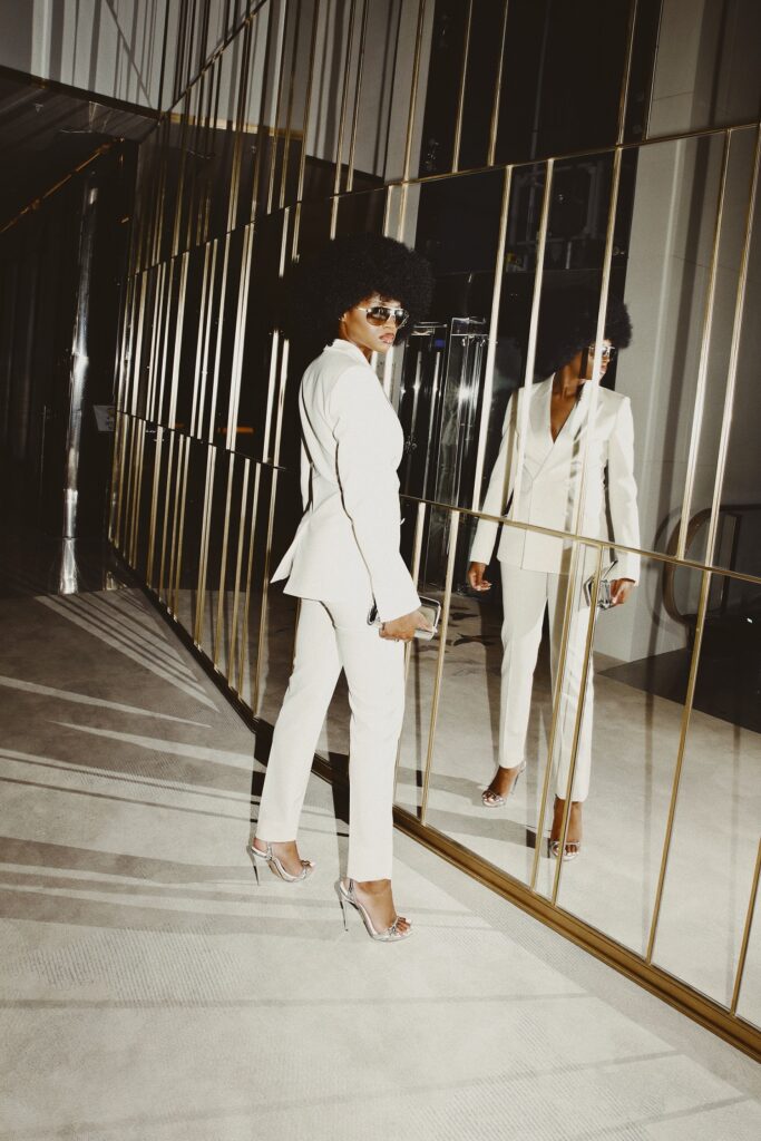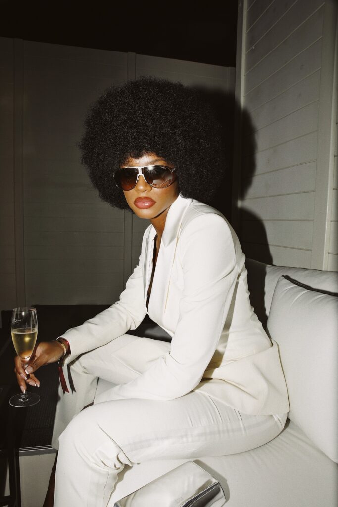 Le mannequin Didi Stone porte un smoking blanc croisé avec une pochette argent lors d’un évènement privé le jeudi 08 juillet à Cannes.
