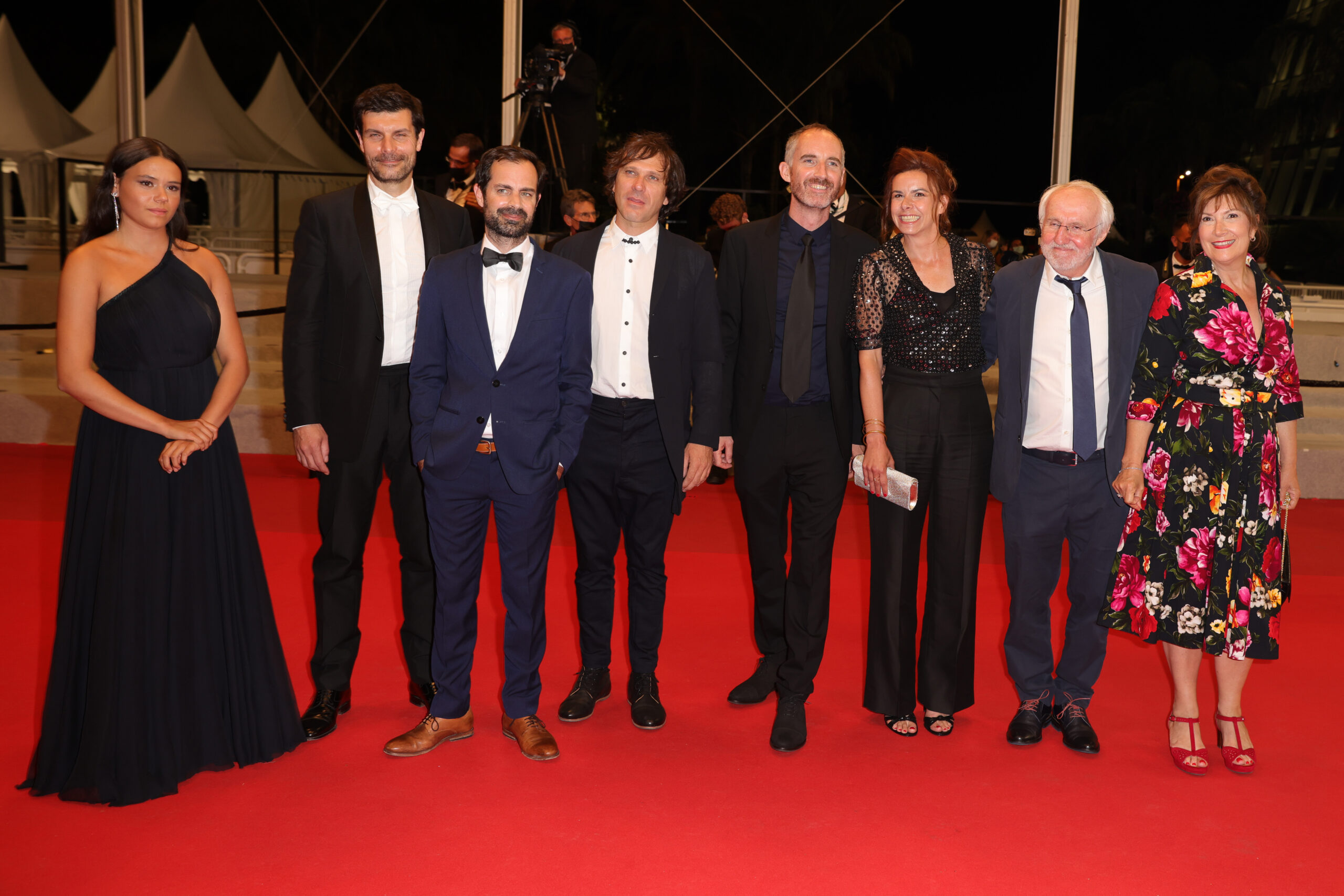 CANNES, FRANCE – JULY 09: (L-R) Lilith Grasmug, Christophe Paou, Alexandre Steiger, Fred Blin, director Jean-Christophe Meurisse, writer Judith Godinot, Olivier Saladin and Lorella Cravotta attend the « Oranges Sanguines (Bloody Oranges) » screening during the 74th annual Cannes Film Festival on July 09, 2021 in Cannes, France. (Photo by Andreas Rentz/Getty Images)