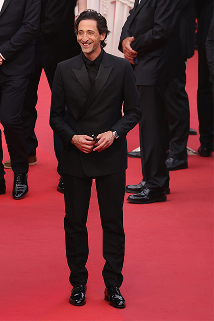 ADRIEN BRODY IS DRESSED BY DIOR. HE WORE A BLACK MOHAIR WOOL OBLIQUE PEAK LAPEL TUXEDO, CLASSIC BLACK COTTON SHIRT AND BLACK LEATHER DERBIES