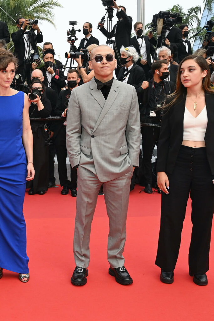 THOMAS SILBERSTEIN IS DRESSED BY DIOR.HE WORE A BLACK WOOL PEAK LAPEL TUXEDO, WHITE COTTON WING-TIP COLLAR SHIRT WITH PLASTRON PIQUÉ, A BLACK SILK BOW-TIE AND BLACK LEATHER DERBIES. CANNES, FRANCE – JULY 12: <> attends the « The French Dispatch » screening during the 74th annual Cannes Film Festival on July 12, 2021 in Cannes, France. (Photo by Andreas Rentz/Getty Images)