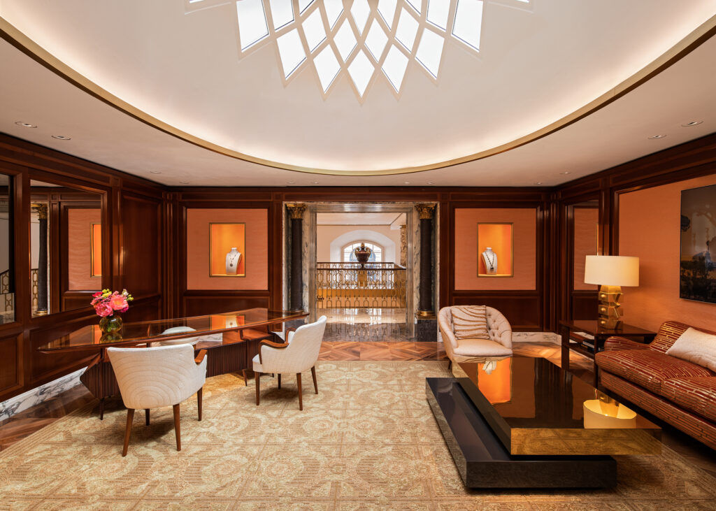 Ceux qui franchiront les portes du 23 Place Vendôme seront non seulement éblouis par les bijoux, mais aussi par la lumière éclatante qui pénètre par ses 13 fenêtres et ses impressionnants puits de lumière. L’un d’entre eux est décoré d’un motif qui fait écho à la célèbre Piazza del Campidoglio de Michel-Ange à Rome. Tous les matériaux sont sublimés par la lumière naturelle du soleil qui, à Rome, possède un éclat chaud aux tonalités abricot. En effet, la devise du starchitecte « Les plus grands luxes de la vie sont la lumière, l’espace et le temps » est ici vraiment mise en pratique. Peter Marino a ainsi sélectionné de nombreux matériaux différents pour traduire l’éclat, la chaleur et la joie de Rome de manière tactile. « Peignant » avec des marbres spectaculaires de Pavonazzetto ou de Breccia di Seravezza, d’un bois de noyer ultra-raffiné, du fer et du laiton brillant, des soies et des velours opulents, les artisans italiens ont mis leurs compétences individuelles au service de ce chef-d’œuvre de créativité et d’artisanat. Ainsi, le parquet bénéficie non seulement d’un effet dégradé singulier obtenu en exposant le bois au soleil pendant différents laps de temps, mais il est également assemblé de manière à former un magnifique motif en étoile. Technique, savoir-faire et sens de l’esthétique tout à fait italien, pour un résultat tout simplement magique.