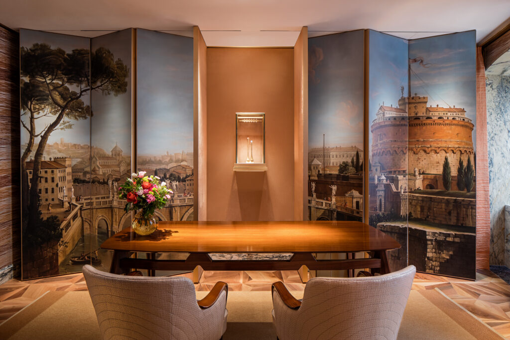 Certaines des pièces sélectionnées ont littéralement voyagé de Rome à Paris. Deux colonnes placées à l’entrée de la boutique, deux vases en porphyre rouge et une console marquetée initialement prévue pour le magasin phare de Rome, au 10 via Condotti, ont trouvé une nouvelle vie entre les murs de la place Vendôme. L’inspiration puisée dans la Ville éternelle et le design italien se retrouvent partout, des images de Rome immortalisées par le photographe canadien Nicolas Ruel, au lustre spectaculaire de Giò Ponti, une pièce originale des années soixante.