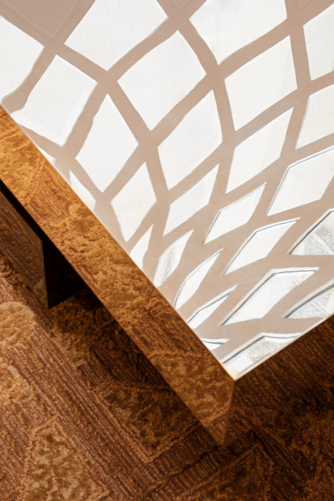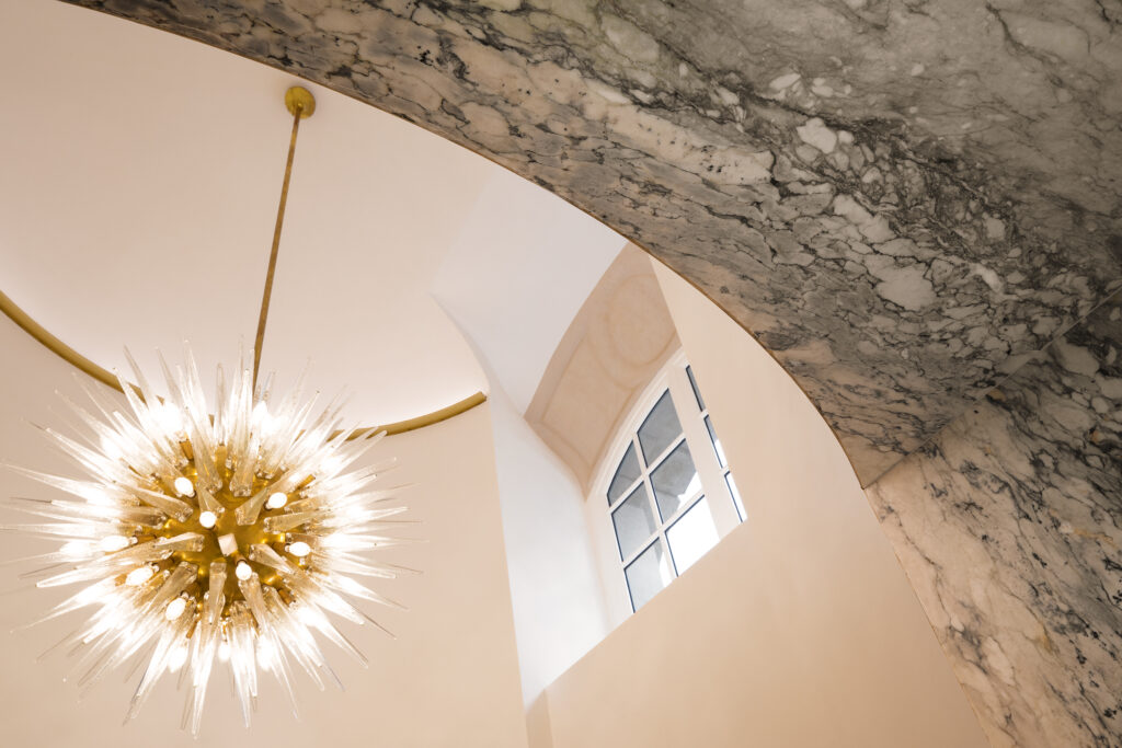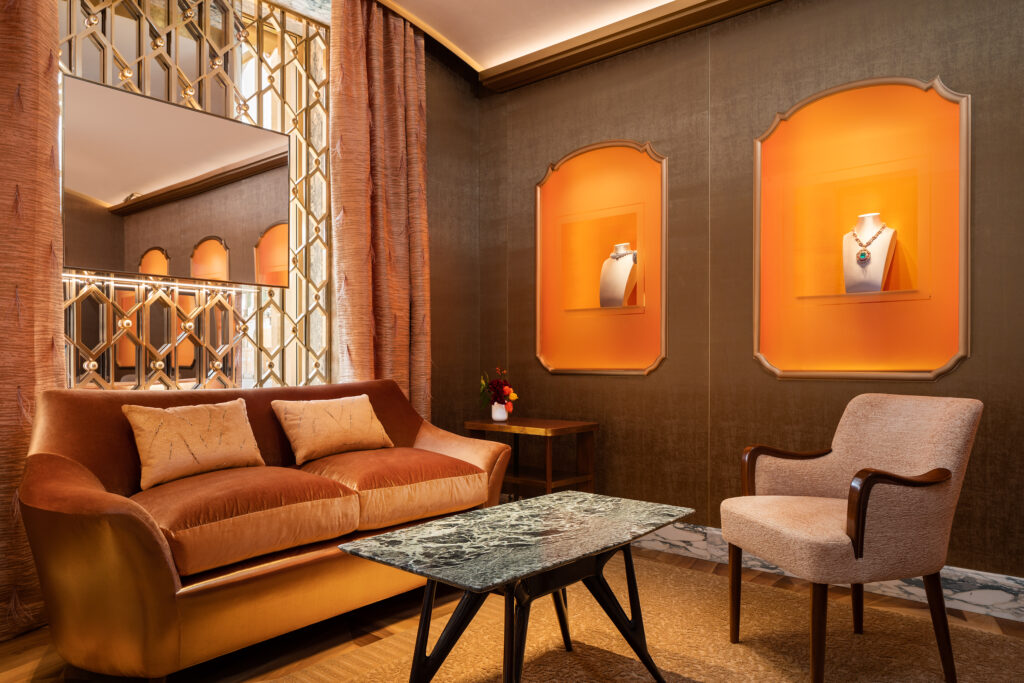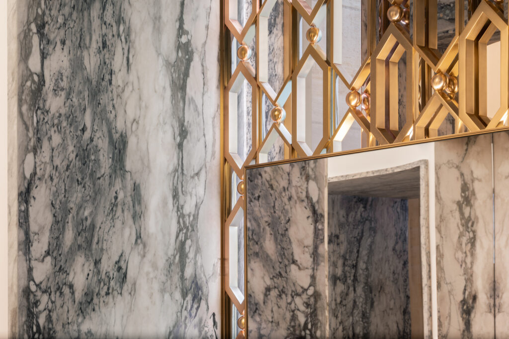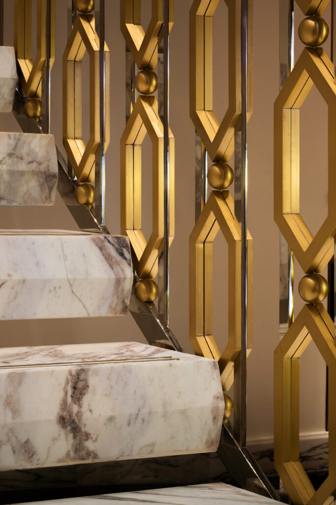 Les références à l’univers de la joaillerie ne manquent pas : l’escalier suspendu à facettes, composé de marches géométriques en marbre, est encadré par un treillis hexagonal en laiton et en acier inoxydable inspiré d’un bracelet Bvlgari des années 1930 et parsemé d’éléments arrondis inspirés des rubis cabochon lisses et des diamants taille brillant qui embellissent le bijou.
