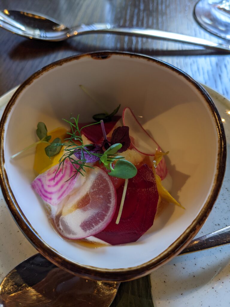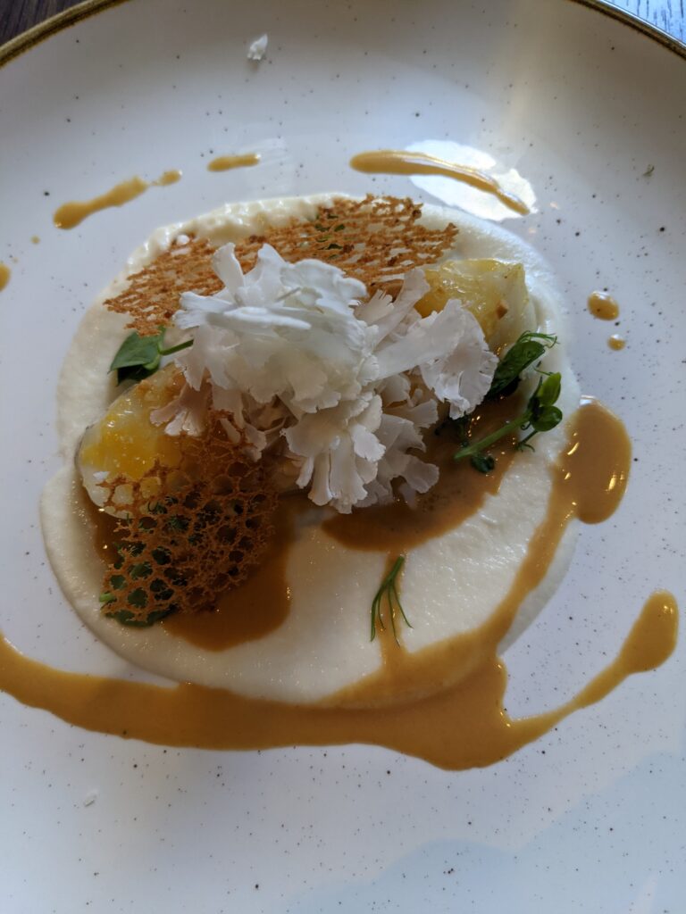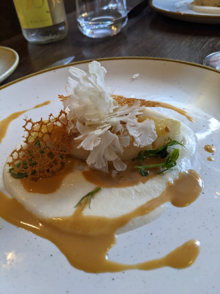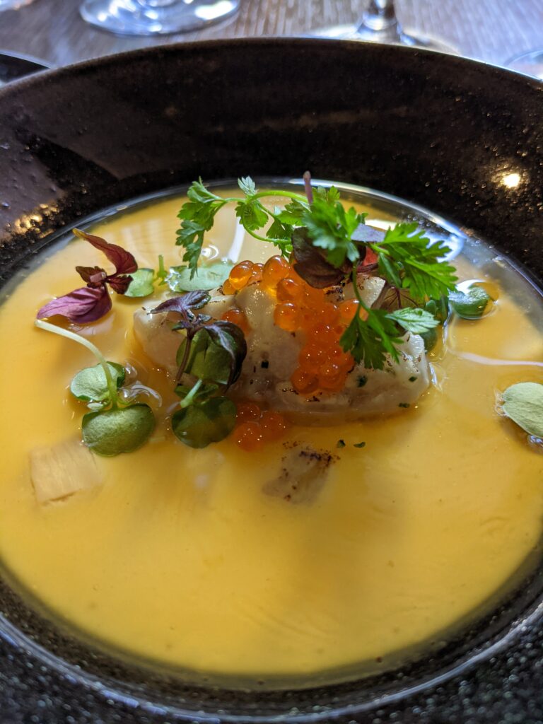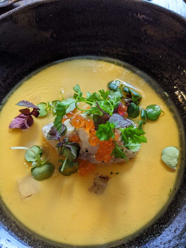 On y retrouve à l’heure du déjeuner un bento composé de neuf petites assiettes avec entre autres un carpaccio de daurade vinaigrette à la prune Ume d’une fraîcheur incomparable, une escabèche de poissons frits et marinés avec son goût de « reviens-y », un cabillaud nacré à la perfection et son tartare de langoustines, purée de choux fleurs et crème de yuzu ou même le quasi de veau accompagné d’un lit d’échalotes confites, asperges sauvages, tuile de feuille de lotus et sa sauce moutarde.