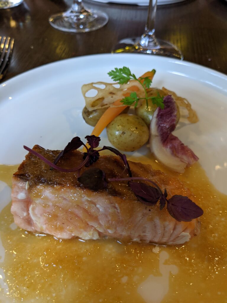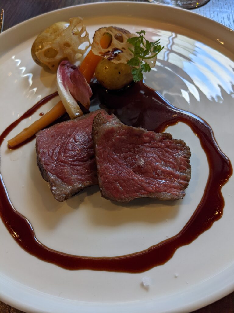 Il se compose d’un amuse-bouche, de deux entrées, d’un poisson, d’une viande et d’un dessert, le tout possible en « pairing » avec du vin ou du saké. Pour le dîner, il est également possible de choisir ses plats à la carte au gré de ses envies.