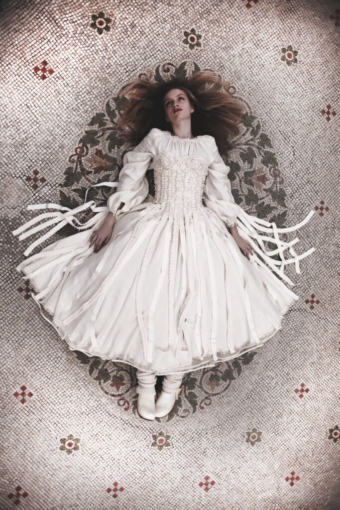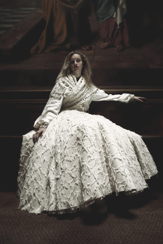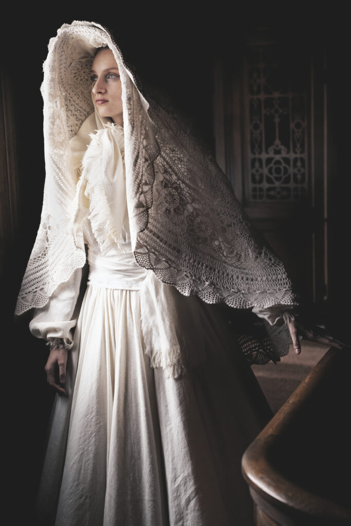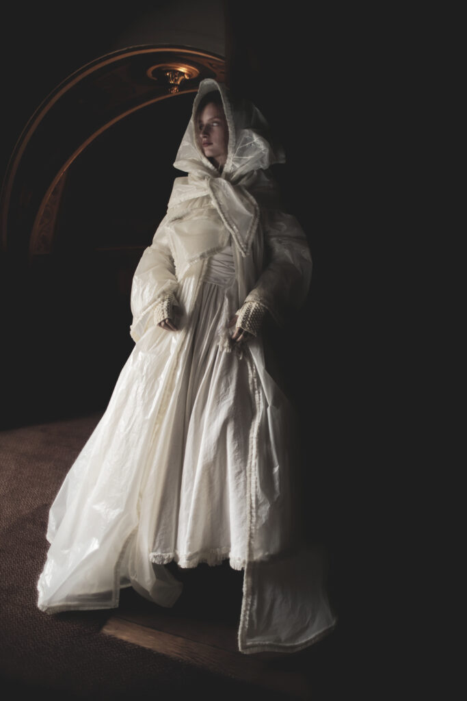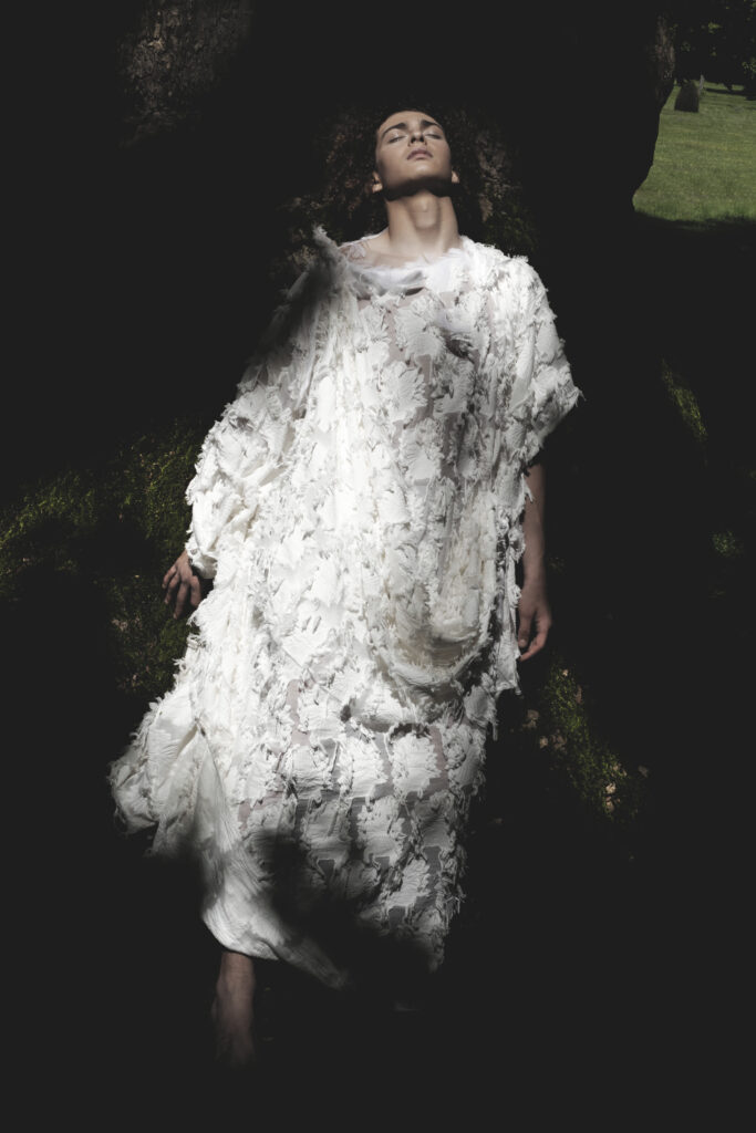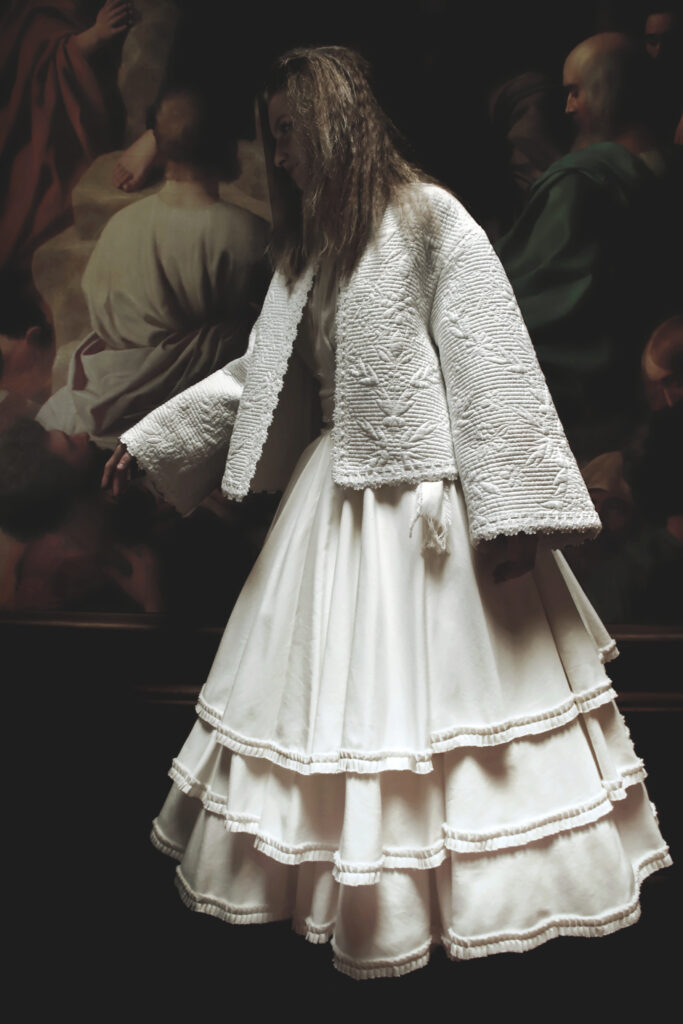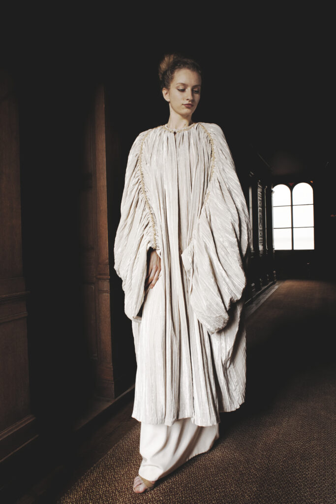 « La Servante, le Passeur et la Relique. Le titre sonne comme une fable philosophique, un conte onirique, une croyance partagée par des fidèles de tous horizons. Mais il parle, avant tout, malgré ses références passéistes, d’une actualité de plus en plus brulante qui a pour sujet la richesse et la pauvreté. Il y a quelque temps déjà, le magazine « L’Histoire » titrait « Les Riches et les Pauvres, 1000 ans d’inégalité ». Loin de moi l’idée d’une quelconque morale ou d’un procès d’intention. Je dois avouer que j’ai eu beaucoup de mal à choisir l’orientation de cette collection. A vrai dire, je ne voulais pas choisir et chaque personnage a finalement trouvé sa place. La Servante, le Passeur et la Relique. La Servante incarne une fille des bois, des clairières et des étangs. Une paysanne qui évolue dans un univers bucolique qui traduit mon envie de dépouillement. Un paupérisme inspiré d’une série de clichés de l’artiste Jackie Nickerson qui a photographié des ouvriers agricoles au Zimbabwe, en 1996, et qui a mis l’accent sur les vêtements uniques et magnifiques que les travailleurs se sont, eux-mêmes, confectionnés. Une identité, une individualité et une modernité à toute épreuve. Les silhouettes s’approprient les influences traditionnelles d’Europe mais en les ayant lavées de tout folklore coloristique. Francisco de Zubarán, grand peintre baroque espagnol et son compatriote, José Ortiz Echagüe, photographe, adepte du pictorialisme, m’ont aussi accompagné dans cette quête d’authenticité. Le blanc, l’écru, l’ivoire, le beige et le grège composent la palette des modèles. Une robe « roumaine » juponnée est la base de l’histoire des tenues de la Servante. On vient, ensuite, ennoblir par superposition de capes, d’imperméables, de gilets, de vestes courtes, de châles … Les matières sont brutes ou à aspect rustique, mélange de lin et soie, de soie et coton, de soie et viscose, organza plastifié, jacquard effiloché, laine mèche et fileté, laine bouillie, crochet et velours plissé façon Mariano Fortuny y Madrazo.