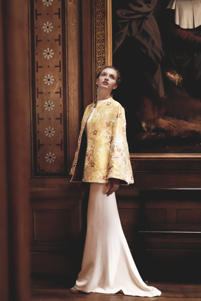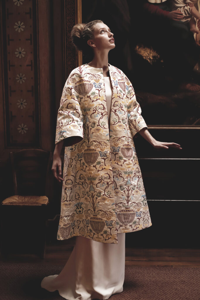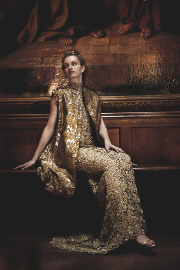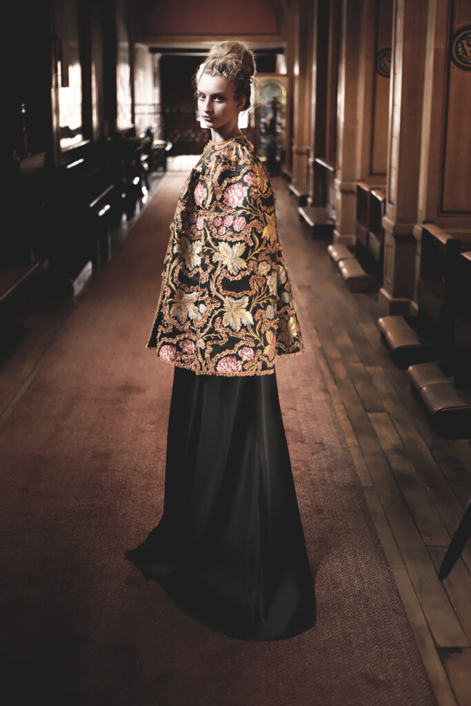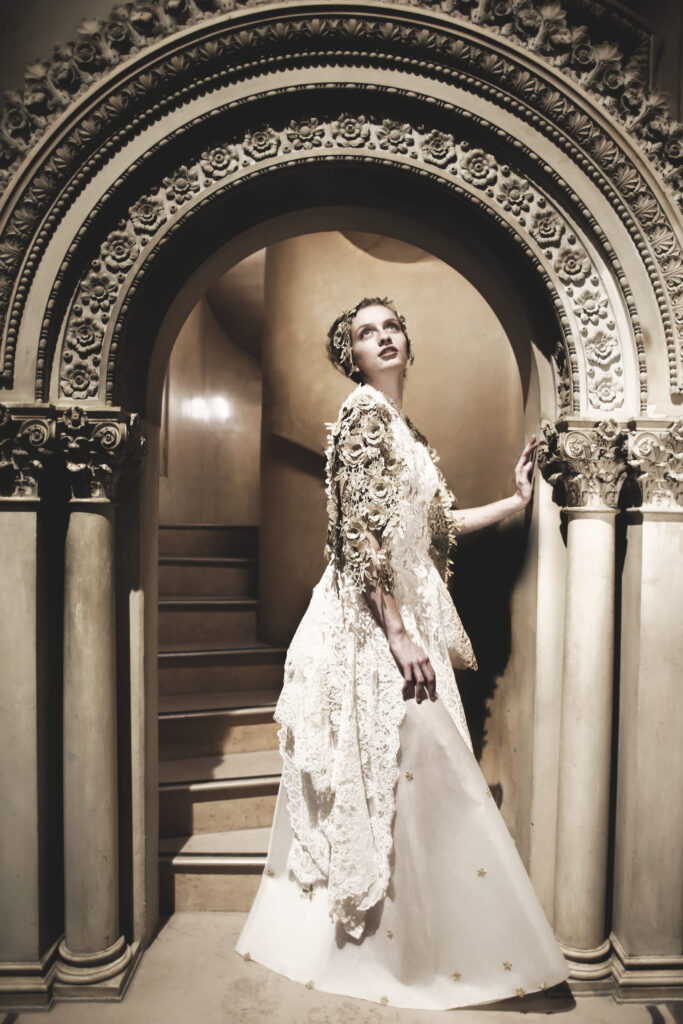 J’avais, depuis longtemps, en archives, de sublimes images de reliques bavaroises issues du magazine F.M.R. Il y a, quelques mois, dans une librairie, j’aperçois, à mon grand bonheur, un ouvrage intitulé « Trésors des Catacombes ». Je retrouve nombre de photographies de ces reliques. Mais de quoi s’agit-il exactement ? L’auteur du livre raconte que, dans les années 1723, un squelette complet étiquetté comme étant celui de Saint Albert, arriva dans une petite église de Bavière. Ce squelette était magnifiquement orné par une religieuse nommée Pontentia Hämmerl. Fils d’or, pierres précieuses, perles fines ont été brodés ou incrustés sur les ossements. Les reliques étaient aussi vêtues d’étoffes précieuses et exposées dans des vitrines. J’y ai vu un rêve d’éternité et comme j’aspirais, aussi, à l’opulence, nous avons créé notre propre relique et l’avons habillée de manteaux en jacquards d’esprit floral et papier cuve, en brocard minéral, en damas grec orthodoxe, dans des tonalités baroques. Des pièces rebrodées d’entre-deux de dentelles mécaniques or et cuivre, de perles d’eau, de ruchés et de guipures or pâle. Ces reliques faisaient l’objet de dévotion et d’émerveillement. Elles avaient, aussi, pour mission d’être les passerelles entre les souhaits ou les vœux des prieurs et les cieux. Alors, fable, conte, croyance ou simplement allégorie. Cette saison parle, avant tout, d’une intention simple, celle du questionnement. » Frank Sorbier