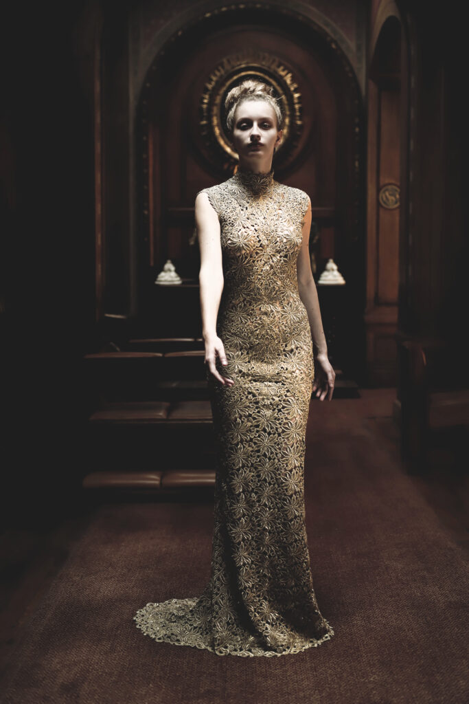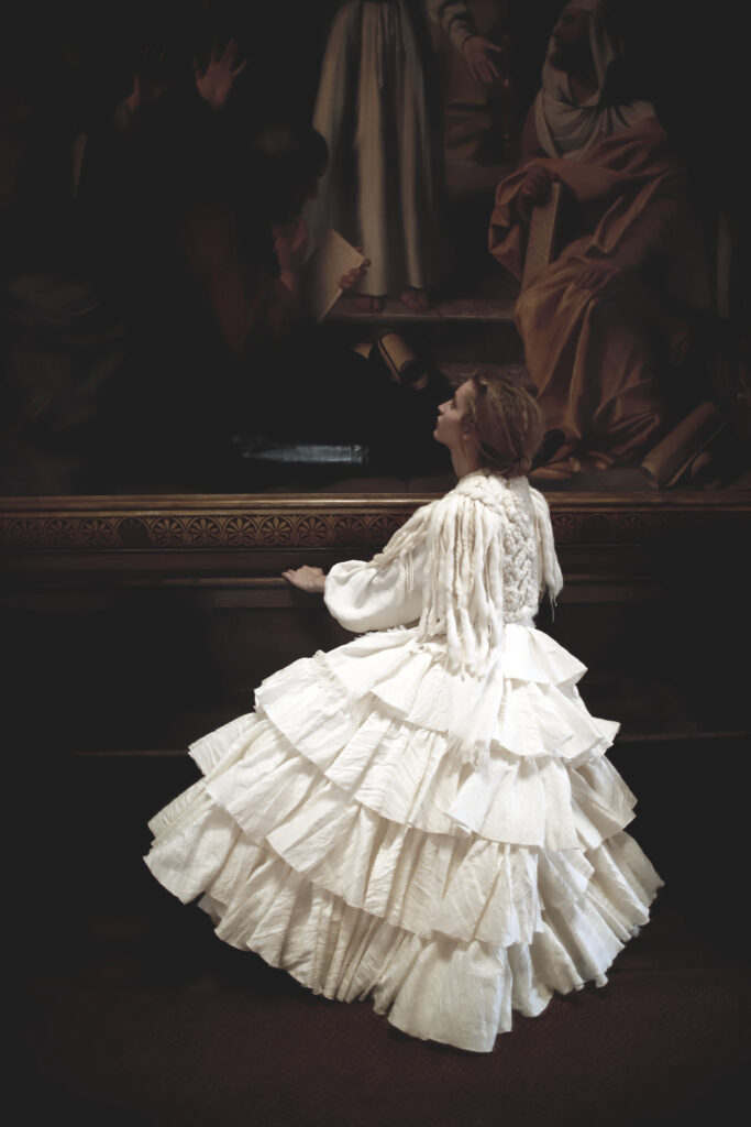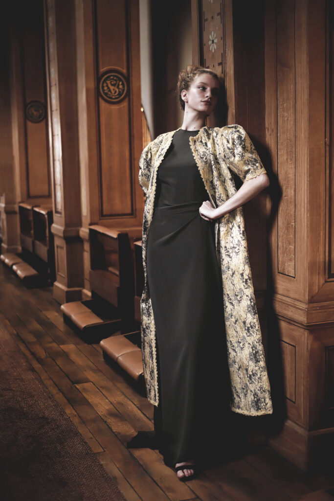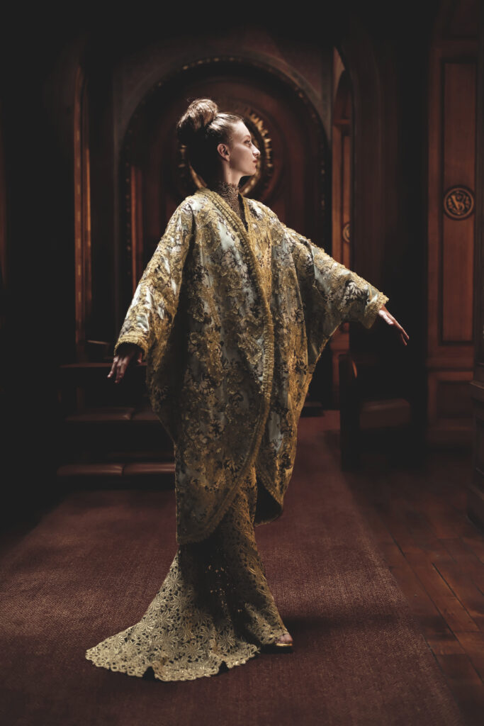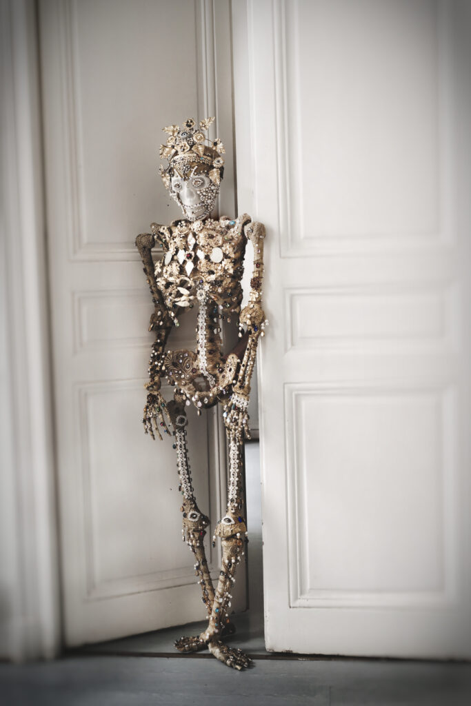 J’avais, depuis longtemps, en archives, de sublimes images de reliques bavaroises issues du magazine F.M.R. Il y a, quelques mois, dans une librairie, j’aperçois, à mon grand bonheur, un ouvrage intitulé « Trésors des Catacombes ». Je retrouve nombre de photographies de ces reliques. Mais de quoi s’agit-il exactement ? L’auteur du livre raconte que, dans les années 1723, un squelette complet étiquetté comme étant celui de Saint Albert, arriva dans une petite église de Bavière. Ce squelette était magnifiquement orné par une religieuse nommée Pontentia Hämmerl. Fils d’or, pierres précieuses, perles fines ont été brodés ou incrustés sur les ossements. Les reliques étaient aussi vêtues d’étoffes précieuses et exposées dans des vitrines. J’y ai vu un rêve d’éternité et comme j’aspirais, aussi, à l’opulence, nous avons créé notre propre relique et l’avons habillée de manteaux en jacquards d’esprit floral et papier cuve, en brocard minéral, en damas grec orthodoxe, dans des tonalités baroques. Des pièces rebrodées d’entre-deux de dentelles mécaniques or et cuivre, de perles d’eau, de ruchés et de guipures or pâle. Ces reliques faisaient l’objet de dévotion et d’émerveillement. Elles avaient, aussi, pour mission d’être les passerelles entre les souhaits ou les vœux des prieurs et les cieux. Alors, fable, conte, croyance ou simplement allégorie. Cette saison parle, avant tout, d’une intention simple, celle du questionnement. » Frank Sorbier